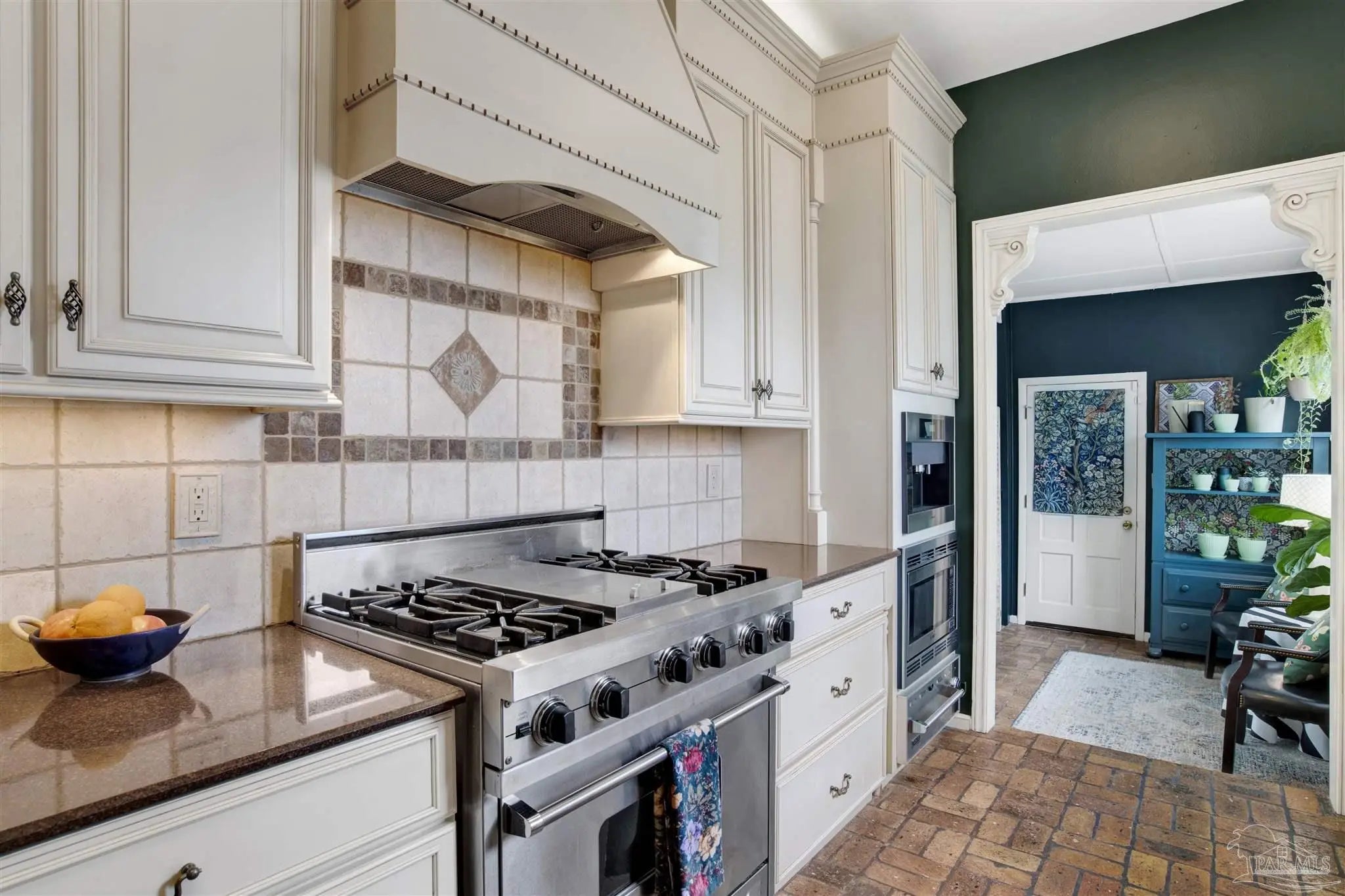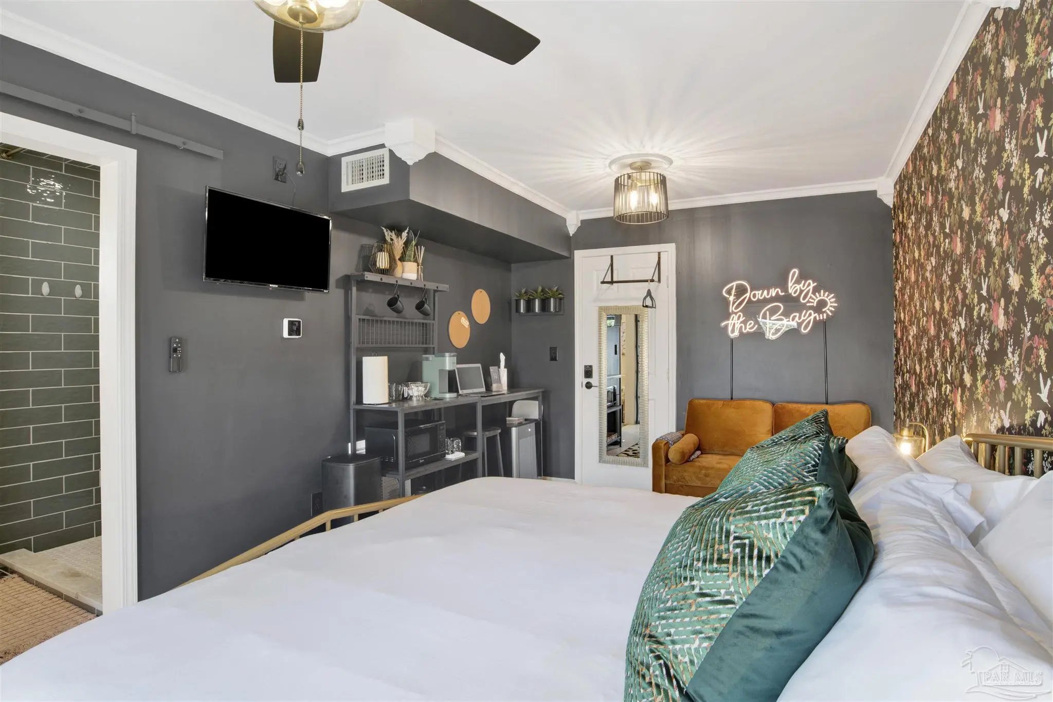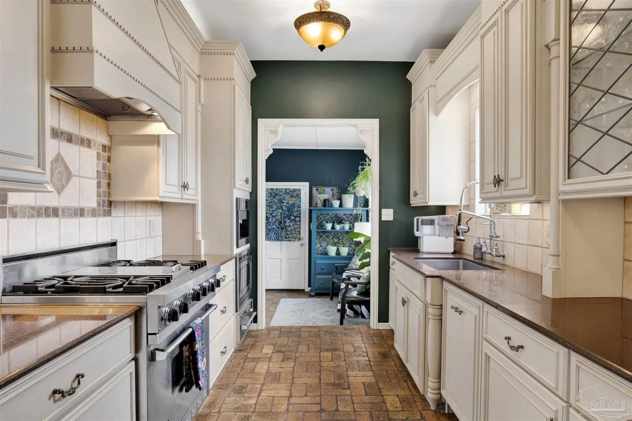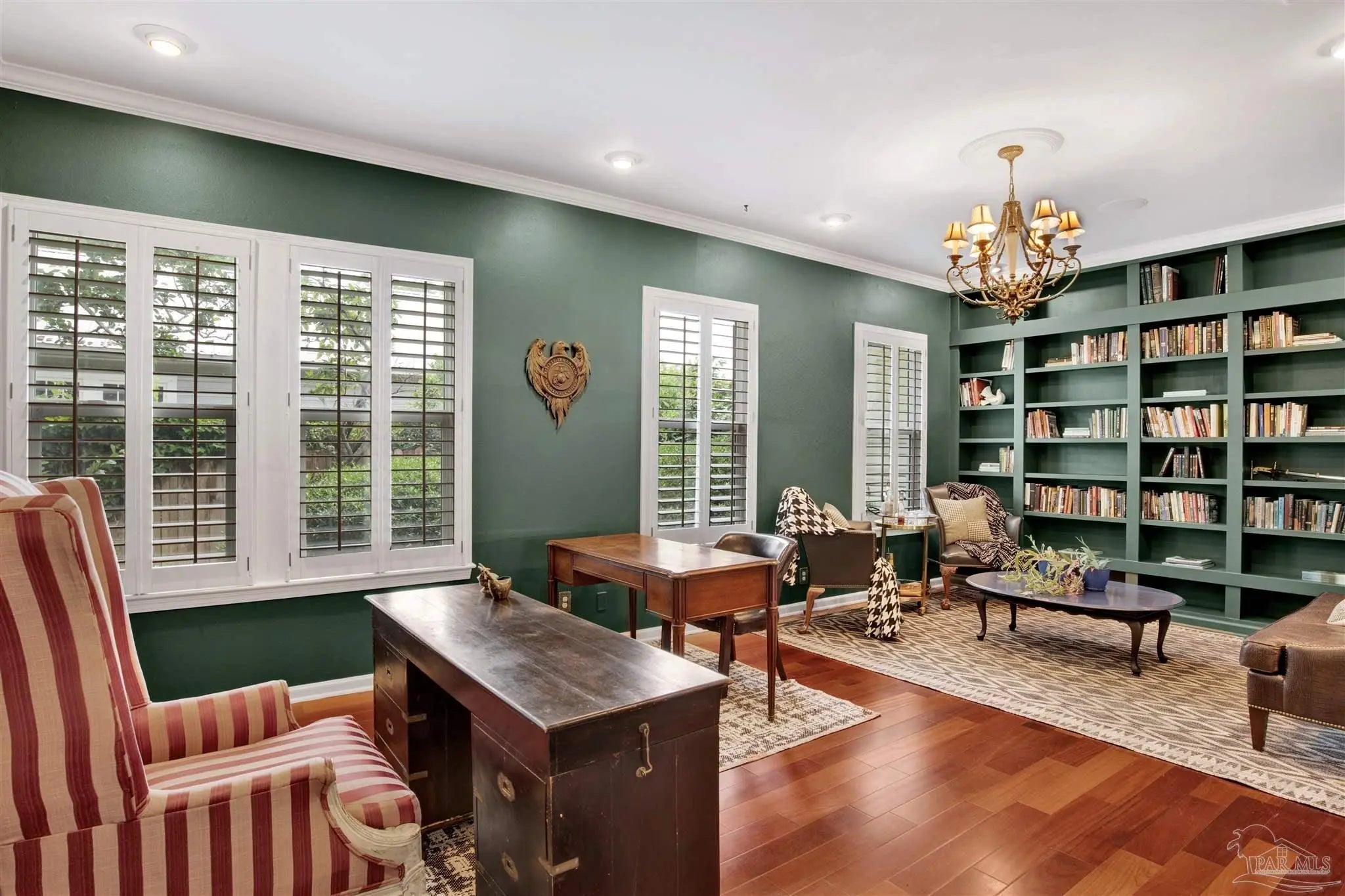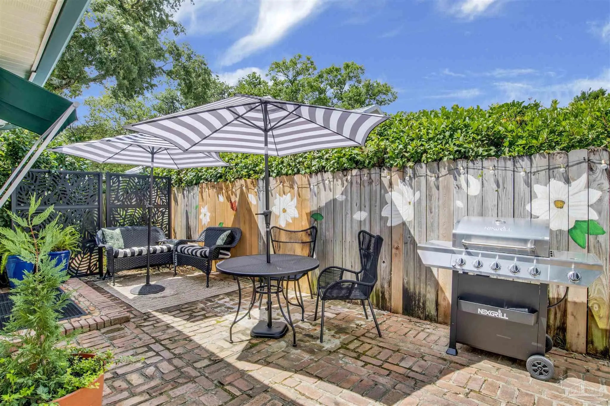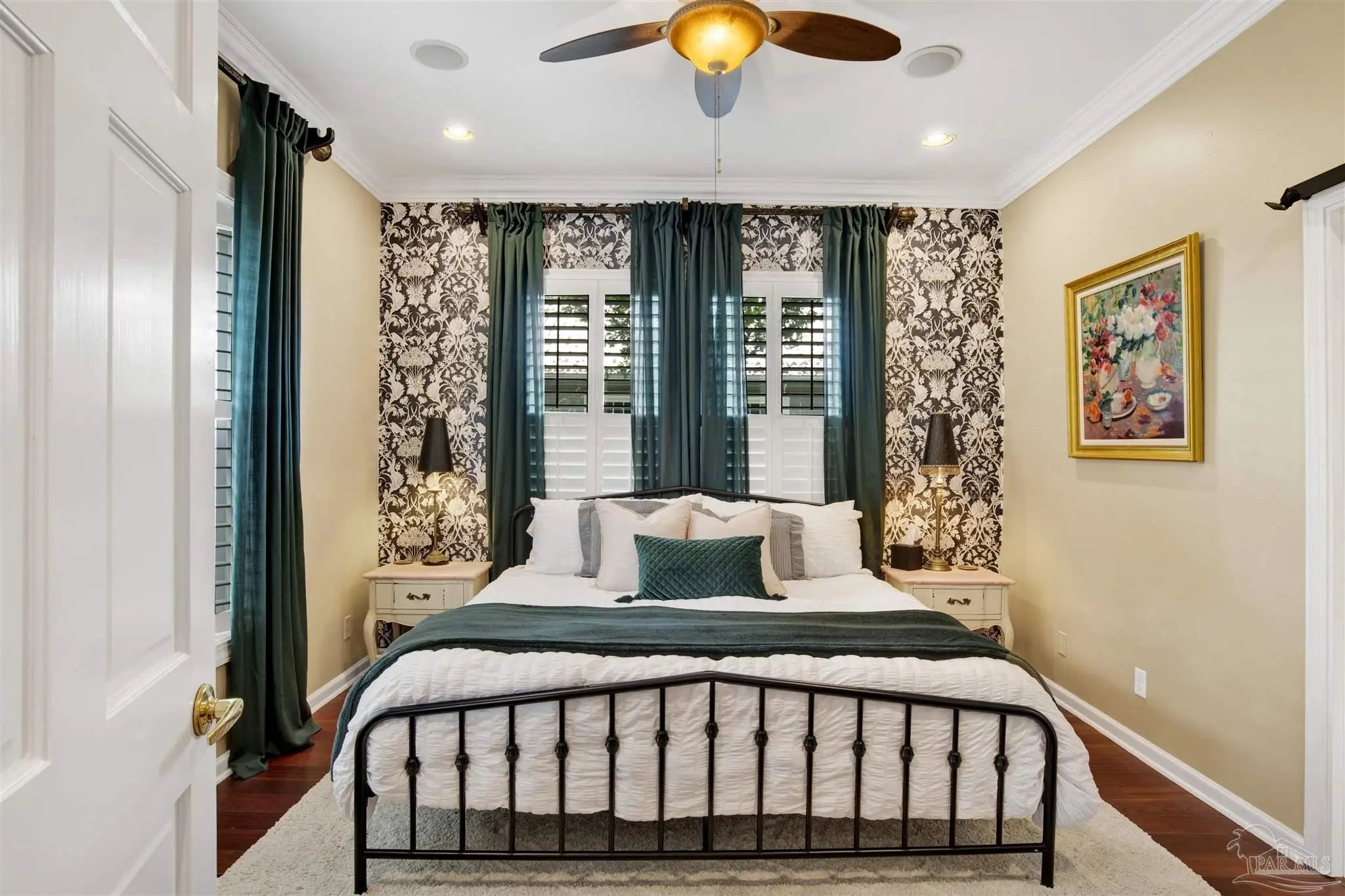 Welcome to this charming Bayshore bungalow, where timeless character meets modern comfort. Behind a private brick courtyard shaded by majestic oaks, you’ll find an inviting outdoor retreat perfect for entertaining or quiet evenings. Inside, a warm brick foyer opens to gleaming Brazilian hardwood floors and spacious living areas, including one with a cozy gas log fireplace. The office features built-in bookshelves, adding both functionality and a sophisticated touch, while modern wallpaper accents bring pops of personality throughout the home. The chef’s kitchen stands out with a Viking range, refrigerator, warming drawer, Bosch dishwasher, custom cabinetry, and a built-in espresso/coffee machine. A formal dining room just off the kitchen is perfect for hosting family and friends. The rear bedroom has been fully renovated with an updated bathroom and French doors leading to a private patio, an ideal spot for morning coffee or catching glimpses of the Blue Angels in practice. Additional features include impact windows, a one-car garage, carport, and detached storage building. Living on Bayshore Drive offers a unique blend of charm and convenience. Take daily walks along Bayshore, where water views provide a peaceful start or finish to your day. Hop on a golf cart and ride less than a mile to the Pensacola Country Club, or take advantage of nearby marinas and the Pensacola Yacht Club, only 1.5 miles away. This home can be sold furnished, making it truly move-in ready. With its flexible layout (including a private 1 bed / 1 bath suite) it also offers rare potential for two Airbnb rentals in one property. Located close to downtown, NAS Pensacola, hospitals, and just a short drive to Pensacola Beach (11 miles) and Perdido Key (14 miles), this home delivers the perfect balance of convenience and Gulf Coast lifestyle.