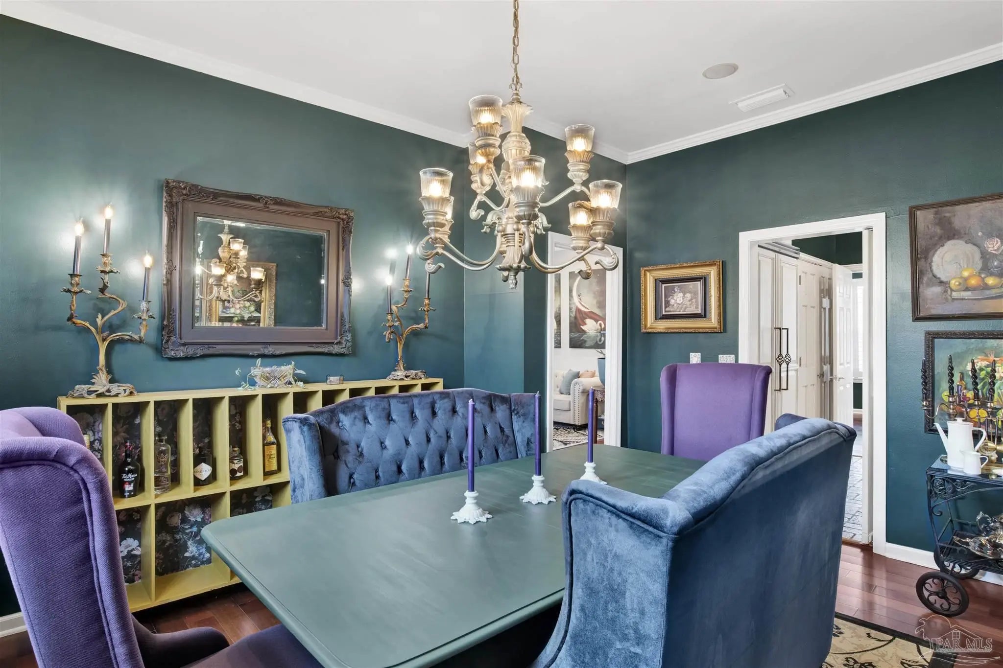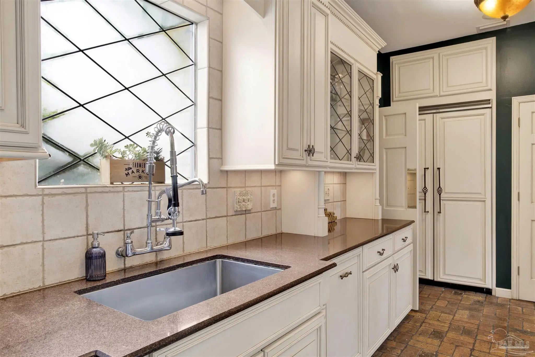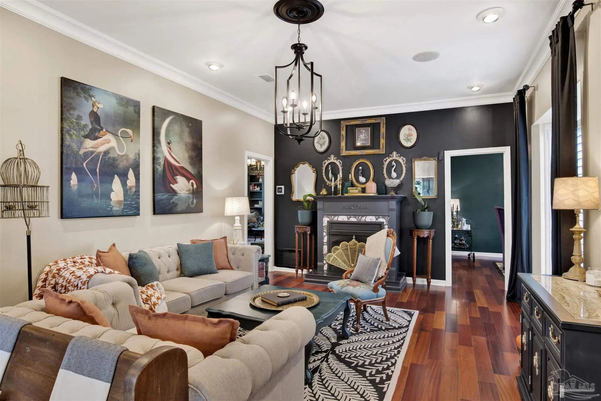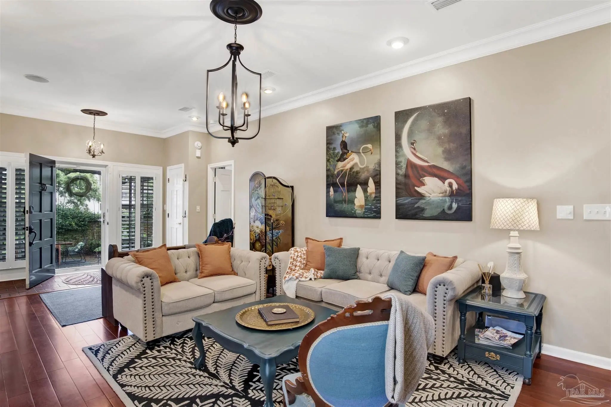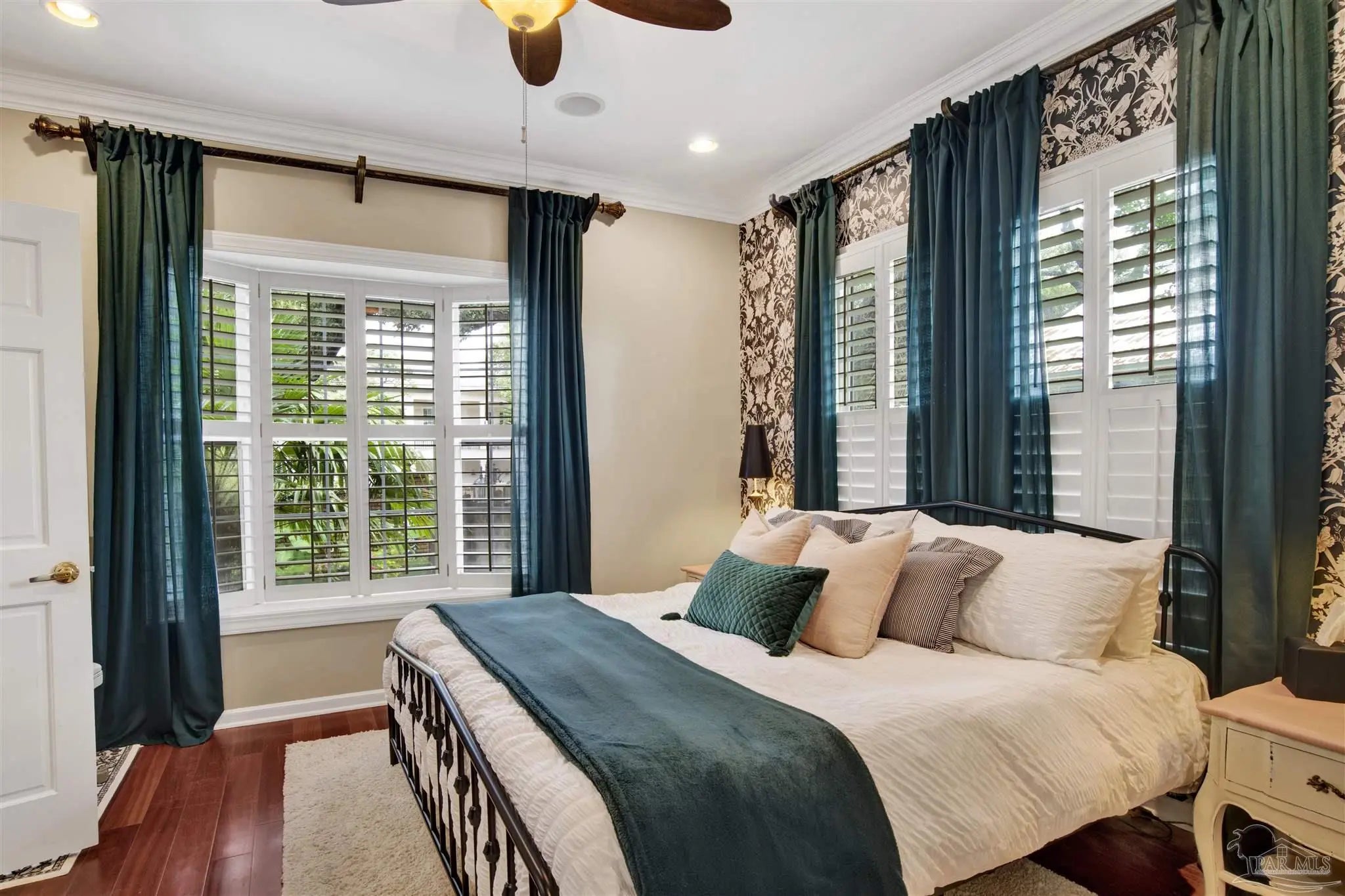 Welcome to this charming Bayshore bungalow, where timeless character meets modern comfort. Behind a private brick courtyard shaded by majestic oaks, you’ll find an inviting outdoor retreat perfect for entertaining or quiet evenings. Inside, a warm brick foyer opens to gleaming Brazilian hardwood floors and spacious living areas, including one with a cozy gas log fireplace. The office features built-in bookshelves, adding both functionality and a sophisticated touch, while modern wallpaper accents bring pops of personality throughout the home. The chef’s kitchen stands out with a Viking range, refrigerator, warming drawer, Bosch dishwasher, custom cabinetry, and a built-in espresso/coffee machine. A formal dining room just off the kitchen is perfect for hosting family and friends. The rear bedroom has been fully renovated with an updated bathroom and French doors leading to a private patio, an ideal spot for morning coffee or catching glimpses of the Blue Angels in practice. Additional features include impact windows, a one-car garage, carport, and detached storage building. Living on Bayshore Drive offers a unique blend of charm and convenience. Take daily walks along Bayshore, where water views provide a peaceful start or finish to your day. Hop on a golf cart and ride less than a mile to the Pensacola Country Club, or take advantage of nearby marinas and the Pensacola Yacht Club, only 1.5 miles away. This home can be sold furnished, making it truly move-in ready. With its flexible layout (including a private 1 bed / 1 bath suite) it also offers rare potential for two Airbnb rentals in one property. Located close to downtown, NAS Pensacola, hospitals, and just a short drive to Pensacola Beach (11 miles) and Perdido Key (14 miles), this home delivers the perfect balance of convenience and Gulf Coast lifestyle.