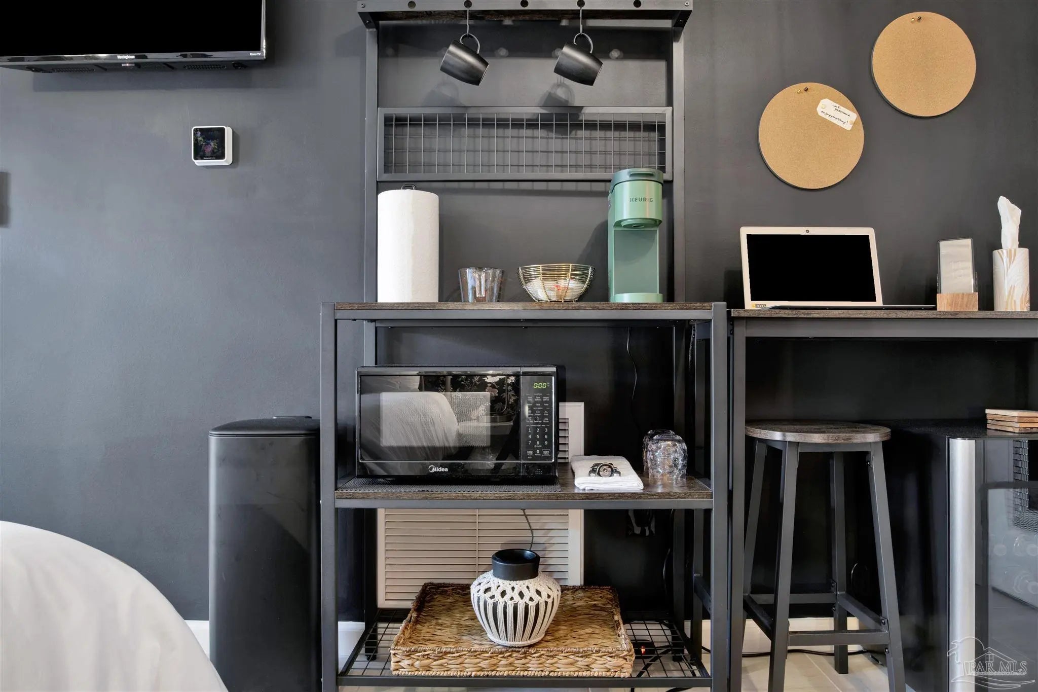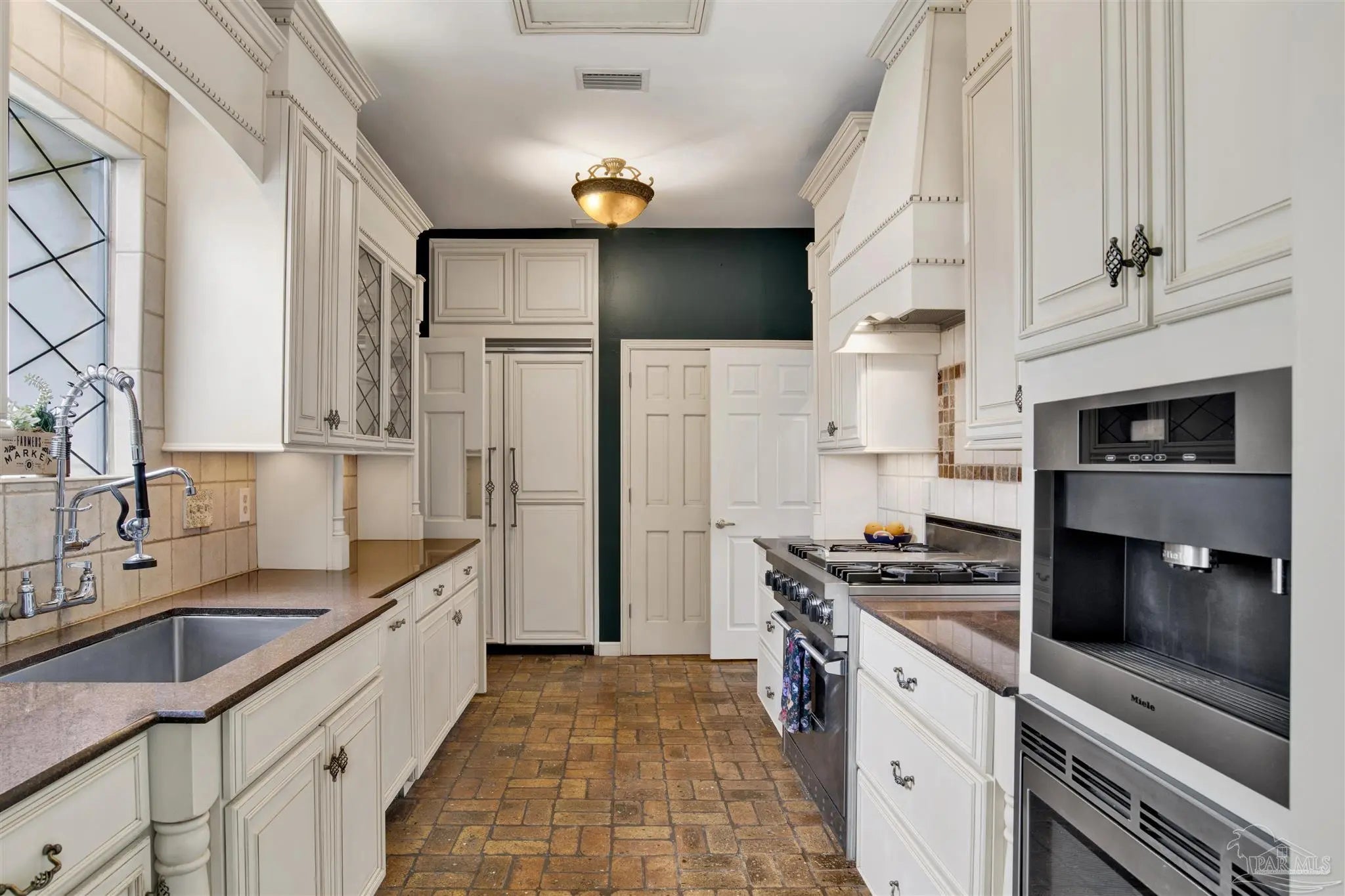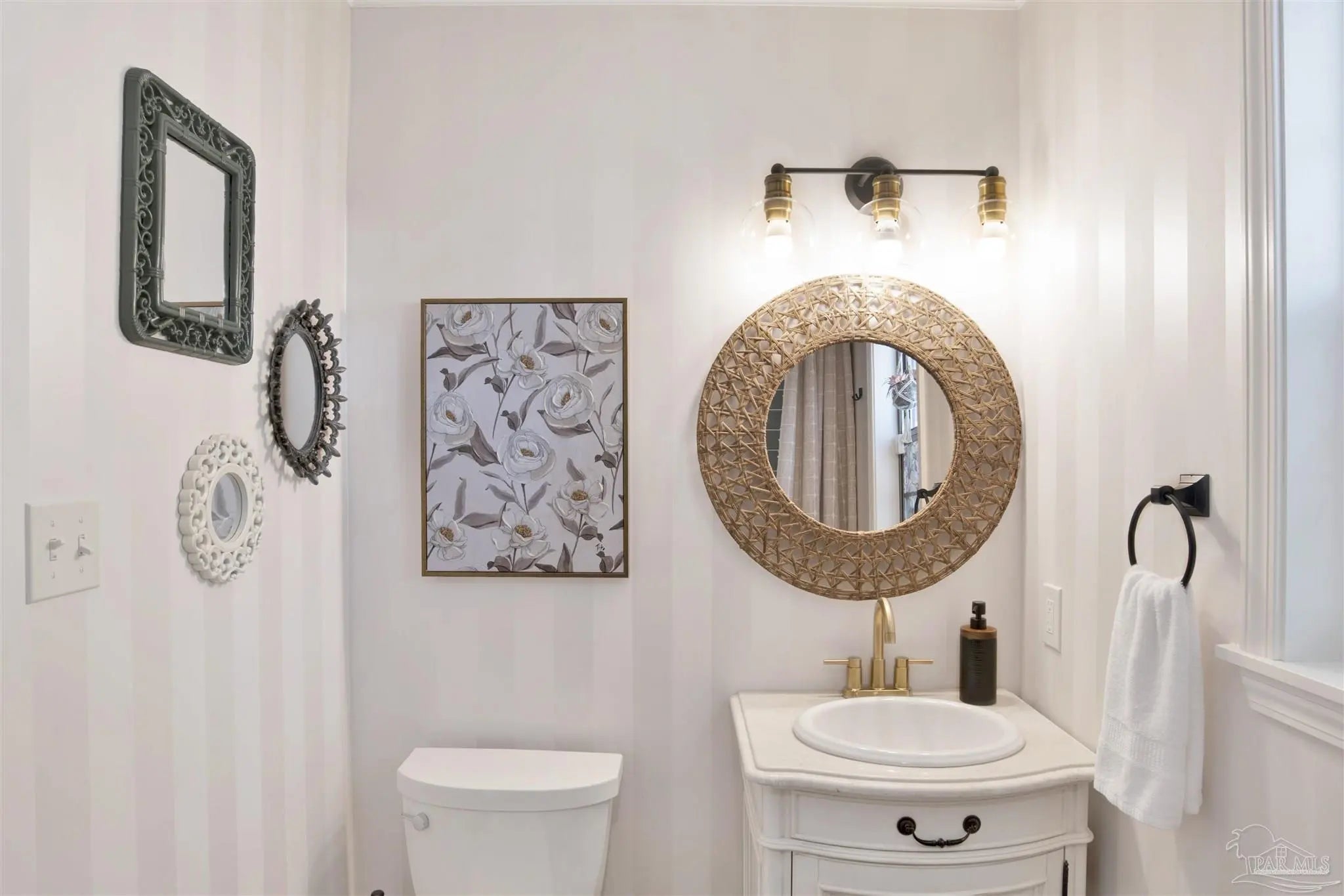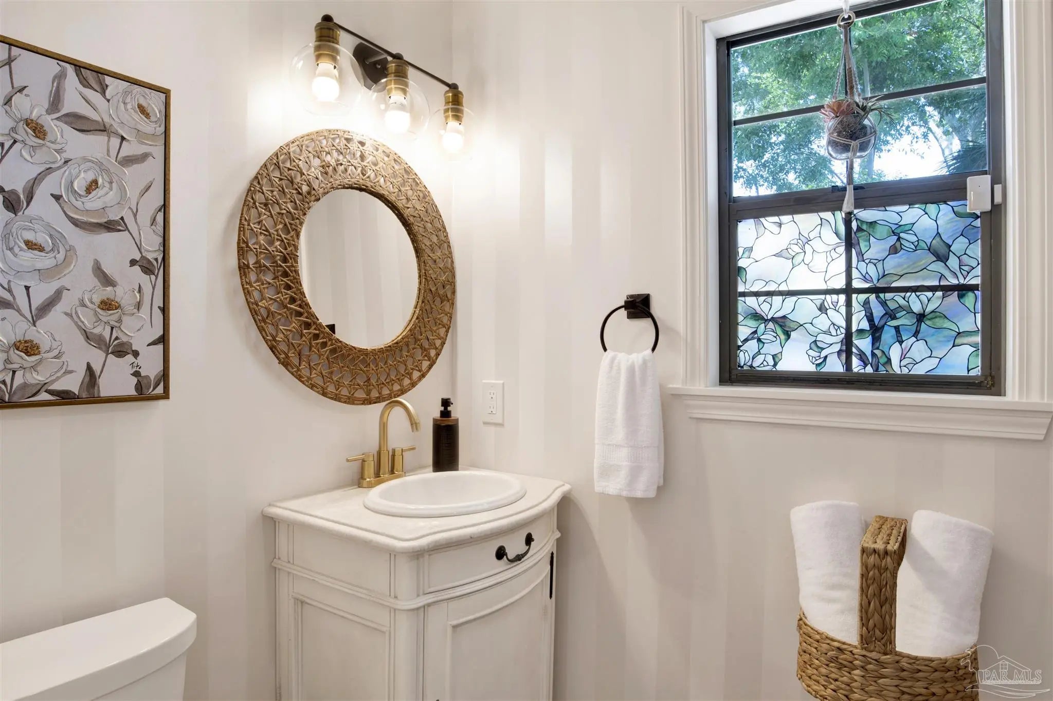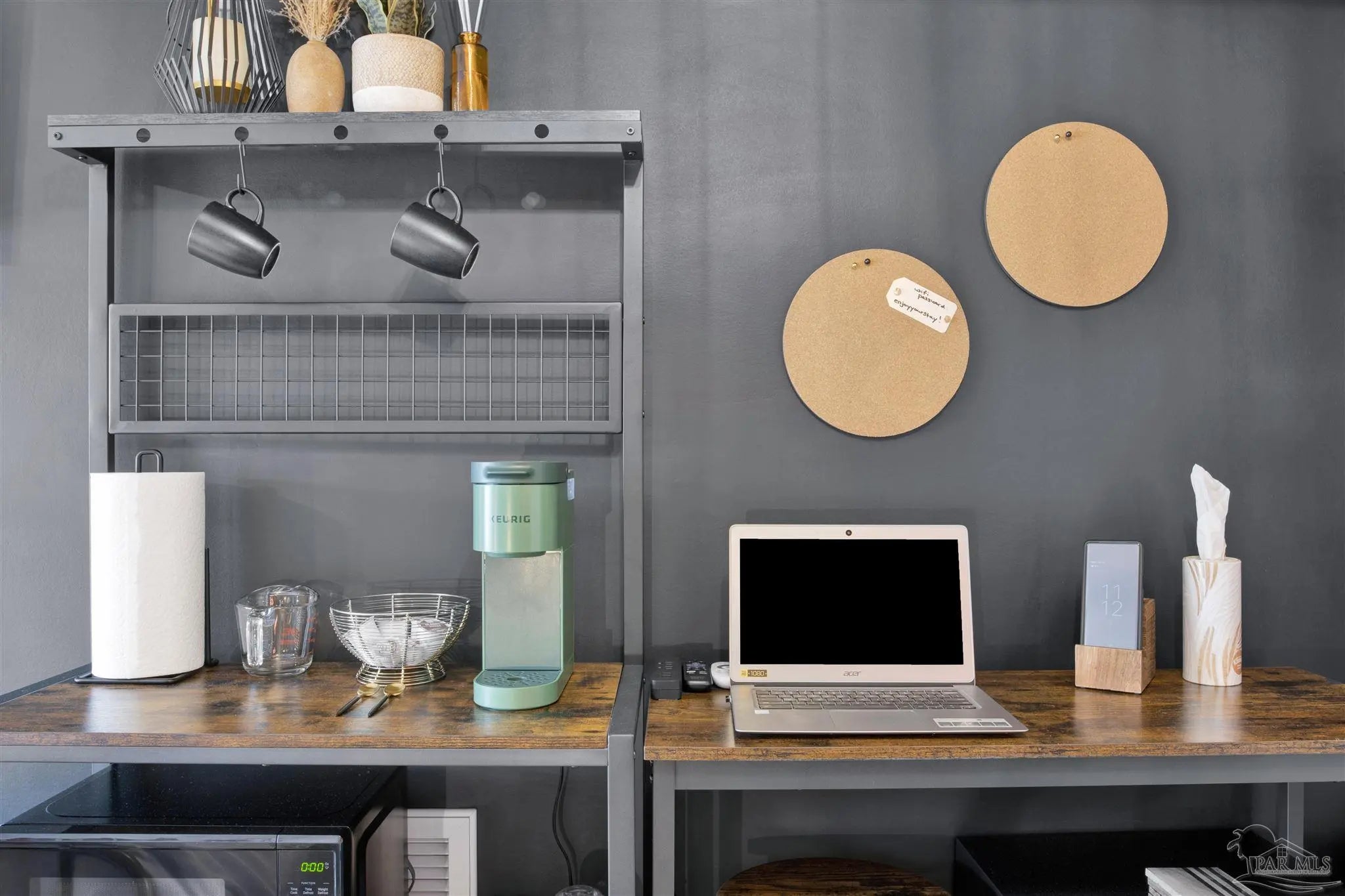 Welcome to this charming Bayshore bungalow, where timeless character meets modern comfort. Behind a private brick courtyard shaded by majestic oaks, you’ll find an inviting outdoor retreat perfect for entertaining or quiet evenings. Inside, a warm brick foyer opens to gleaming Brazilian hardwood floors and spacious living areas, including one with a cozy gas log fireplace. The office features built-in bookshelves, adding both functionality and a sophisticated touch, while modern wallpaper accents bring pops of personality throughout the home. The chef’s kitchen stands out with a Viking range, refrigerator, warming drawer, Bosch dishwasher, custom cabinetry, and a built-in espresso/coffee machine. A formal dining room just off the kitchen is perfect for hosting family and friends. The rear bedroom has been fully renovated with an updated bathroom and French doors leading to a private patio, an ideal spot for morning coffee or catching glimpses of the Blue Angels in practice. Additional features include impact windows, a one-car garage, carport, and detached storage building. Living on Bayshore Drive offers a unique blend of charm and convenience. Take daily walks along Bayshore, where water views provide a peaceful start or finish to your day. Hop on a golf cart and ride less than a mile to the Pensacola Country Club, or take advantage of nearby marinas and the Pensacola Yacht Club, only 1.5 miles away. This home can be sold furnished, making it truly move-in ready. With its flexible layout (including a private 1 bed / 1 bath suite) it also offers rare potential for two Airbnb rentals in one property. Located close to downtown, NAS Pensacola, hospitals, and just a short drive to Pensacola Beach (11 miles) and Perdido Key (14 miles), this home delivers the perfect balance of convenience and Gulf Coast lifestyle.