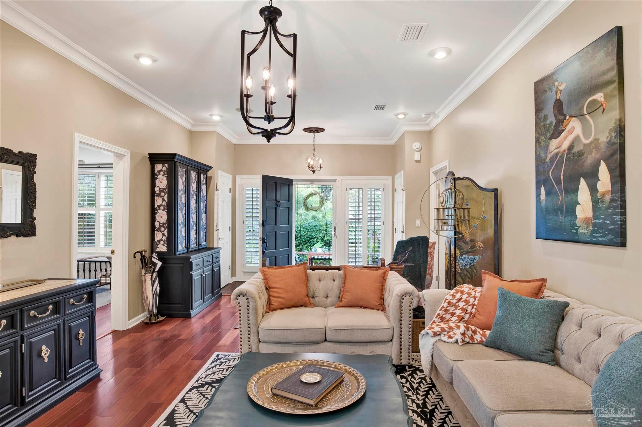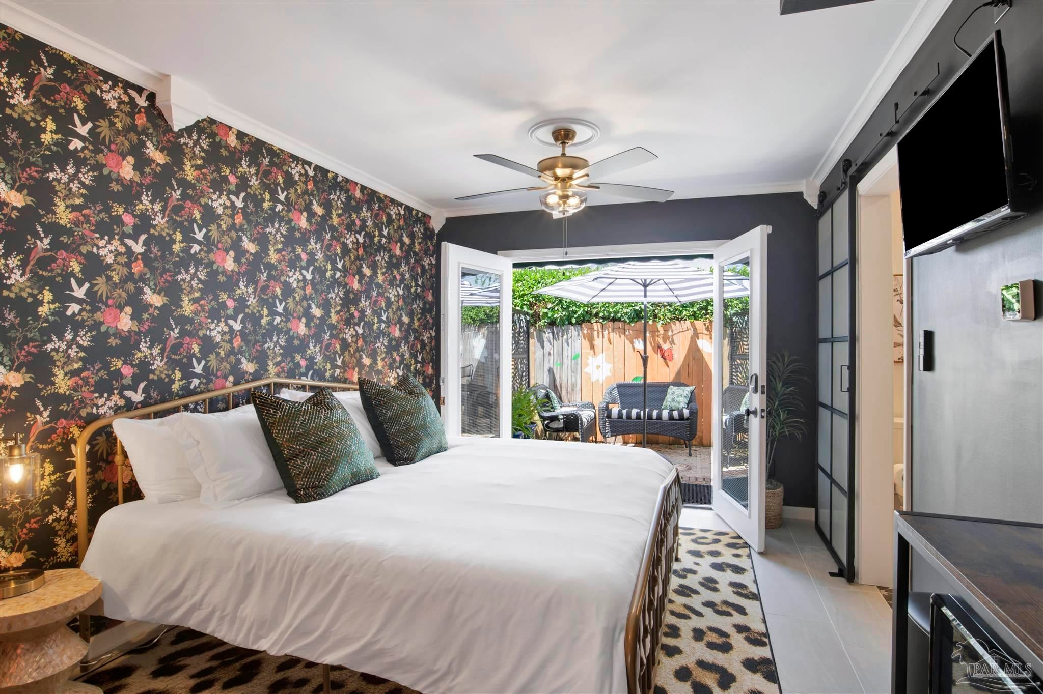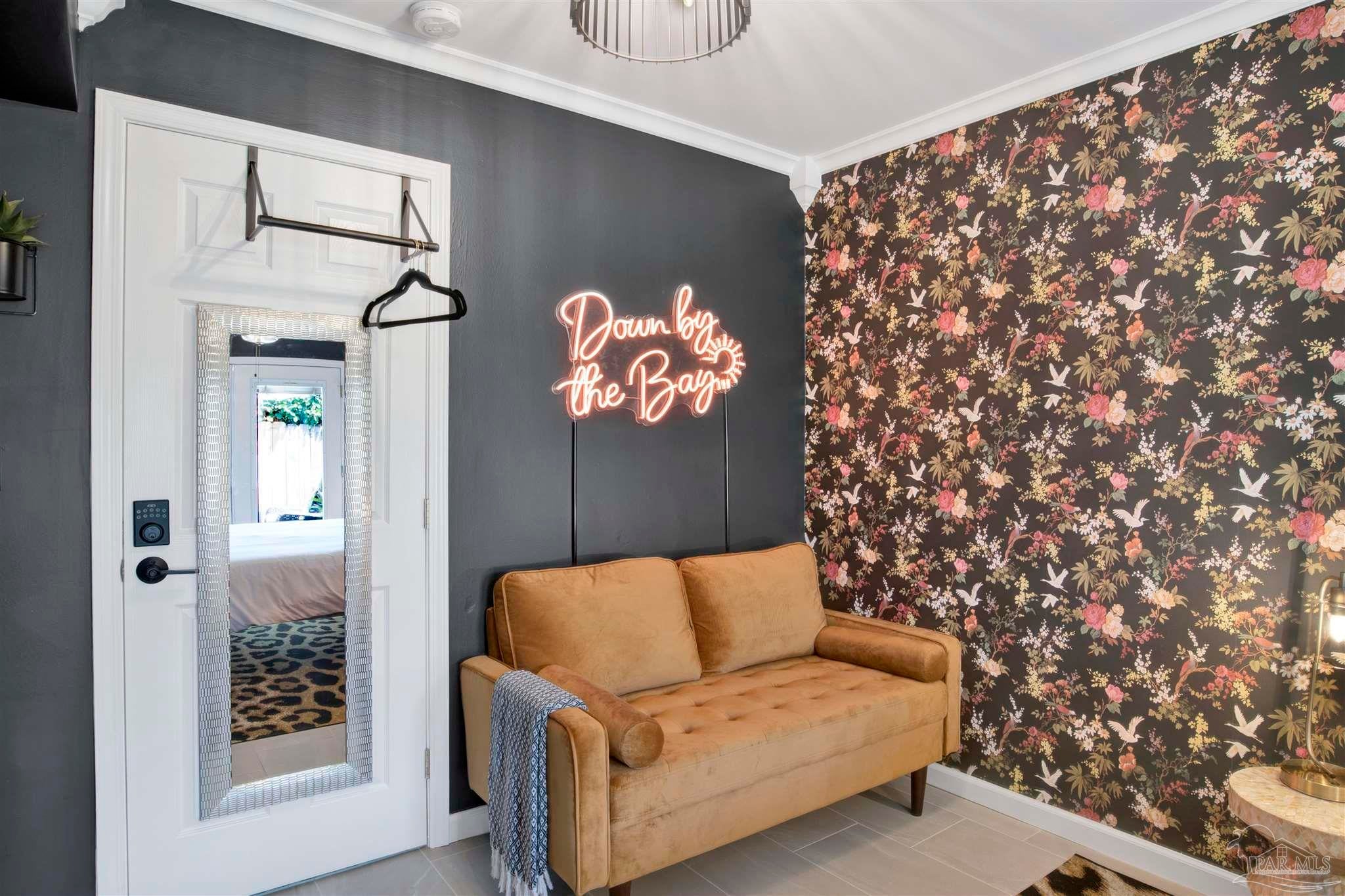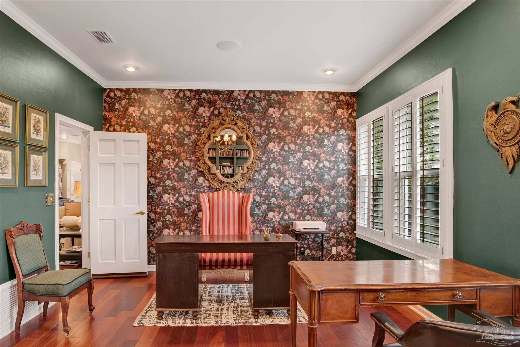 Welcome to this charming Bayshore bungalow, where timeless character meets modern comfort. Behind a private brick courtyard shaded by majestic oaks, you’ll find an inviting outdoor retreat perfect for entertaining or quiet evenings. Inside, a warm brick foyer opens to gleaming Brazilian hardwood floors and spacious living areas, including one with a cozy gas log fireplace. The office features built-in bookshelves, adding both functionality and a sophisticated touch, while modern wallpaper accents bring pops of personality throughout the home. The chef’s kitchen stands out with a Viking range, refrigerator, warming drawer, Bosch dishwasher, custom cabinetry, and a built-in espresso/coffee machine. A formal dining room just off the kitchen is perfect for hosting family and friends. The rear bedroom has been fully renovated with an updated bathroom and French doors leading to a private patio, an ideal spot for morning coffee or catching glimpses of the Blue Angels in practice. Additional features include impact windows, a one-car garage, carport, and detached storage building. Living on Bayshore Drive offers a unique blend of charm and convenience. Take daily walks along Bayshore, where water views provide a peaceful start or finish to your day. Hop on a golf cart and ride less than a mile to the Pensacola Country Club, or take advantage of nearby marinas and the Pensacola Yacht Club, only 1.5 miles away. This home can be sold furnished, making it truly move-in ready. With its flexible layout (including a private 1 bed / 1 bath suite) it also offers rare potential for two Airbnb rentals in one property. Located close to downtown, NAS Pensacola, hospitals, and just a short drive to Pensacola Beach (11 miles) and Perdido Key (14 miles), this home delivers the perfect balance of convenience and Gulf Coast lifestyle.