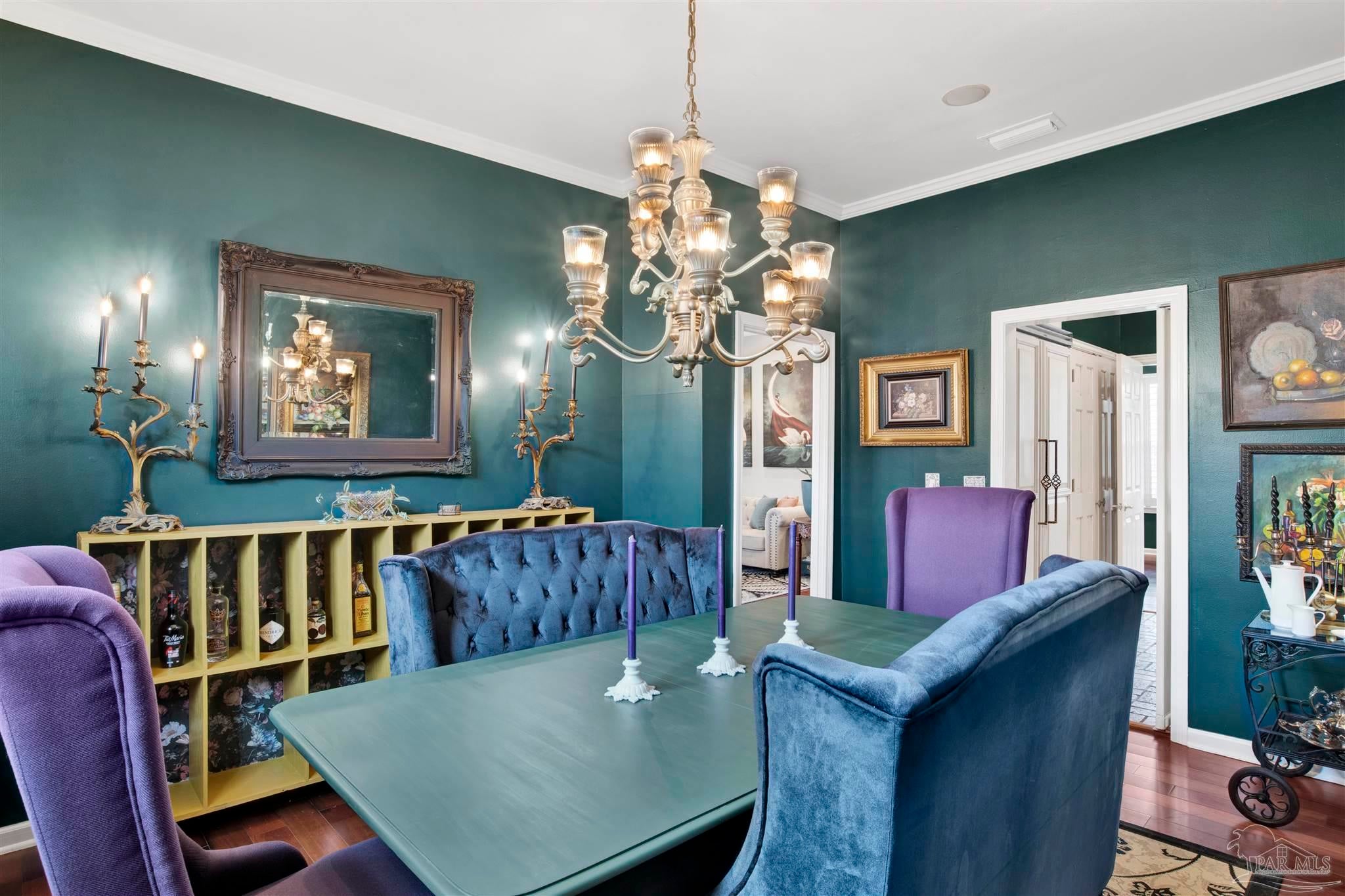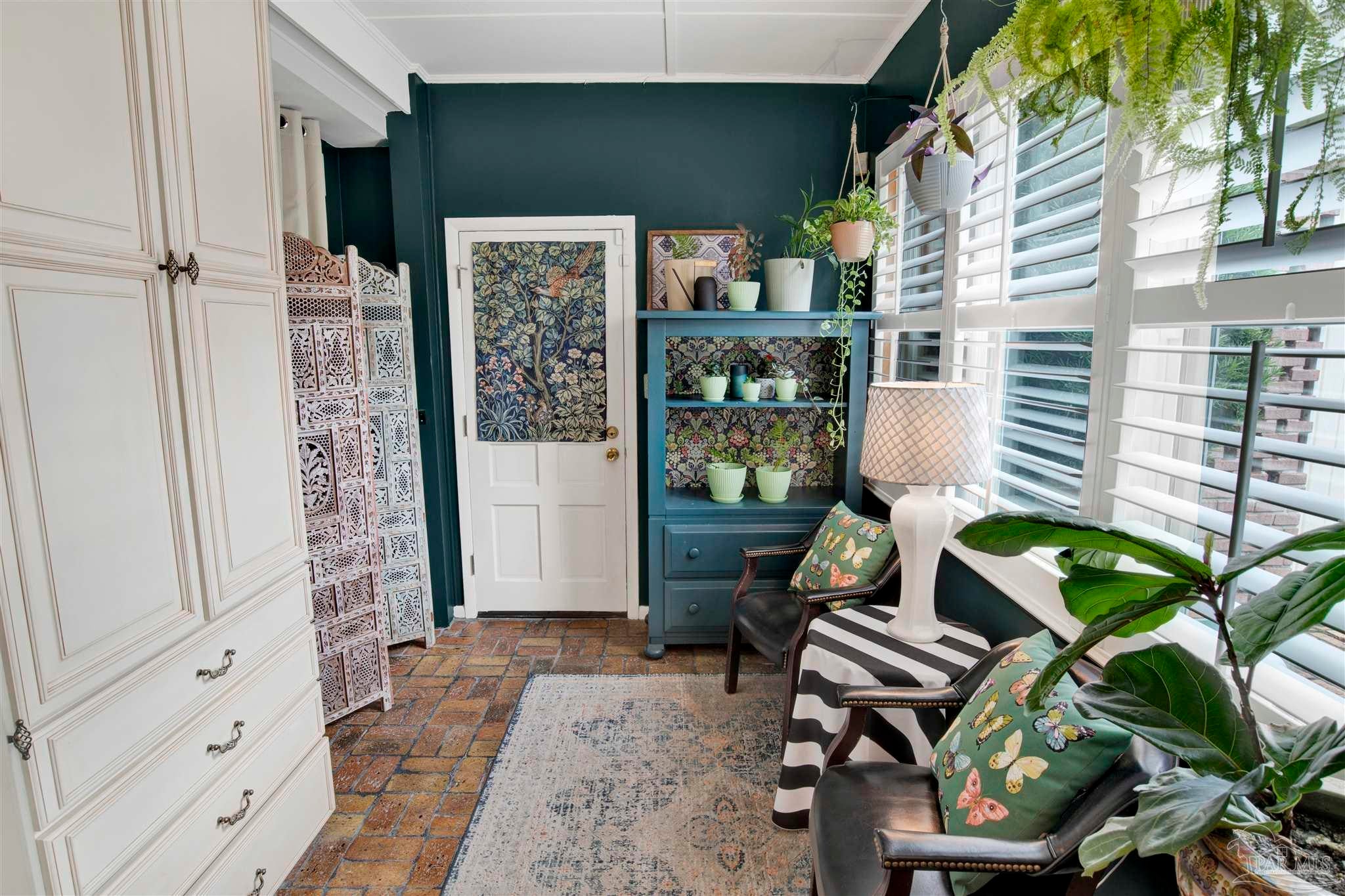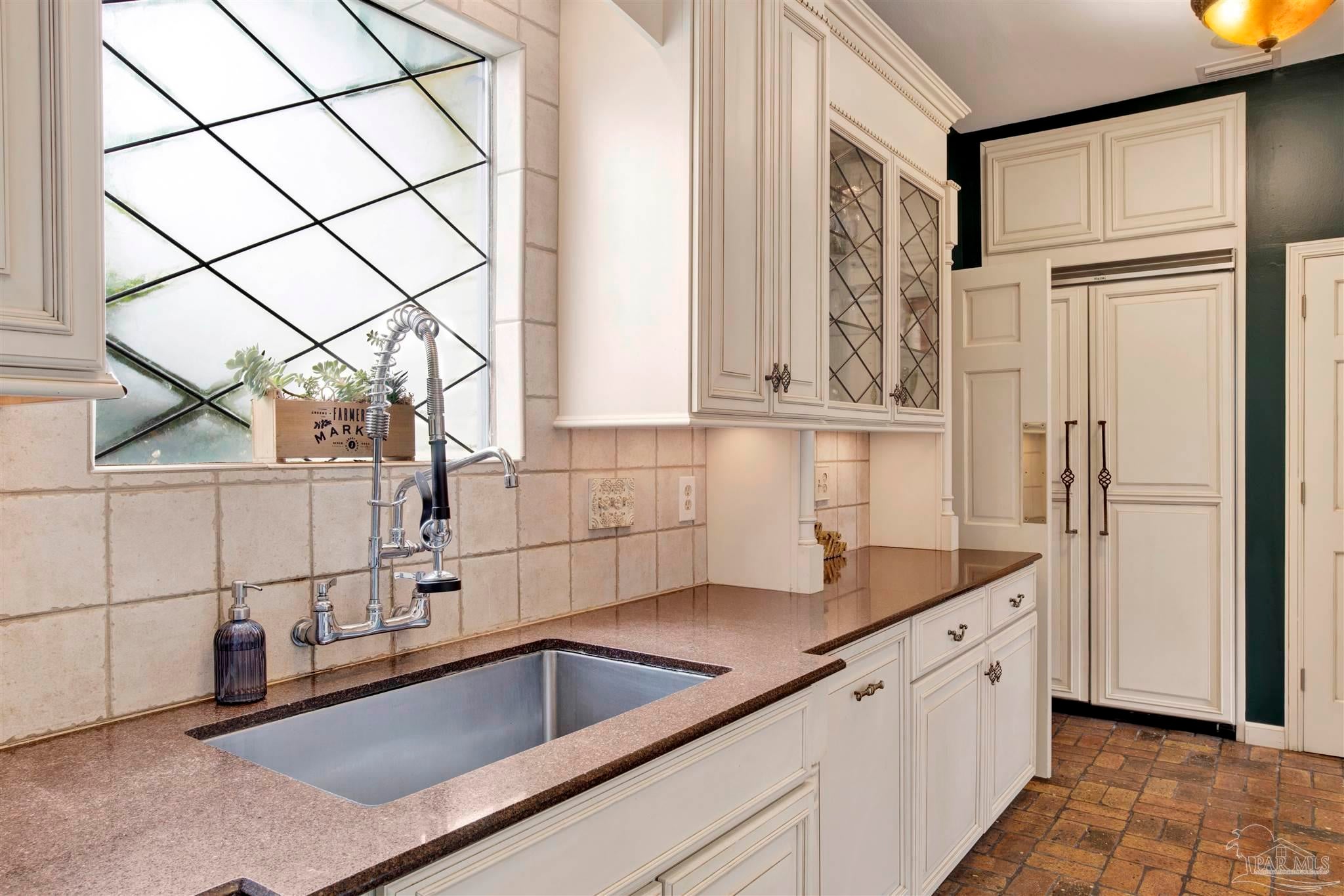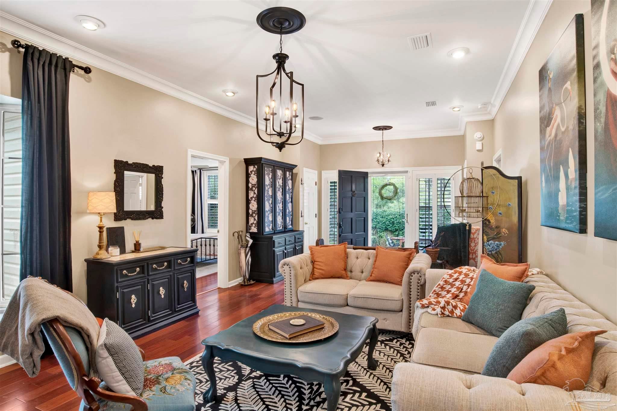 Welcome to this charming Bayshore bungalow, where timeless character meets modern comfort. Behind a private brick courtyard shaded by majestic oaks, you’ll find an inviting outdoor retreat perfect for entertaining or quiet evenings. Inside, a warm brick foyer opens to gleaming Brazilian hardwood floors and spacious living areas, including one with a cozy gas log fireplace. The office features built-in bookshelves, adding both functionality and a sophisticated touch, while modern wallpaper accents bring pops of personality throughout the home. The chef’s kitchen stands out with a Viking range, refrigerator, warming drawer, Bosch dishwasher, custom cabinetry, and a built-in espresso/coffee machine. A formal dining room just off the kitchen is perfect for hosting family and friends. The rear bedroom has been fully renovated with an updated bathroom and French doors leading to a private patio, an ideal spot for morning coffee or catching glimpses of the Blue Angels in practice. Additional features include impact windows, a one-car garage, carport, and detached storage building. Living on Bayshore Drive offers a unique blend of charm and convenience. Take daily walks along Bayshore, where water views provide a peaceful start or finish to your day. Hop on a golf cart and ride less than a mile to the Pensacola Country Club, or take advantage of nearby marinas and the Pensacola Yacht Club, only 1.5 miles away. This home can be sold furnished, making it truly move-in ready. With its flexible layout (including a private 1 bed / 1 bath suite) it also offers rare potential for two Airbnb rentals in one property. Located close to downtown, NAS Pensacola, hospitals, and just a short drive to Pensacola Beach (11 miles) and Perdido Key (14 miles), this home delivers the perfect balance of convenience and Gulf Coast lifestyle.
