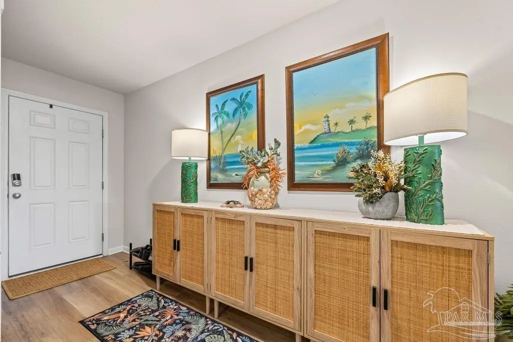 UPGRADES, COMFORT, AND COMMUNITY: Step into elevated living where every inch reflects care and investment. The entire home features upgraded luxury vinyl plank flooring. Custom blinds bring privacy and elegance to each space. The kitchen is a showpiece. Quartz counters, full-height backsplash, upgraded appliance suite, under-cabinet lighting, and a massive island anchor the space. A walk-in pantry with smart organization elevate the experience. Your primary retreat is very relaxing:The master suite includes a custom closet system built to impress. Upgraded fixtures elevate the bathrooms. Dual vanities, designer accent wall. Upgraded lighting. Your built-in walk-in closet with LED lighting and shelving makes organization a joy. Guest bedrooms feel spacious, light-filled, and comfortable. The secondary bedrooms are warm and welcoming, ready for family, guests and even home office use. Step outside and let the backyard steal your breath: a covered pergola with fans provides solace from the sun or rain. The yard is fully thought-out with an efficient sprinkler system, dual French drains, and custom gutters all around keep water in its place. The 10’×16’ Storage Pro shed, fully insulated and cooled, adds serious functional space. But the heart of this home is the community around it. Neighbors are familiar faces. Block gatherings, seasonal get togethers, and impromptu conversations on sidewalks happen organically. Many homeowners here are military or public servants, so care, respect, and consistency are common themes. Move into more than a house — move into a place where you belong. Location is stellar: close to schools, easy access to I-10, and a short drive to Pensacola or Milton. The HOA is reasonable The solar panels (on lease) help keep electric bills incredibly low -