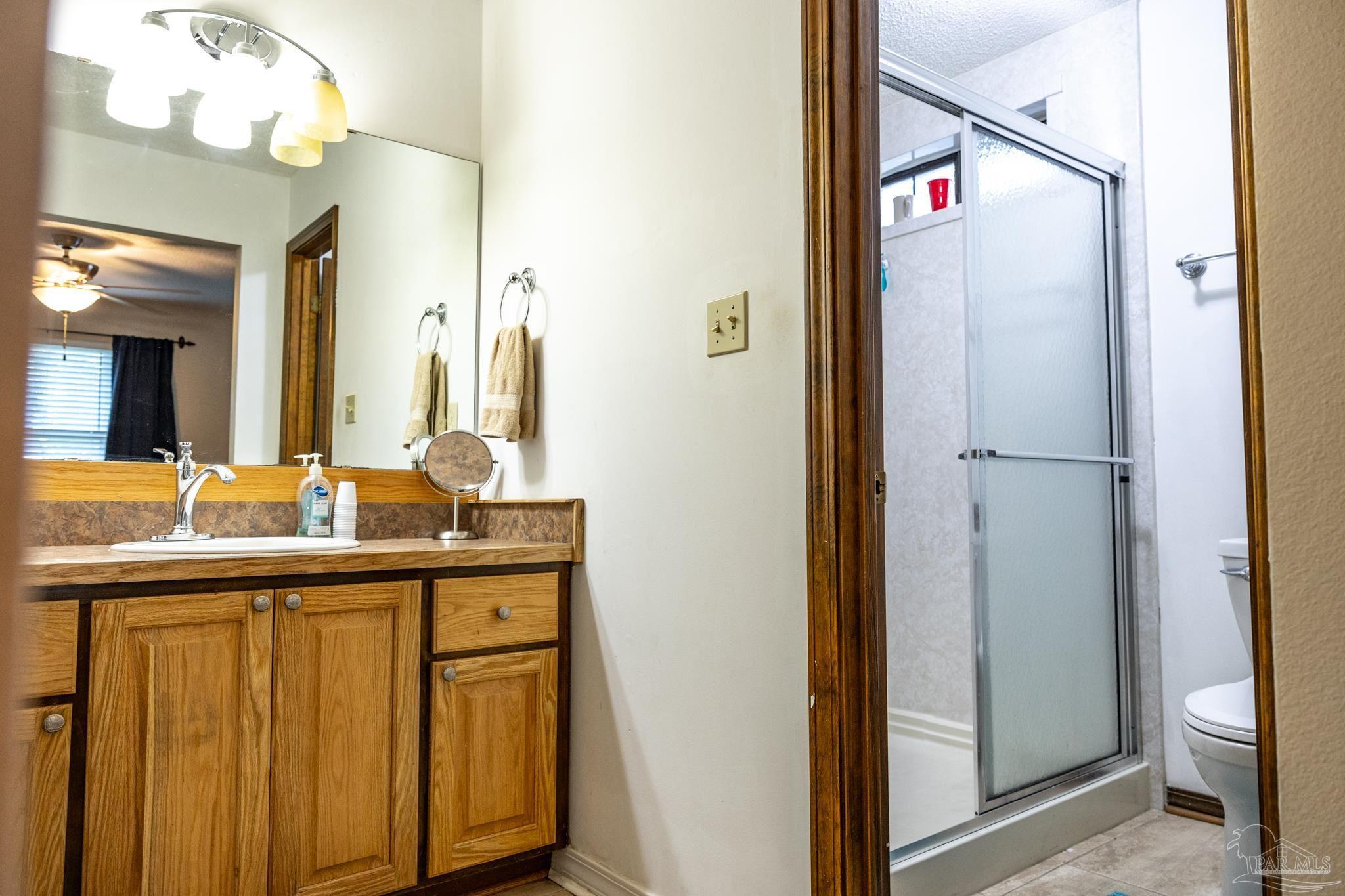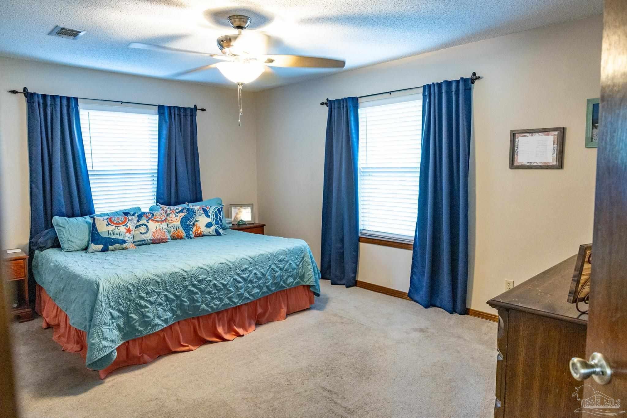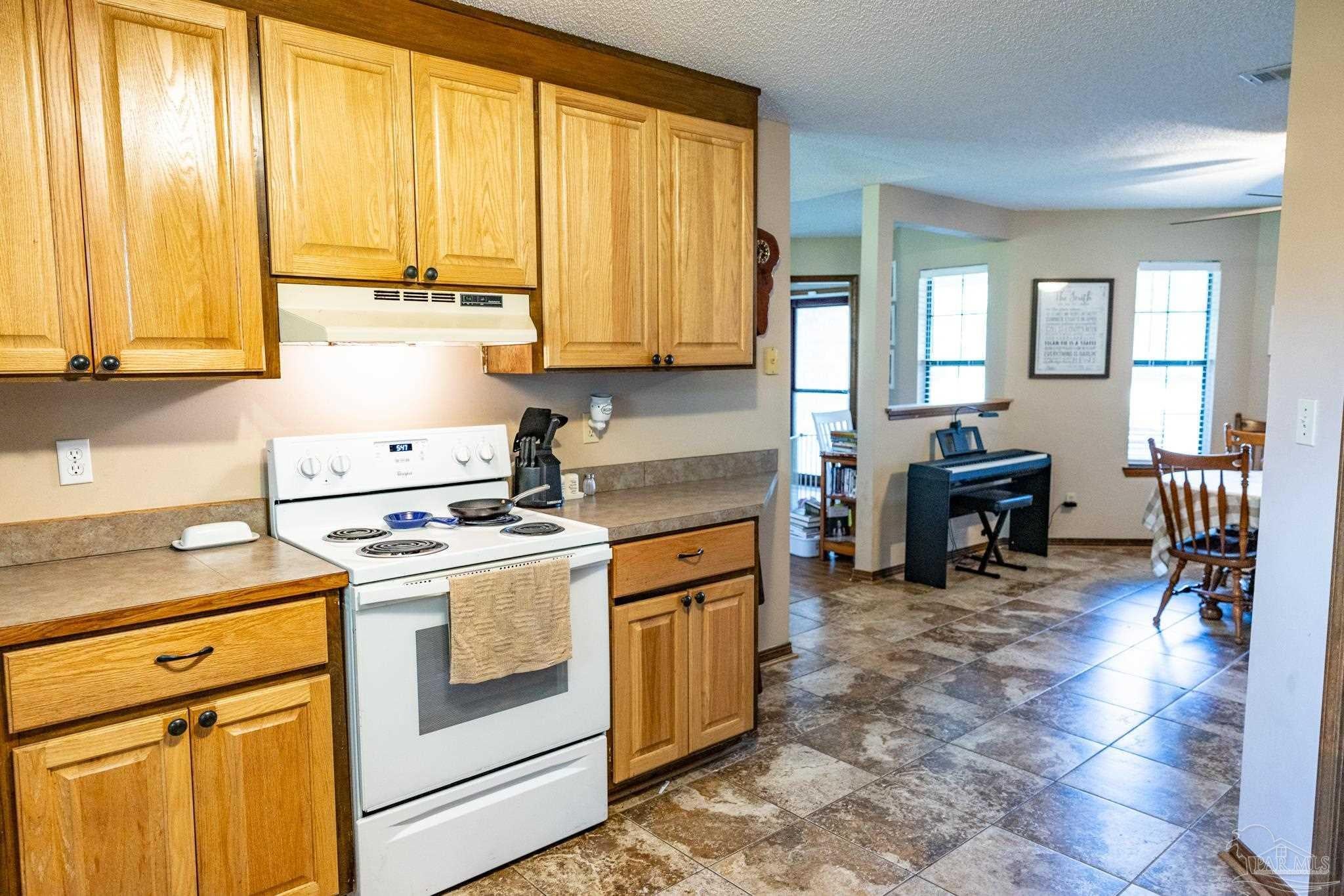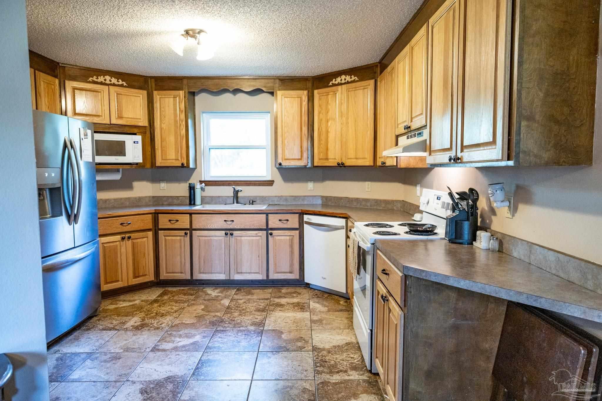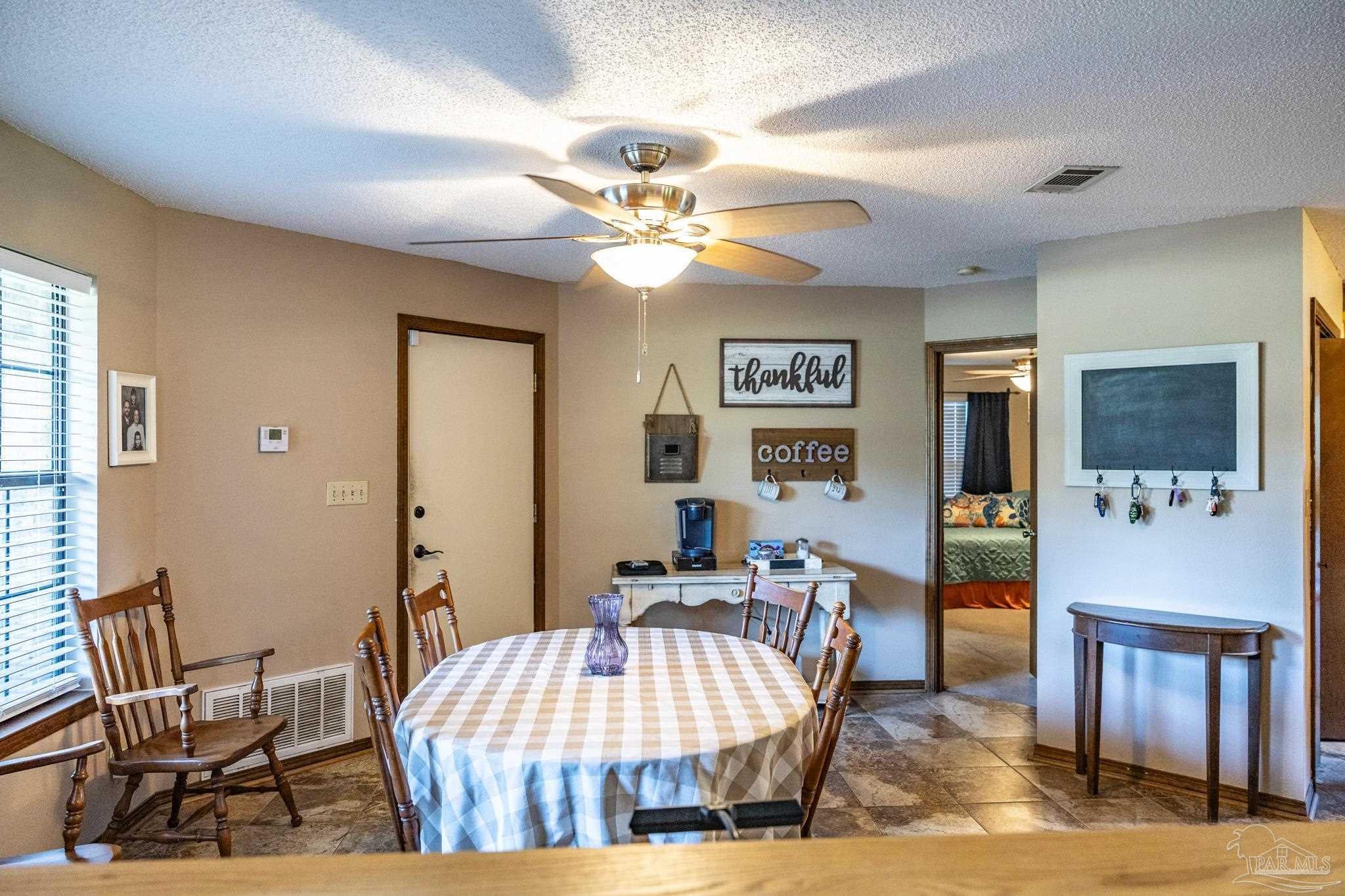 This charming 3-bedroom, 2-bath brick home offers 1,492 square feet of comfortable living space on over half an acre in a quiet, well-established neighborhood. The open floor plan features a spacious living area with laminate wood flooring and a beautiful brick, wood-burning fireplace, while the dining area includes durable tile flooring. The split floor plan provides privacy, and the primary suite boasts a walk-in closet, tiled bath, and oversized walk-in shower. Both bathrooms include anti-clog commodes. Energy efficiency is enhanced with radiant barrier insulation in the attic and updated rear windows (2018), significantly reducing power bills. Additional highlights include a large, privacy-fenced backyard, a side-entry two-car garage with pull-down attic access, and a detached carport for extra parking. The A/C and water heater were replaced in 2018. The roof was replace in 2022. Conveniently located near shopping, grocery stores, and medical facilities, this home is just 8 miles from NAS Whiting Field and about 45 minutes from Pensacola Beach.