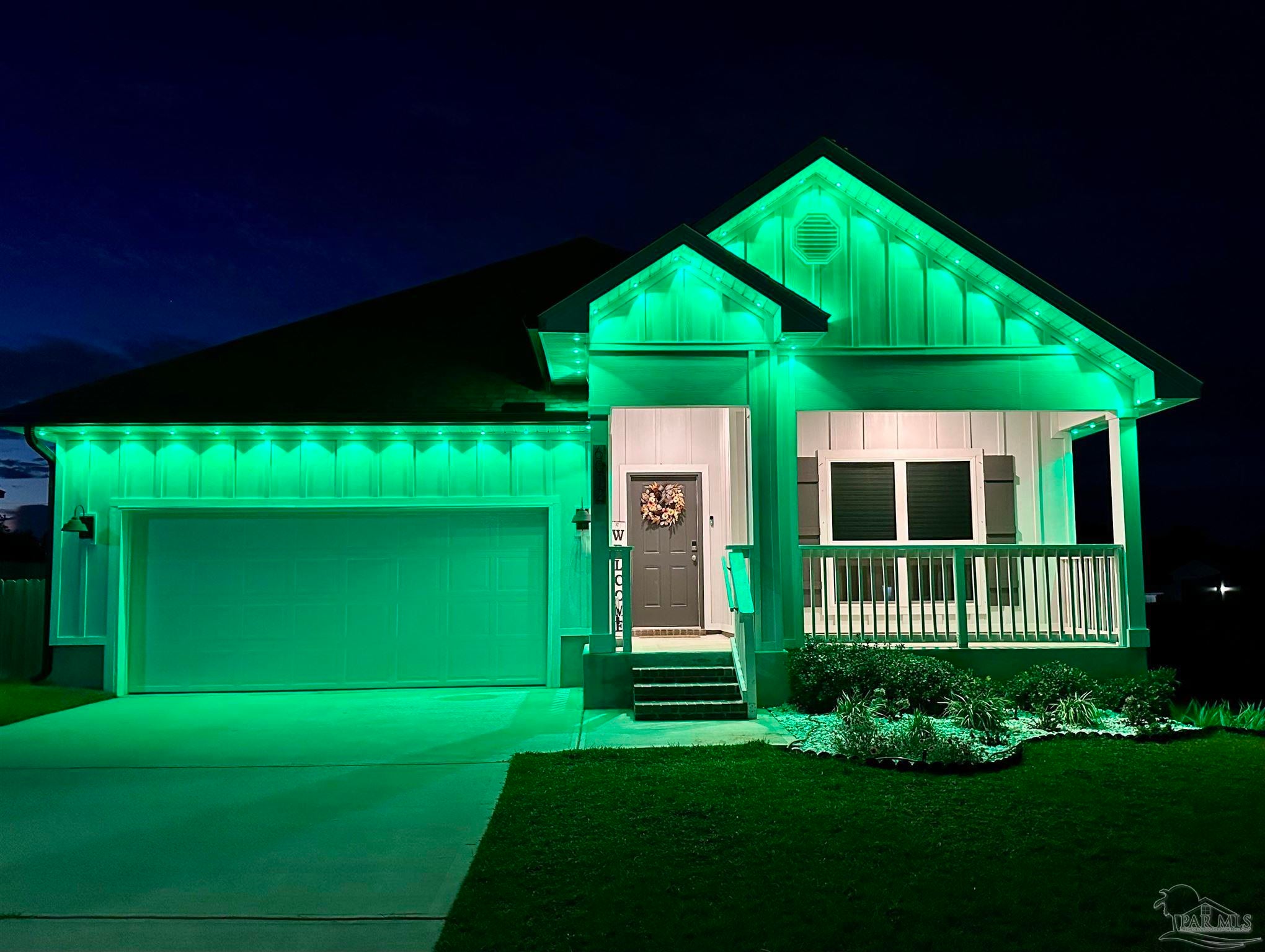 This approximately 1,800 square foot house features four bedrooms and two bathrooms. The spacious exterior offers an inviting porch, a well-maintained landscaped yard, and a charming, welcoming entrance. The interior boasts a spacious entryway, luxury vinyl flooring, and abundant natural light throughout. The open concept design creates a bright and airy living space. The modern kitchen is equipped with stainless steel appliances and granite countertops, seamlessly integrated into the open floor plan. The primary bedroom is spacious, with a neutral color palette and a well-appointed vanity area featuring abundant lighting. The backyard is expansive and well-maintained, providing ample space for outdoor enjoyment. The home also features a covered front and back porch, a privacy fence, tray ceilings, recessed lighting, and wainscoting. The exterior is enhanced by a Govee light pro lighting system, creating a welcoming and visually appealing atmosphere.