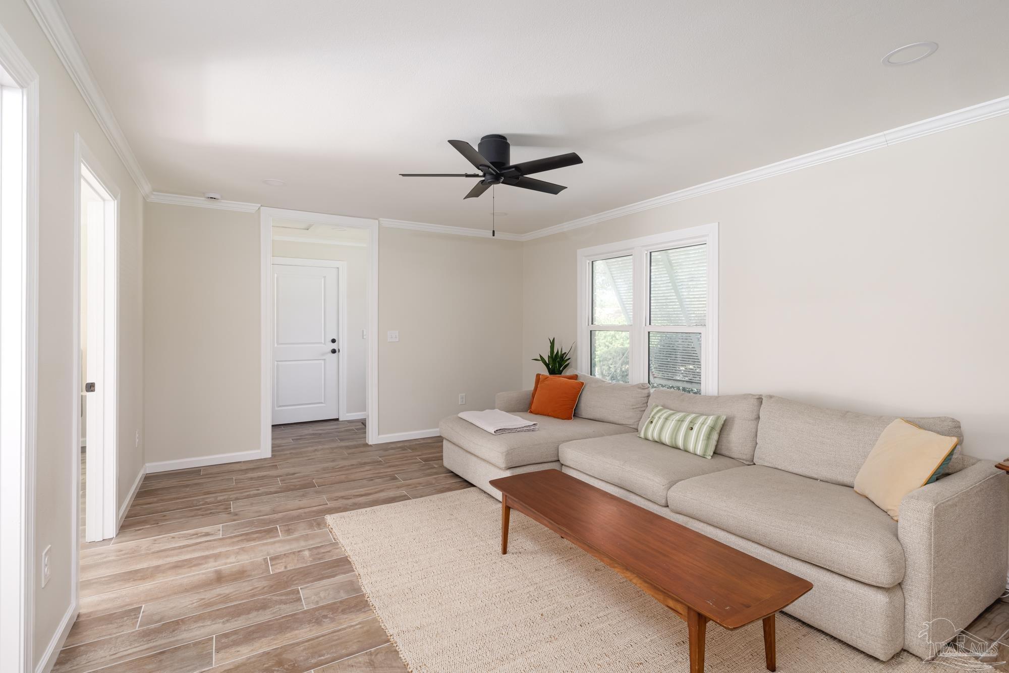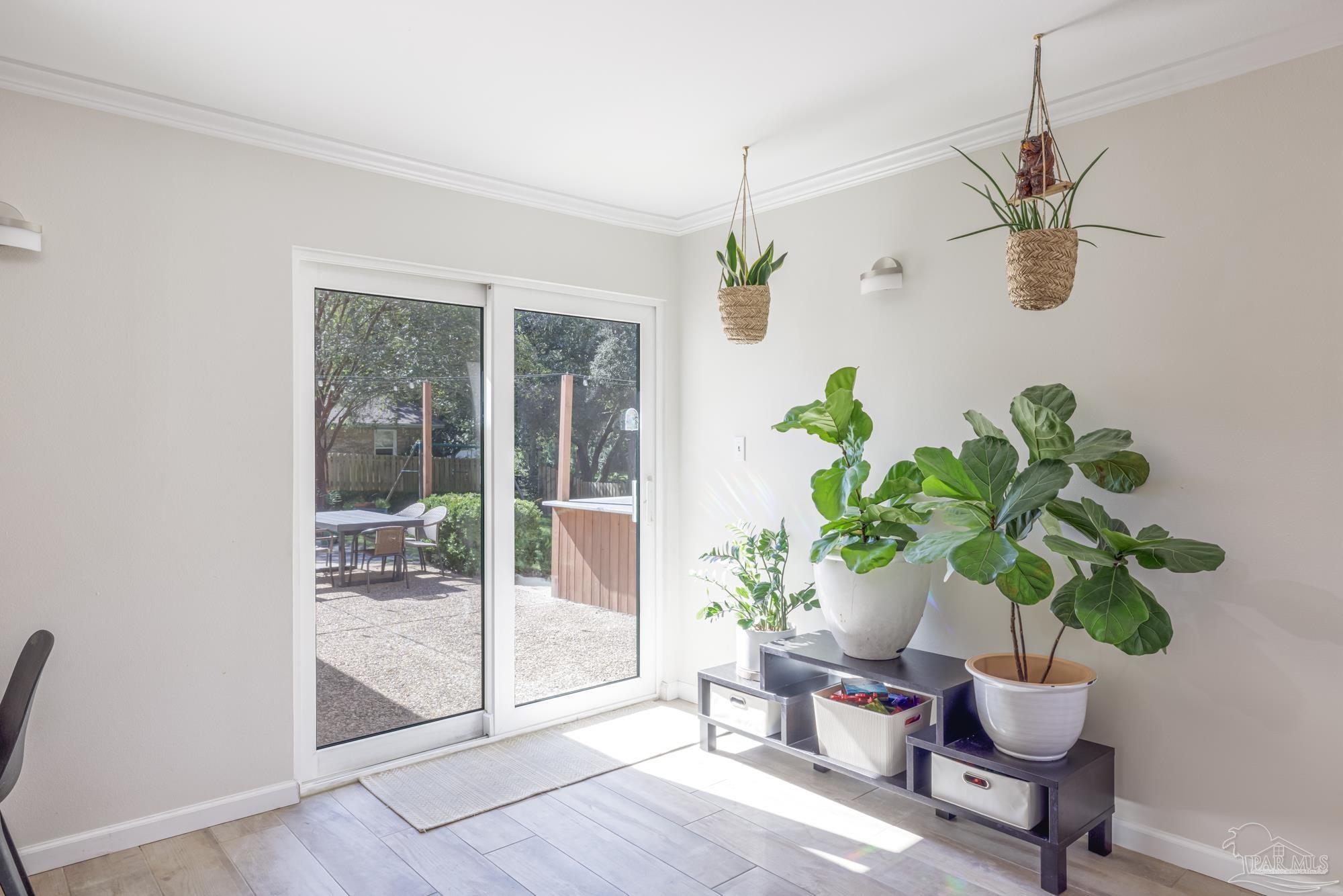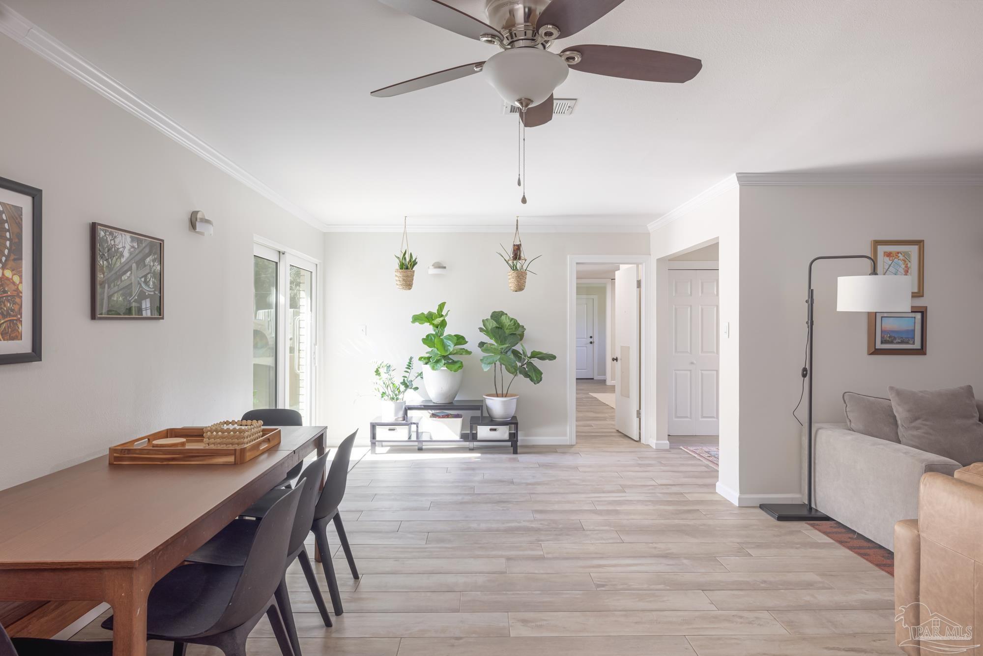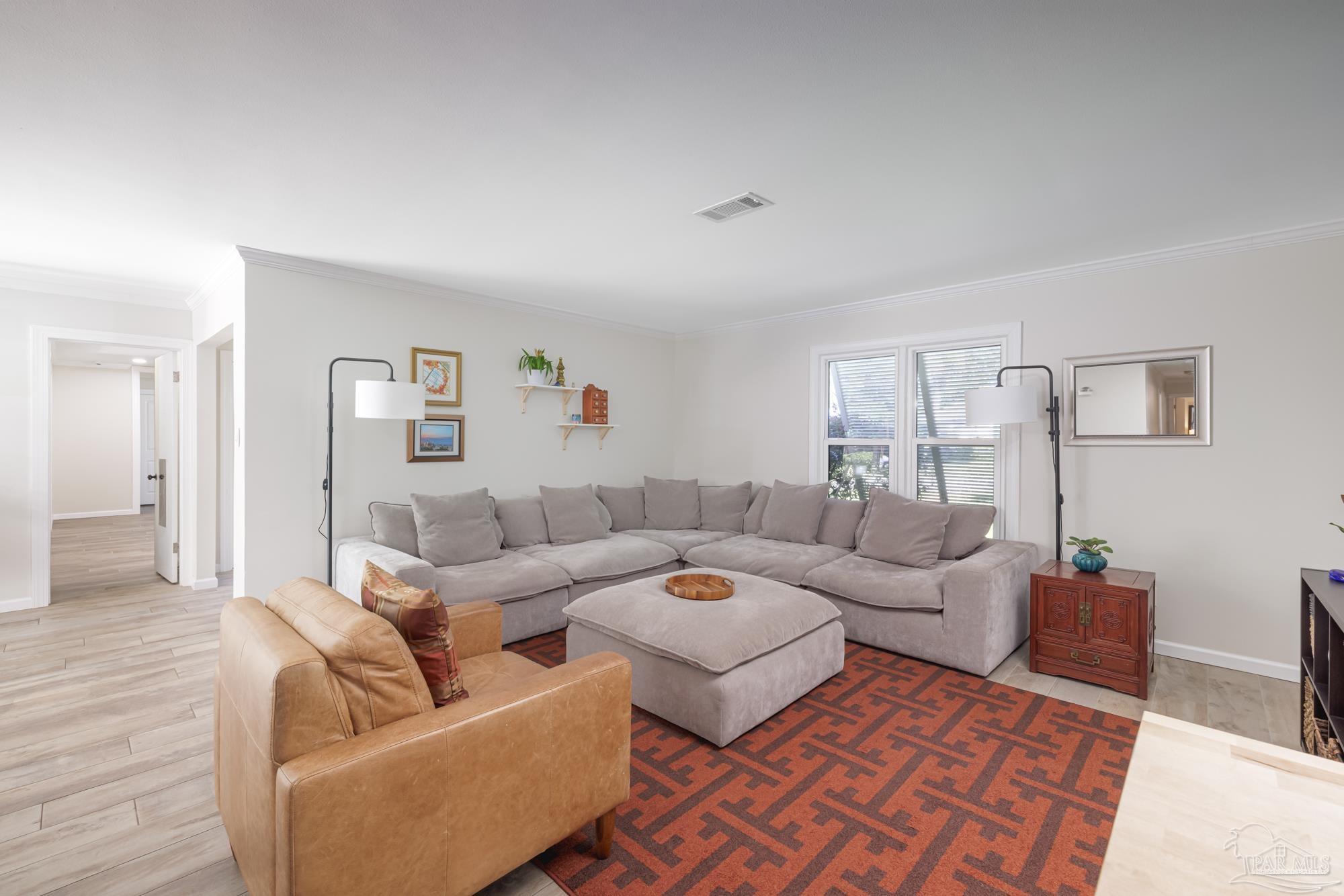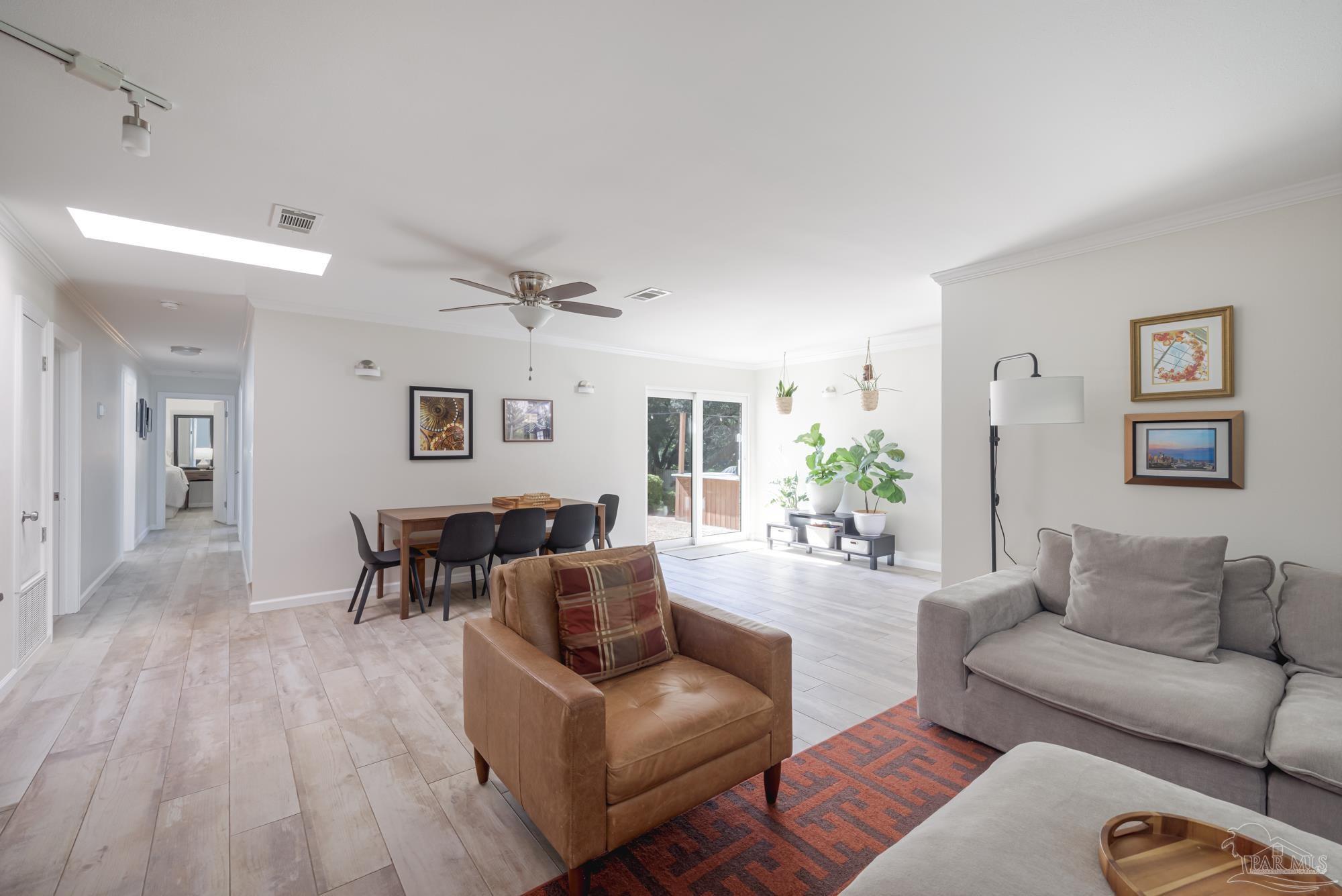 Spacious 5-Bedroom + Office Home on an Expansive Corner Lot in Gulf Breeze Proper. Set back from the road on an enormous corner lot, this beautifully updated Gulf Breeze Proper home offers the perfect blend of comfort, flexibility, and modern upgrades. With five bedrooms plus a dedicated office and over 2,500 square feet of living space, there’s room for everyone to live, work, and play. Step inside to a bright, open layout designed for easy indoor–outdoor living and entertaining. The foyer opens to a large combined living, dining, and kitchen area bathed in natural light from large windows, sliding glass doors, and a central skylight that creates a warm, welcoming focal point. The galley-style kitchen offers ample cabinetry, generous counter space, and stainless steel appliances. Just off the living room, a private office provides the perfect spot for a home workspace, fitness room, or creative studio. Down the main hallway are four spacious bedrooms and a full bath. The bedrooms have plenty of storage and light, with large windows and double closets in each. The primary suite sits at the end of the hall, creating a peaceful retreat with double closets and a tiled shower. With adjoining access to the smallest bedroom, the unique layout is especially convenient for families with a young child. The south wing of the home functions perfectly as a guest or in-law suite, and features its own living room, a fifth bedroom, a laundry room, a full bath, and access to the brand-new two car garage (added in 2024). Outside, enjoy the ultimate year-round entertaining space. The expansive fenced backyard features an outdoor kitchen with a pizza oven, a large patio for dining and relaxing, and plenty of space for children to play. In recent years, this home has seen numerous high-value upgrades, including 400 square feet of additional living space, a new two-car garage, and upgraded, impact-rated windows and exterior doors. Located just minutes from parks and A rated schools!