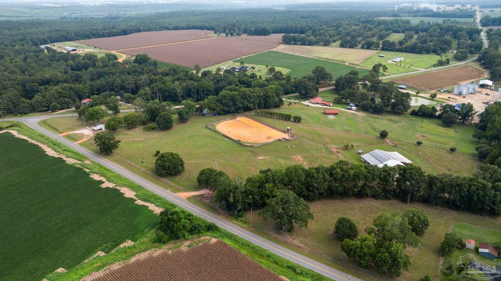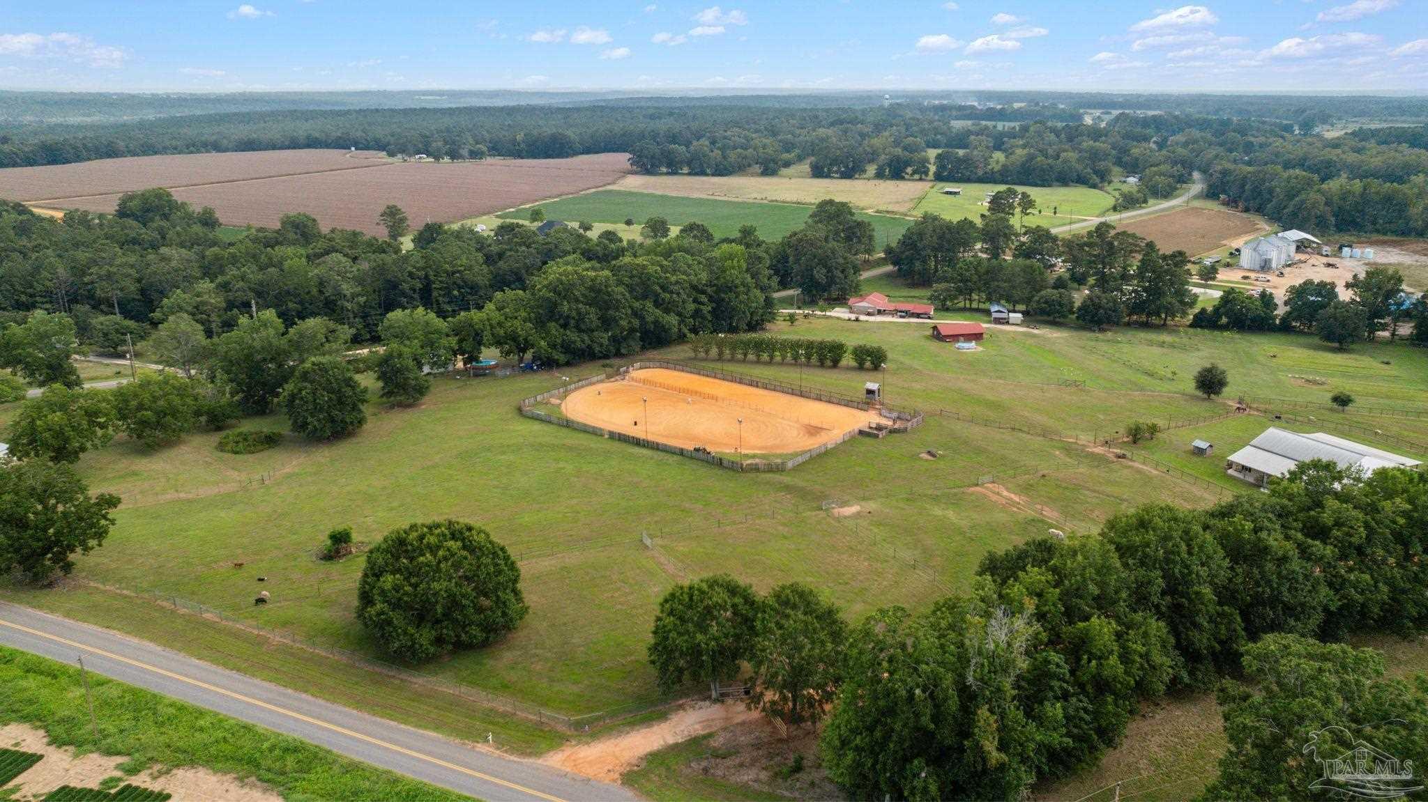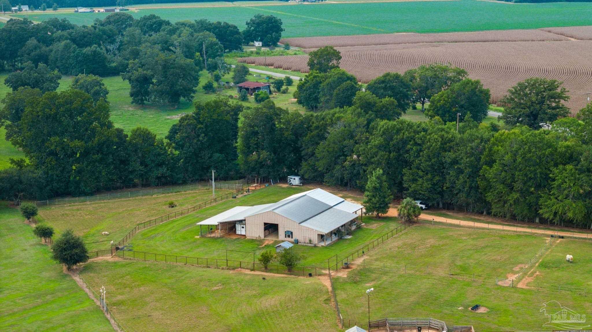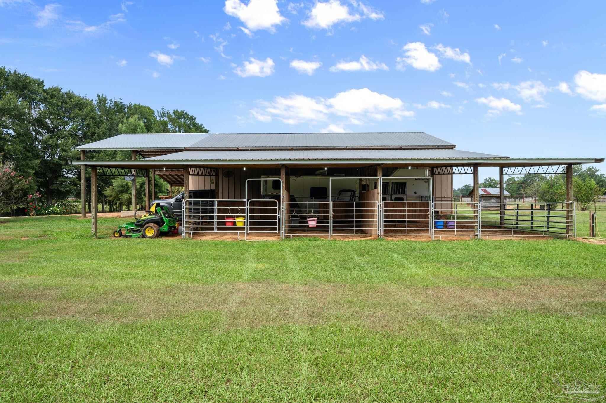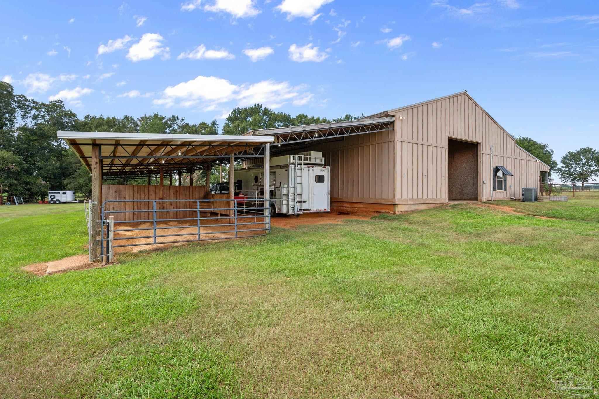 Discover your country oasis in Monroe County, AL! This one-of-a-kind Barndominium sitting on +/- 10 acres blends country charm with modern living across an expansive 7,800 sq ft total and 1,560 sq ft of thoughtfully designed living space. Inside, 14-foot ceilings soar above a warm, inviting layout featuring 3 bedrooms and 1.5 baths, with striking custom stained concrete floors that add texture and depth. Outdoor enthusiasts will be delighted by the fully equipped equestrian amenities: 9 separate livestock paddocks, 7 stalls, a complete tack and feed room, sturdy pipe fencing, and a lighted 150’ x 225’ arena with an announcer’s stand for events and practice. Convenience and practicality abound with a gated drive, RV/horse trailer cover with hookups, a carport, and two roll-up barn doors for easy access. Peach trees are an added bonus! Location could not be better - just 70 miles from Pensacola or Mobile, 90 miles to Gulf Shores, and within easy reach of Montgomery (120 miles) and New Orleans (200 miles). This home truly has it all, so call us today and make this property the address of your dreams!