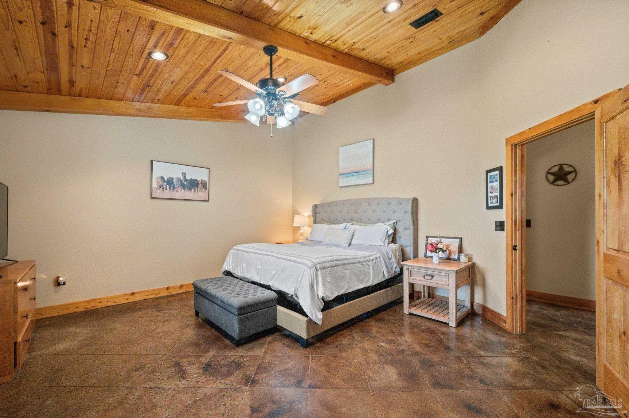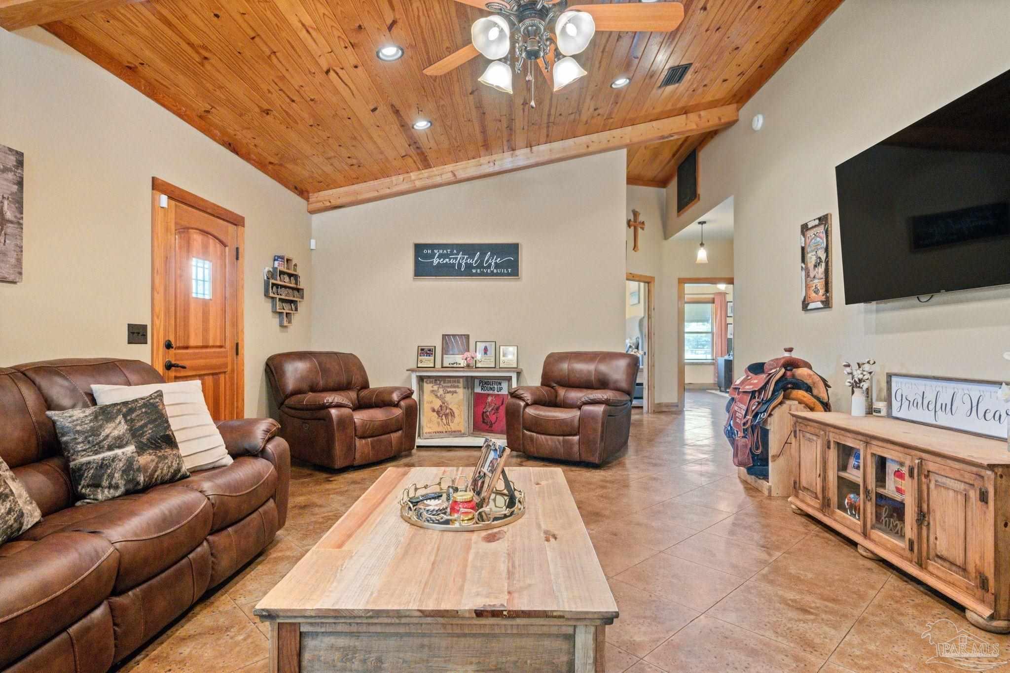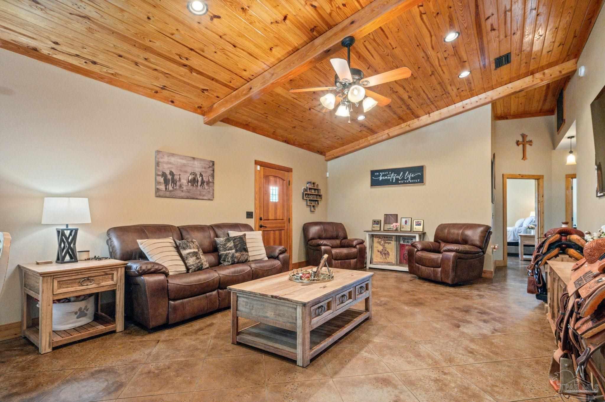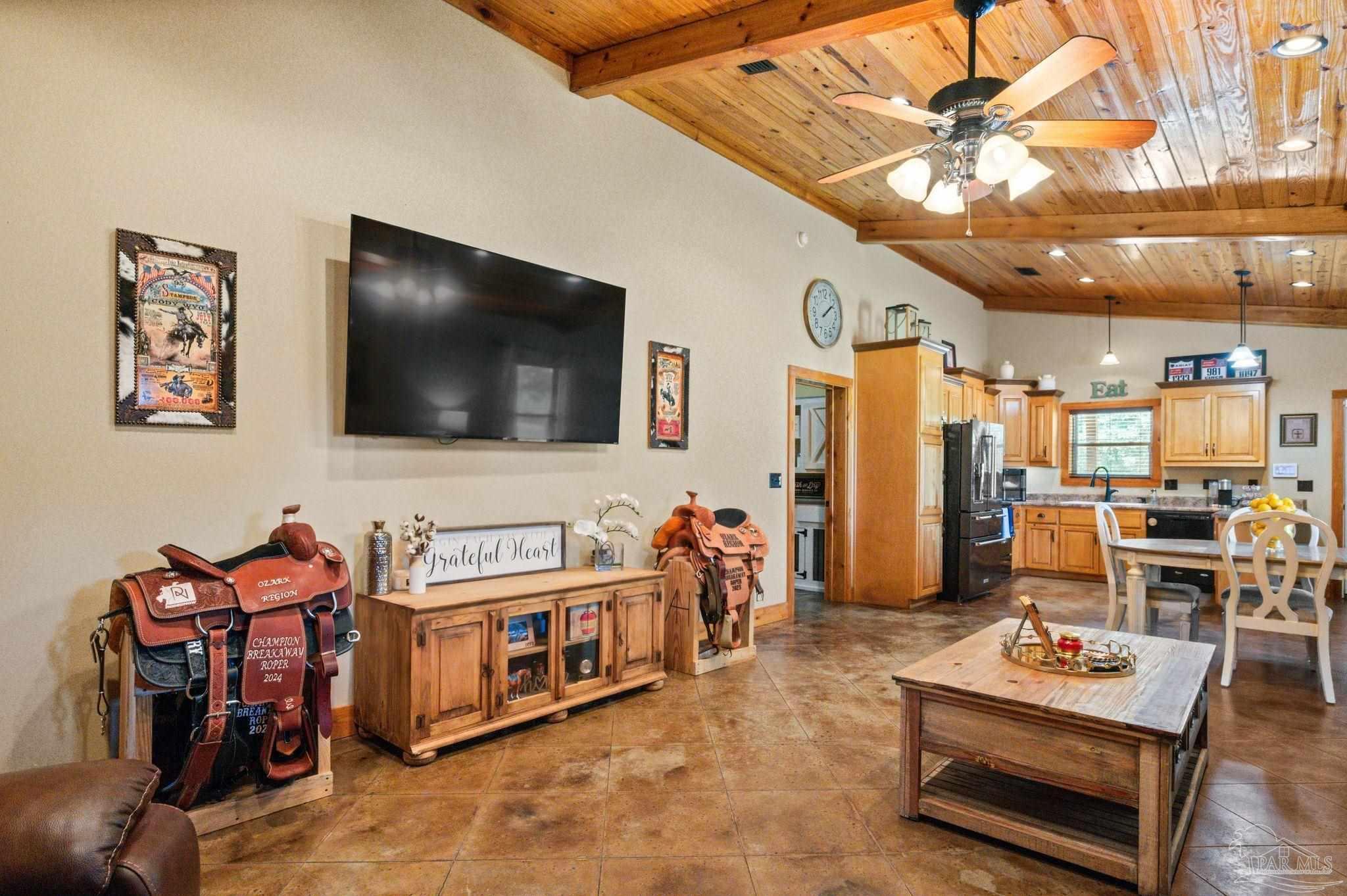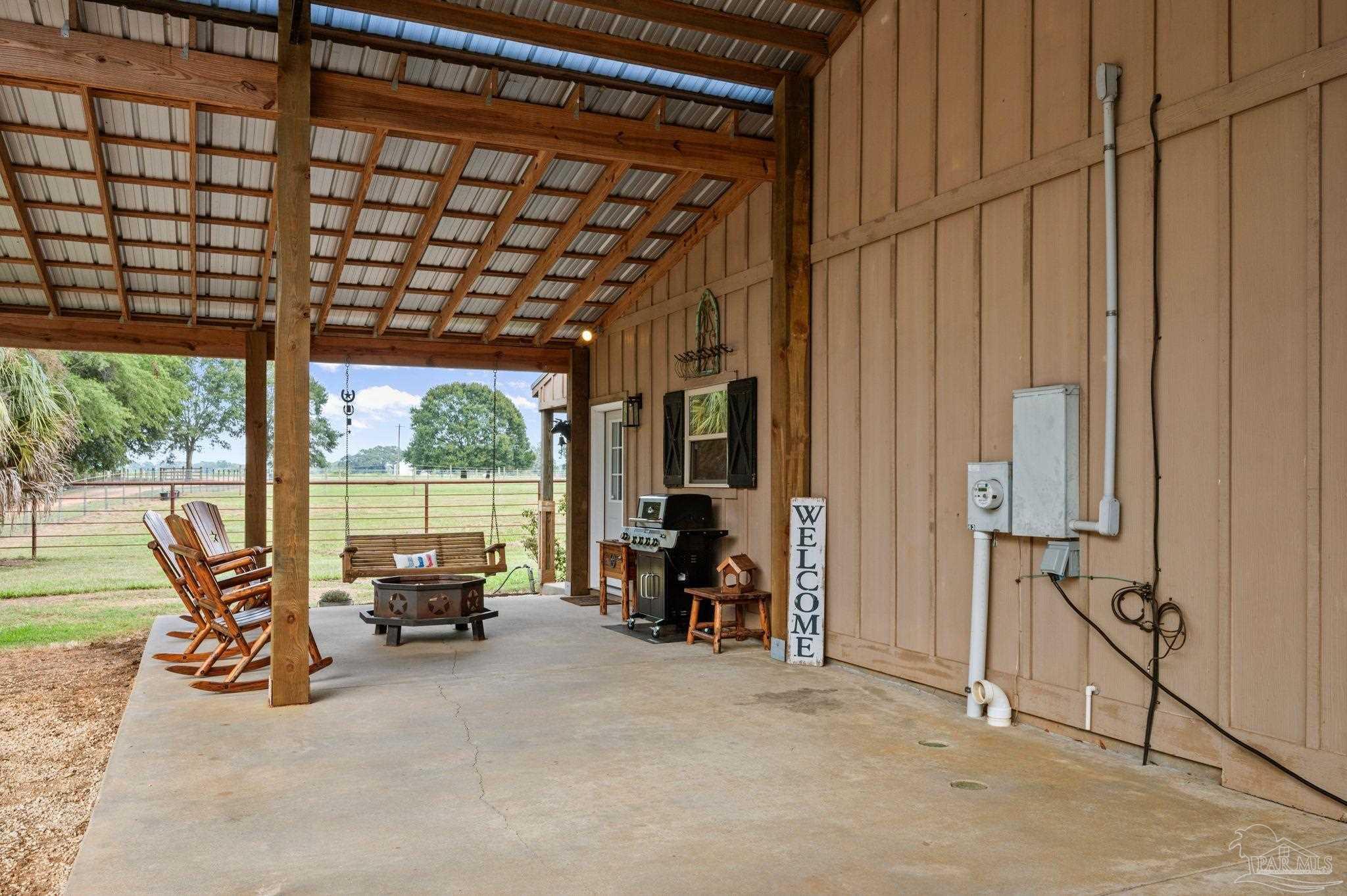 Discover your country oasis in Monroe County, AL! This one-of-a-kind Barndominium sitting on +/- 10 acres blends country charm with modern living across an expansive 7,800 sq ft total and 1,560 sq ft of thoughtfully designed living space. Inside, 14-foot ceilings soar above a warm, inviting layout featuring 3 bedrooms and 1.5 baths, with striking custom stained concrete floors that add texture and depth. Outdoor enthusiasts will be delighted by the fully equipped equestrian amenities: 9 separate livestock paddocks, 7 stalls, a complete tack and feed room, sturdy pipe fencing, and a lighted 150’ x 225’ arena with an announcer’s stand for events and practice. Convenience and practicality abound with a gated drive, RV/horse trailer cover with hookups, a carport, and two roll-up barn doors for easy access. Peach trees are an added bonus! Location could not be better - just 70 miles from Pensacola or Mobile, 90 miles to Gulf Shores, and within easy reach of Montgomery (120 miles) and New Orleans (200 miles). This home truly has it all, so call us today and make this property the address of your dreams!