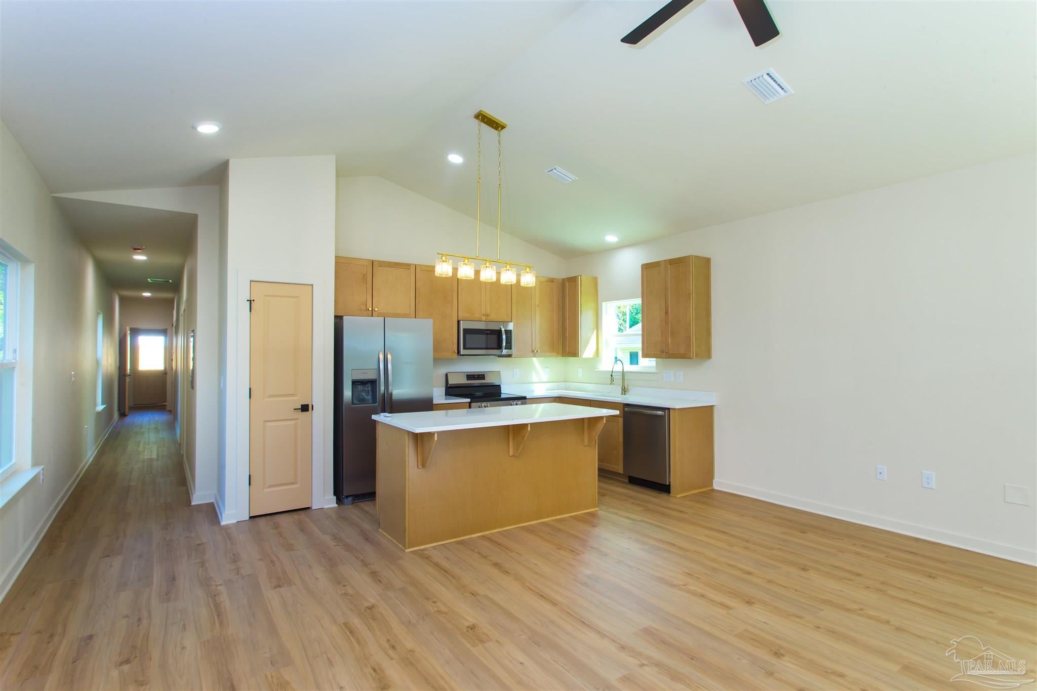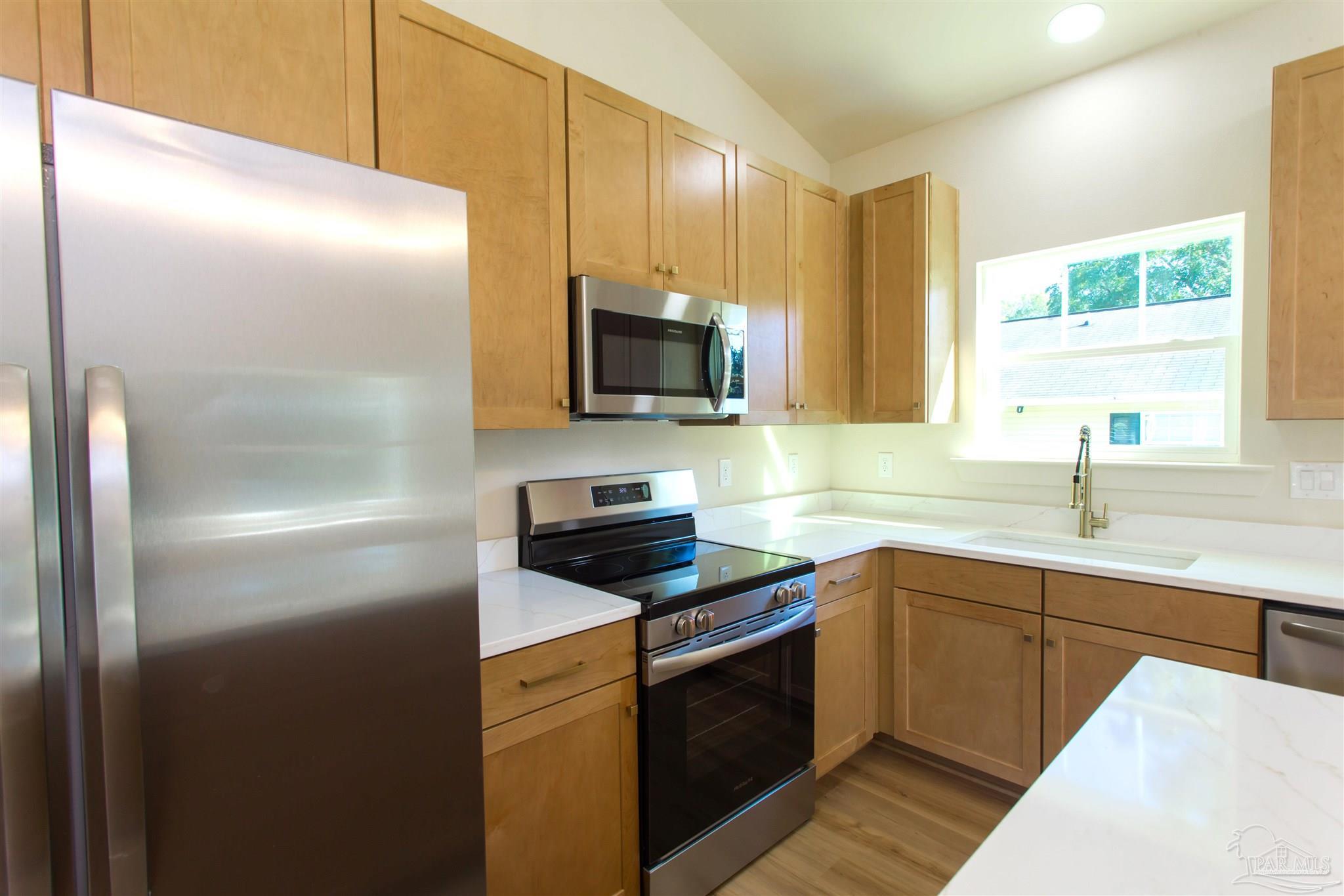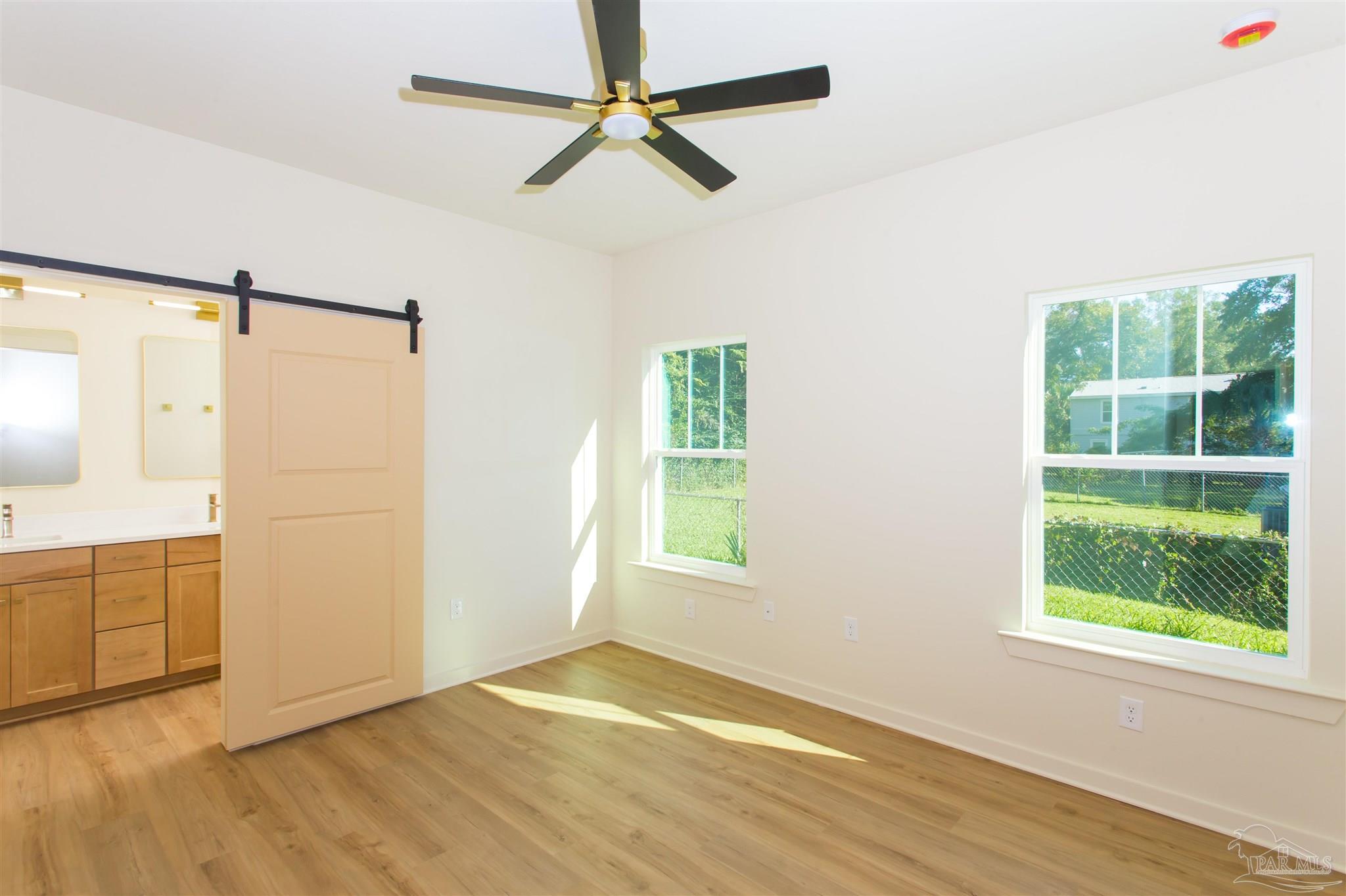 Fantastic new construction in Downtown Pensacola. This fabulous NEW home has been constructed with quality materials, a thoughtful floor plan, and is designed for easy maintenance. Enter through the deep covered front porch to find wide open living areas offering high ceilings, an island kitchen and lots of natural light. The entire home offers Luxury Vinyl plank floors, NO Carpet! The kitchen is decked out with sleek custom cabinets w/soft close hinges, a complete stainless steel appliance package, cool white quartzite tops undermount sink, large island and a spacious pantry. The entire home has high ceilings and all the rooms have large windows. The primary suite offers a walk-in closet and an attached bath with double vanity plus walk-in shower. The Laundry room is conveniently located off the bedrooms with room for additional storage. The home offers a fully sodded yard with an irrigation system and privacy fenced back yard. In addition there is an outdoor storage closet for your lawn tools and beach gear. Upgrades include Delta Faucets, Kwikset locks, keyless entry, and designer LED lighting. This home qualifies for 100% financing with NO PMI and a reduced interest rate! Call for details. Don’t miss this great opportunity to live in an amazing new home in downtown Pensacola. Call today to schedule your private showing!