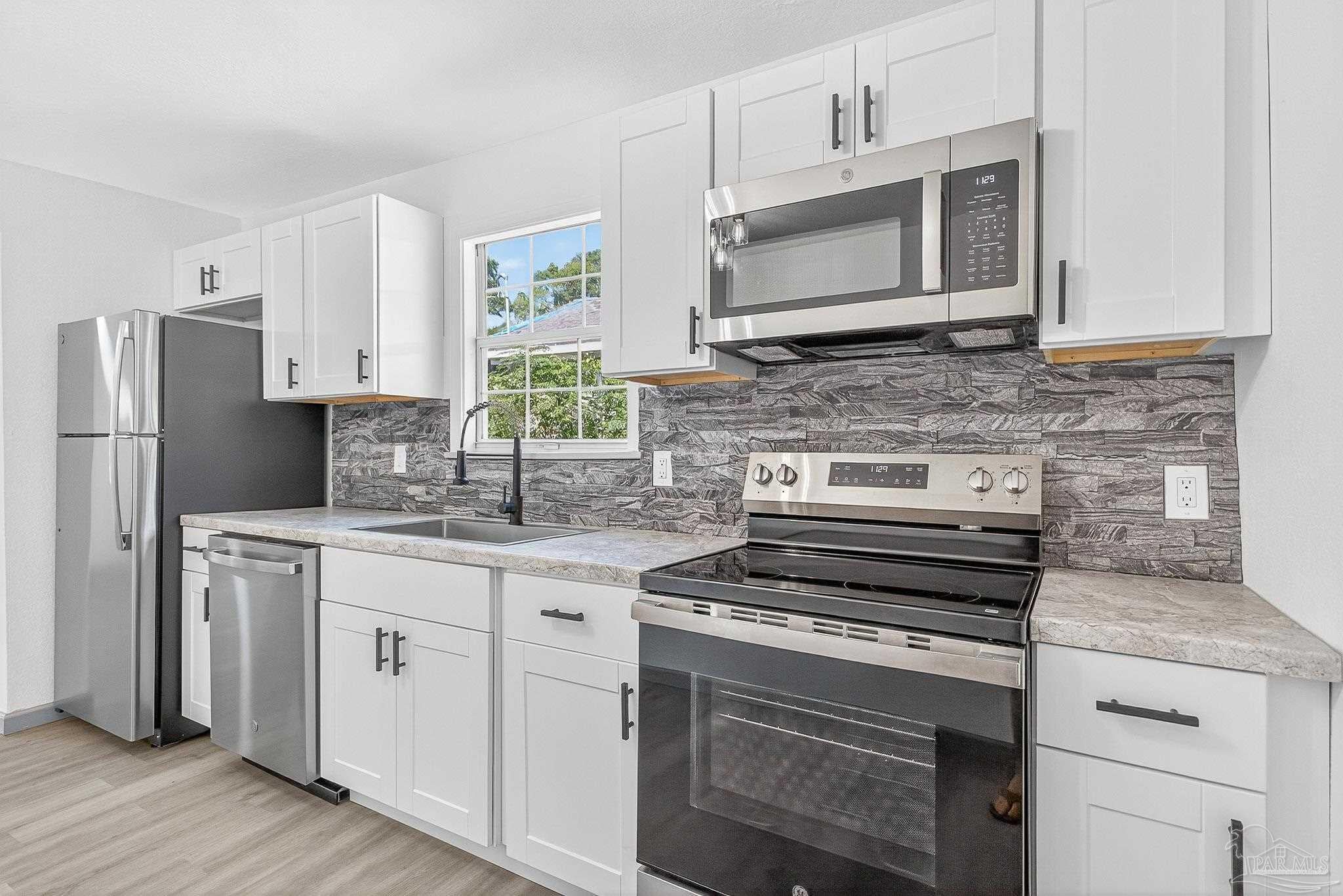 Completely remodeled 2-bedroom, 1.5-bath home located just minutes from Downtown Pensacola and the beach. This move-in-ready property features all-new systems and finishes throughout, including a new roof, HVAC, electrical, plumbing, flooring, kitchen, appliances, lighting, and interior/exterior paint. The modern kitchen offers white shaker cabinets, stainless steel appliances, and a designer backsplash. The bathroom has been fully updated with a new vanity, fixtures, and tub/shower surround. Enjoy the clean, modern aesthetic with luxury vinyl plank flooring and neutral colors throughout. Conveniently located near local restaurants, shopping, entertainment, Blue Wahoos Stadium, and Pensacola’s beautiful waterfront. Perfect for first-time homebuyers or investors looking for a turnkey property in a prime location.