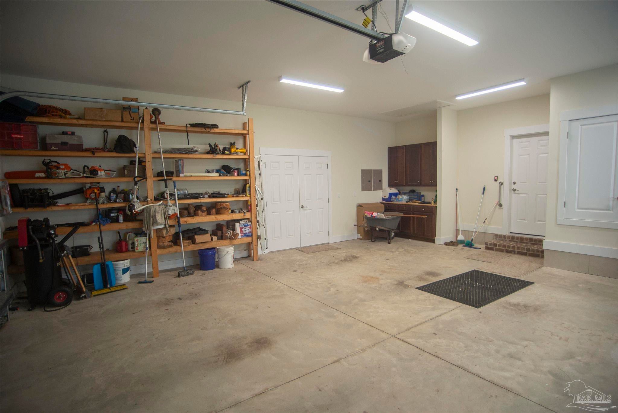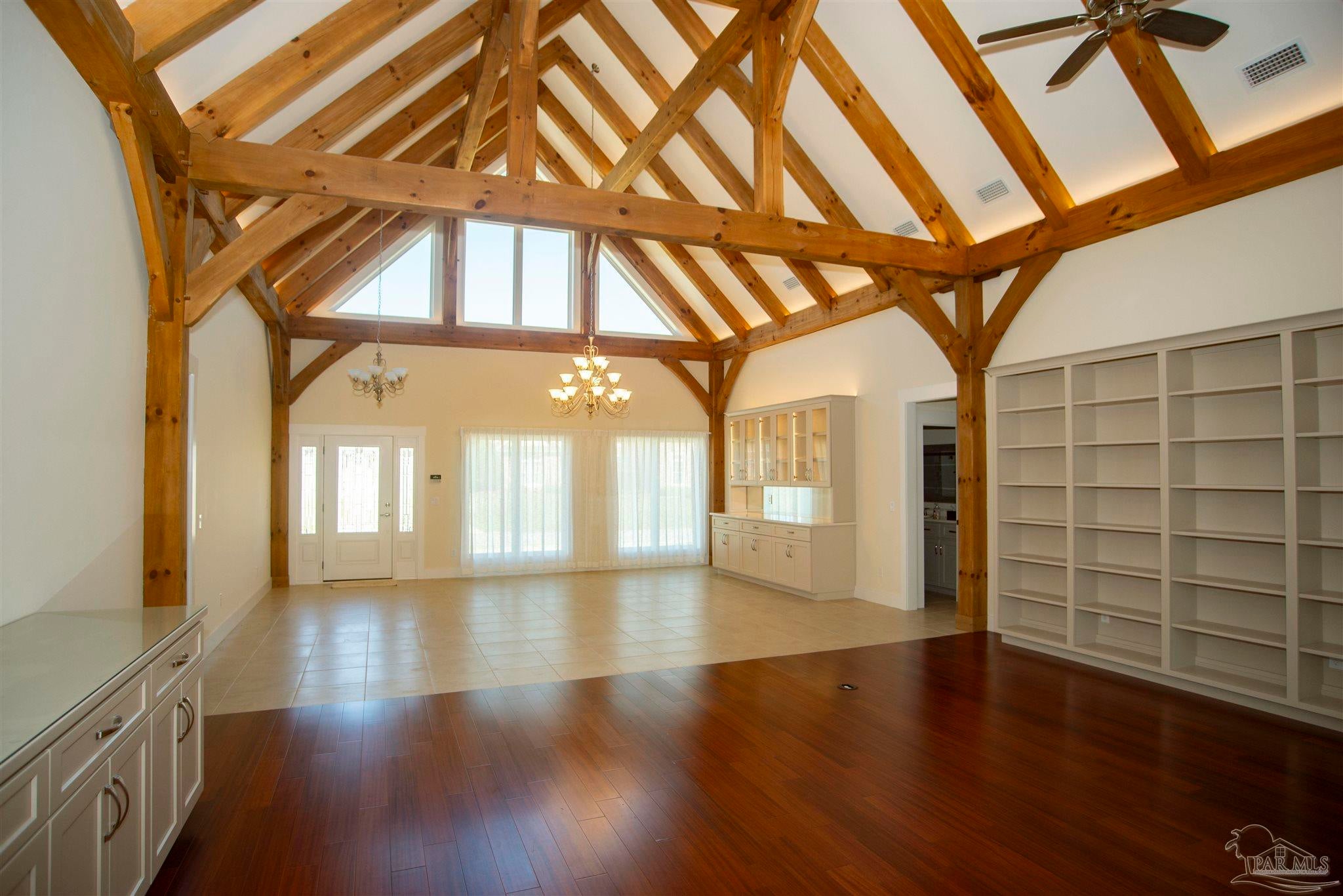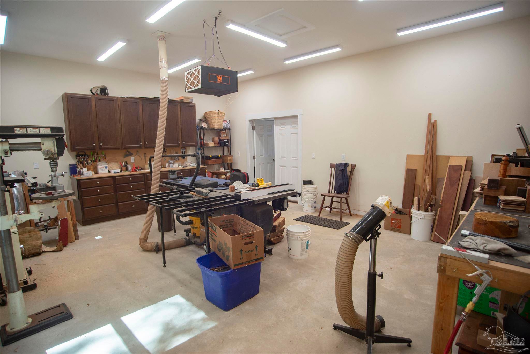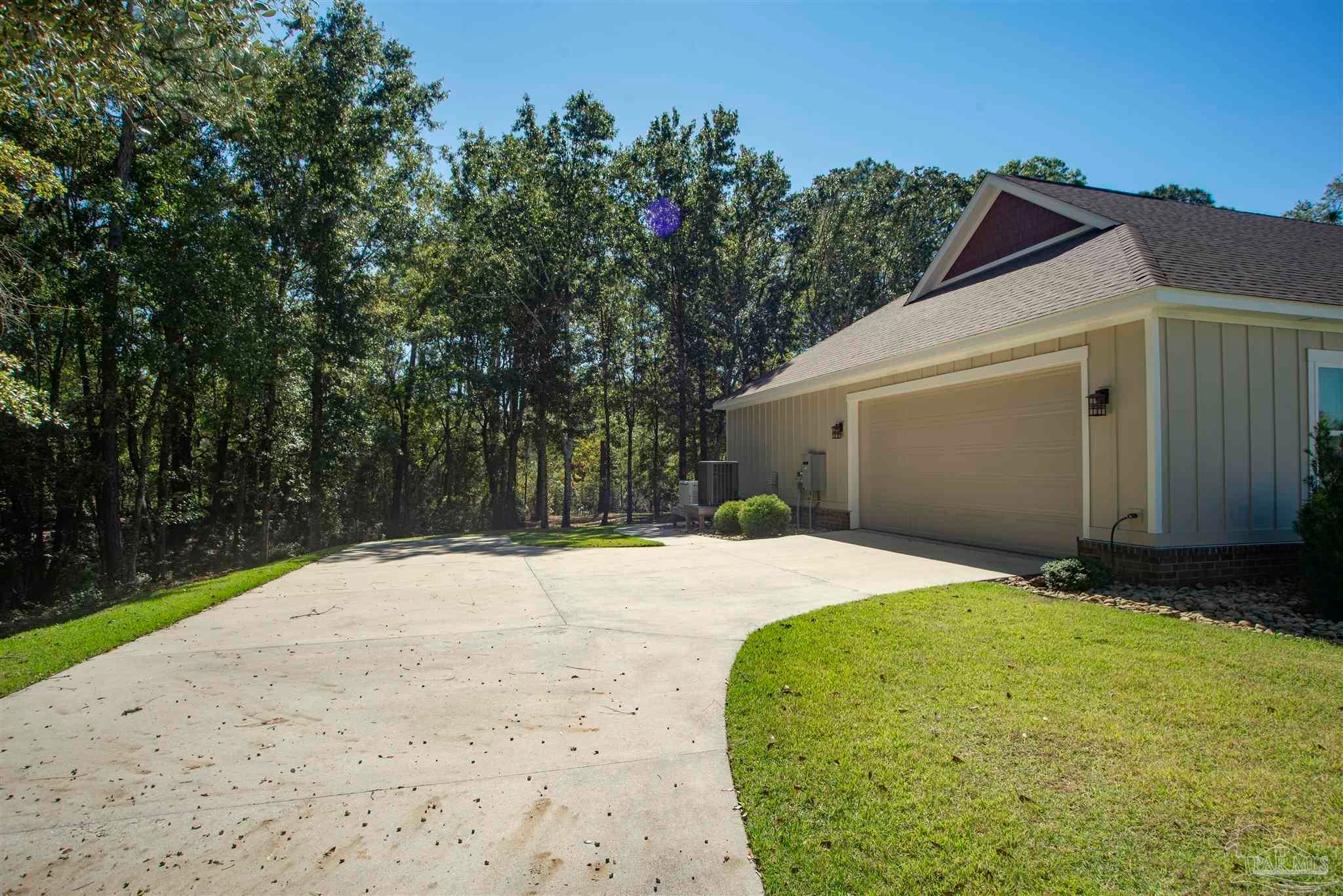 Fabulous custom build on a double lot in the Moors. The 3376 square foot house was built with 2x6 construction with foam insulation through out. The 21 foot tall great room features Timber frame hybrid construction (no nails or screws) as well as the dining room. Over 300 lineal feet of lighting in the great room, custom Alder cabinetry through out the house. Lighted buffet. The kitchen features 2 pantries, double ovens, separate ice maker, gas cook top and quartz counter tops. Under counter lighting in the baths with quartz counters. 2 tankless water heaters, 2 HVAC systems with remote control thermostats. High impact doors and windows and whole house generator. Security system. Incredible separate 396 sf wood working shop is heated and cooled, has all equipment, has a dust collector in the attic and the compressor is located in the garage to eliminate noise. Sprinkler with well and pump, storage barn. This property has a creek at the back of the lot and it is possible to kayak to Mulat Bayou and on to Escambia Bay if you wish. This is a must see dream home.