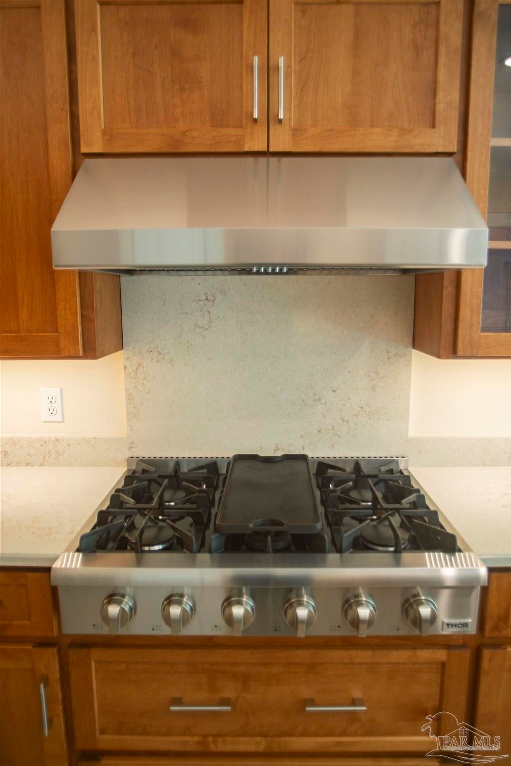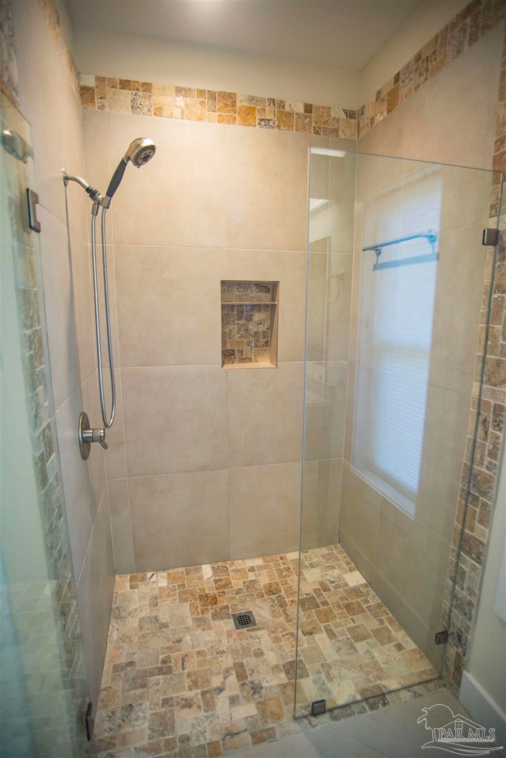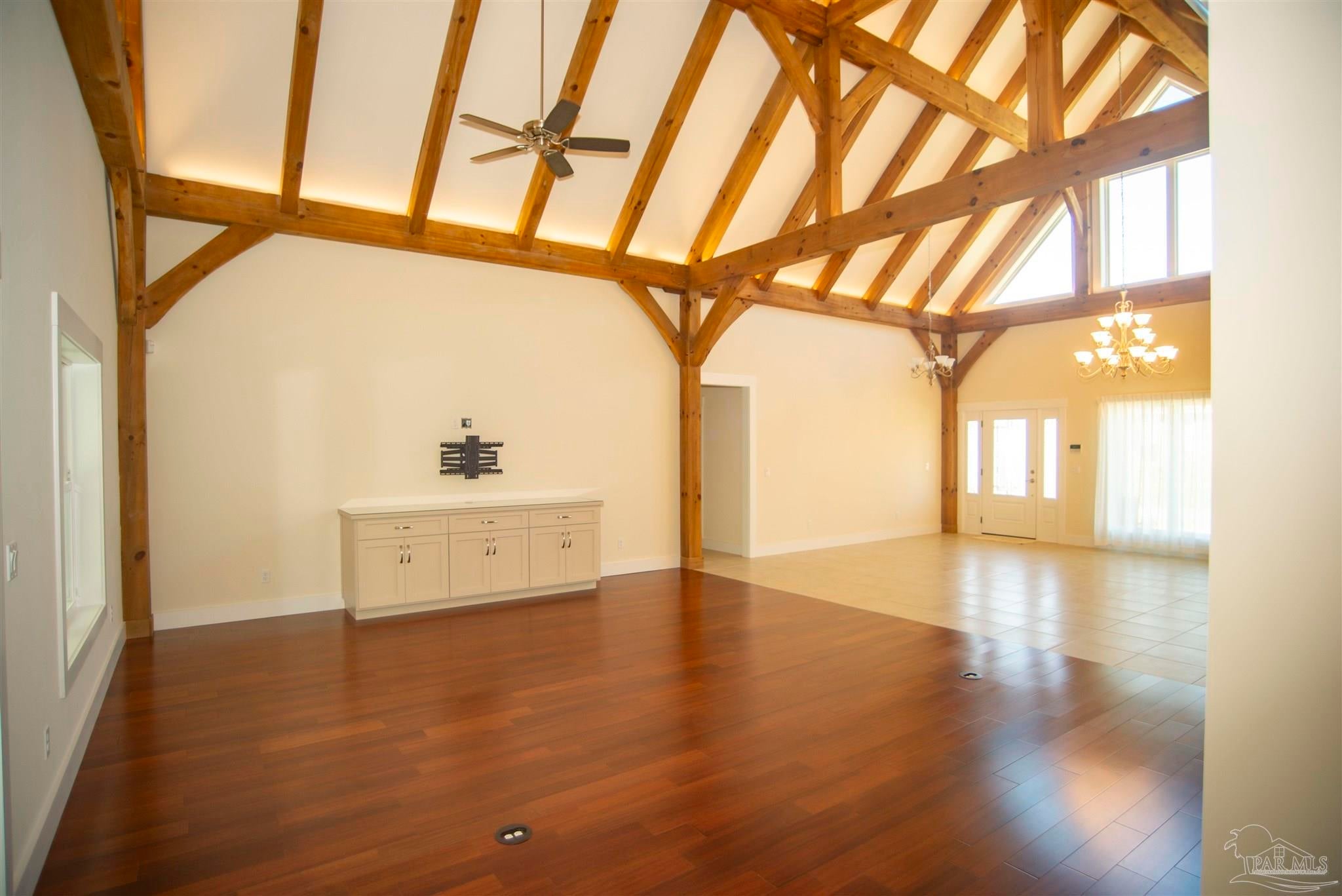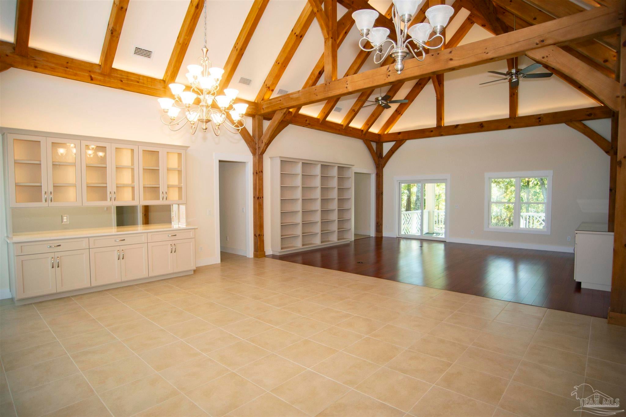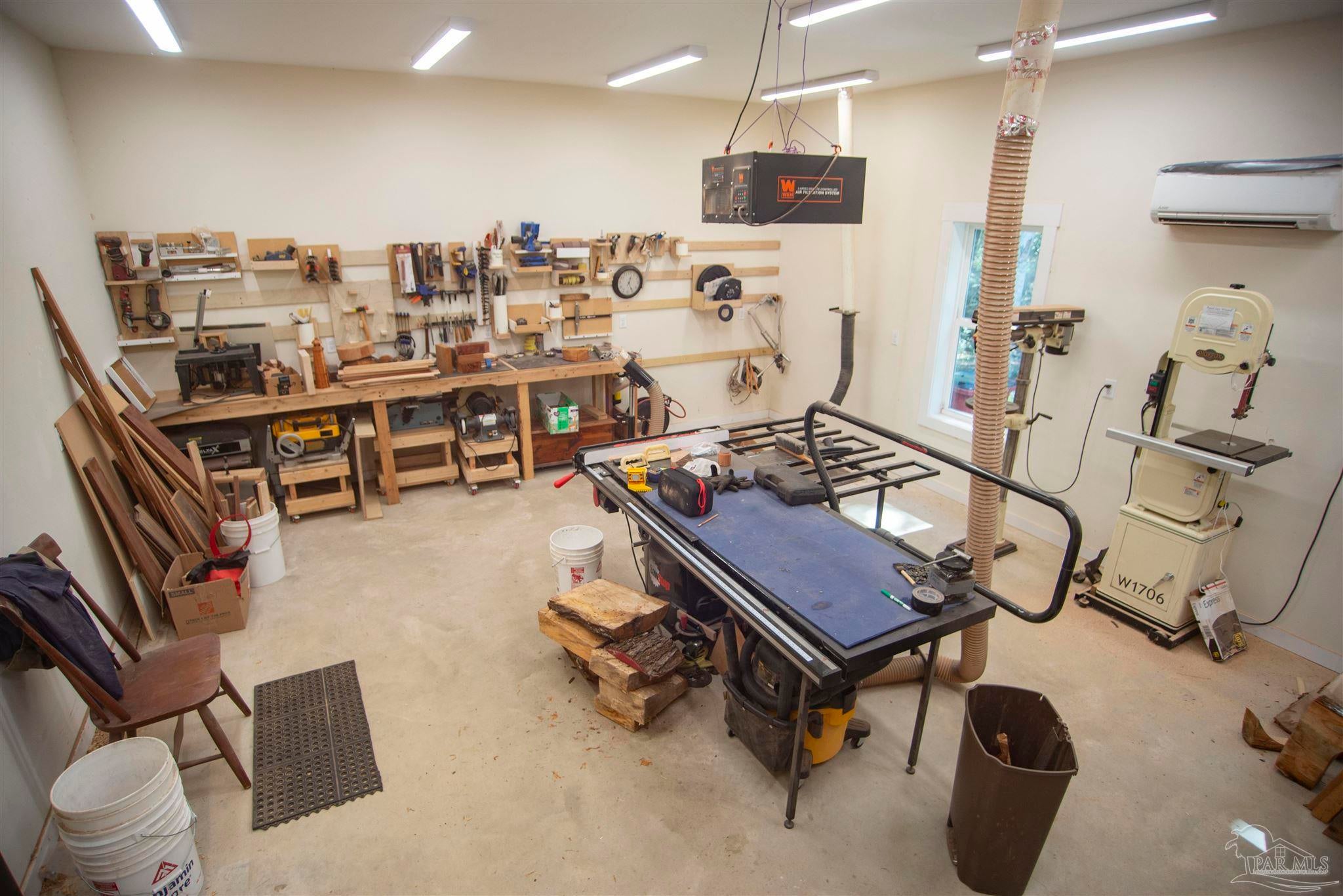 Fabulous custom build on a double lot in the Moors. The 3376 square foot house was built with 2x6 construction with foam insulation through out. The 21 foot tall great room features Timber frame hybrid construction (no nails or screws) as well as the dining room. Over 300 lineal feet of lighting in the great room, custom Alder cabinetry through out the house. Lighted buffet. The kitchen features 2 pantries, double ovens, separate ice maker, gas cook top and quartz counter tops. Under counter lighting in the baths with quartz counters. 2 tankless water heaters, 2 HVAC systems with remote control thermostats. High impact doors and windows and whole house generator. Security system. Incredible separate 396 sf wood working shop is heated and cooled, has all equipment, has a dust collector in the attic and the compressor is located in the garage to eliminate noise. Sprinkler with well and pump, storage barn. This property has a creek at the back of the lot and it is possible to kayak to Mulat Bayou and on to Escambia Bay if you wish. This is a must see dream home.
