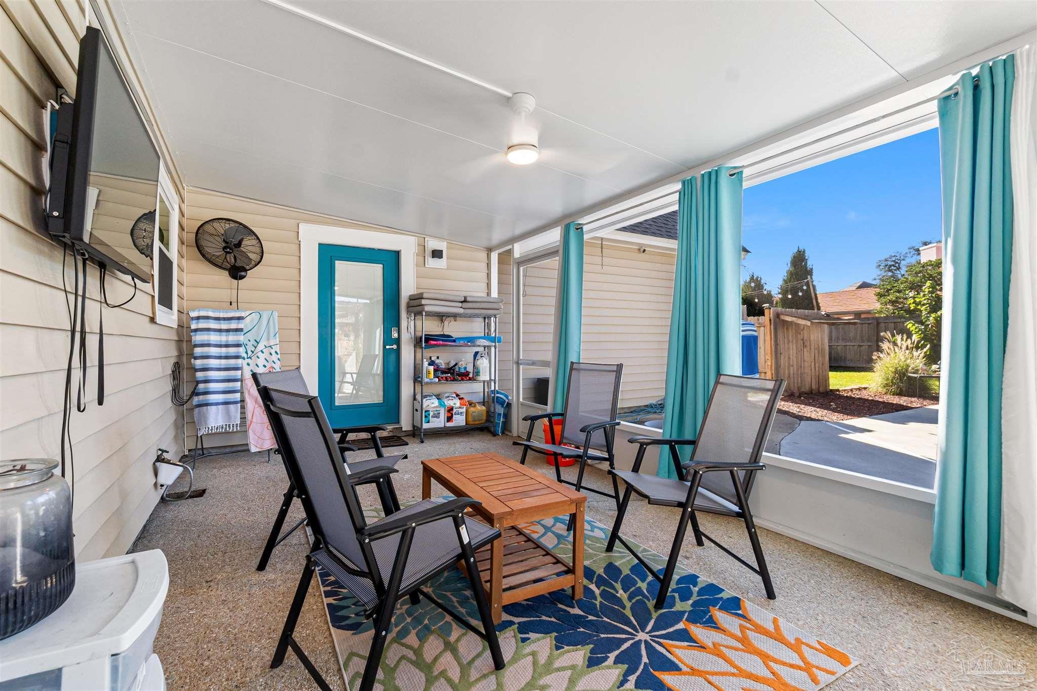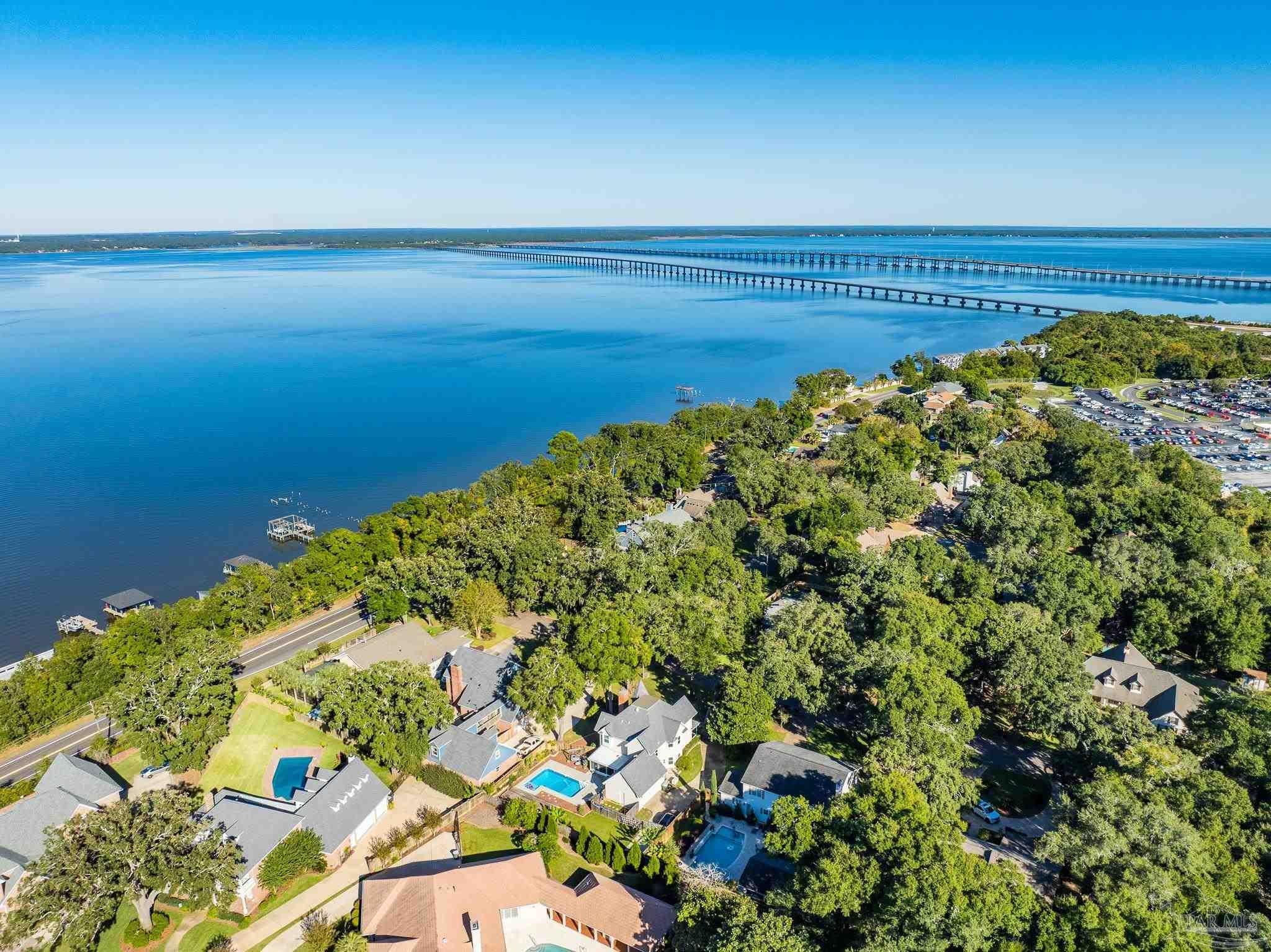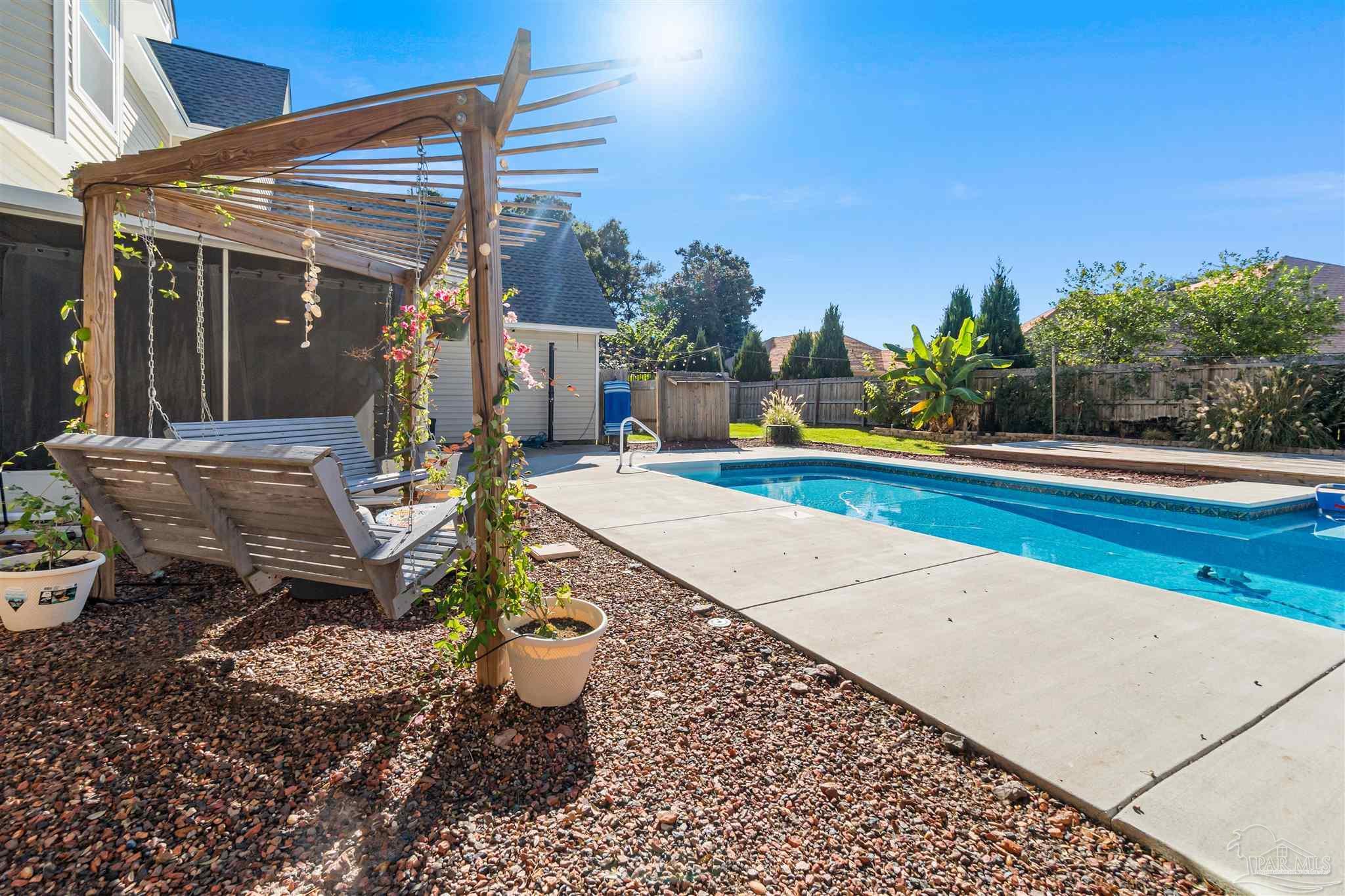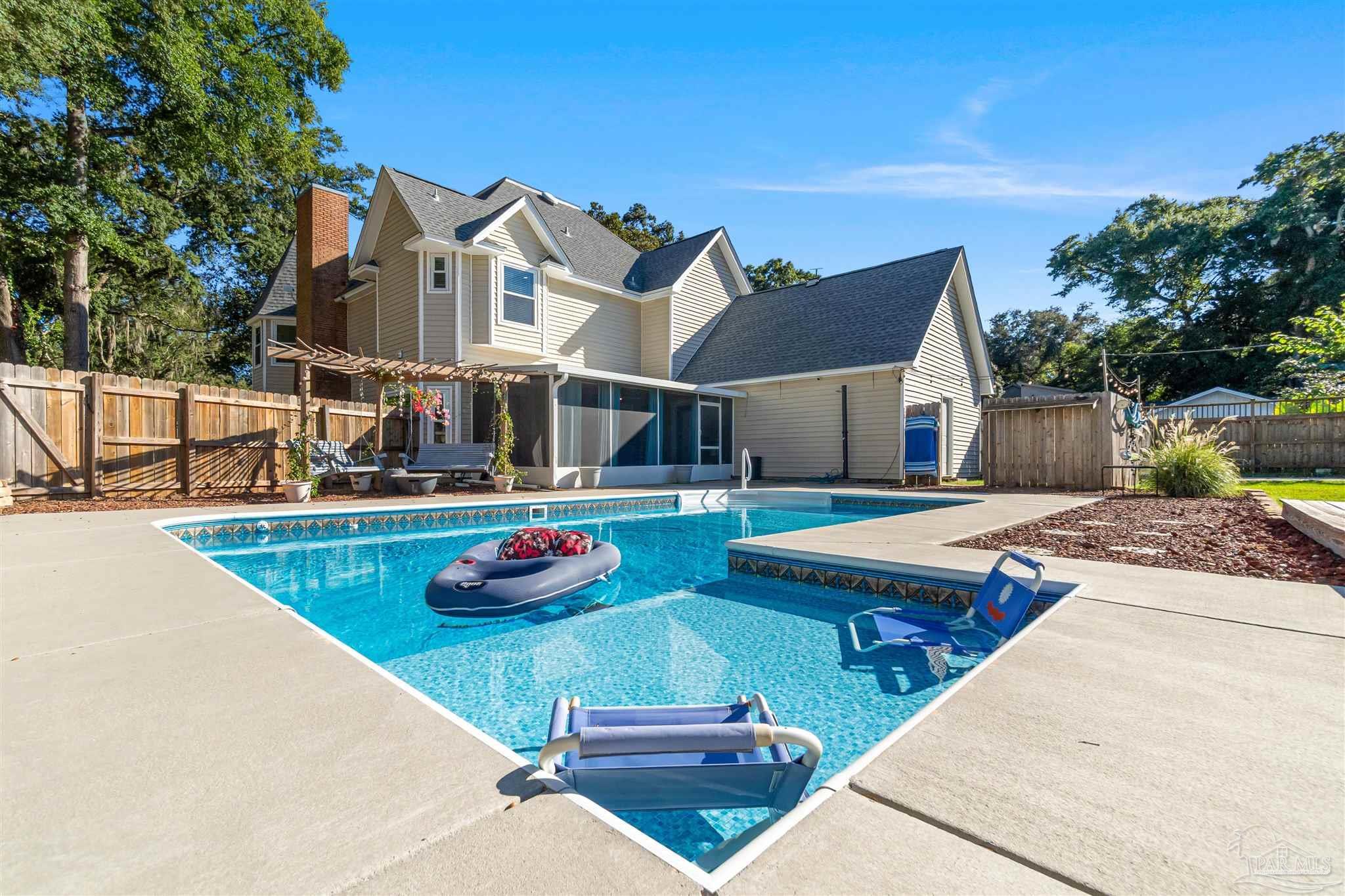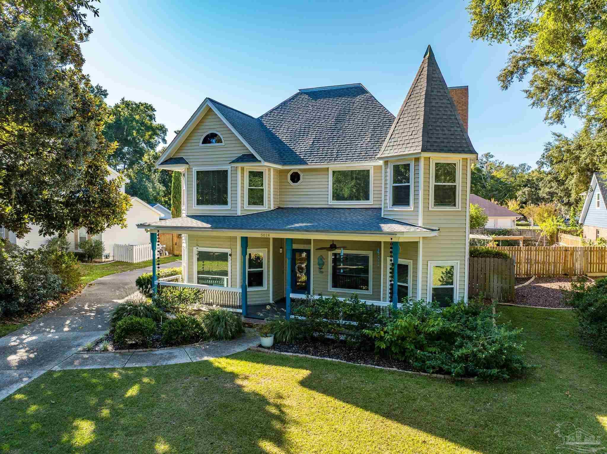 Step into timeless elegance with this whimsical Victorian-style home brimming with character and warmth. Asymmetrical rooms and cozy nooks create a storybook charm, complete with turret sitting areas that add a romantic touch to everyday living. Located in the sought after Barranca Lora subdivision. Moss draped oaks form a picturesque canopy over quiet streets which adds beauty to this one of a kind residence. The refurbished front porch with custom metal railing sets a welcoming tone, leading into a foyer anchored by a beautiful wooden staircase ascending to 4 spacious bedrooms and 2 full baths. The Master suite offers dual walk-in closets and a reading nook tucked into the turret, an ideal retreat for morning coffee or quiet evenings. The Great Room features an electric fireplace with a decorative mantel and a sunlit window nook, adding charm and natural light. The Kitchen/Dining area completely renovated in 2024, boast LG Smart appliances, granite countertops, and a tile backsplash-perfect for gatherings. Sunroom off the kitchen overlooks the fenced backyard and sparkling saltwater pool, creating the ultimate setting for relaxation and family fun. The Sellers installed the pool as well as impact windows & doors and replaced the roof during their tenure. Additional highlights include an extra large laundry room (washer & dryer convey) storm shelter in the two car garage, tankless hot water heater, sprinkler system, Generac gas generator and hurricane rated window and doors for peace of mind. Located near UWF, Pensacola State College, Interstate access this home blends classic architecture with modern comfort. Truly a Southern Gem. Call today for your showing!!!