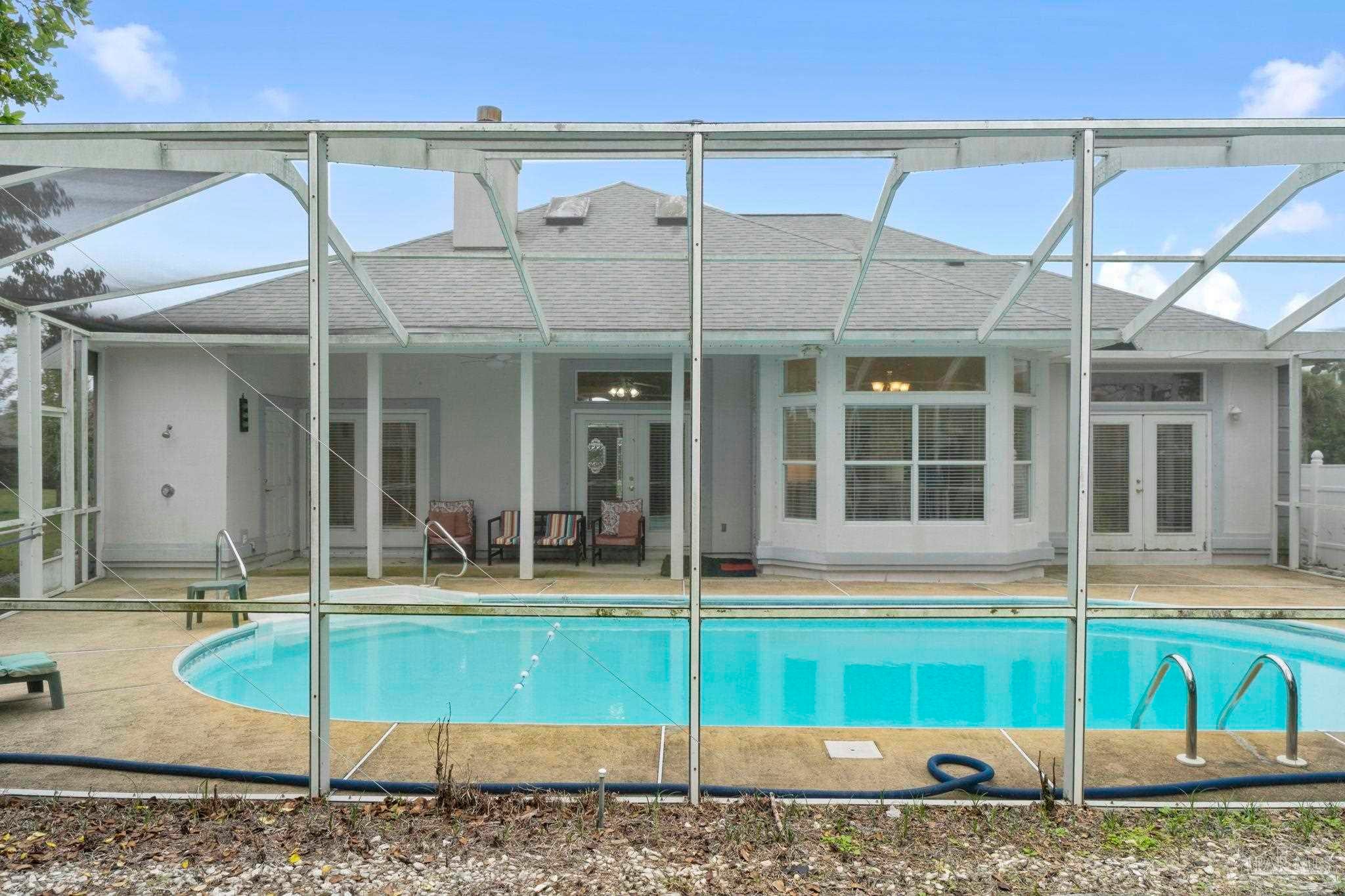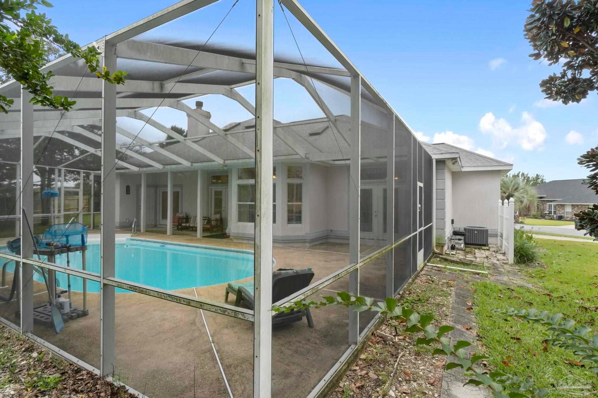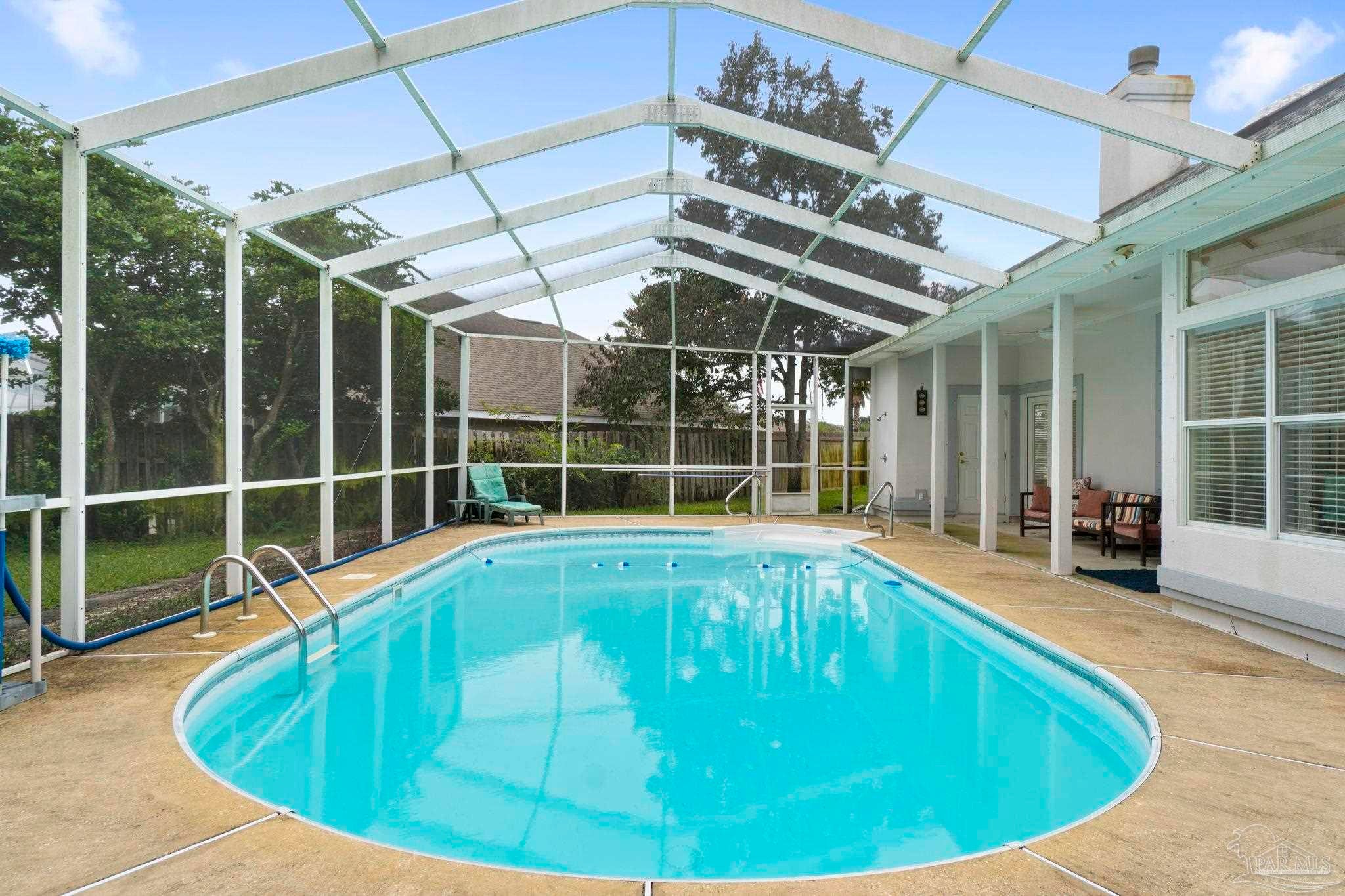 PROFESSIONAL PHOTOS TO BE UPLOADED 10/29/25. This beautifully maintained South Florida–style home in Chevalier, built in 1997, offers 2,045 square feet of inviting living space. With 3 bedrooms and 2 baths, and a large office area, this home combines comfort, functionality, and timeless design. Inside, vaulted ceilings in the kitchen and great room create an open, airy feel, while skylights and lighted plant ledges bring warmth and character. Flooring includes a mix of tile and carpet, and the great room is centered by a cozy gas fireplace. The kitchen features a gas cooktop, complemented by a gas water heater for efficiency. An indoor laundry room adds everyday convenience. The primary suite serves as a private retreat, while the additional bedrooms provide ample space for family or guests. A side-entry garage, complete with built-in cabinets, ensures privacy and extra storage. Situated on a desirable high corner lot with established landscaping, this property includes a new roof, HVAC system, pool enclosure, and brand new windows. Outdoors, enjoy your private inground swimming pool, enhanced by a screened enclosure. Located just minutes from Johnson Beach and military bases, this home offers the perfect blend of relaxation, convenience, and coastal living. A must-see property that is move-in ready and designed for both everyday comfort and entertaining.
