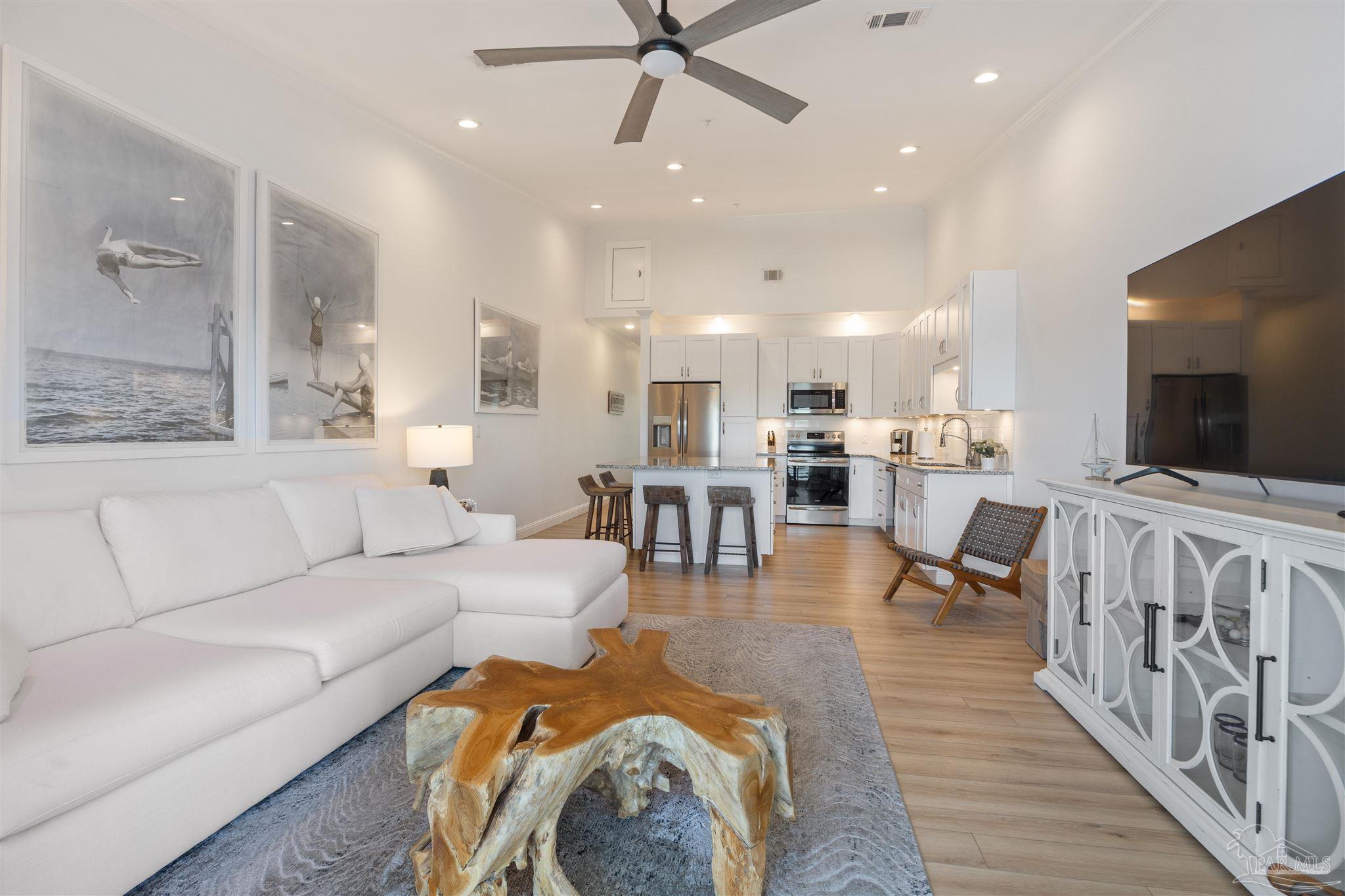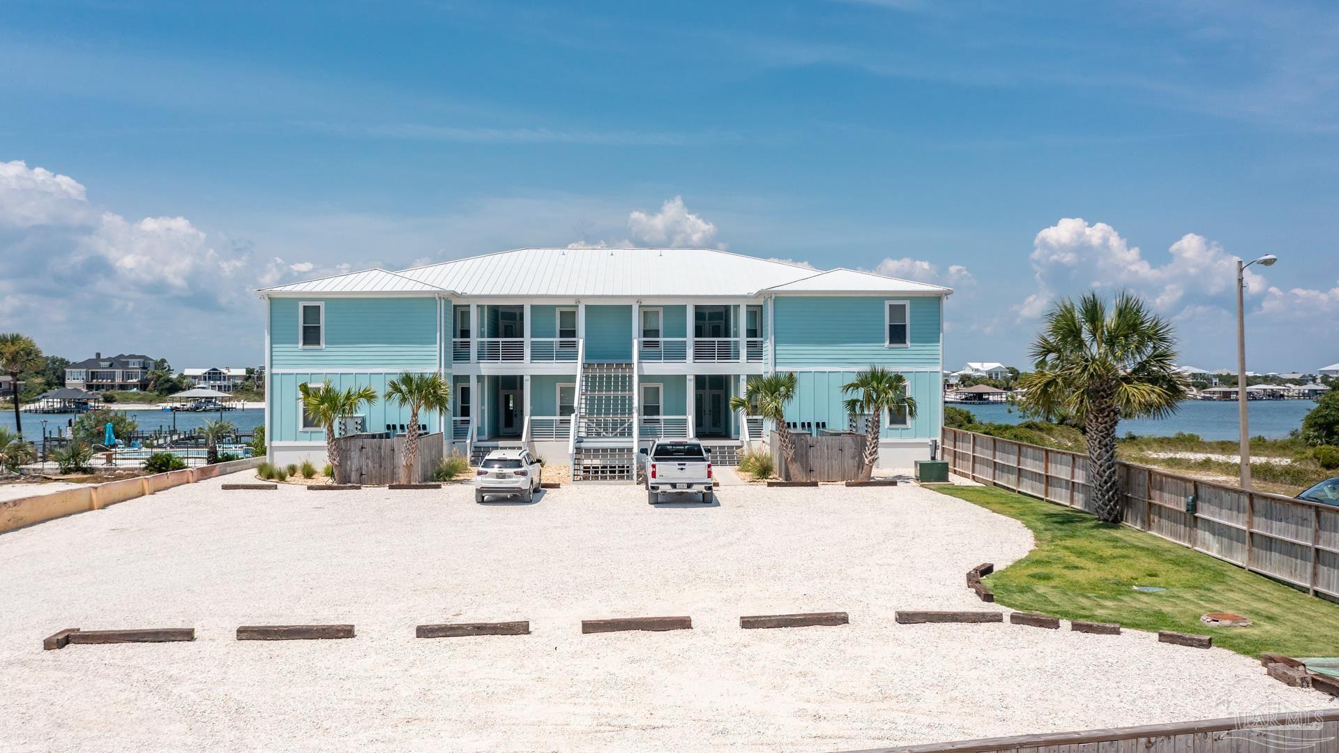 A Boater's Dream! Don't miss the opportunity to view this spacious 1-bedroom, 2-bath condo, built in 2022 and offering coastal living at its finest. Located directly on Old River, you’ll enjoy breathtaking waterfront views and some of the most stunning sunsets on the Gulf Coast. Filled with natural light from the double doors leading to a covered balcony, this condo features an open living and dining layout with a large island, ample cabinetry, and generous counter space — perfect for entertaining or relaxing. The flooring throughout is a natural wood-look plank tile, offering both beauty and low maintenance. The primary bedroom comfortably fits a king-size bed, matching nightstands, and a chest of drawers. The primary bathroom boasts dual sinks and a walk-in shower with classic subway tile. A second full bath offers convenience for guests, featuring a single vanity, toilet, and another walk-in shower. Bonus: This home has never been rented but is zoned for short-term rentals — ideal if you’re considering an investment opportunity! Even better, the condo comes with an assigned deep-water boat slip (B-2) equipped with a brand-new 10,000 lb boat lift. Located just minutes from the Flora-Bama and The Yacht Club Restaurant, this is a turnkey, fully furnished unit — just bring your suitcase! This is one you don’t want to miss — schedule your showing today!