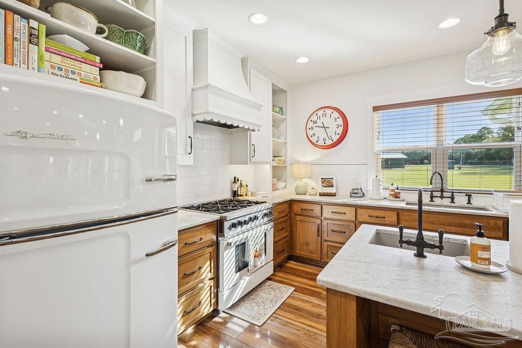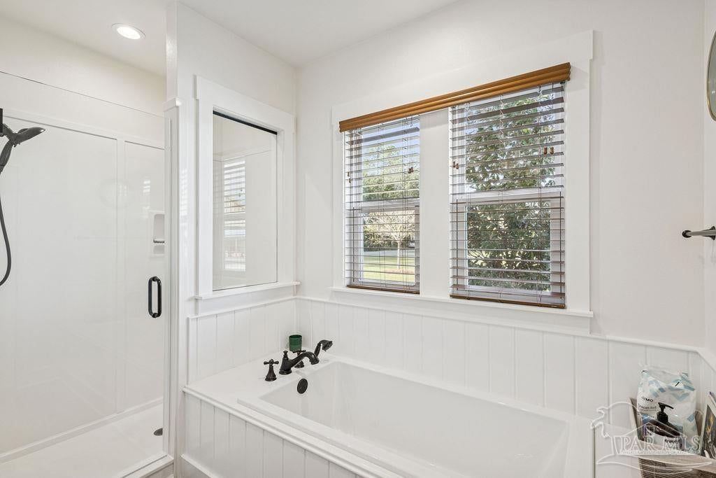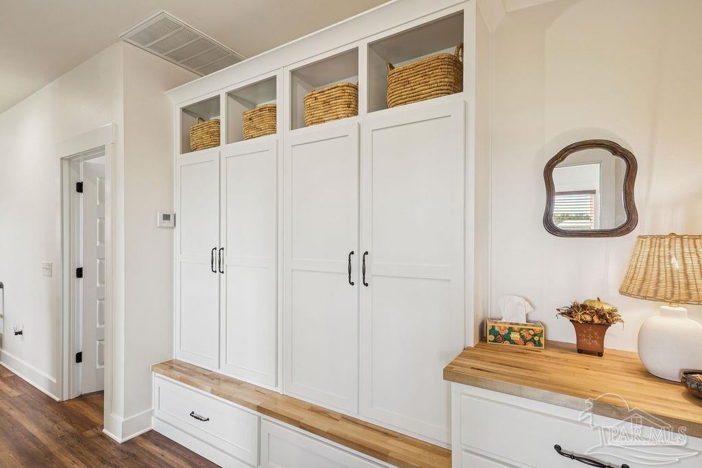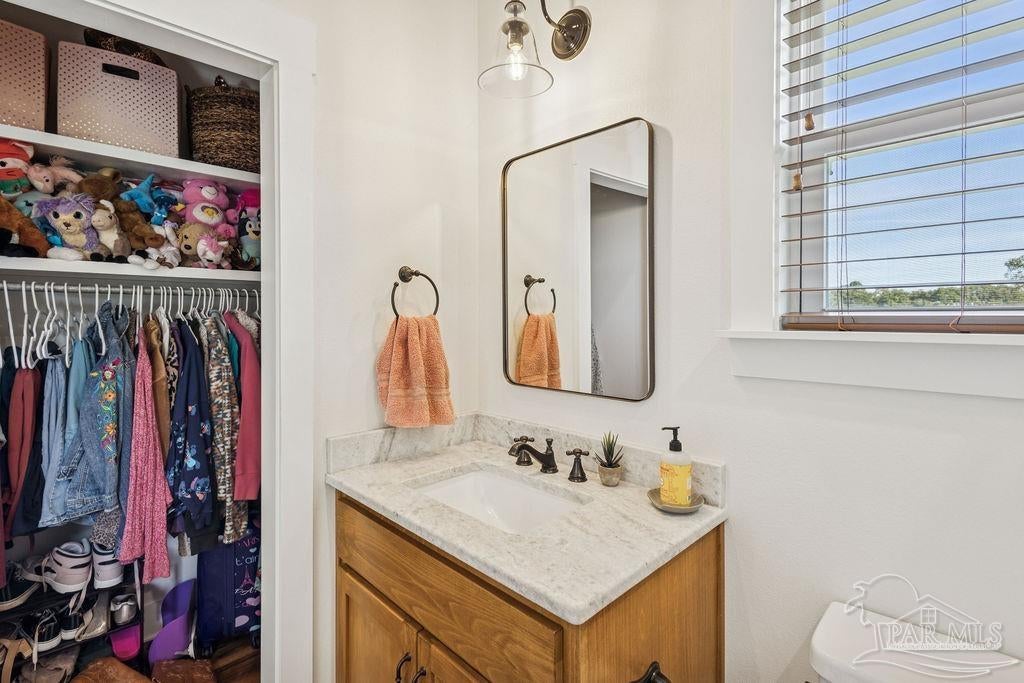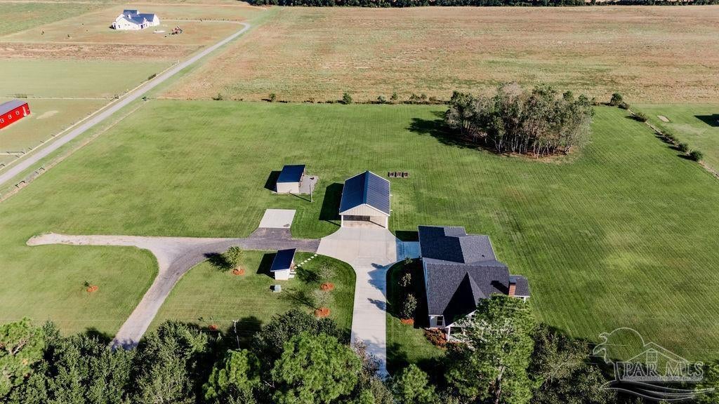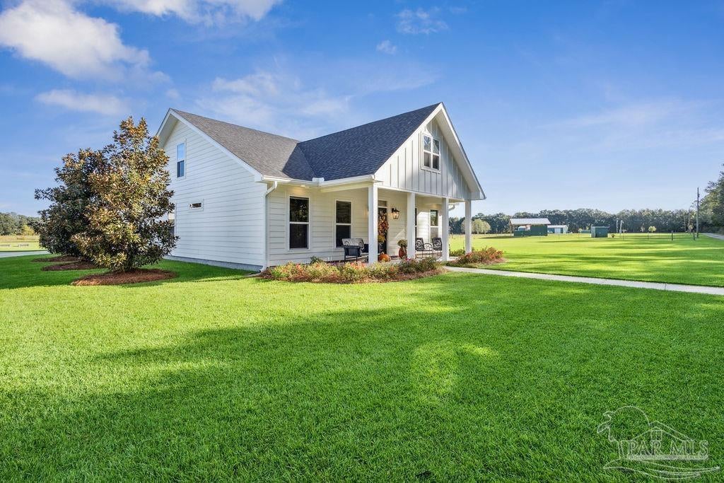 Beautifully designed home on 5 scenic acres surrounded by high-end estates. Ideally located just 5 minutes to Five Points and 20 minutes to Pensacola, this property features 2,263 sq ft of well-planned living space, a 30x50 insulated red-iron workshop, and quality finishes throughout. Interior highlights include LVP flooring, a wood-burning fireplace, and soft-close cabinetry paired with leathered Dolomite countertops and Big Chill appliances, including a gas range. The kitchen offers a tile backsplash, built-in pantry shelving with a charming screen door, and a separate mudroom entry with beautiful built-ins. The primary suite includes a walk-in closet with built-ins, a drop-in tub, and a marble walk-in shower. Additional bedrooms feature a 1 bedroom w a private en-suite and 2 additional bedrooms sharing a hallway bath with dual sinks and hallway linen storage. Additional features include: • Whole-home air purifier integrated into HVAC • Spray-foam insulation • Two 50-gallon electric water heaters • Screened back porch with dual exterior doors & transoms • Spacious laundry room with Charles Phillips barn doors • Well with pH neutralizer and filtration system Exterior amenities include a 30x50 engineered red-iron shop (25x30 enclosed + 25x30 carport) with concrete flooring, RV hookup (50 amp), generator switch, concrete drive, gutters, irrigation, wet-weather pond, and fencing. 3500 Red Ryder Lane offers the perfect balance of luxury, privacy, and convenience in a highly desirable Northwest Florida setting.