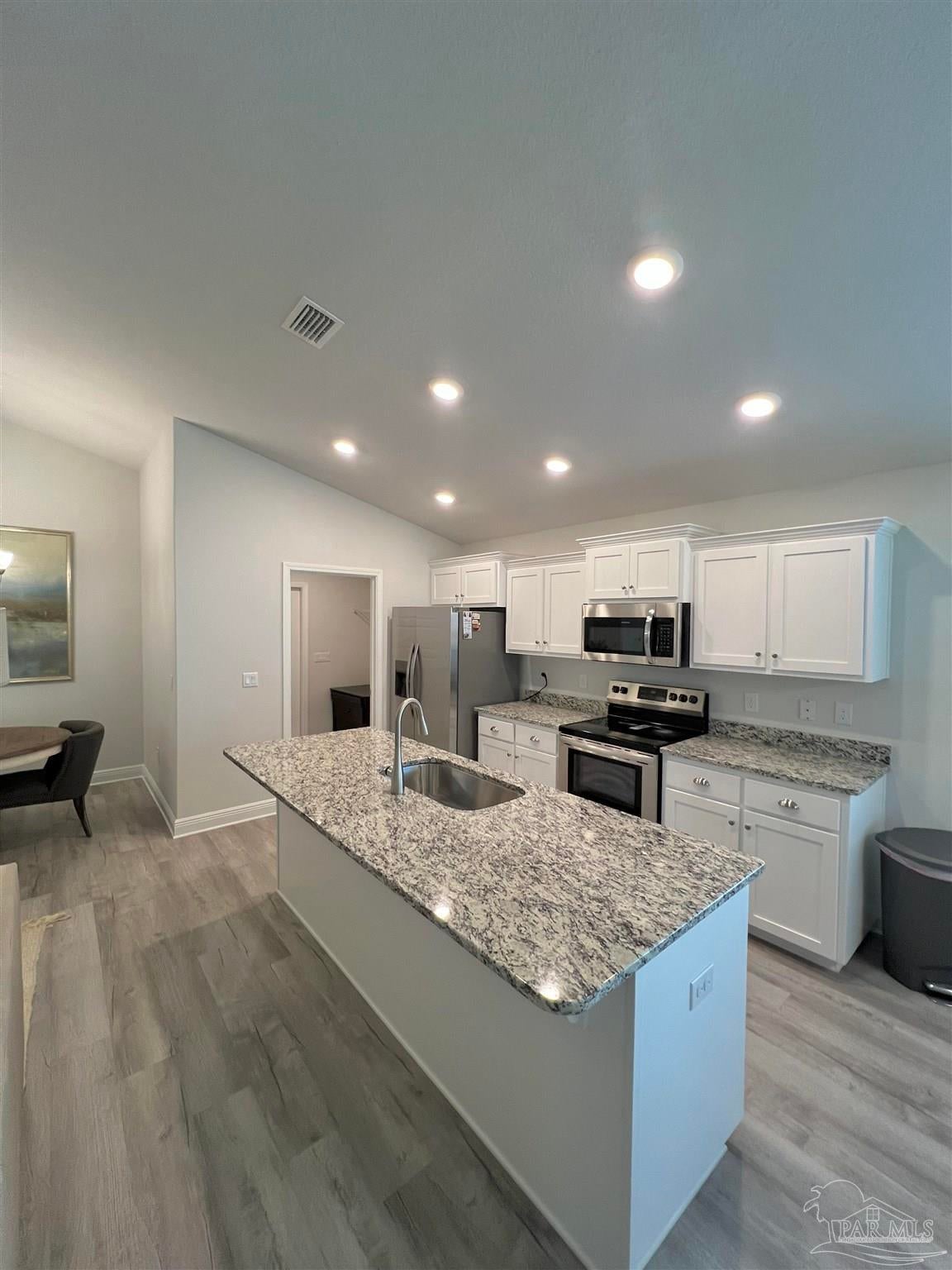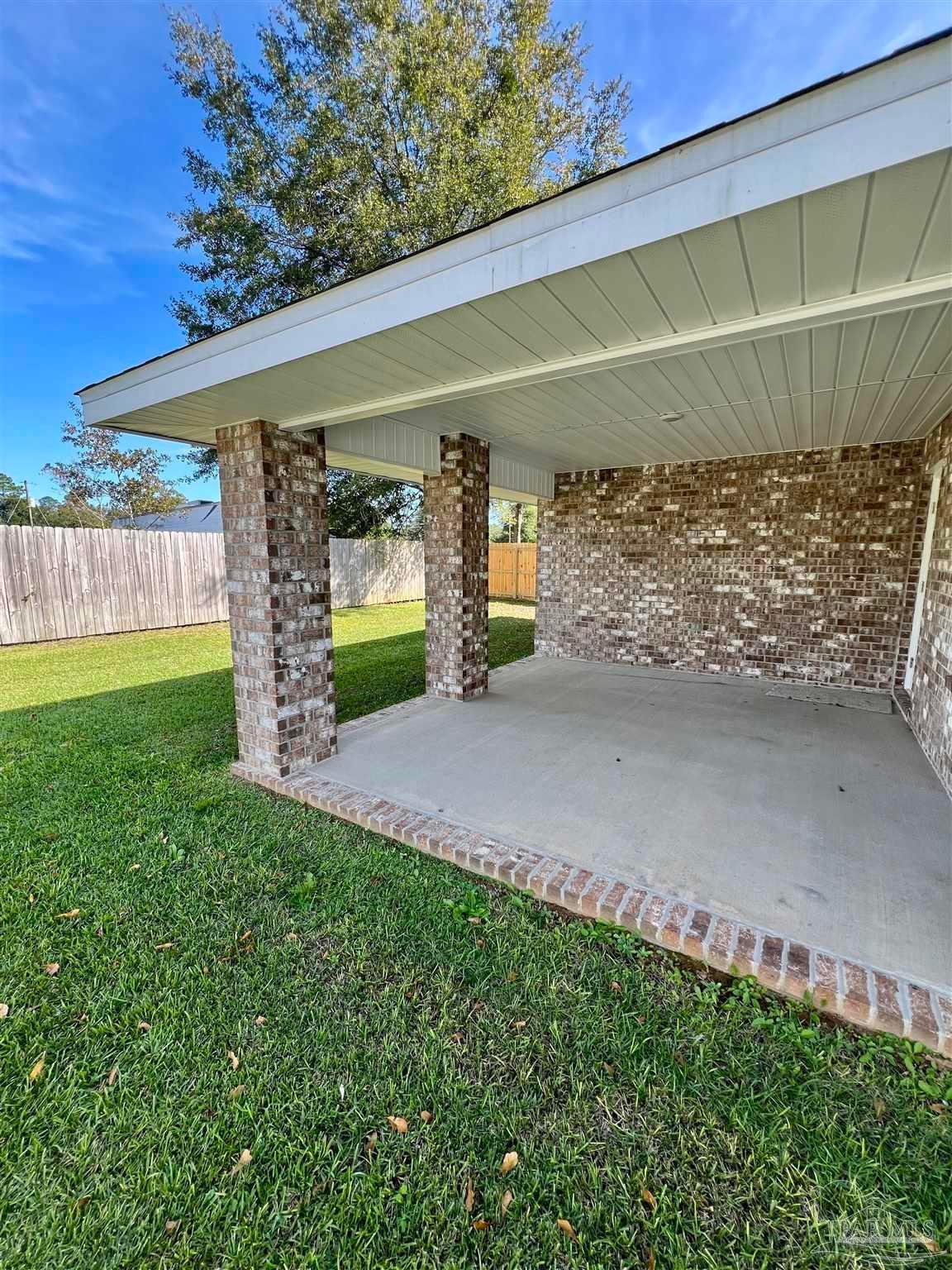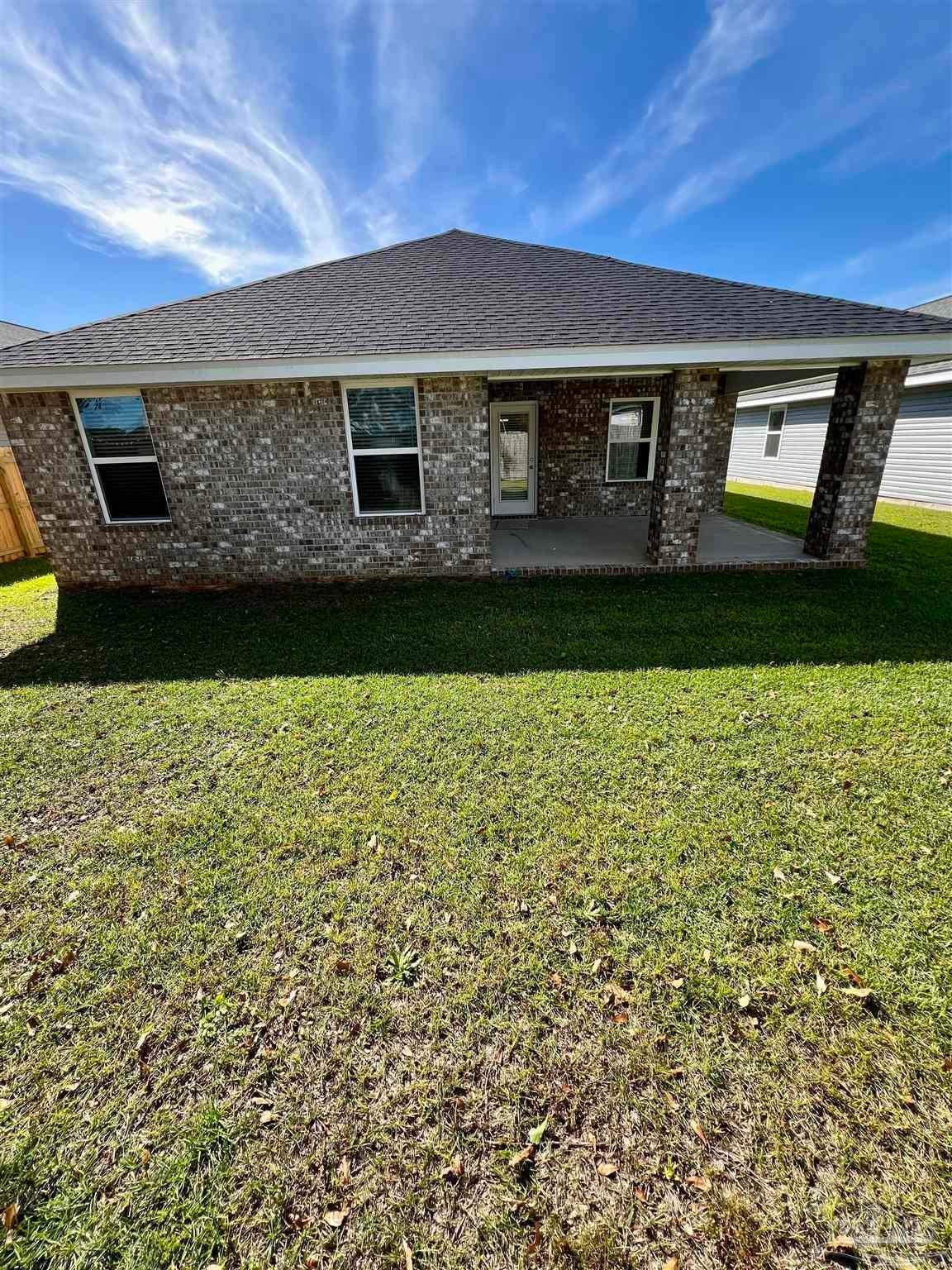 ***MOVE IN READY!!!*** CONVENIENTLY LOCATED TO NAVY FEDERAL, UWF AND ALL THE SHOPPING NEEDED FOR YOUR EVERYDAY NEEDS. THIS 4 SIDES BRICK 1425 PLAN IS A 3 BEDROOM 2 BATH THAT IS SURE TO IMPRESS YOU FROM THE TIME YOU ENTER INTO THE HOME THROUGH THE FOYER. THE ENTIRE HOME HAS LUXURY VINYL PLANK FLOORING THROUGHOUT WITH CARPET IN THE BEDROOMS ONLY. AS YOU LEAVE THE FOYER, YOU ARE GREETED BY THE MASSIVE OPEN FLOOR PLAN. THE GIANT FAMILY ROOM HAS A CEILING FAN. THERE IS A SINGLE FRENCH DOOR THAT OPENS ONTO A 15 X 13 COVERED PATIO THAT IS PERFECT FOR A MORNING CUP OF COFFEE OR ENTERTAINING ON THE WEEKEND. THE KITCHEN IS OPEN TO THE FAMILY ROOM AND CONTAINS STAINLESS STEEL APPLIANCES, WHITE SOLID WOOD SHAKER STYLE CABINETS AND A COUNTER HEIGHT BAR WITH GRANITE COUNTER TOPS. OFF OF THE KITCHEN, THERE IS A LAUNDRY ROOM THAT LEADS TO A FINISHED 2 CAR GARAGE THAT HAS A GARAGE DOOR OPENER. THE MASTER BEDROOM IS OFF OF THE FAMILY ROOM AND HAS A CEILING FAN AND BOXED CEILING. THE MASTER BEDROOM OPENS UP TO THE MASTER BATH THAT HAS A DOUBLE VANITY, WALK-IN CLOSET AND SHOWER/ TUB COMBO. THE ADDITIONAL BEDROOMS ARE IN A SEPARATE HALLWAY AND HAVE AMPLE CLOSET SPACE. BOTH SPARE BEDROOMS SHARE A BATH THAT CONTAINS A SINGLE VANITY AND SHOWER/ TUB COMBO. HOME ALSO HAS A 4 ZONE SPRINKLER SYSTEM ALREADY INSTALLED!