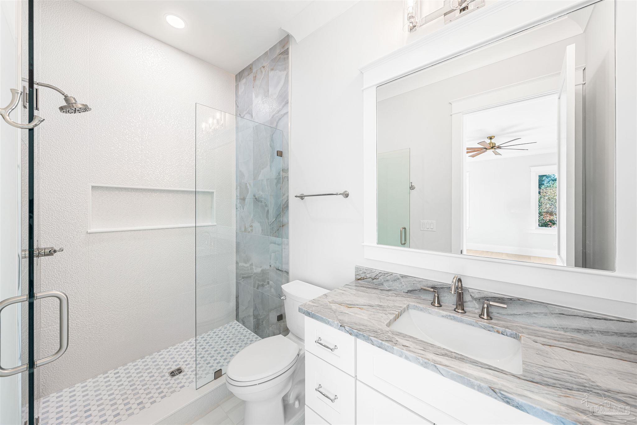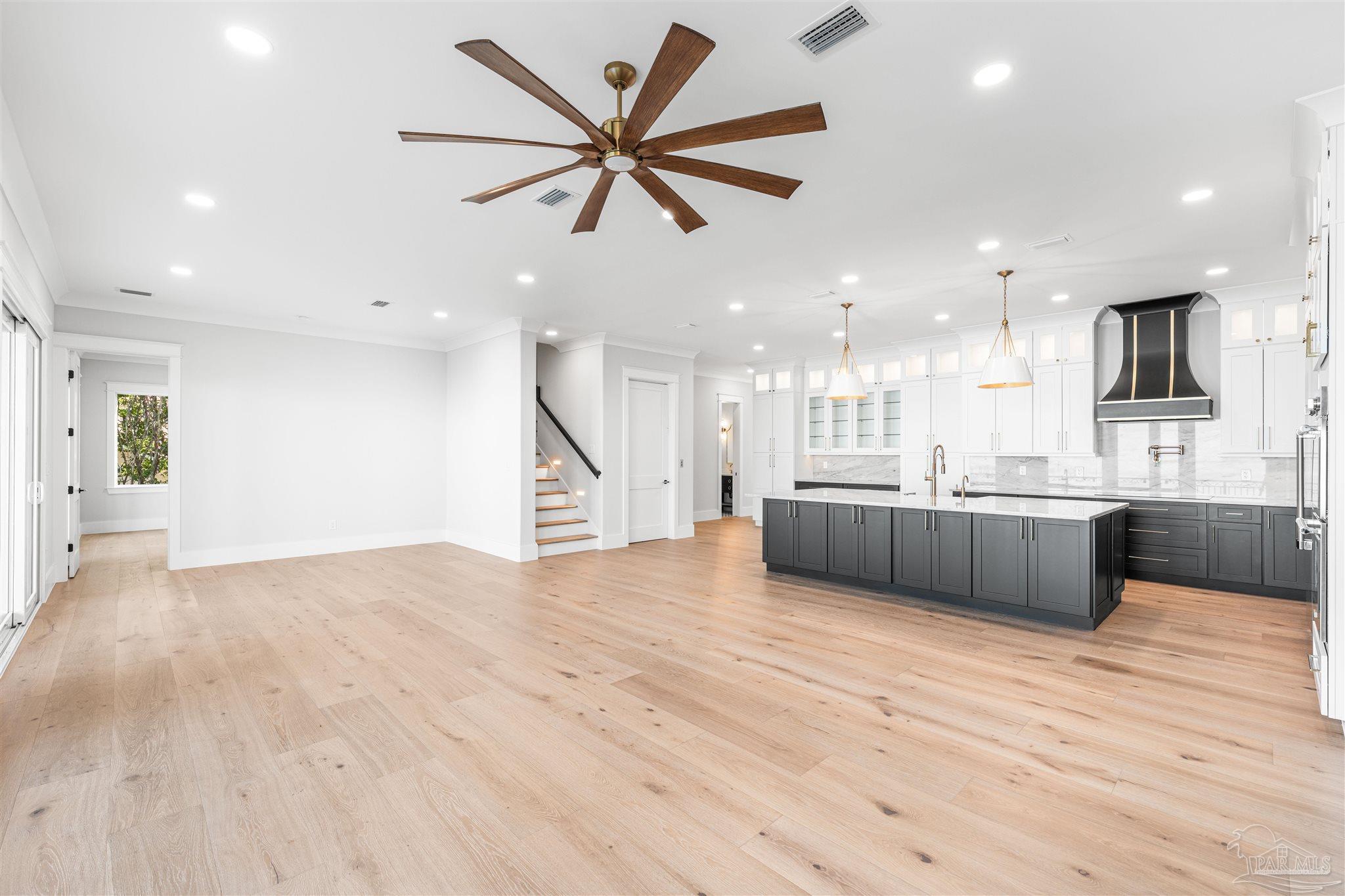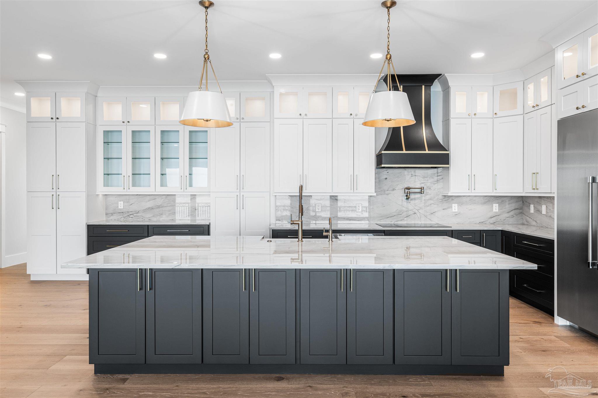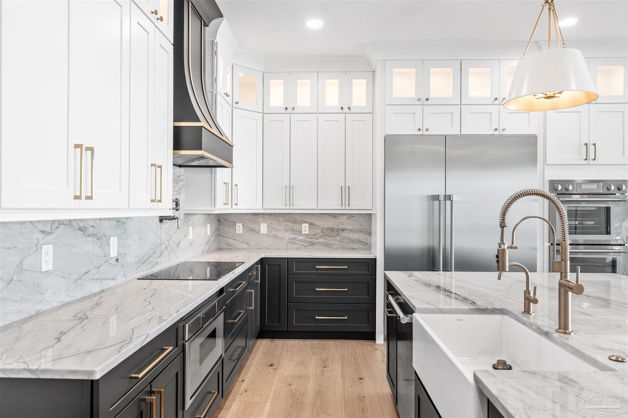 This is a must see newly built luxury home with all the bells and whistles. The home is built on a slab no flood zone with 3 full kitchens - 5 Bedrooms & 5 Full Baths & 1 Half (every bedroom has a bath). The home has an ELEVATOR that goes to all 3 Floors. Large Entry with beautiful double doors leading into the foyer with the elevator. 1st FL has a mother-in-law suite with Living room - Full Kitchen Large Bedroom with walkin shower - Utility room w/cabinets to fold clothes. Storage room. 2nd Floor Main Living Area - open Kitchen w/large island & top of the line appliances & soft close drawers - Large pantry - Large Master Bedroom with water view. Full Bath with soaking tub - walkin shower and large custom closet. Wine area with wine refrigerator. 2nd Bedroom w/full bath and walkin shower. The rooms have large windows for waterview & a walkout covered patio. 3rd floor has theater w/full Kitchen - Bedroom 4 w/full Bath - Bedroom 5 w/full bath. - Exercise room w/wet Bar to include refrigerator - sink - as well as covered deck. 3rd floor has stackable washer & dryer. 3rd Floor opens onto the covered patio in back & covered deck in front. This home will have crown molding - high ceilings - elevator to all 3 floors - 2nd washer & dryer on 3rd floor is a stackable for just that floor. The home will have 3 AC units - 2 Water Heaters - 2 Washer & Dryer units - 3 Full Kitchens w/Refrigerators. All flooring will be real engineered wood flooring and Porcelain Tile in all Baths. Boat slip #5 water & electric at end of dock. This is new construction w/new codes. Only new construction in Gulf Breeze proper. 3/4 Car Garage. Please note ceilings on all patios and decks. Seller will install a boat lift- Hot Tub on any deck - out door kitchen if Buyer desires or a sauna installed in exercise room - if not he will give a credit at closing. This home is READY TO MOVE INTO. Come See You Will Be Glad You Did.