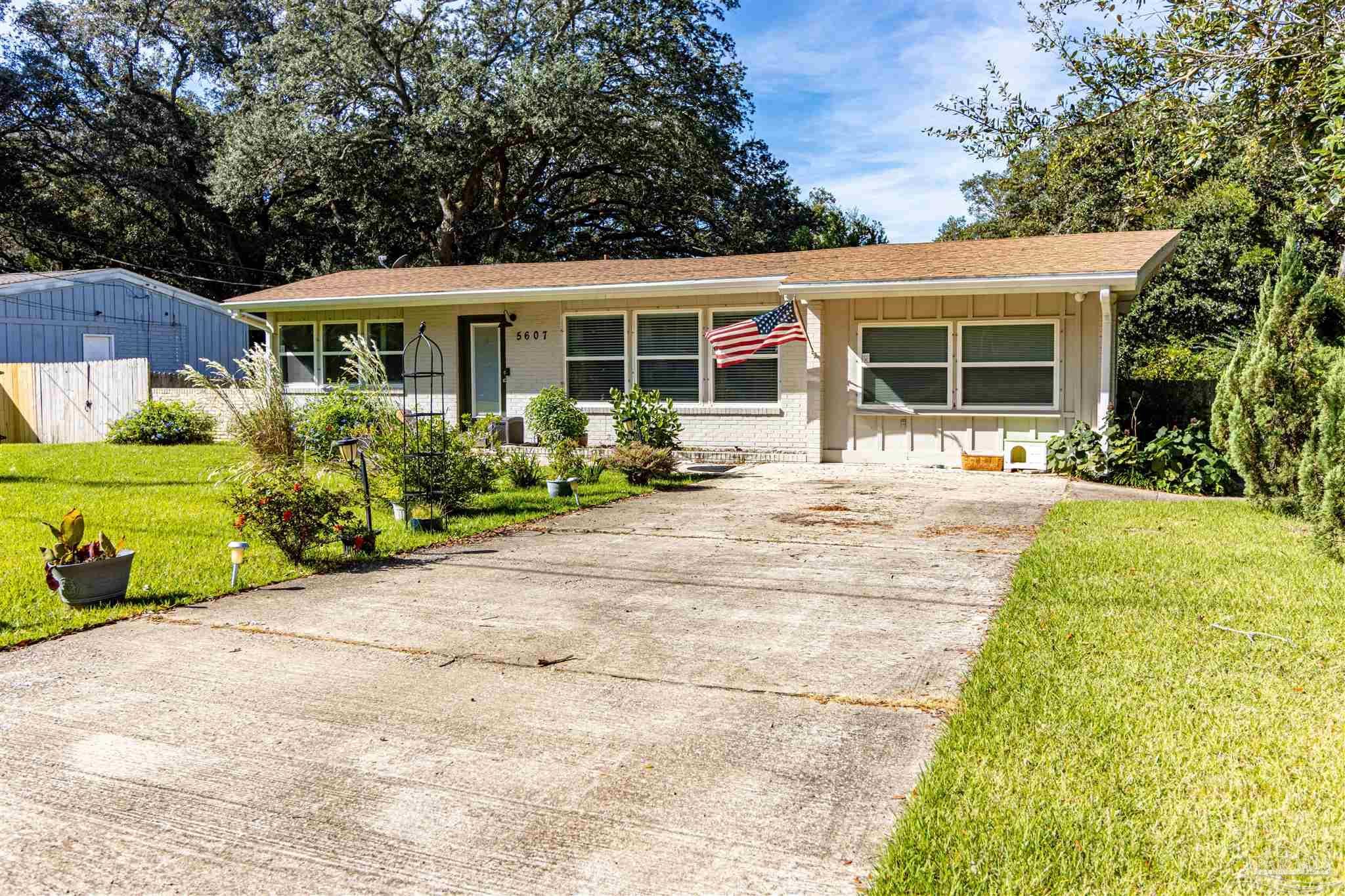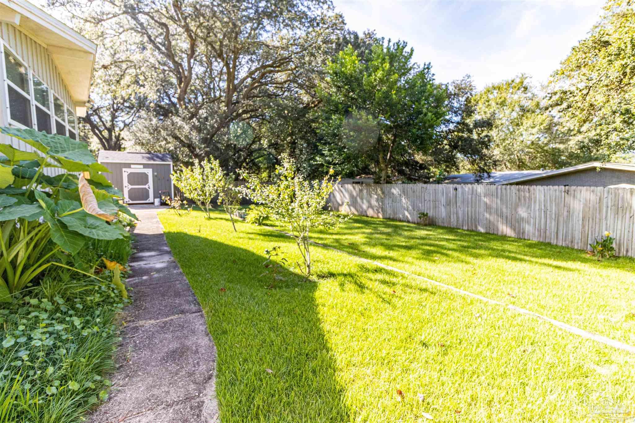 Beautifully updated home offering modern style and everyday comfort. Inside, you’ll find an open layout with travertine tile flooring throughout and tasteful finishes. The kitchen shines with white cabinetry, granite countertops, stainless appliances, and a large island with breakfast bar seating—perfect for casual gatherings. The split floor plan features a spacious primary suite with dual closets and a private bath, while additional bedrooms provide natural light and ample storage. A versatile converted garage includes a half bath and flex space ideal for an office, gym, or guest suite. Outside, enjoy a fenced backyard with an uncovered deck for relaxing or entertaining, plus a yard building added in 2022 that conveys as-is. The irrigation well was replaced within the last 2 years and connects to a full sprinkler system. Convenient central location near shopping, dining, hospitals, and the airport—only 30 minutes to the emerald waters of Pensacola Beach.