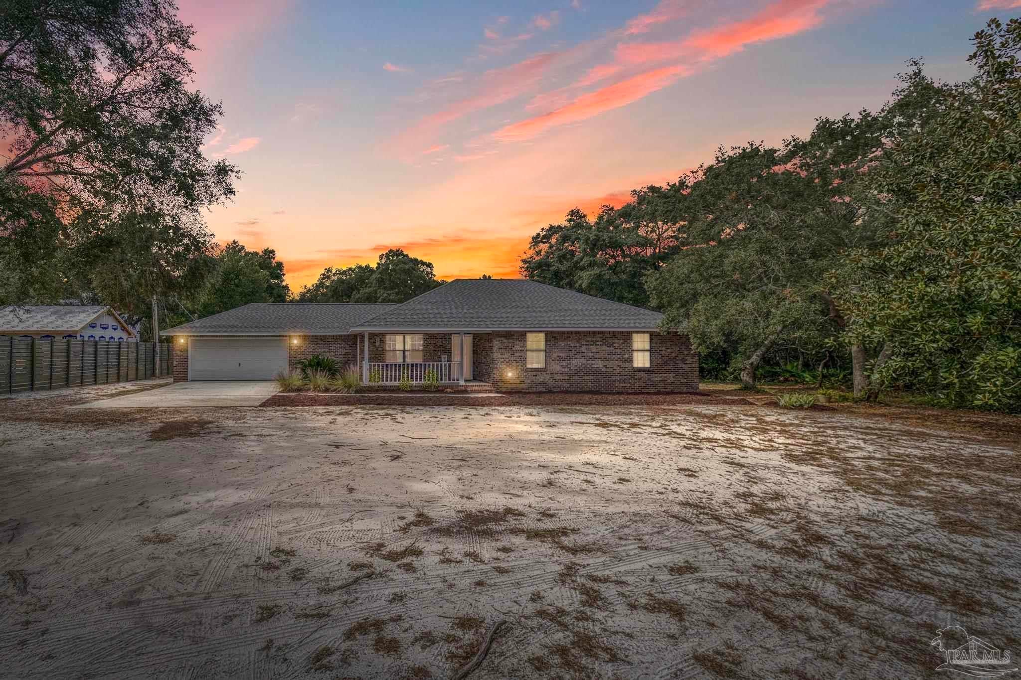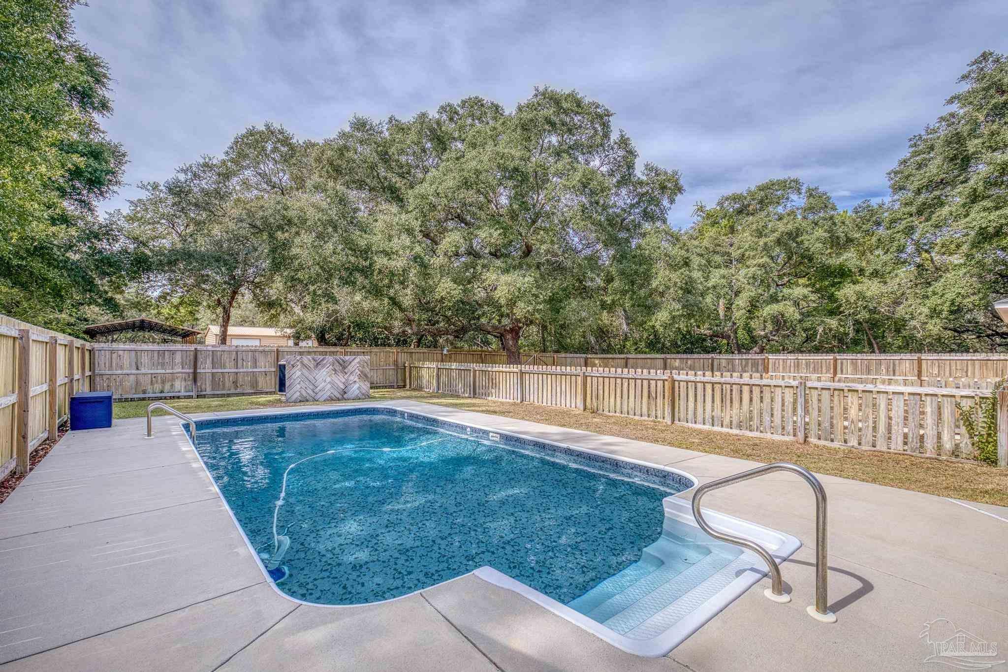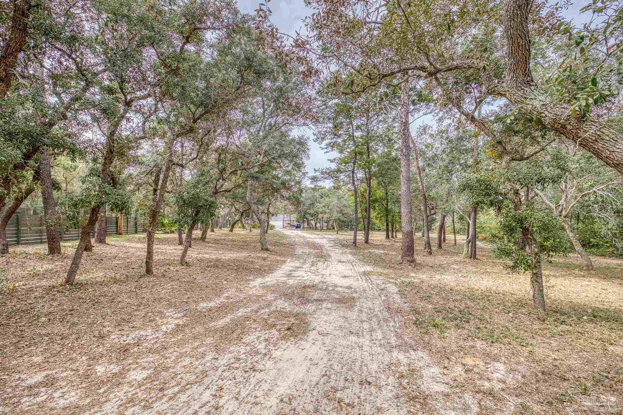 PRIVATE 1.5 ACRE WOODED LOT ~ POOL 2022 ~ HICKORY SHORES AREA ~ EASY ACCESS TO GULF BREEZE ~ DETACHED BARN with COVERED POLE BARN AREA ~ Don't miss this beautiful retreat that feels far away but still near all things Gulf Breeze / Navarre. Brick home with great curb appeal sits well off the road for privacy. Covered front porch with plenty of shade invites you in to an open concept home with new LVP flooring (2025). Dining area to your left leads to open kitchen / great room - perfect for entertaining flow! KITCHEN has quartz countertops, gas stove, plentiful cabinetry, stainless appliances and tiled backsplash. GREAT ROOM has new LVP flooring, gorgeous stone fireplace and french door access to back patio / pool lanai. PRIMARY BEDROOM is oversized with french door access to back patio / pool lanai and walk in closet. PRIMARY BATHROOM has LVP flooring, updated mirror and tub/shower combination. Two additional bedrooms share a hall bathroom with updated LVP flooring and tub/shower combination. Expansive back yard has chlorine pool (2022) with privacy fence for safety and separate gated play area (with gate access to the back of the yard). At the rear of the lot, you'll find the 1200 sq ft WORKSHOP plus bonus attached pole barn covered area perfect for hobbies or storage. Other amenities include: LARGE utility / laundry room with double door closet, laundry hook ups, utility sink and storage cabinetry; Short walk to the Bay; located 2 miles from new high school and 2.5 miles to Publix/Lowes shopping center. ROOF 2023; WATER HEATER 2025; HVAC 2014. Make sure to view the virtual tour then make an appointment to see this one and get your offer in!
