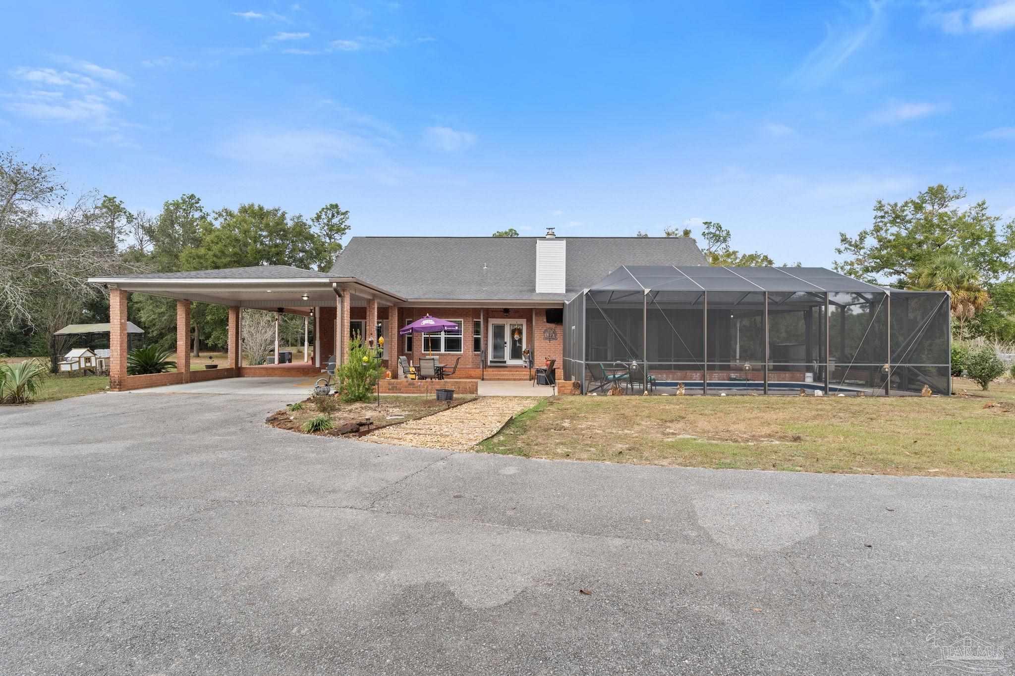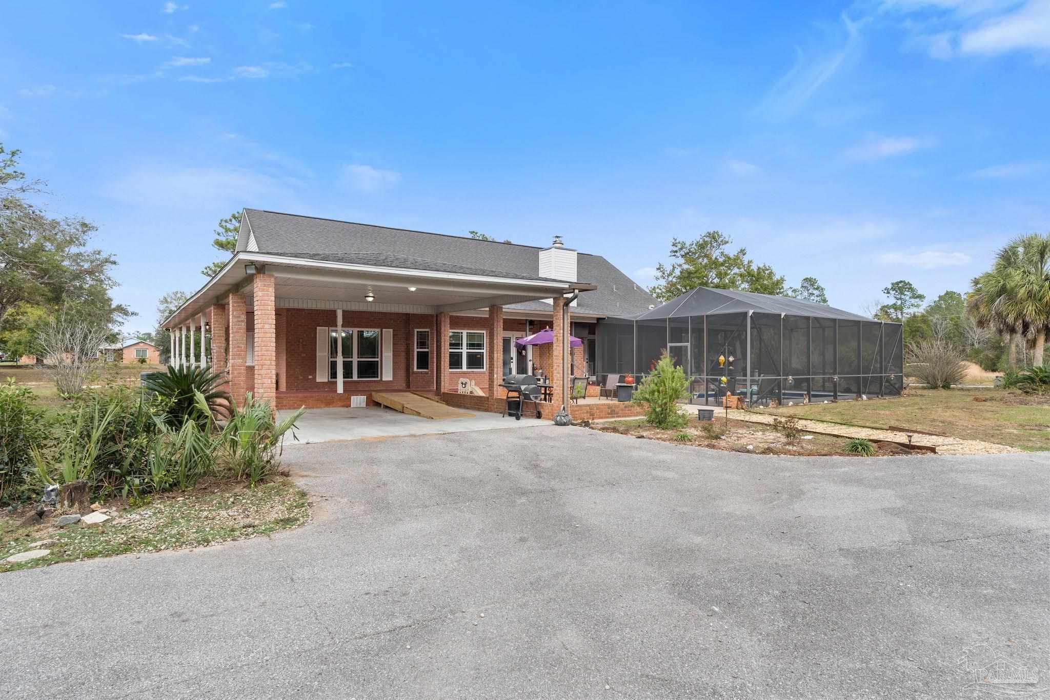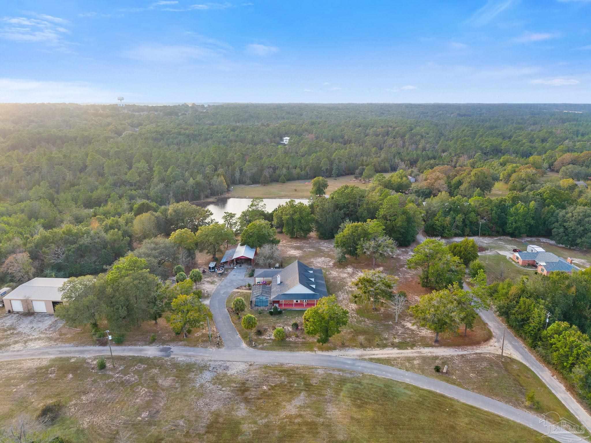 This is a RARE and UNIQUE 3-Bedroom, 3-Bathroom Brick home on 30 ACRES in the middle of Milton. Enjoy the feel of peaceful country living just minutes from town. The property features an ENCLOSED SALTWATER POOL, a FISHING POND, a CREEK, a massive 3,000 SQ. FT. metal building with power, and another 2400 sq. ft. garage/workshop with power. Additional highlights of this home are a wrap around porch, wood burning fireplace, Chef's Kitchen, large laundry room, and a bathroom that opens to the pool area. The attic offers room to expand or add additional living space if desired. For travelers, there is an RV hookup with a dedicated dump station. Located at the end of a dead-end road, this property offers true privacy while still being close to schools, shopping, and local amenities. Enjoy the benefits of in-town convenience with the feel of country living — a rare find!