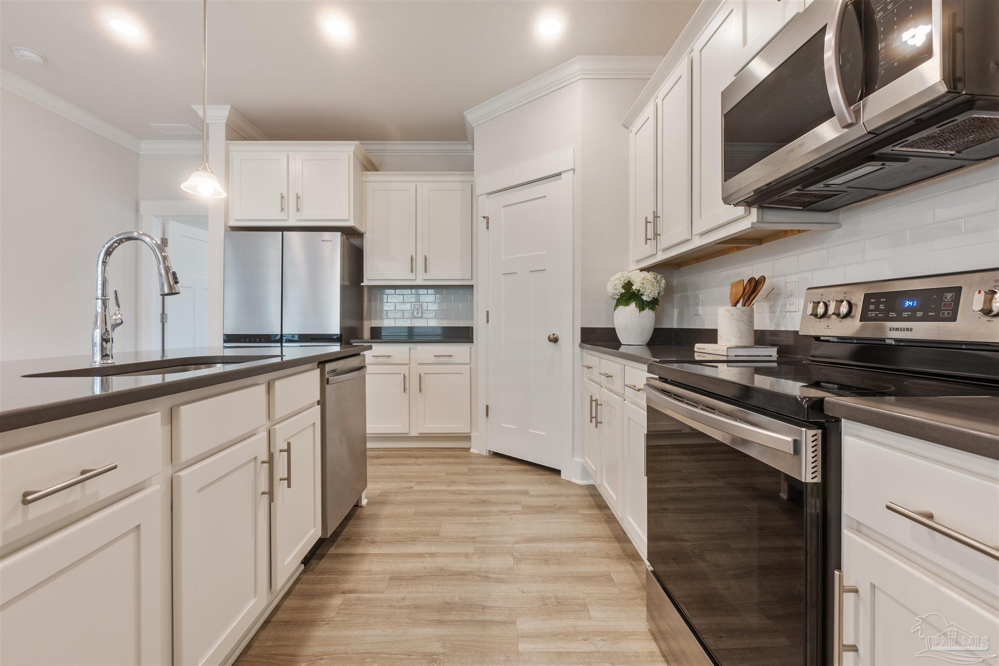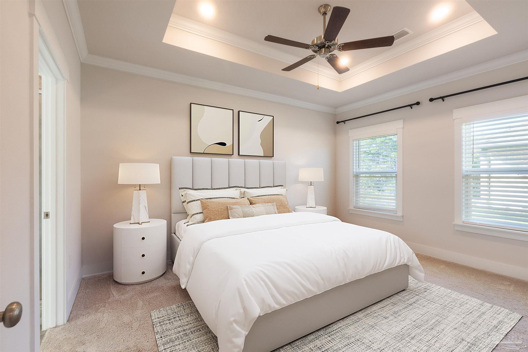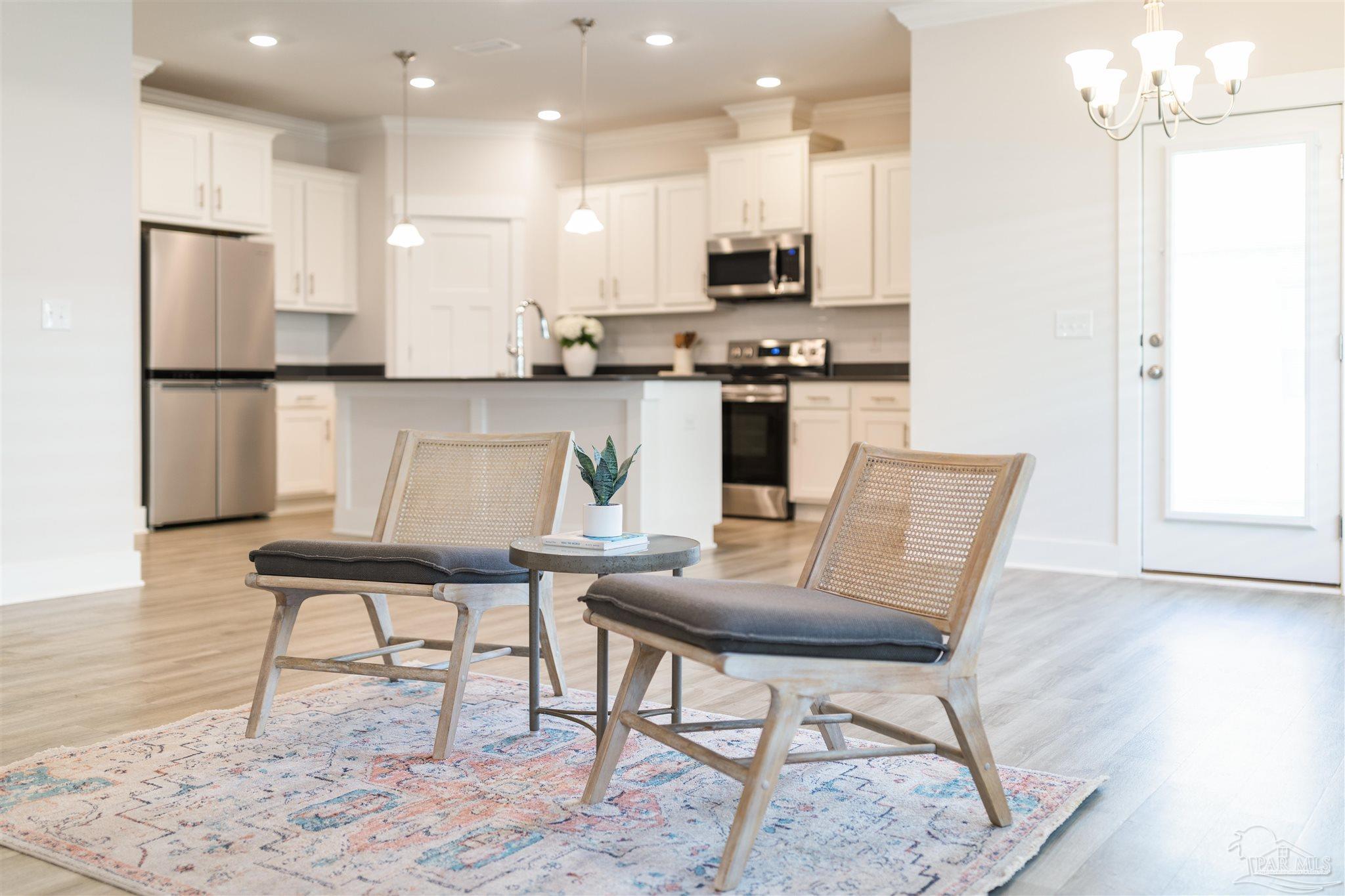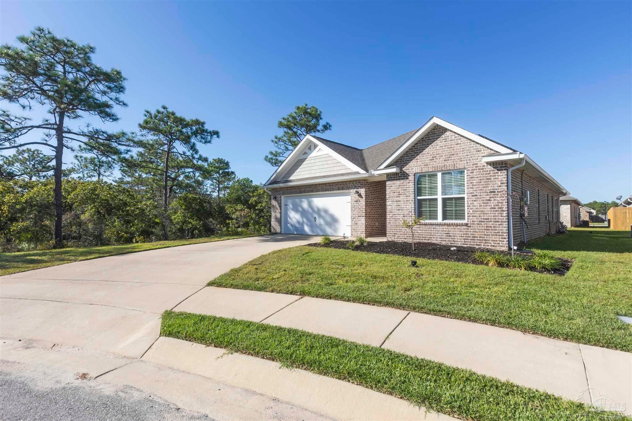 Beautiful 4-year-old Craftsman-style all-brick home in the desirable Cambridge Park, ideally located off Hwy 98 and near the sugar-white beaches. This home sits at the end of a spacious cul-de-sac, offering extra privacy, minimal traffic, and a great space for outdoor gathering. The welcoming foyer opens to a split-bedroom, open-concept layout with crown molding, granite countertops in kitchen and baths, and luxury vinyl plank flooring throughout with carpet in the bedrooms. The kitchen features stainless steel appliances, shaker cabinetry & plenty of counter space. The private master suite includes tray ceilings with crown molding and an en-suite bath with dual granite vanities, separate shower, and garden tub. It also includes a large walk-in closet that leads into the laundry room. Enjoy the fully fenced backyard (to be completed within the week) and relax on the covered back porch. Solar panels will be paid in full at closing, allowing buyers to reap the benefits of solar living with low electric bills in this energy-efficient home. Don't miss the chance to own this stunning property!
