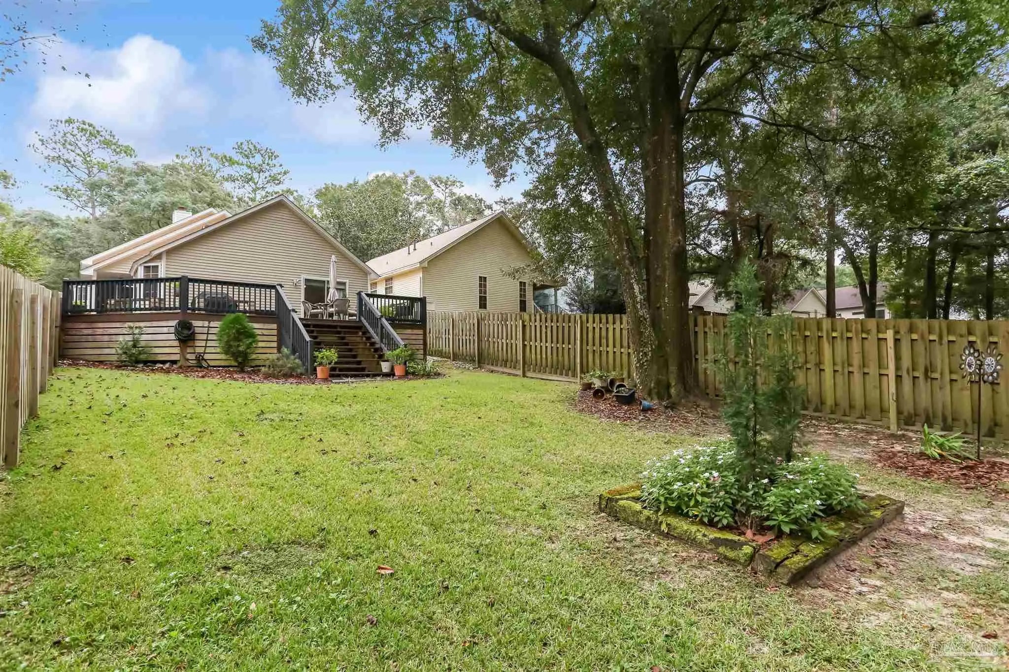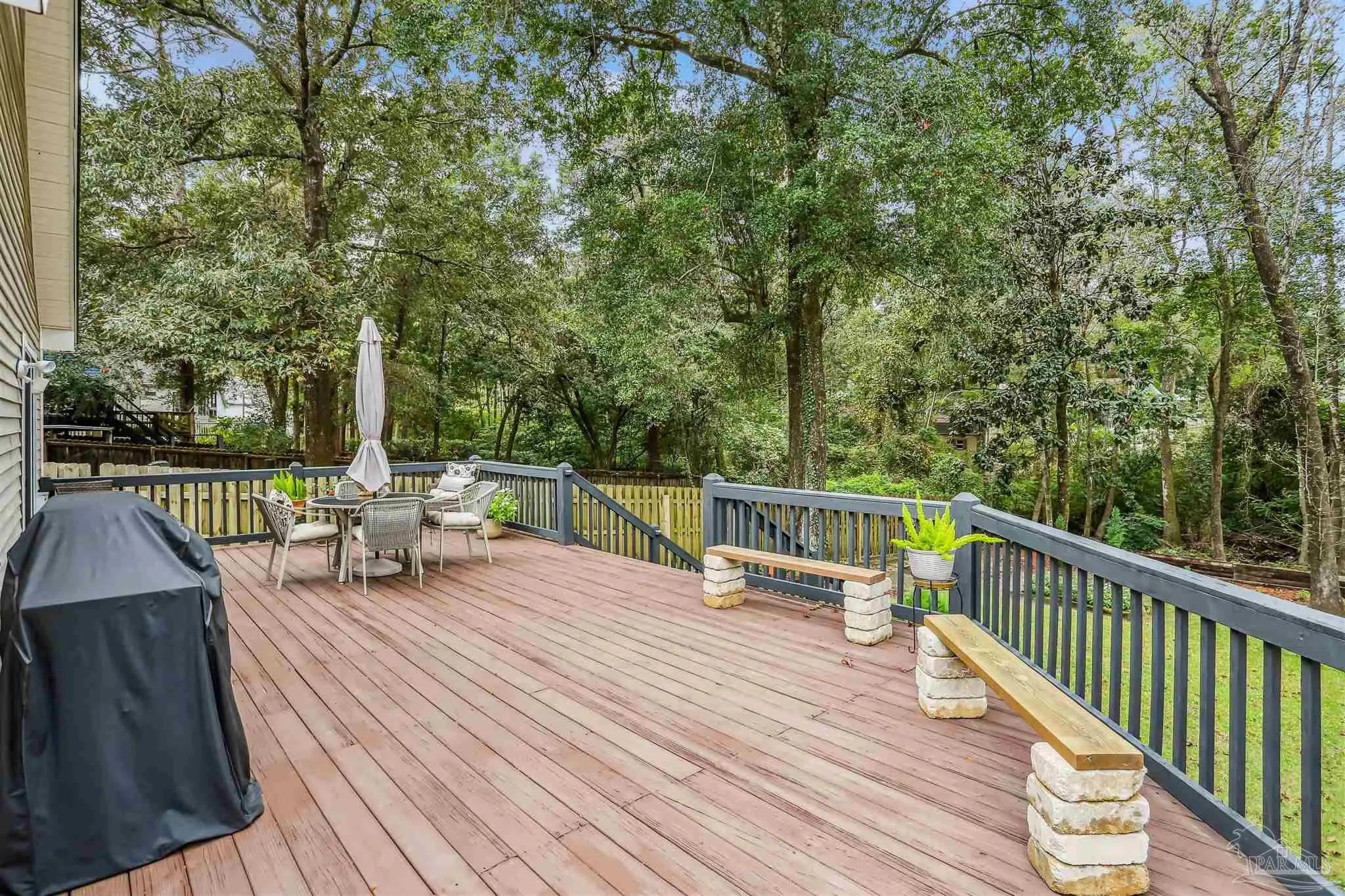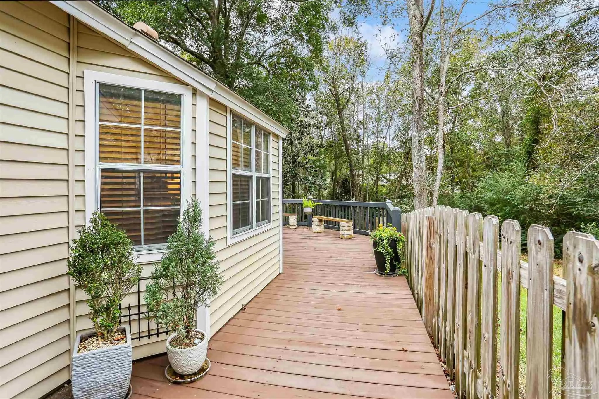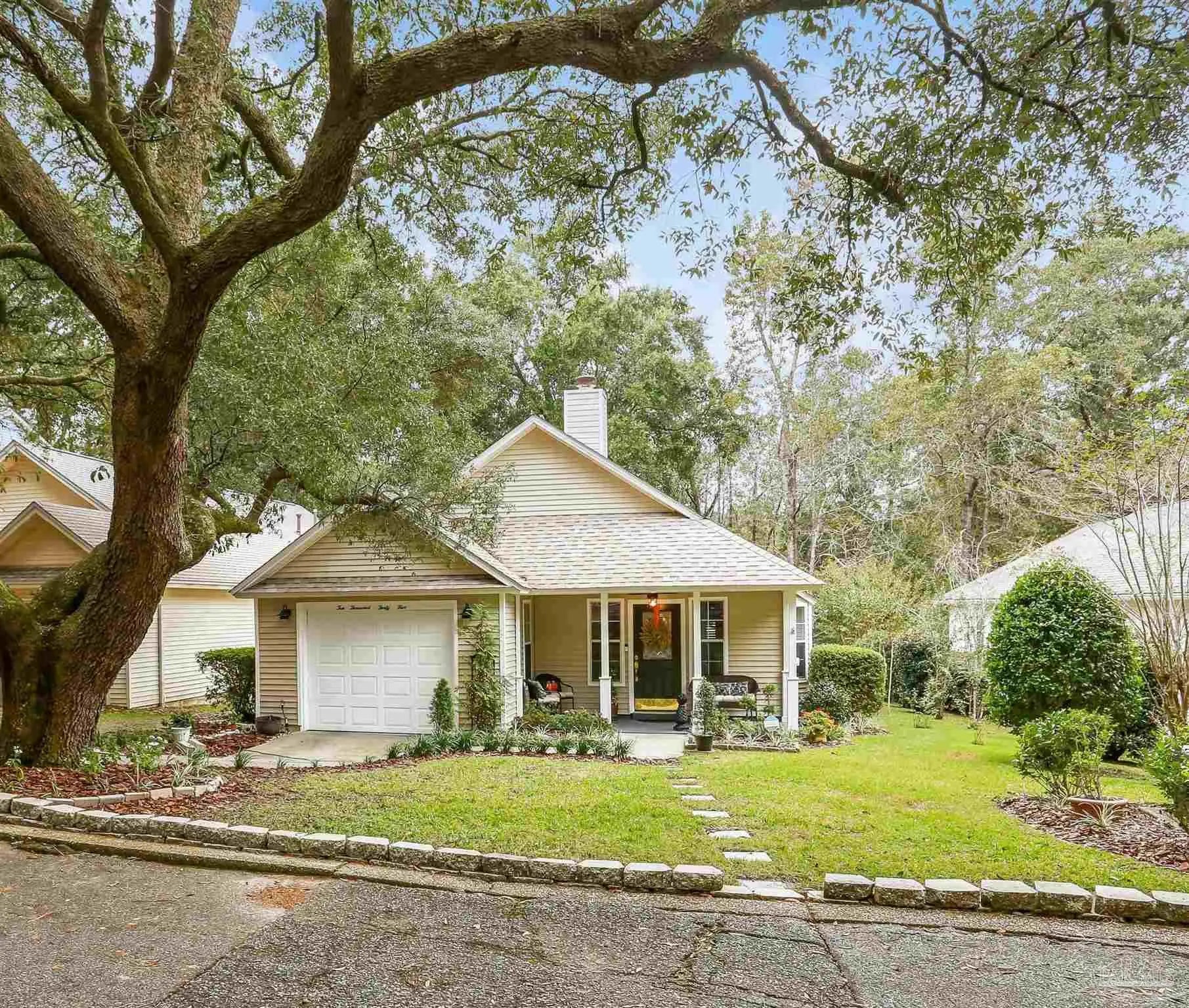 Ready-to-occupy, fully-equipped 3BR/2BA cottage in Hunters Run! Nestled in the tree-filled neighborhood of Hunters Run, this charming cottage offers the perfect blend of comfort, character, and convenience. Located just off 9 Mile Rd—close to UWF, shopping, restaurants, and more—this walkable community is filled with mature trees and peaceful surroundings. Step onto the inviting front porch and into a cozy brick-floor foyer that leads to a warm and welcoming great room featuring a fireplace, built-in bookcases, LVP flooring, crown molding, and abundant natural light from sliding glass doors. The dining area, open to the kitchen and great room, features sliding glass doors leading to a covered patio—perfect for barbecuing or relaxing outdoors. The updated kitchen boasts granite countertops, stainless steel appliances, and a large pantry. The spacious primary suite offers direct access to the expansive 600+ sq. ft. deck that overlooks the fully fenced backyard and mature trees. A large walk-in closet and luxurious bath with dual vanities, soaking tub, and an upgraded all-tile separate shower complete the retreat. Outdoor living truly shines here with the covered patio, huge back deck, and lush tree-filled setting. Renovated approximately 6–7 years ago to include roof, HVAC system, kitchen, baths, lighting, and fixtures—this home is move-in ready and beautifully maintained. Don’t miss this gem in one of the area’s most convenient and picturesque neighborhoods!
