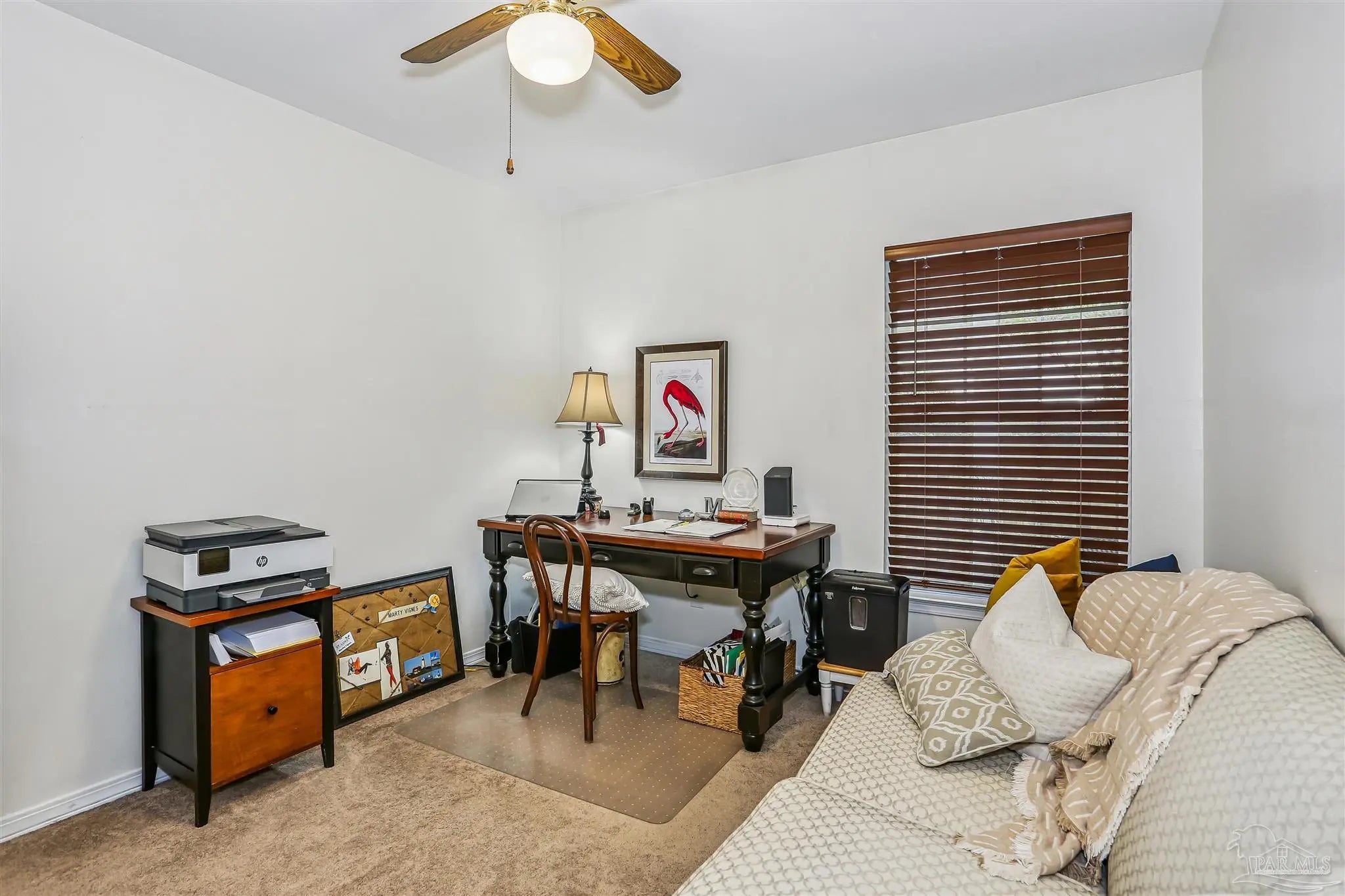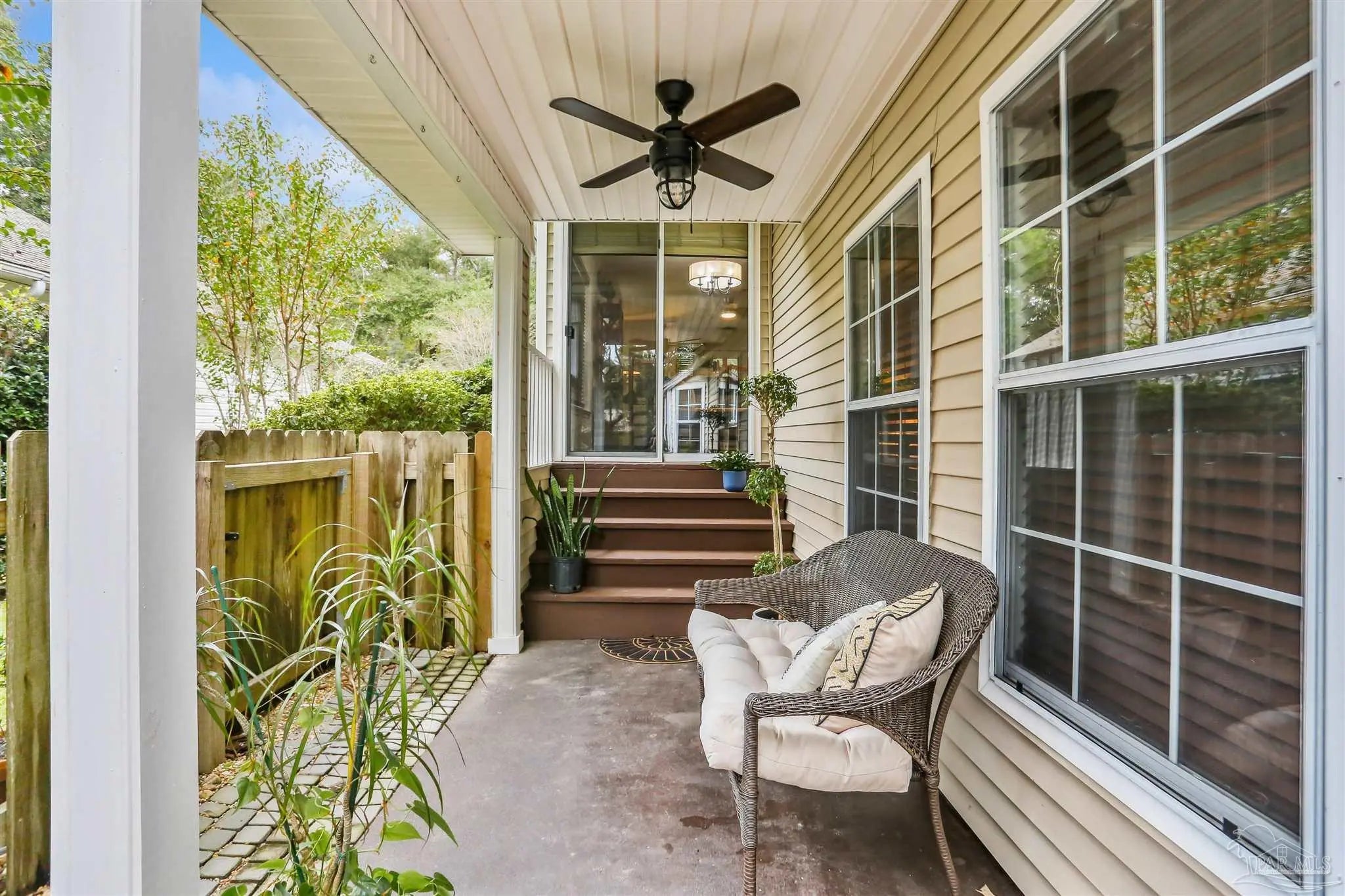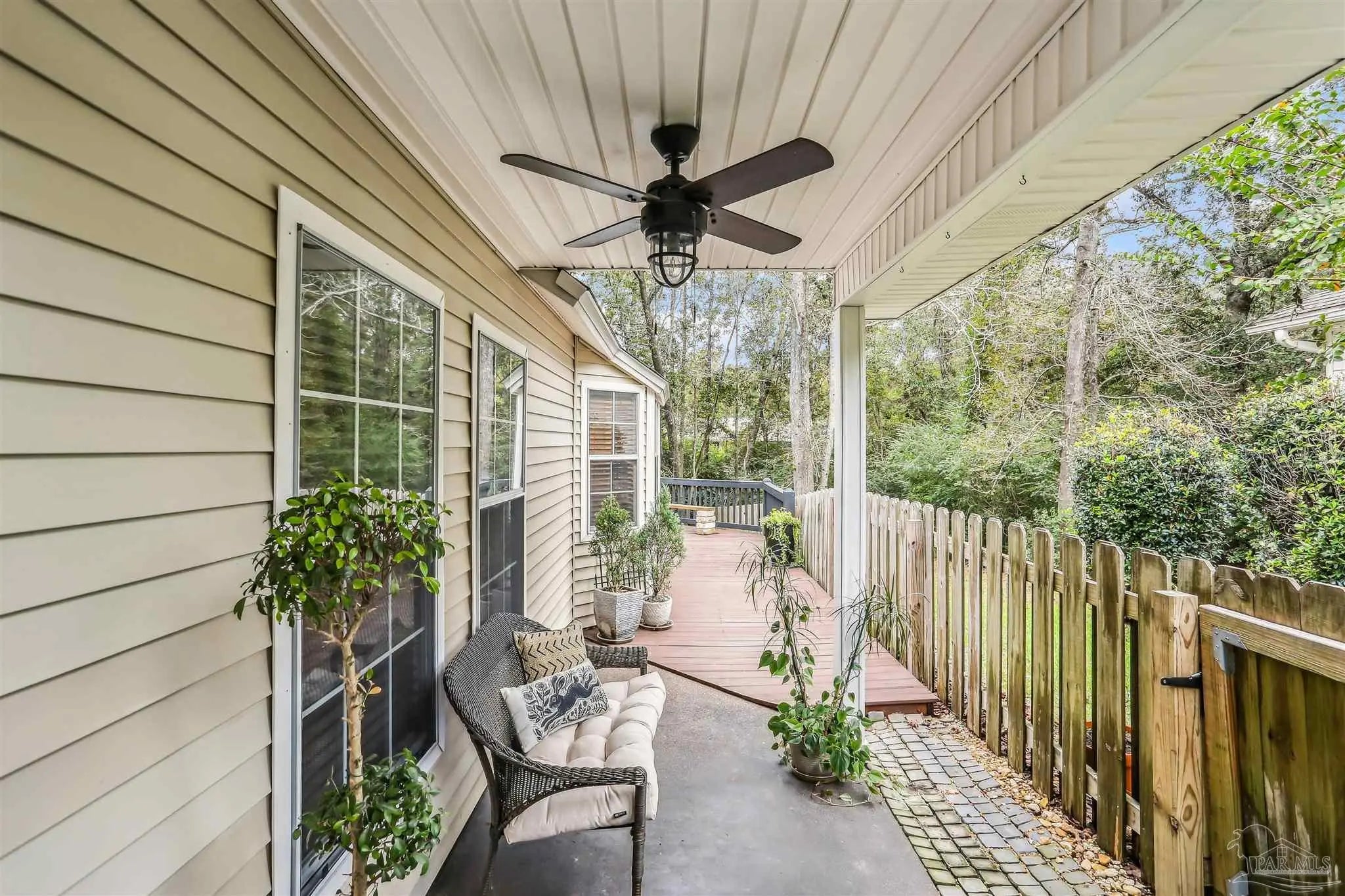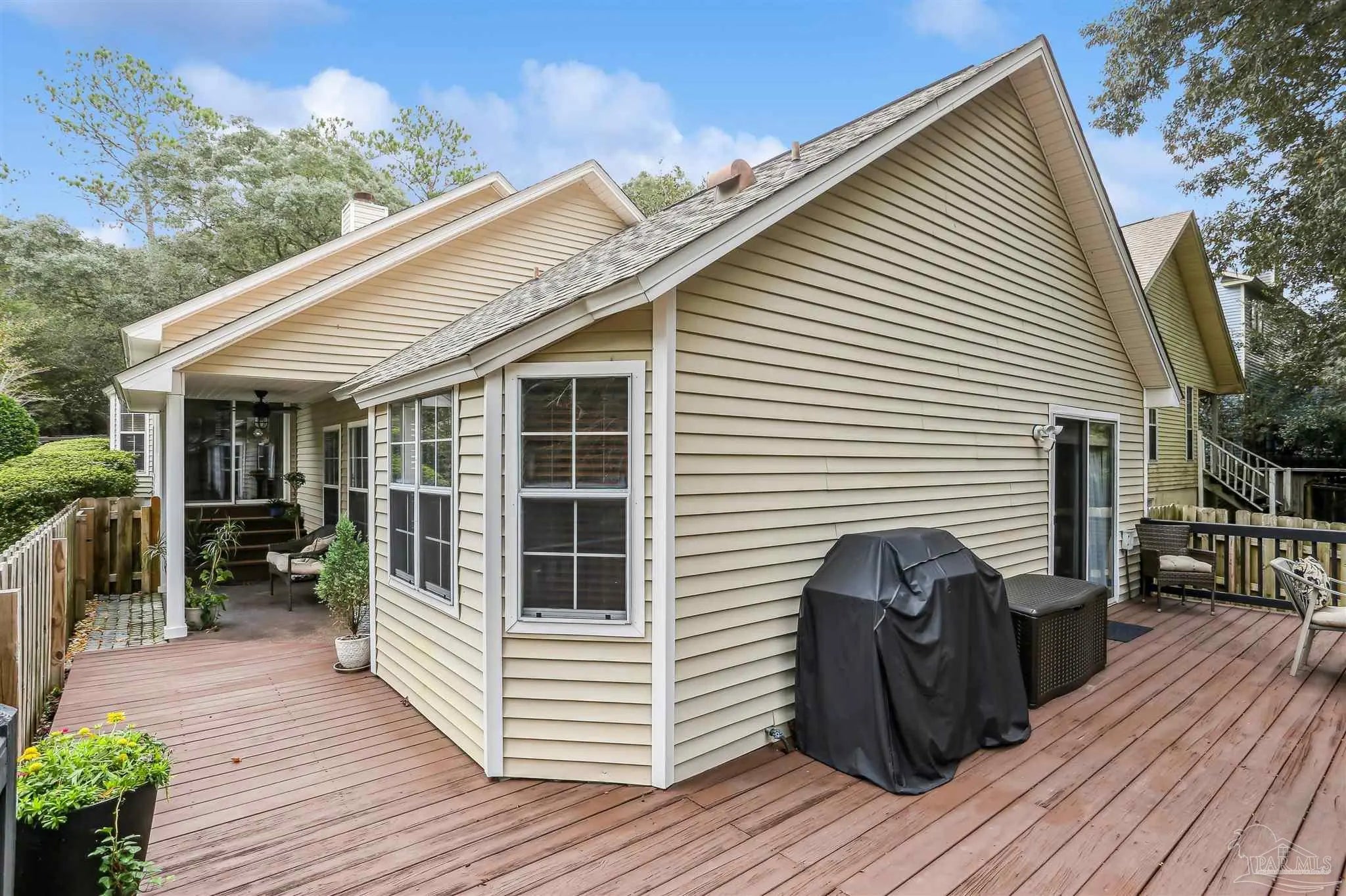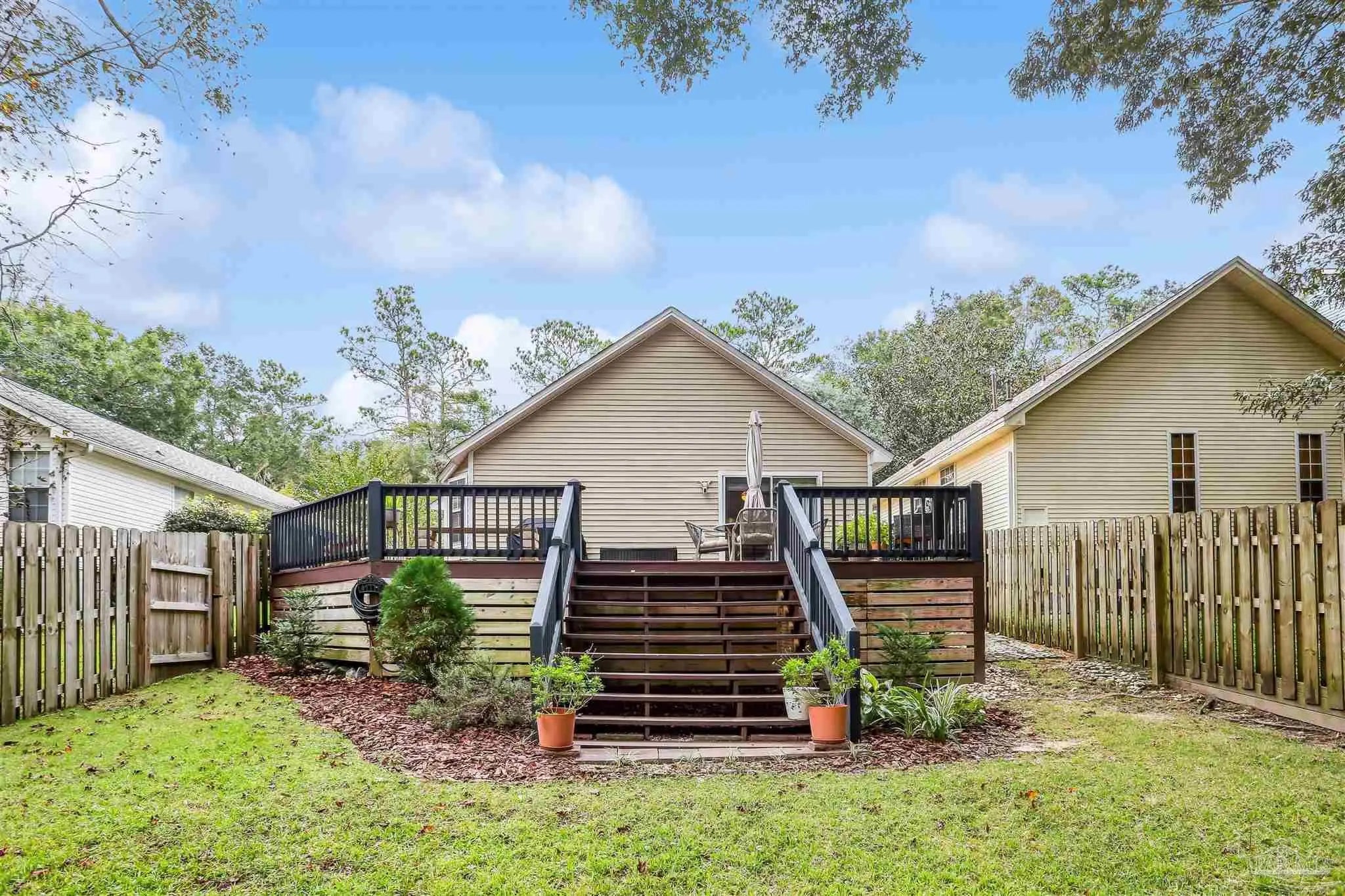Ready-to-occupy, fully-equipped 3BR/2BA cottage in Hunters Run! Nestled in the tree-filled neighborhood of Hunters Run, this charming cottage offers the perfect blend of comfort, character, and convenience. Located just off 9 Mile Rd—close to UWF, shopping, restaurants, and more—this walkable community is filled with mature trees and peaceful surroundings. Step onto the inviting front porch and into a cozy brick-floor foyer that leads to a warm and welcoming great room featuring a fireplace, built-in bookcases, LVP flooring, crown molding, and abundant natural light from sliding glass doors. The dining area, open to the kitchen and great room, features sliding glass doors leading to a covered patio—perfect for barbecuing or relaxing outdoors. The updated kitchen boasts granite countertops, stainless steel appliances, and a large pantry. The spacious primary suite offers direct access to the expansive 600+ sq. ft. deck that overlooks the fully fenced backyard and mature trees. A large walk-in closet and luxurious bath with dual vanities, soaking tub, and an upgraded all-tile separate shower complete the retreat. Outdoor living truly shines here with the covered patio, huge back deck, and lush tree-filled setting. Renovated approximately 6–7 years ago to include roof, HVAC system, kitchen, baths, lighting, and fixtures—this home is move-in ready and beautifully maintained. Don’t miss this gem in one of the area’s most convenient and picturesque neighborhoods!