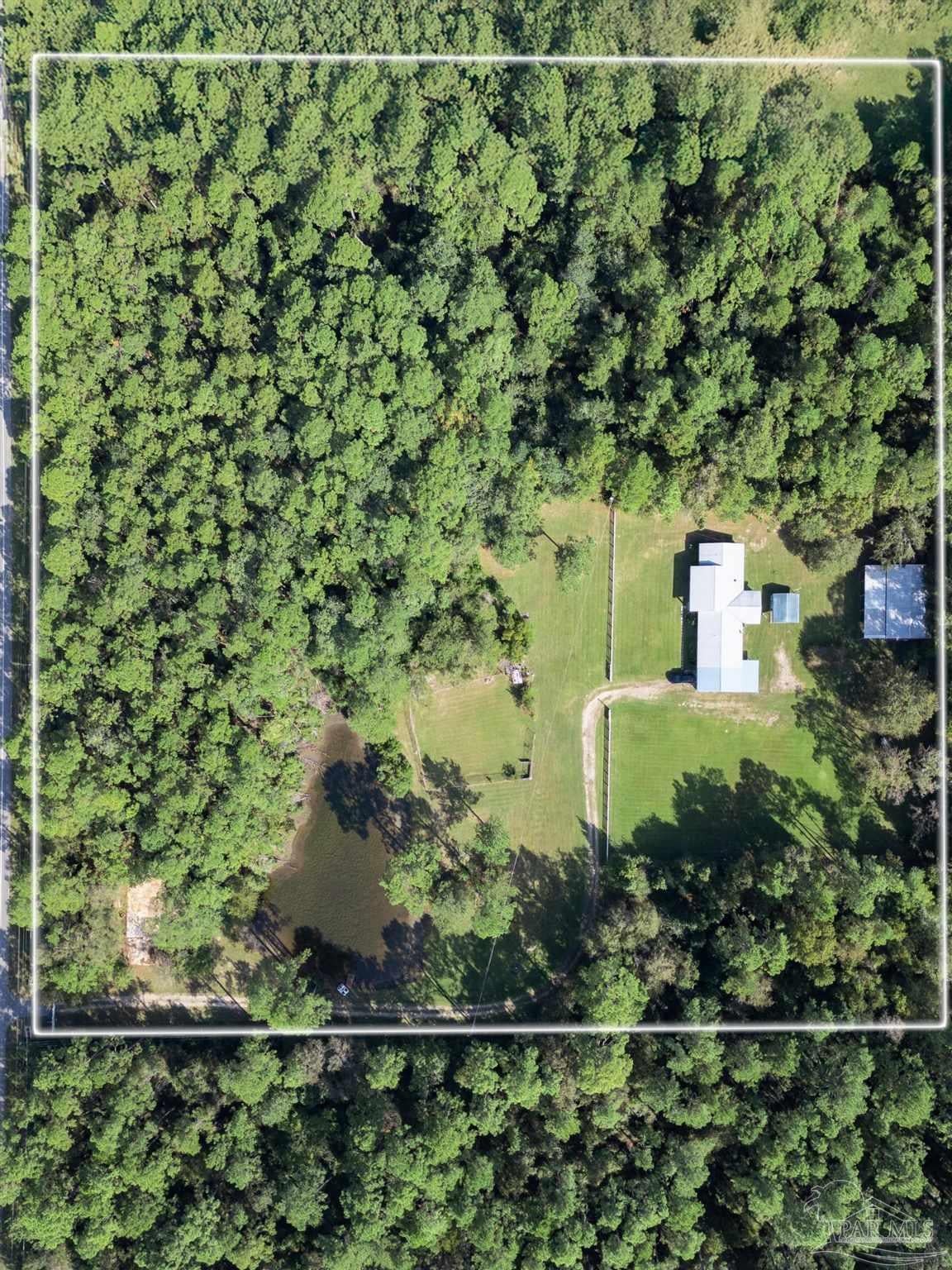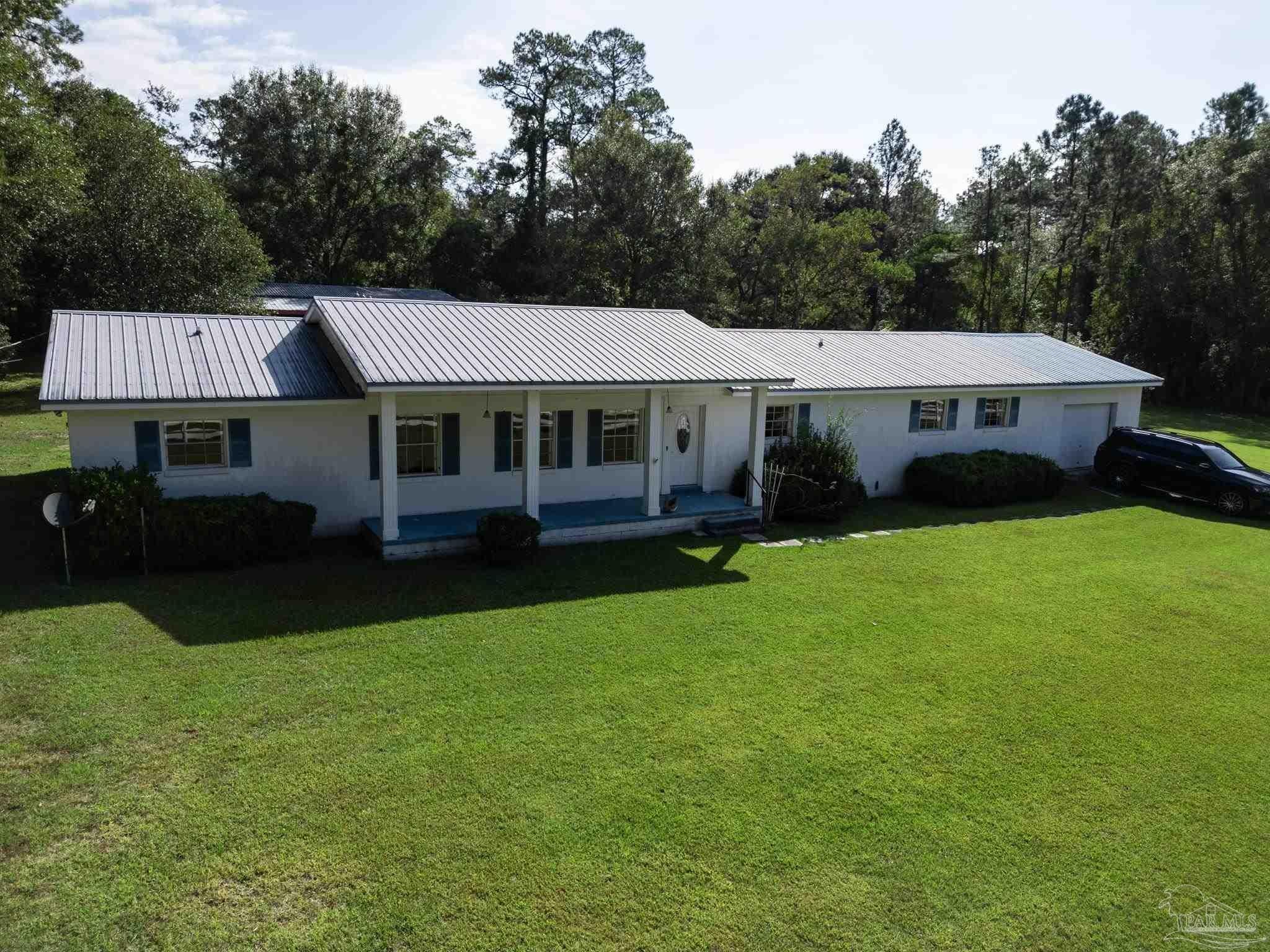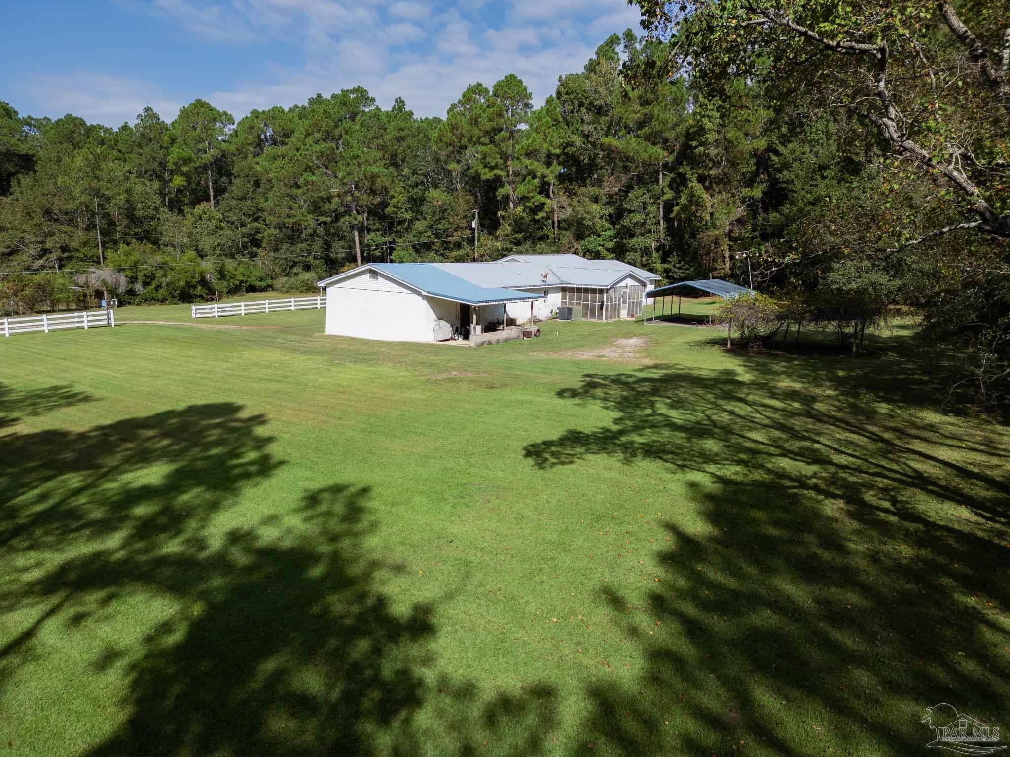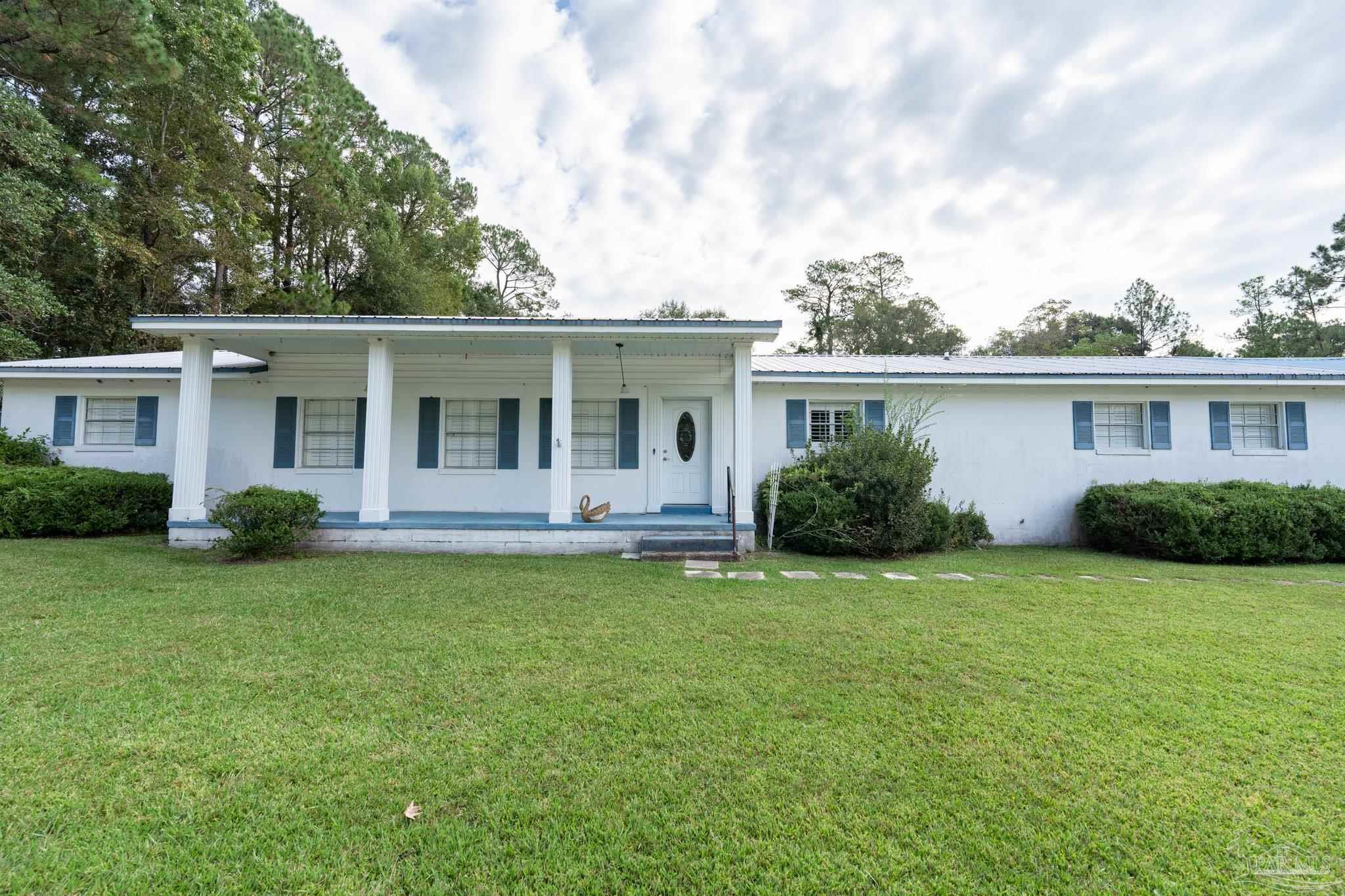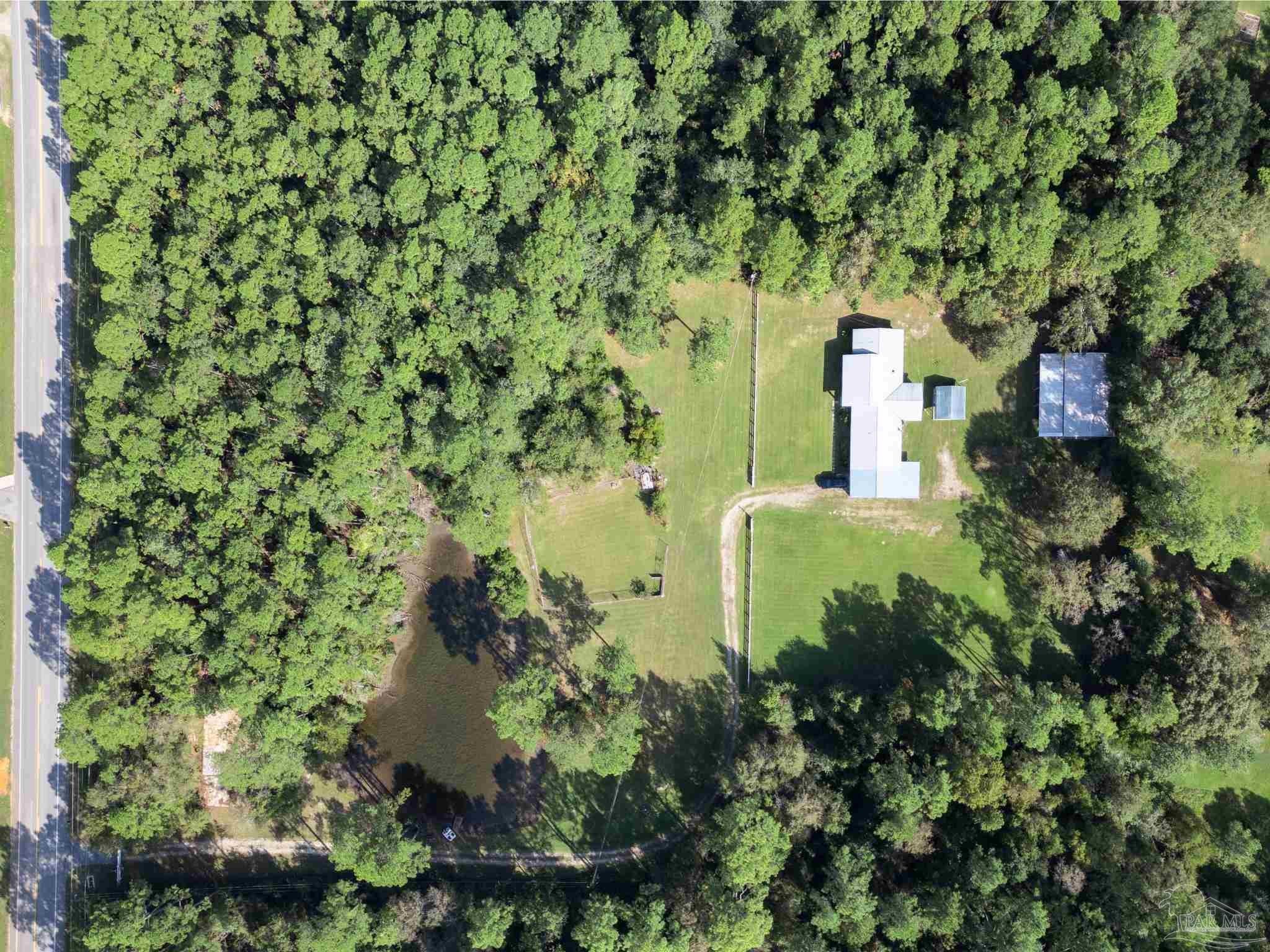 Rare opportunity in Cantonment — approx. 10 acres with gated access and ~660 feet of frontage along Hwy 297A, offering a combination of privacy, usable acreage, and potential for future development. The approach to the property opens with a spring-fed pond and then transitions into a mix of open fields and mature trees. Land features include multiple outbuildings and a large workshop with 7,000-lb lift, crane, overhead doors, compressor, vent fan, and second-story storage. Portions of the parcel include mapped wetlands; buyer should verify exact boundaries and any permitting requirements. The property is currently zoned LDR (Low Density Residential) within Escambia County. Seller indicates potential for rezoning to LDMU based on surrounding land uses; buyer responsible for confirming feasibility and process with Planning & Zoning. Existing improvements include a 1-story ranch-style residence (5 bedrooms / 3 baths) on slab with metal roof, screened rear porch, covered patio, interior laundry, and attached 1-car garage. The home and outbuildings convey as-is and may be used, renovated, or replaced depending on the buyer’s preferred use. Horses are permitted under current zoning, and the layout supports a wide range of use cases including private recreational living, small-scale agricultural use, equestrian, or redevelopment subject to county approval. Access is controlled by electric gate. Utilities include septic system. Pond frontage and pond view located onsite. Construction details and systems include block exterior, metal roof, central electric HVAC, geothermal open loop system, ceiling fans, interior shutters, built-ins, dishwasher, refrigerator, smooth-top range, and cover