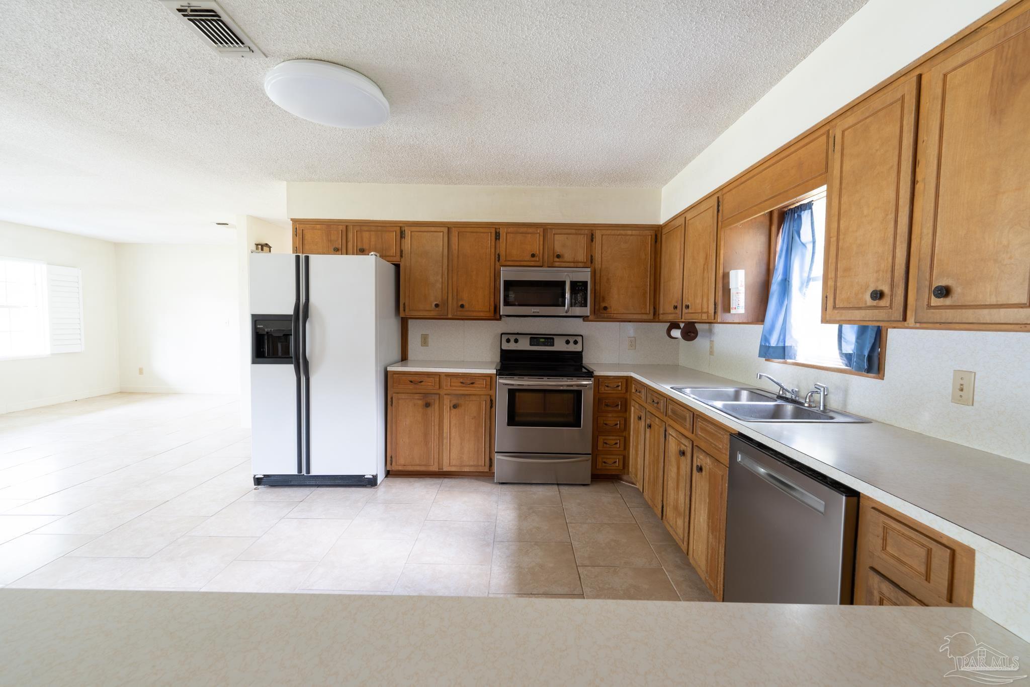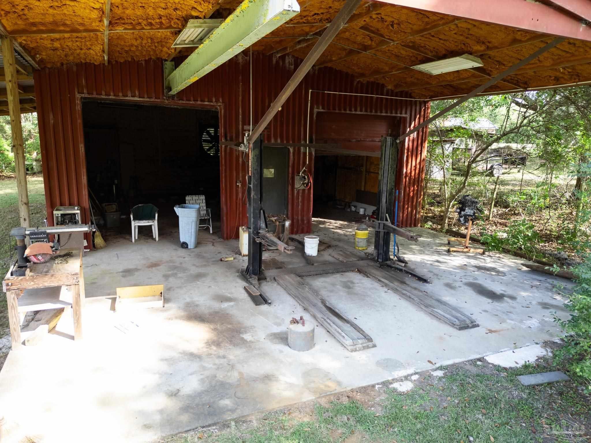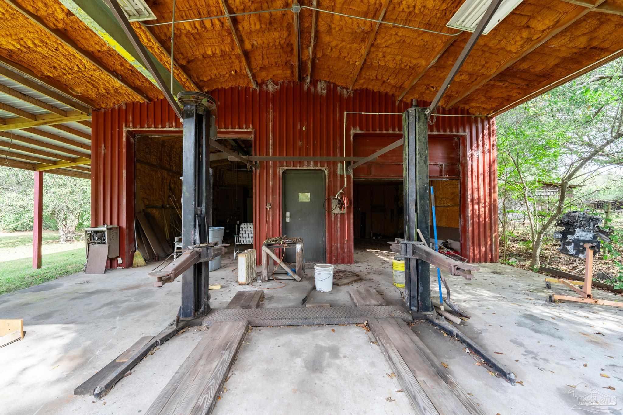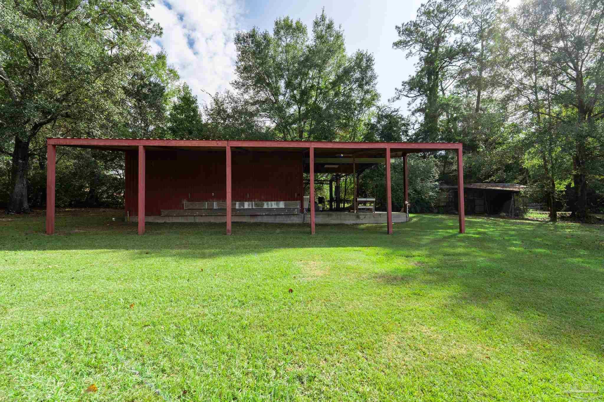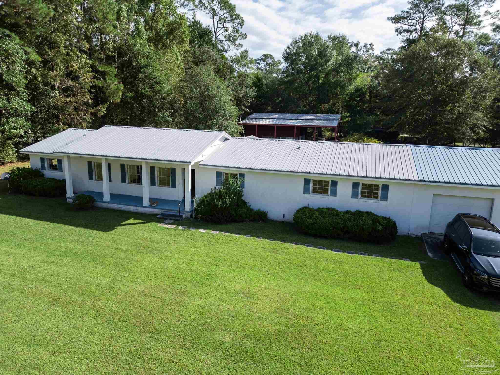 Rare opportunity in Cantonment — approx. 10 acres with gated access and ~660 feet of frontage along Hwy 297A, offering a combination of privacy, usable acreage, and potential for future development. The approach to the property opens with a spring-fed pond and then transitions into a mix of open fields and mature trees. Land features include multiple outbuildings and a large workshop with 7,000-lb lift, crane, overhead doors, compressor, vent fan, and second-story storage. Portions of the parcel include mapped wetlands; buyer should verify exact boundaries and any permitting requirements. The property is currently zoned LDR (Low Density Residential) within Escambia County. Seller indicates potential for rezoning to LDMU based on surrounding land uses; buyer responsible for confirming feasibility and process with Planning & Zoning. Existing improvements include a 1-story ranch-style residence (5 bedrooms / 3 baths) on slab with metal roof, screened rear porch, covered patio, interior laundry, and attached 1-car garage. The home and outbuildings convey as-is and may be used, renovated, or replaced depending on the buyer’s preferred use. Horses are permitted under current zoning, and the layout supports a wide range of use cases including private recreational living, small-scale agricultural use, equestrian, or redevelopment subject to county approval. Access is controlled by electric gate. Utilities include septic system. Pond frontage and pond view located onsite. Construction details and systems include block exterior, metal roof, central electric HVAC, geothermal open loop system, ceiling fans, interior shutters, built-ins, dishwasher, refrigerator, smooth-top range, and cover