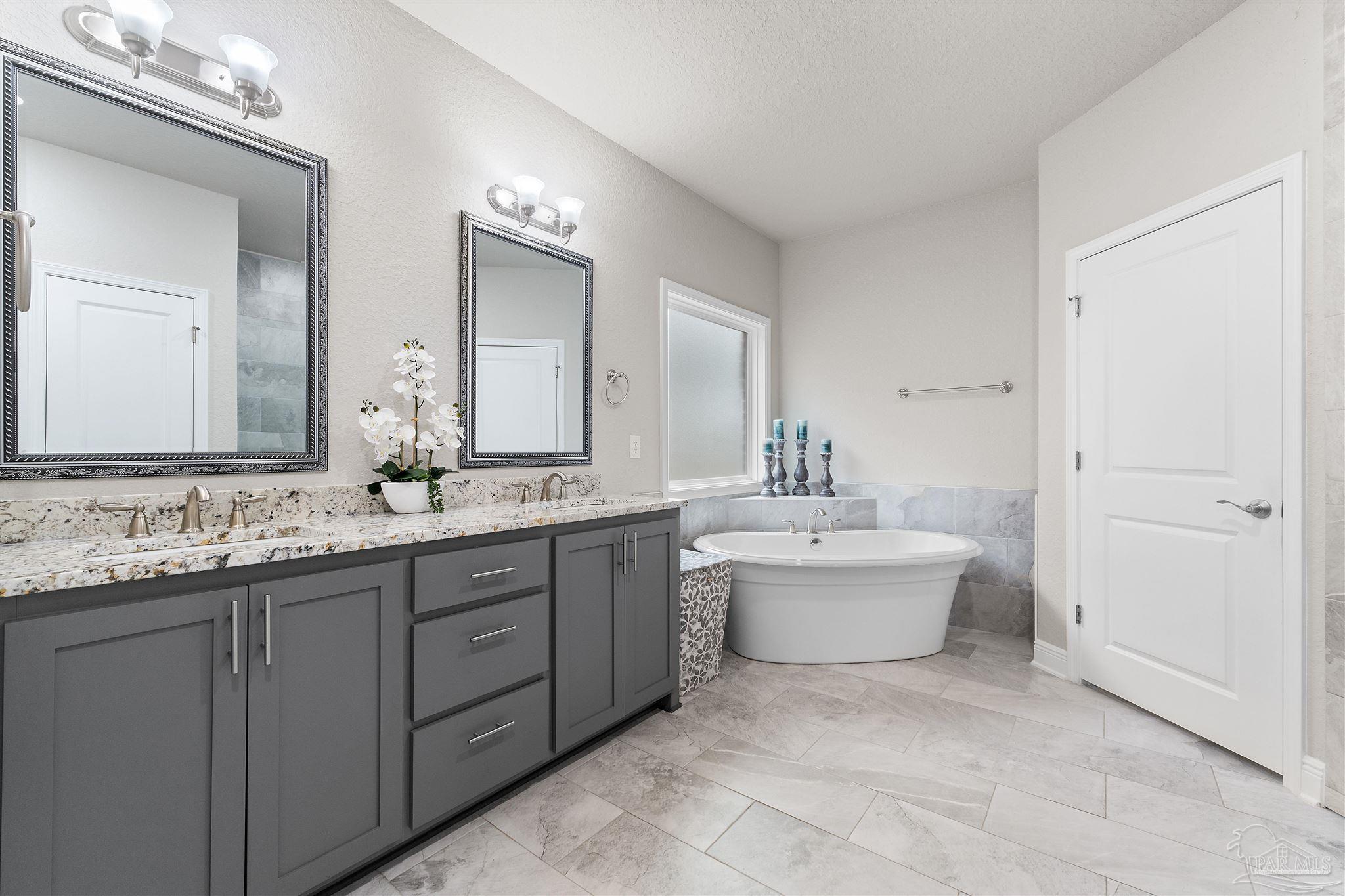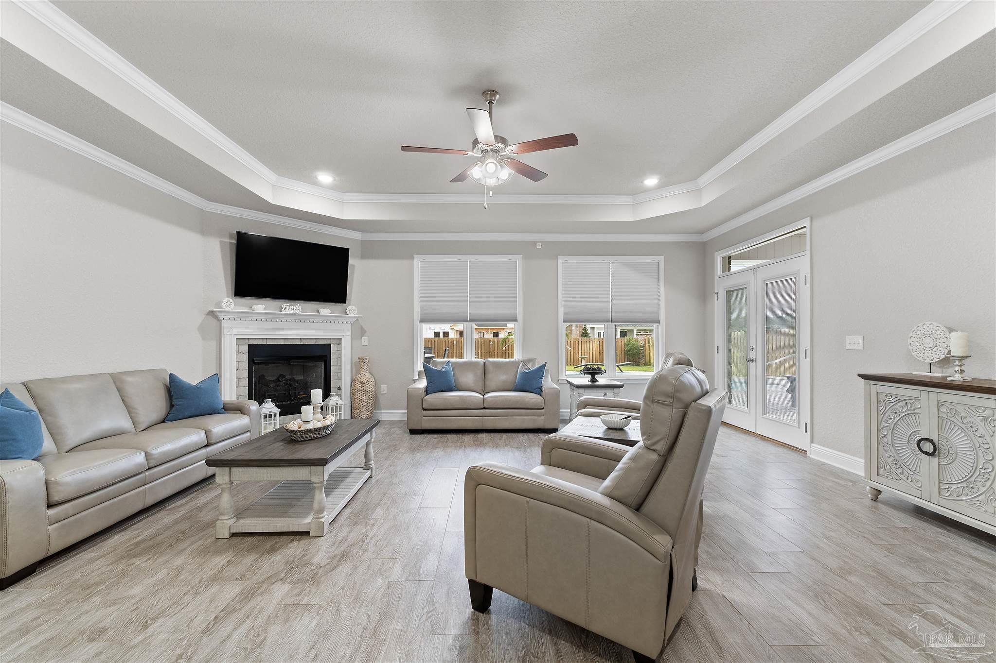 Presenting a stunning 3-bedroom, 2-bathroom home with an inground heated pool, located in the sought-after gated community of Carrington. This residence boasts a thoughtfully designed split floor plan, offering privacy and comfort for all residents. As you enter, you are welcomed into a spacious living area that features a gas fireplace, creating a warm and inviting atmosphere. The heart of the home lies in the contemporary kitchen, which is enhanced with sleek granite countertops, gas cooktop, wall oven, a farmhouse sink and custom modern cabinetry. The kitchen layout promotes efficient movement and easy access to essential appliances. With ample storage and a functional island, this space is perfect for both everyday meals and entertaining guests. The primary suite is a true retreat, showcasing elegant trey ceilings that add an extra touch of sophistication. This suite includes a generous walk-in closet and an ensuite bathroom featuring a double vanity, a freestanding garden tub, a separate walk-in shower, and a convenient linen closet. The well-designed space ensures comfort and functionality for daily routines. Outdoor living is highlighted by a beautifully maintained backyard, fully fenced for added privacy. The outdoor area features a sparkling inground pool, accompanied by both covered and open patio spaces prepped for a gas grill and outdoor tv, ideal for relaxation or hosting gatherings. The landscaping complements the pool area, ensuring an inviting setting for family activities or serene evenings. Additional amenities include epoxy flooring in the garage, enhancing durability and ease of maintenance. This home is not only stylish but practical, embodying the perfect blend of luxury and everyday comfort. Embrace the opportunity to live in this exquisite property where modern conveniences meet tranquil living in a vibrant community.