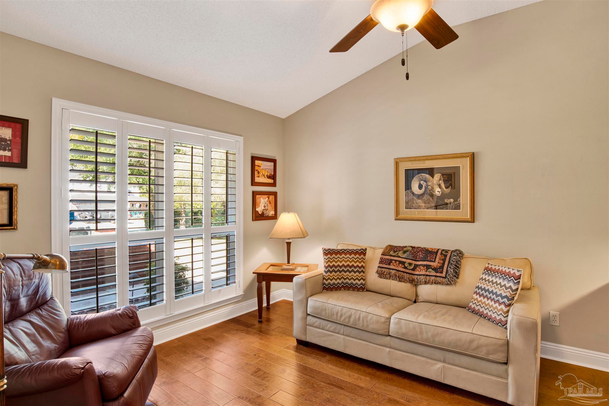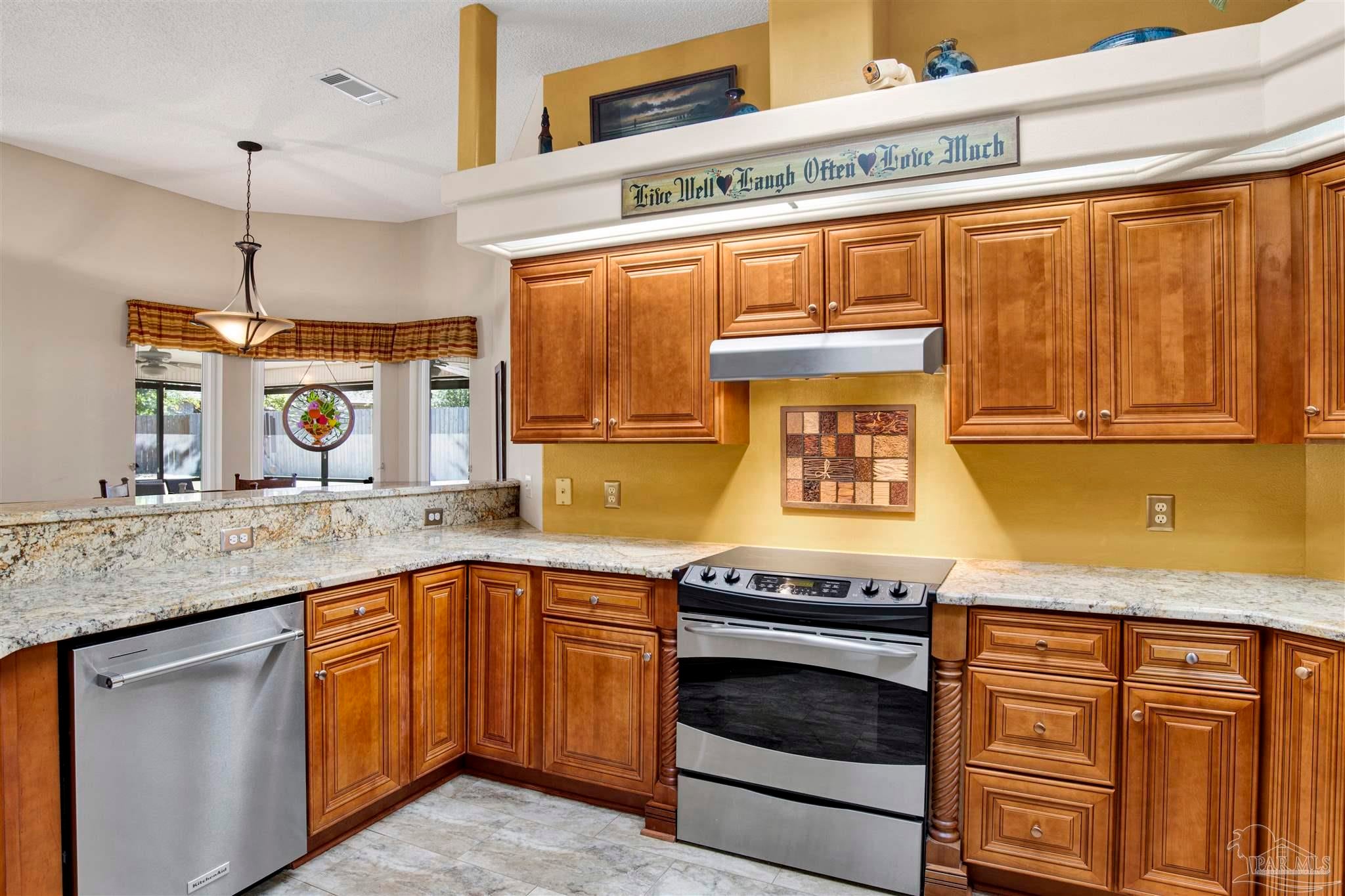 Welcome to this low maintenance pristine single-level golf course retreat. Tucked along the 3rd fairway of Hidden Creek Golf Course, this beautifully updated and maintained home feels like a private getaway--yet it’s just doors from the clubhouse and driving range. Come on inside, the open layout is perfect for entertaining. Enjoy a separate large dining room and an updated chef’s kitchen that comes complete with 2 ovens and a 15-foot wrap around raised granite counter bar. Everything is ready for hospitality and gatherings. Enjoy the open floor plan with hardwood floors, plantation shutters, remodeled baths including granite and tile with walk in showers and dual vanity in the master bath. A custom hickory full wall office unit adds warmth and function. Enjoy the gas fireplace in this home on a cool winter evening. Step outside to your screened patio with an outdoor kitchen, built in speaker and sweeping fairway views, your own backyard oasis. Practical updates include hurricane-rated windows (2012); impact resistant garage doors and openers, impact resistant exterior garage exit door, double metal roof tie down strapping and sprayed adhesive gussets to strengthen roof attachment to rafters (Rebuild Northwest Florida program 2014); back patio impact resistant French doors (2015); roof (2016), heat pump (Dec 2023); and water heater (2024). The 3-car garage with new cushioned mat flooring (Mar 2025) doubles as a gym or workshop along with extensive cabinet storage. As a Holley by the Sea resident, you’ll also have access to top-notch amenities—pools, clubhouse, beach house for venue rental, fitness center, tennis/pickleball courts, and a private boat ramp to East Bay. This is golf course living at its best in the much sought after Hidden Creek Estates development in Navarre.