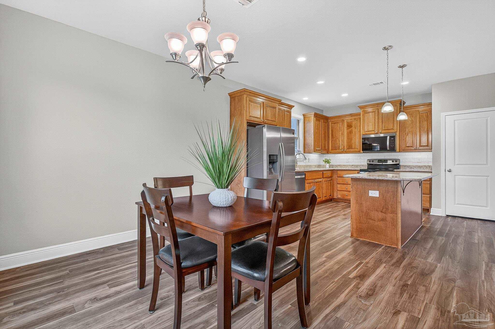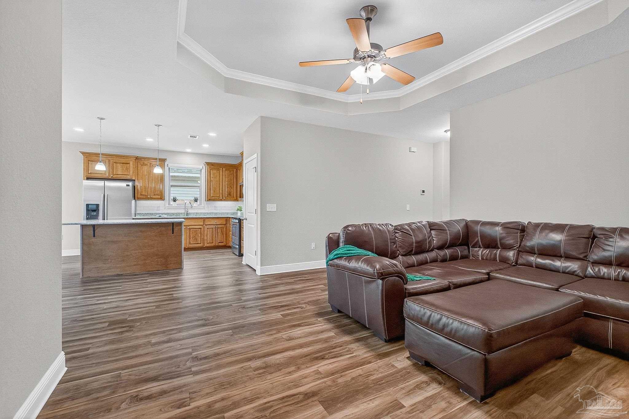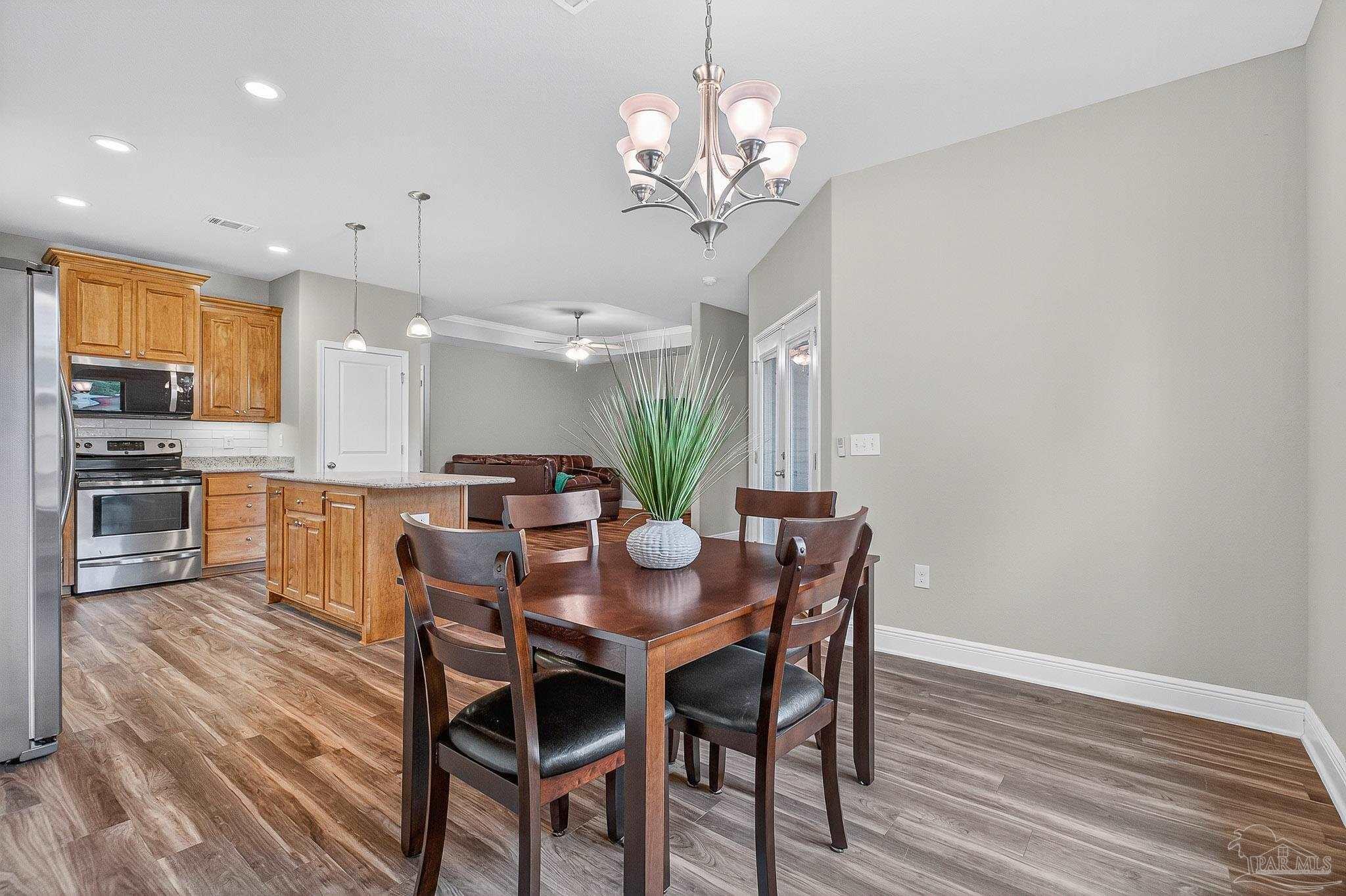 Step inside this exceptionally clean and well-maintained home in Millview Estates! This beautiful property features a bright, open floor plan with tall ceilings and a wide foyer that creates an inviting first impression. Natural light enhances the neutral color palette, highlighting the Spanish lace textured walls and elegant rounded corners. The kitchen is open to the living and dining areas, offering a spacious layout perfect for entertaining. Enjoy the large center island for your morning coffee or casual meals. The kitchen is equipped with stunning maple cabinets, granite countertops, stainless steel appliances, a built-in microwave, pantry, and plenty of workspace. The split-bedroom design ensures privacy, with generously sized secondary bedrooms and a spacious primary suite. The primary bedroom features a tray ceiling for added architectural interest and a custom look, along with a large walk-in closet. The en-suite bathroom includes a double vanity, separate shower, relaxing garden tub, and private water closet. Additional highlights include a full guest bath, interior laundry room, and manicured landscaping professionally maintained (sprinkler system recently installed). The privacy-fenced backyard features a covered porch and a hot tub that conveys with the sale—perfect for relaxing evenings at home. Recent upgrades include spray foam insulation for improved energy efficiency and soundproofing, additional gutters, privacy fencing, and blackout blinds. The water heater was replaced in 2025, along with new toilets, dishwasher, microwave, and kitchen faucet. A Reme Halo whole-home in-duct air purifier enhances indoor air quality, and a termite bond provides added peace of mind. Conveniently located near shopping, dining, NAS Pensacola, downtown, and the area’s beautiful white sandy beaches. No HOA. Call today to schedule your personal tour!