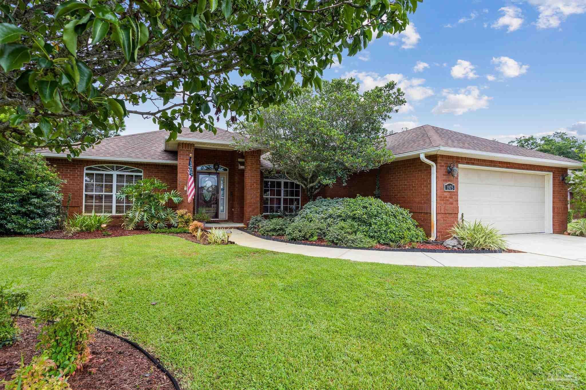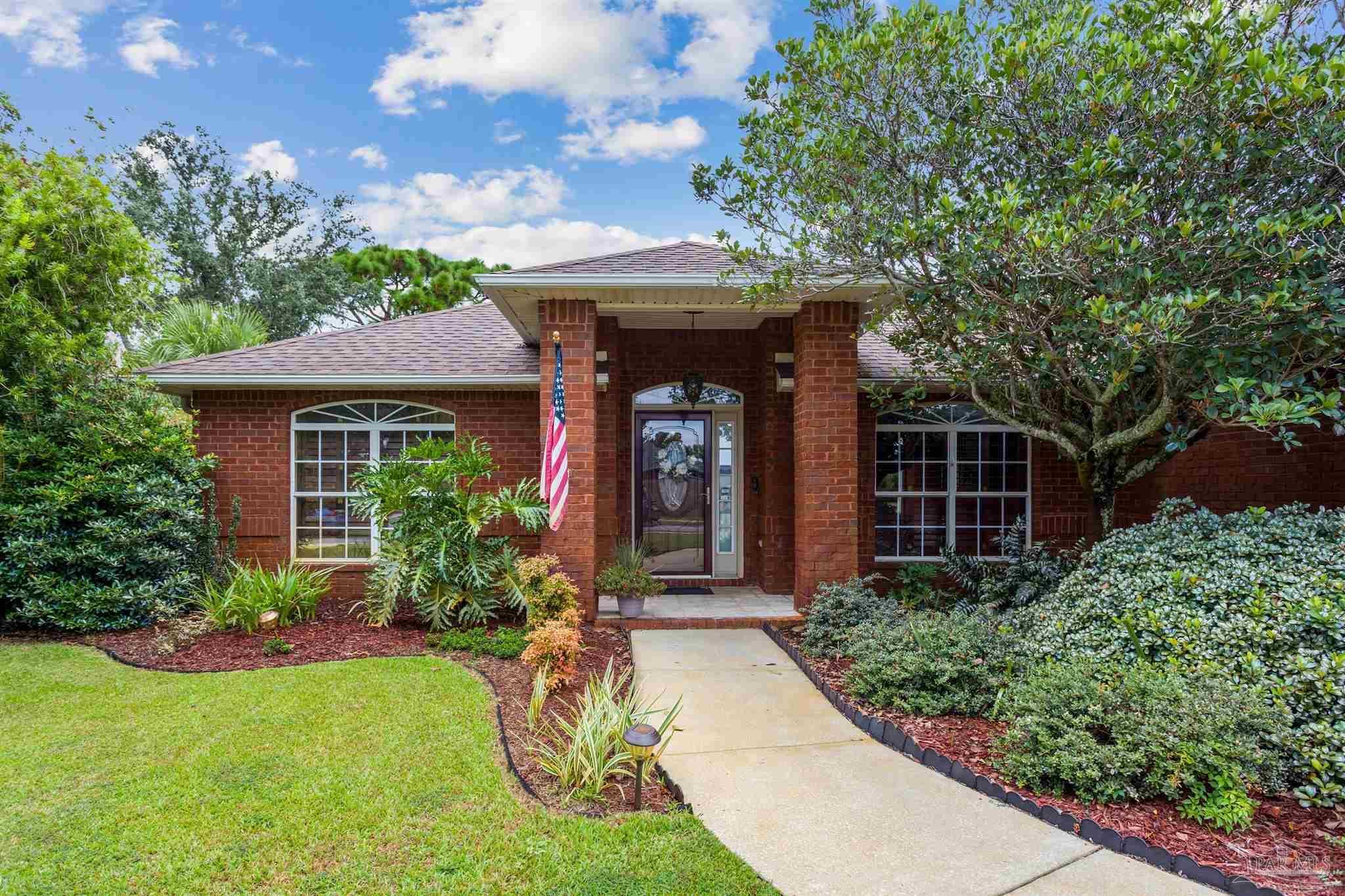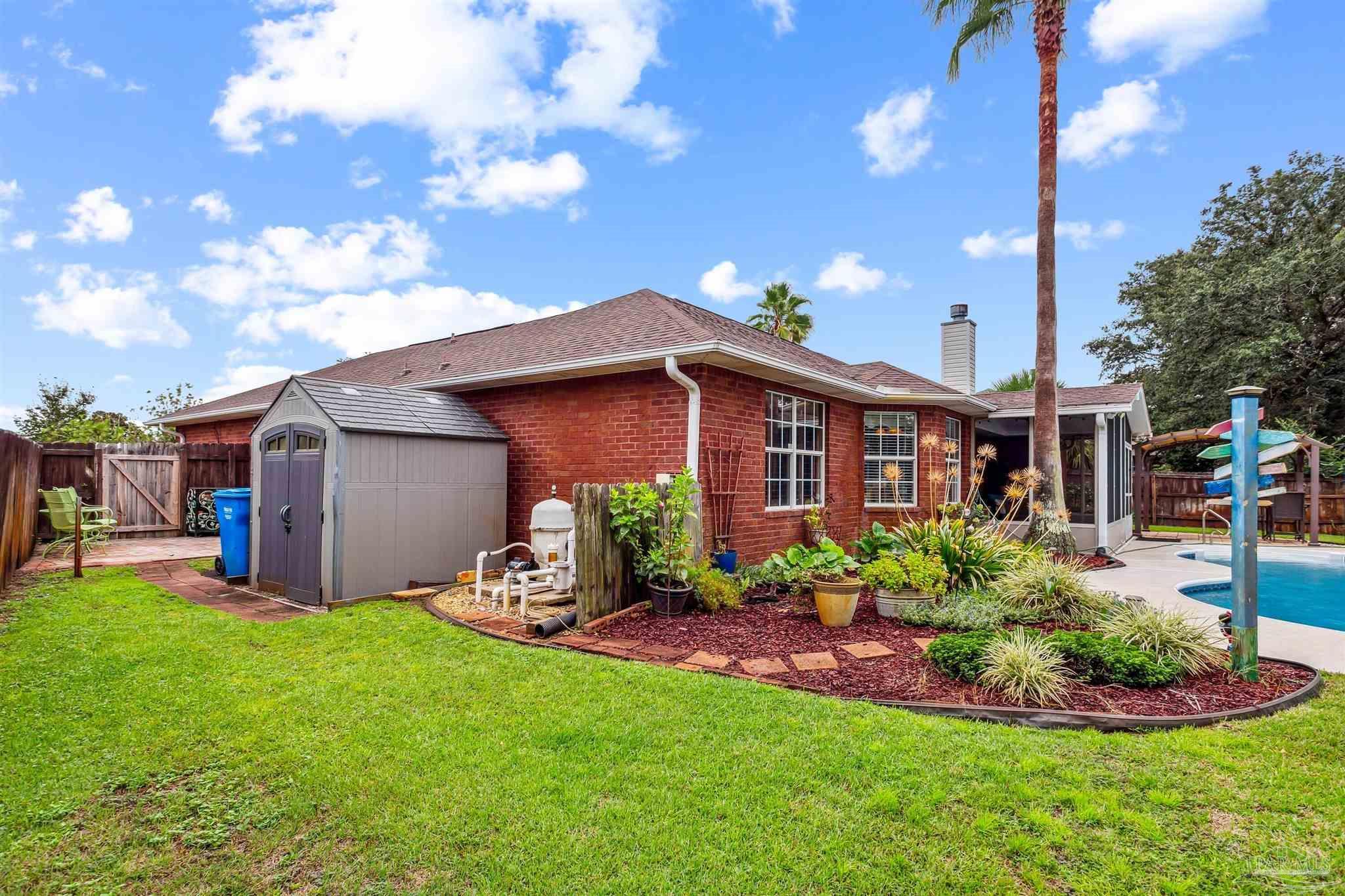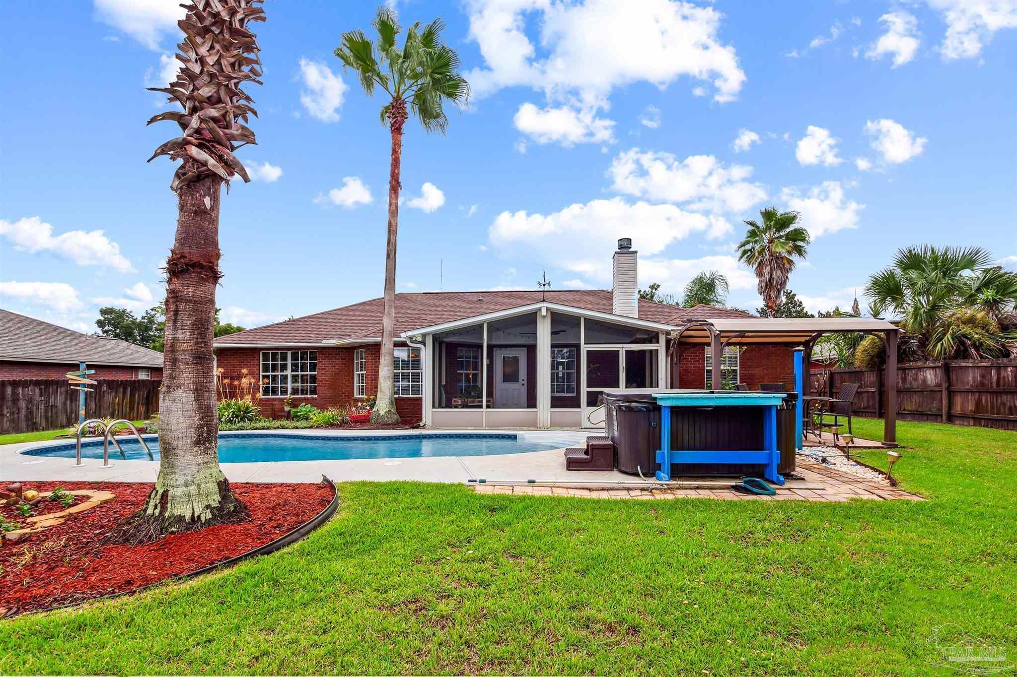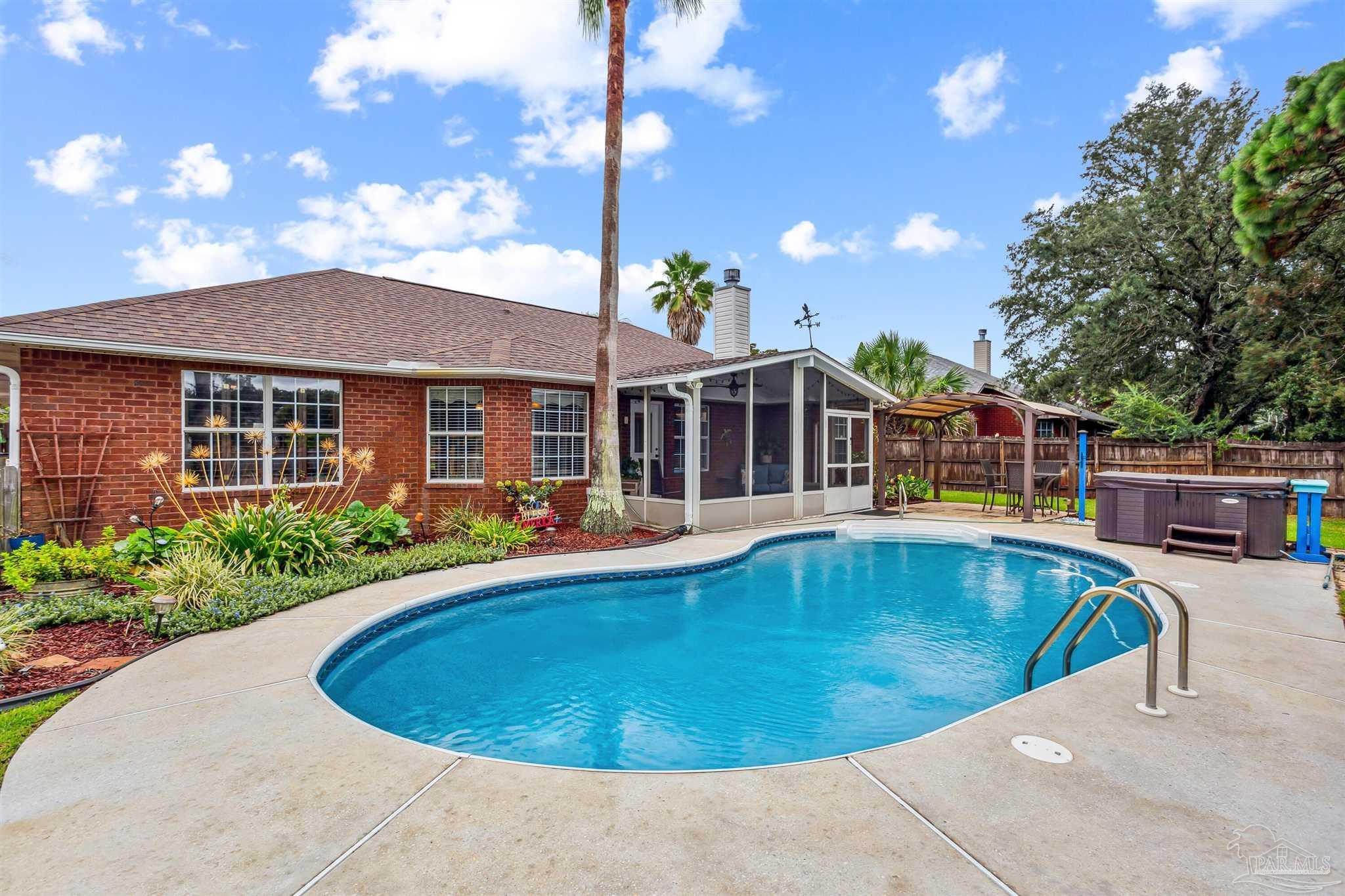 Discover this 3-bedroom, 2-full-bath, pool home in Gulf Breeze! This all brick home features a split bedroom floor plan with the master bedroom suite located off of the kitchen and the other two bedrooms located at the front of the house. The family room includes a wood-burning fireplace and vaulted ceilings and the kitchen has stainless steel appliances, granite countertops, ample cabinetry, an eat-in dining area and brand new french door refrigerator. Additional spaces include a laundry room and office/flex room. The home has cozy new carpet, fresh paint and plantation shutters throughout. Step outside to the fully fenced backyard with a storage shed, pool, hot tub, pergola-shaded patio, beautiful landscaping, a well water sprinkler system and rain gutters. A screened covered porch adds outdoor living space. Pool updates include a new pump (January 2025), new liner (August 2024), new auxiliary pump (2023), and Polaris vacuum (2023). Other notables: water heater and roof (2018), and annual HVAC servicing. The Melissa Oaks neighborhood has sidewalks and street lights, is close to Navarre and Pensacola Beach, shopping, restaurants, and Hurlburt Field. Don't miss your chance to own this adorable home!