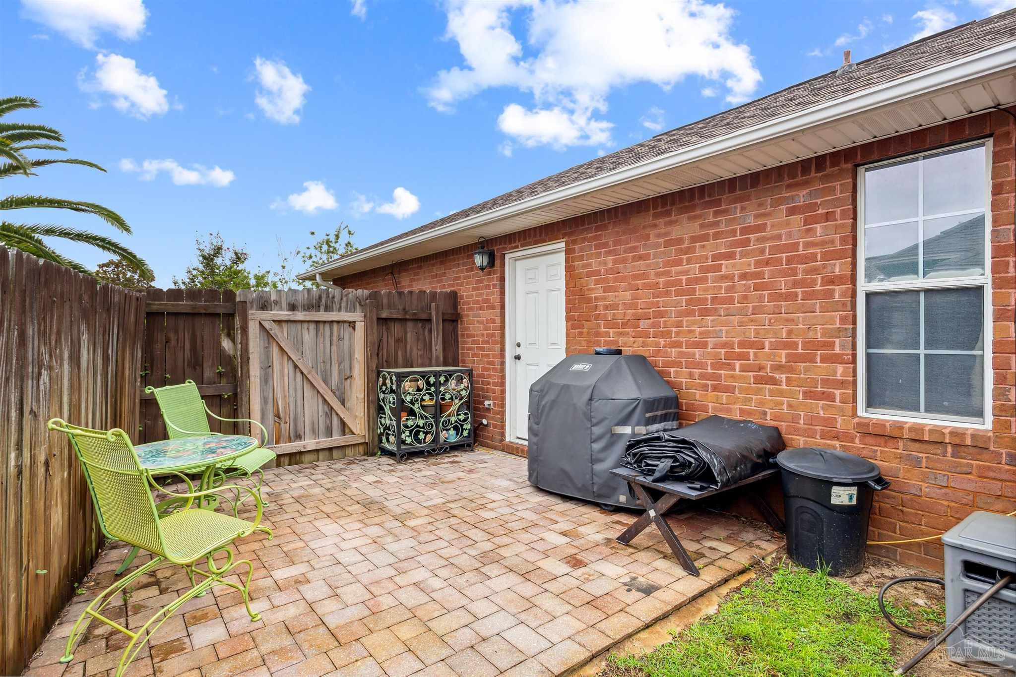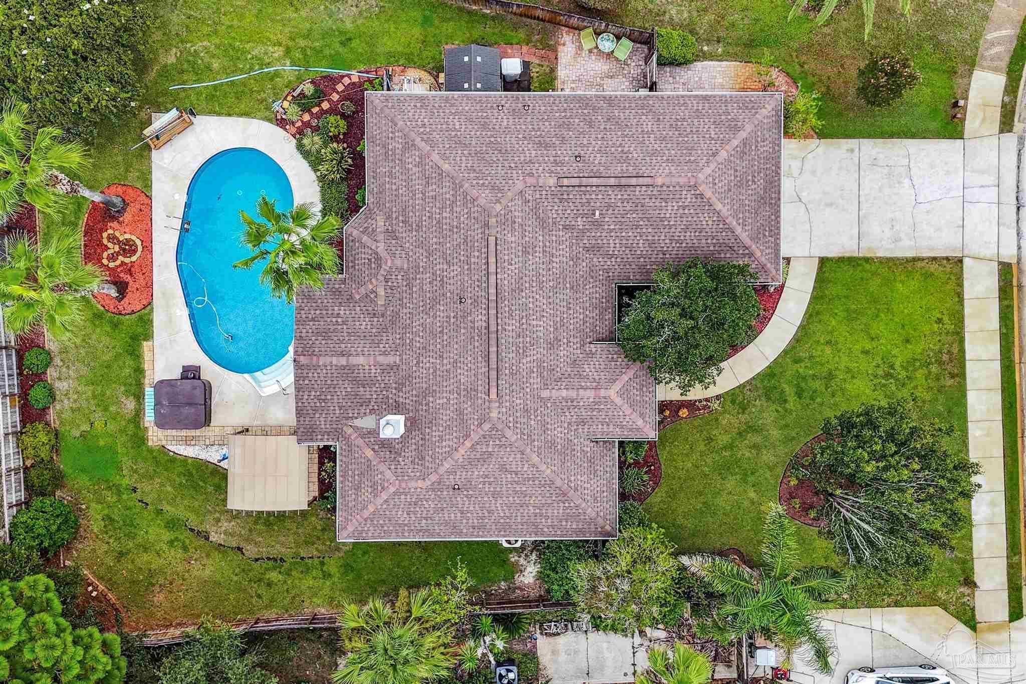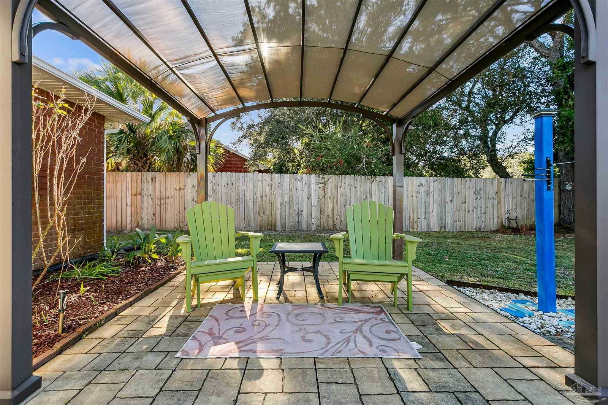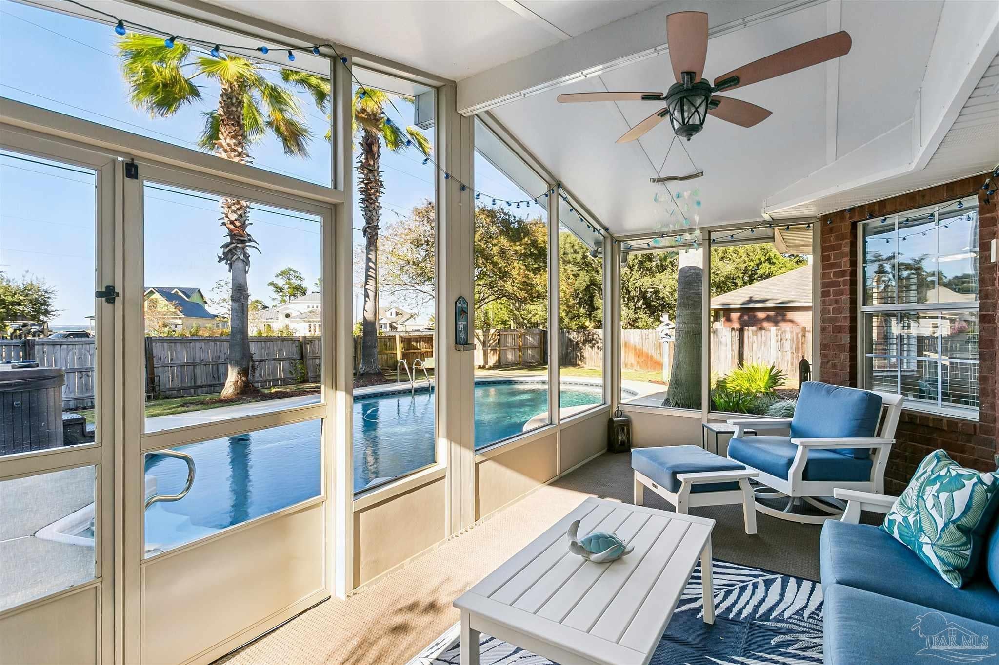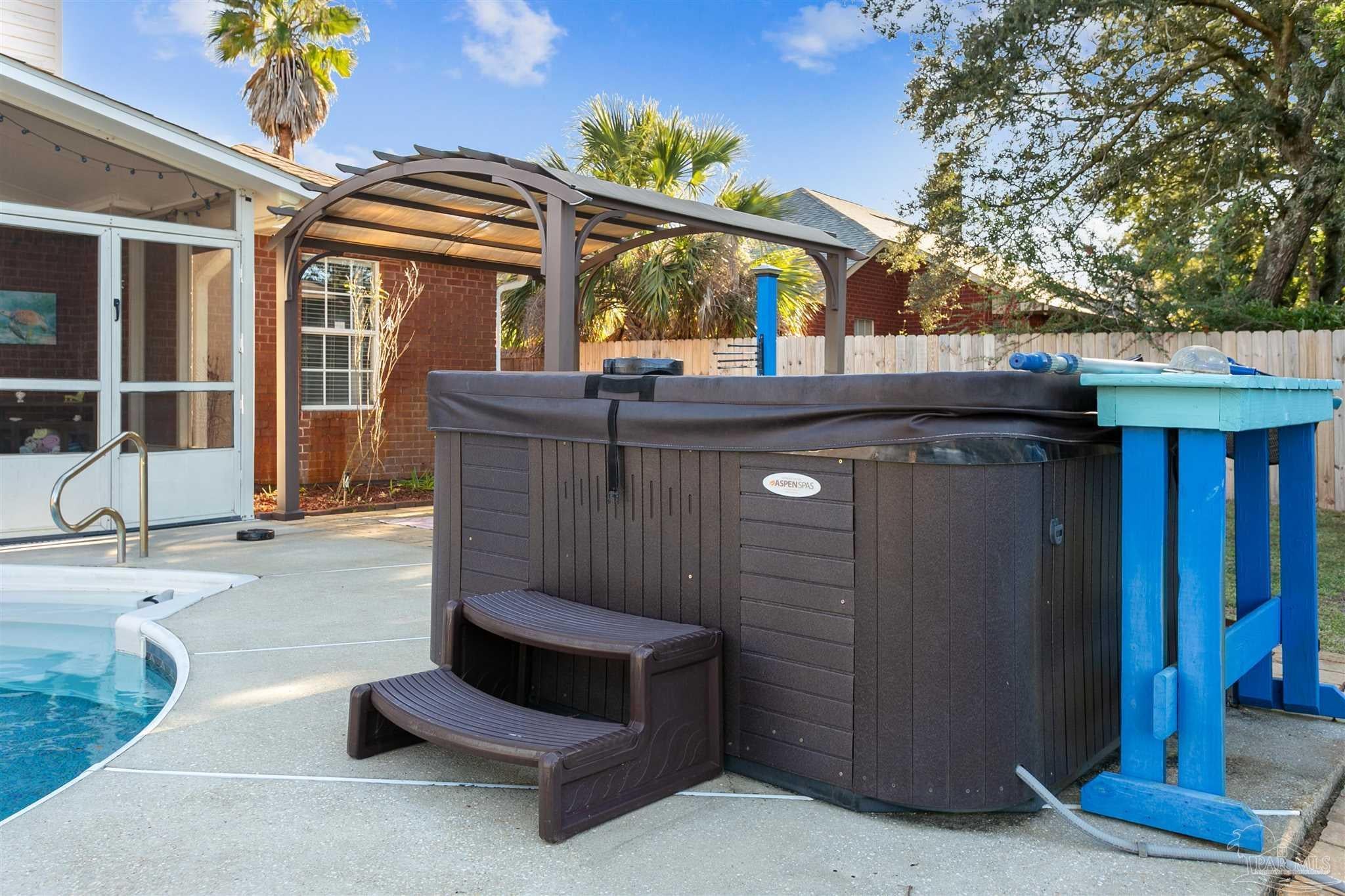 Discover this 3-bedroom, 2-full-bath, pool home in Gulf Breeze! This all brick home features a split bedroom floor plan with the master bedroom suite located off of the kitchen and the other two bedrooms located at the front of the house. The family room includes a wood-burning fireplace and vaulted ceilings and the kitchen has stainless steel appliances, granite countertops, ample cabinetry, an eat-in dining area and brand new french door refrigerator. Additional spaces include a laundry room and office/flex room. The home has cozy new carpet, fresh paint and plantation shutters throughout. Step outside to the fully fenced backyard with a storage shed, pool, hot tub, pergola-shaded patio, beautiful landscaping, a well water sprinkler system and rain gutters. A screened covered porch adds outdoor living space. Pool updates include a new pump (January 2025), new liner (August 2024), new auxiliary pump (2023), and Polaris vacuum (2023). Other notables: water heater and roof (2018), and annual HVAC servicing. The Melissa Oaks neighborhood has sidewalks and street lights, is close to Navarre and Pensacola Beach, shopping, restaurants, and Hurlburt Field. Don't miss your chance to own this adorable home!