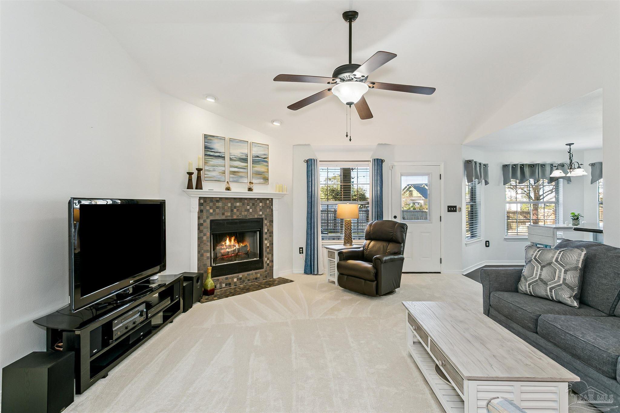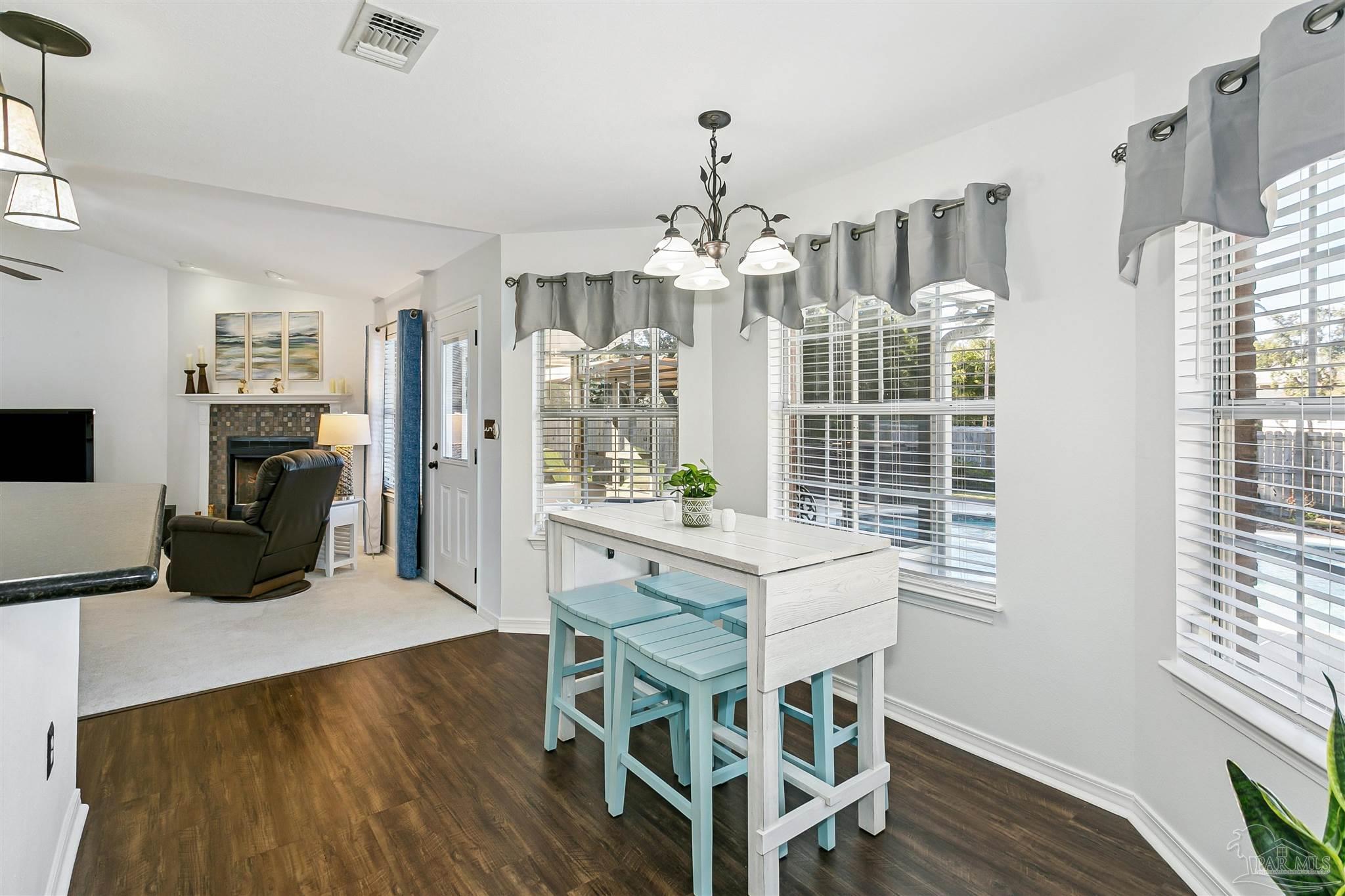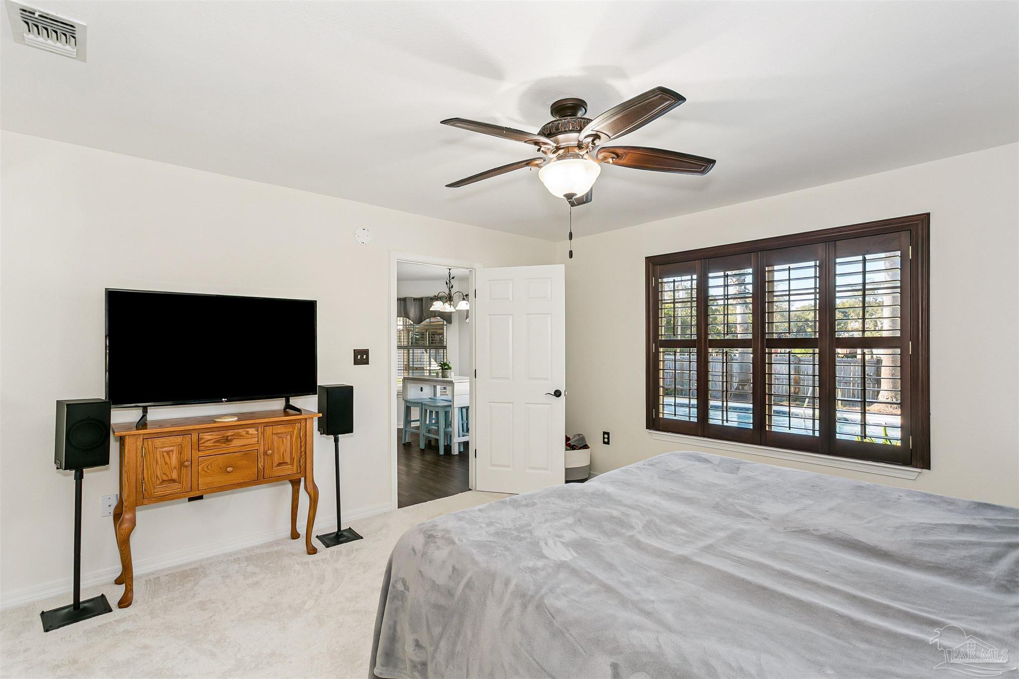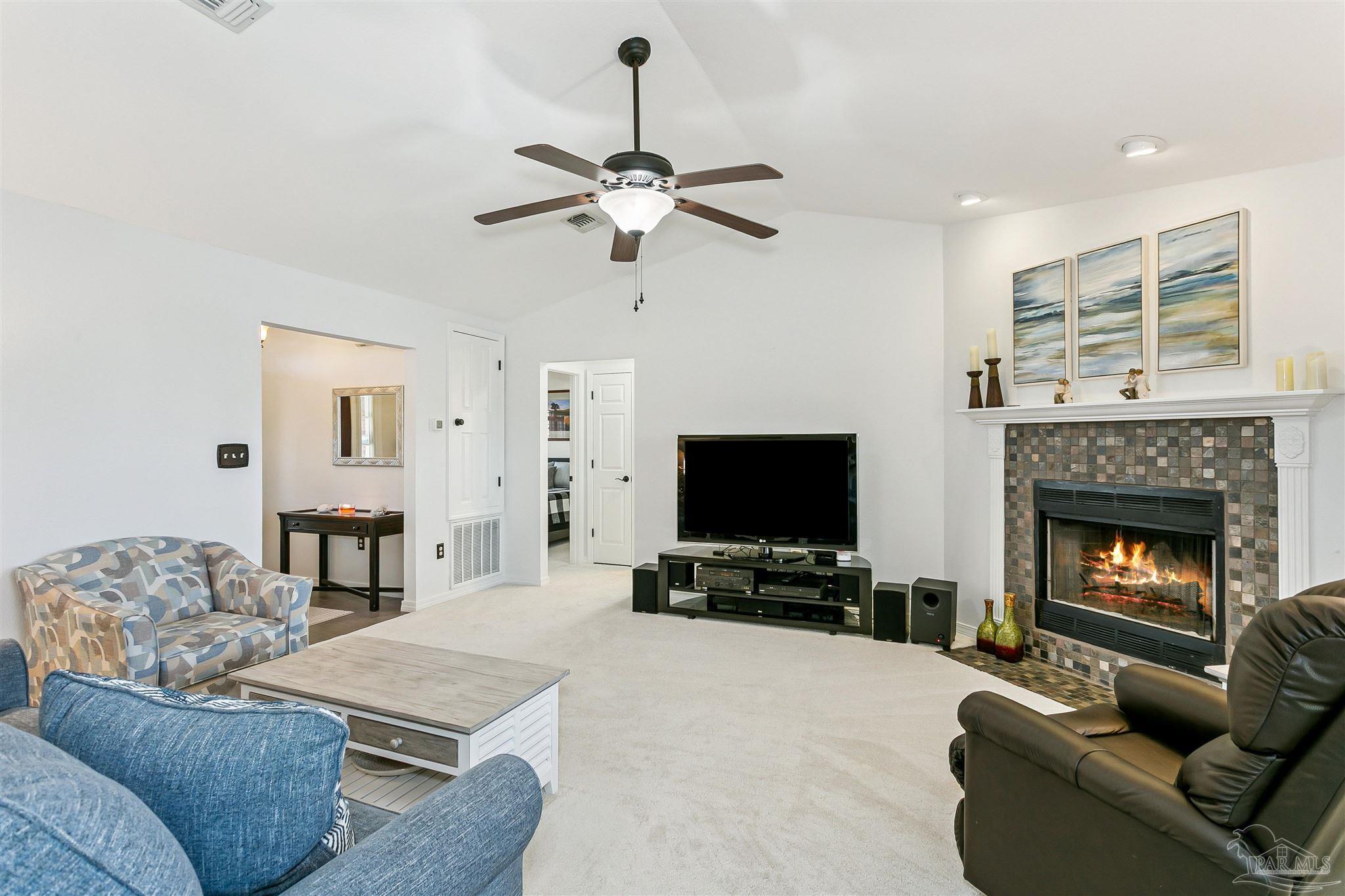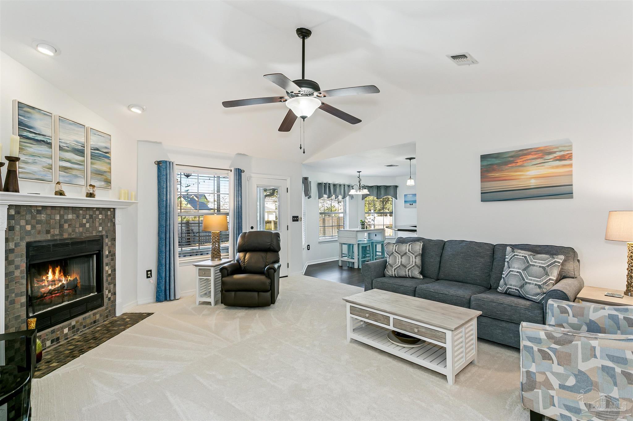 Discover this 3-bedroom, 2-full-bath, pool home in Gulf Breeze! This all brick home features a split bedroom floor plan with the master bedroom suite located off of the kitchen and the other two bedrooms located at the front of the house. The family room includes a wood-burning fireplace and vaulted ceilings and the kitchen has stainless steel appliances, granite countertops, ample cabinetry, an eat-in dining area and brand new french door refrigerator. Additional spaces include a laundry room and office/flex room. The home has cozy new carpet, fresh paint and plantation shutters throughout. Step outside to the fully fenced backyard with a storage shed, pool, hot tub, pergola-shaded patio, beautiful landscaping, a well water sprinkler system and rain gutters. A screened covered porch adds outdoor living space. Pool updates include a new pump (January 2025), new liner (August 2024), new auxiliary pump (2023), and Polaris vacuum (2023). Other notables: water heater and roof (2018), and annual HVAC servicing. The Melissa Oaks neighborhood has sidewalks and street lights, is close to Navarre and Pensacola Beach, shopping, restaurants, and Hurlburt Field. Don't miss your chance to own this adorable home!