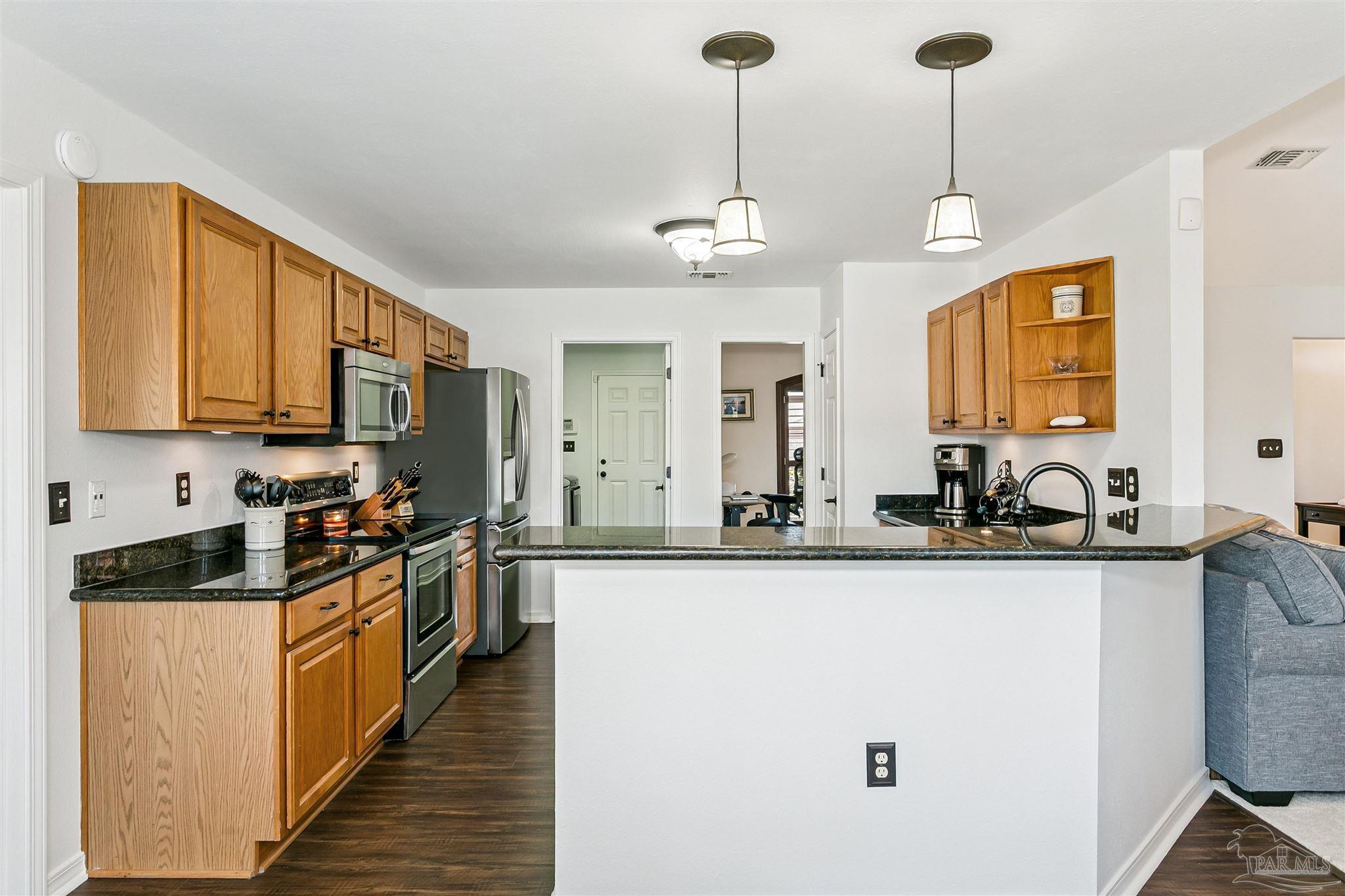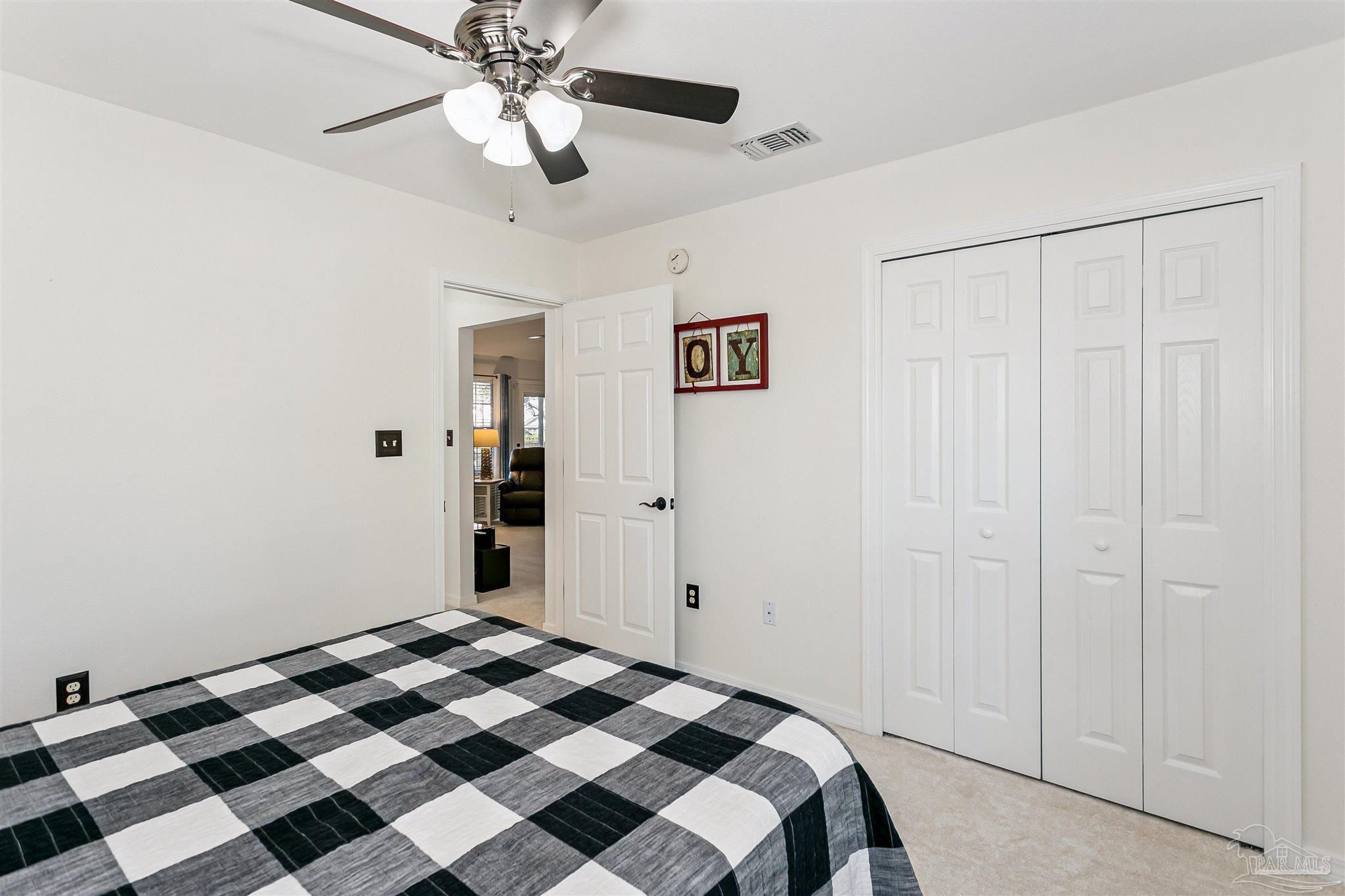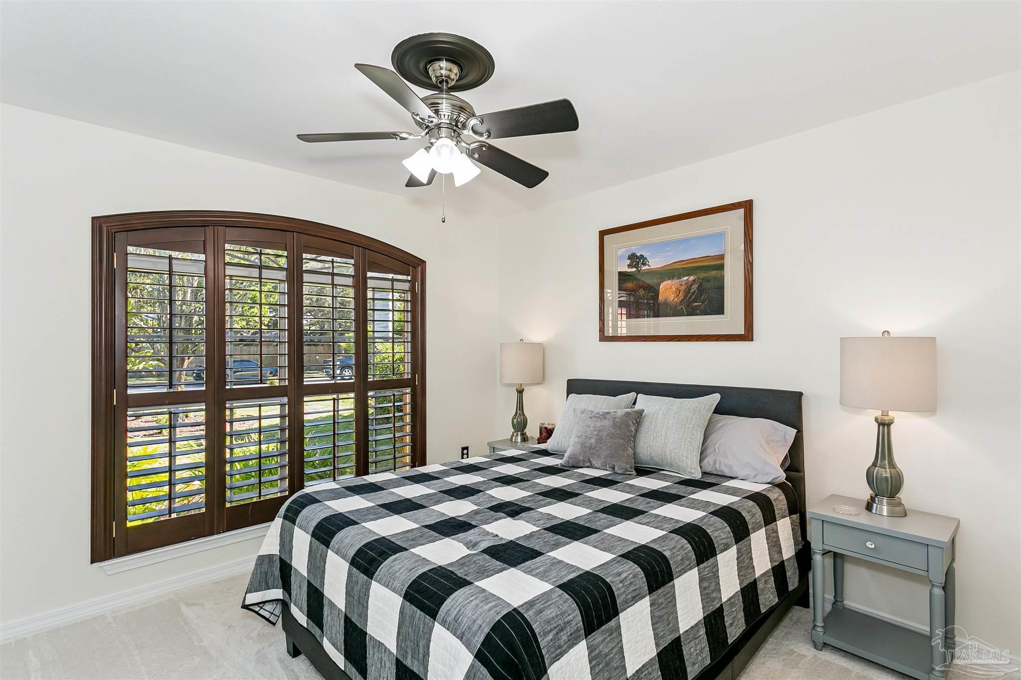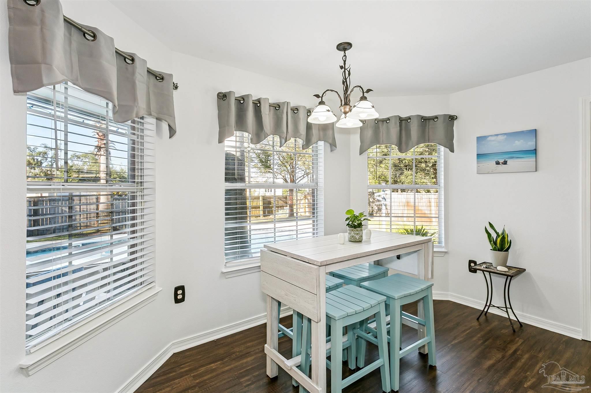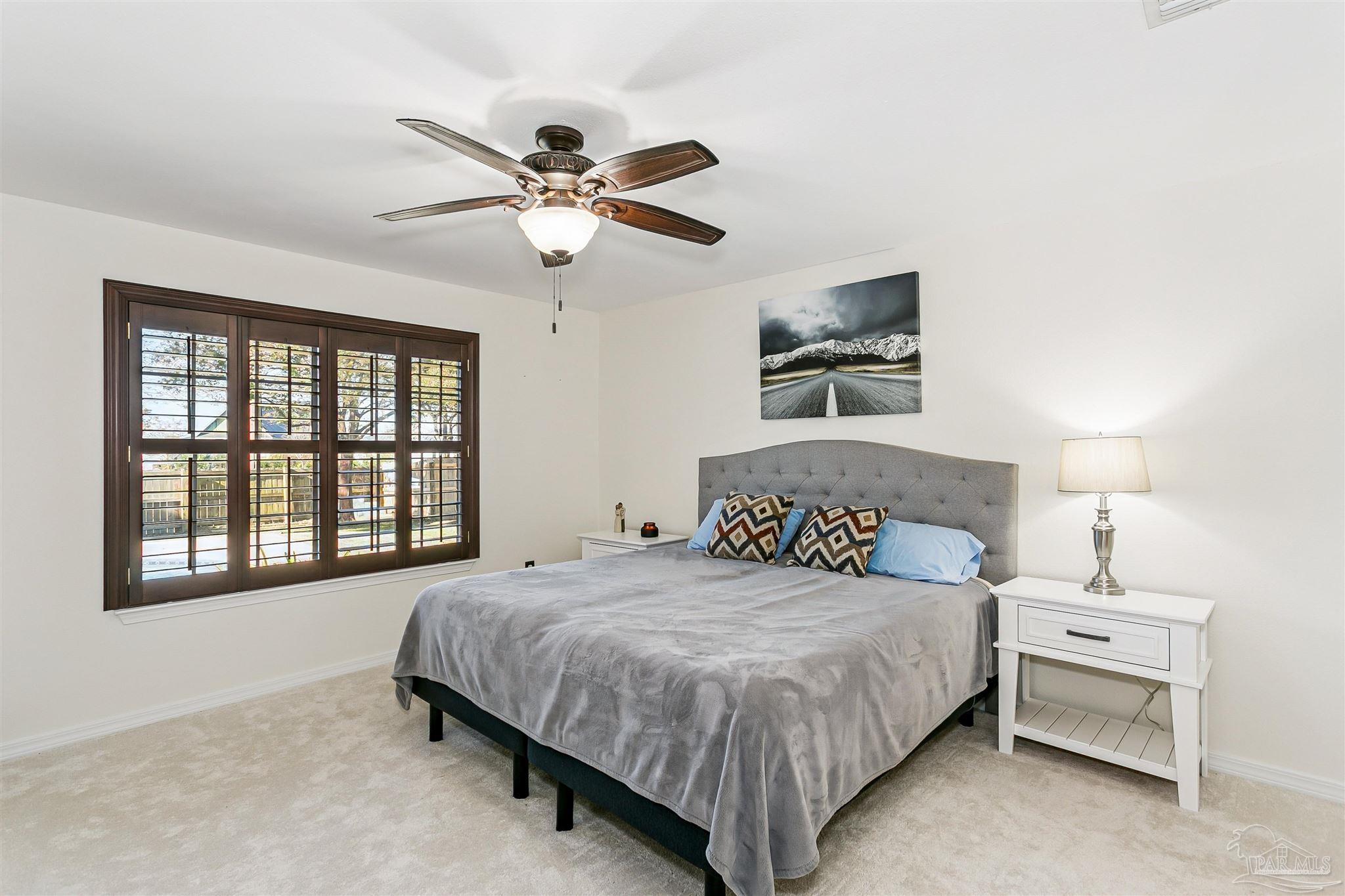 Discover this 3-bedroom, 2-full-bath, pool home in Gulf Breeze! This all brick home features a split bedroom floor plan with the master bedroom suite located off of the kitchen and the other two bedrooms located at the front of the house. The family room includes a wood-burning fireplace and vaulted ceilings and the kitchen has stainless steel appliances, granite countertops, ample cabinetry, an eat-in dining area and brand new french door refrigerator. Additional spaces include a laundry room and office/flex room. The home has cozy new carpet, fresh paint and plantation shutters throughout. Step outside to the fully fenced backyard with a storage shed, pool, hot tub, pergola-shaded patio, beautiful landscaping, a well water sprinkler system and rain gutters. A screened covered porch adds outdoor living space. Pool updates include a new pump (January 2025), new liner (August 2024), new auxiliary pump (2023), and Polaris vacuum (2023). Other notables: water heater and roof (2018), and annual HVAC servicing. The Melissa Oaks neighborhood has sidewalks and street lights, is close to Navarre and Pensacola Beach, shopping, restaurants, and Hurlburt Field. Don't miss your chance to own this adorable home!