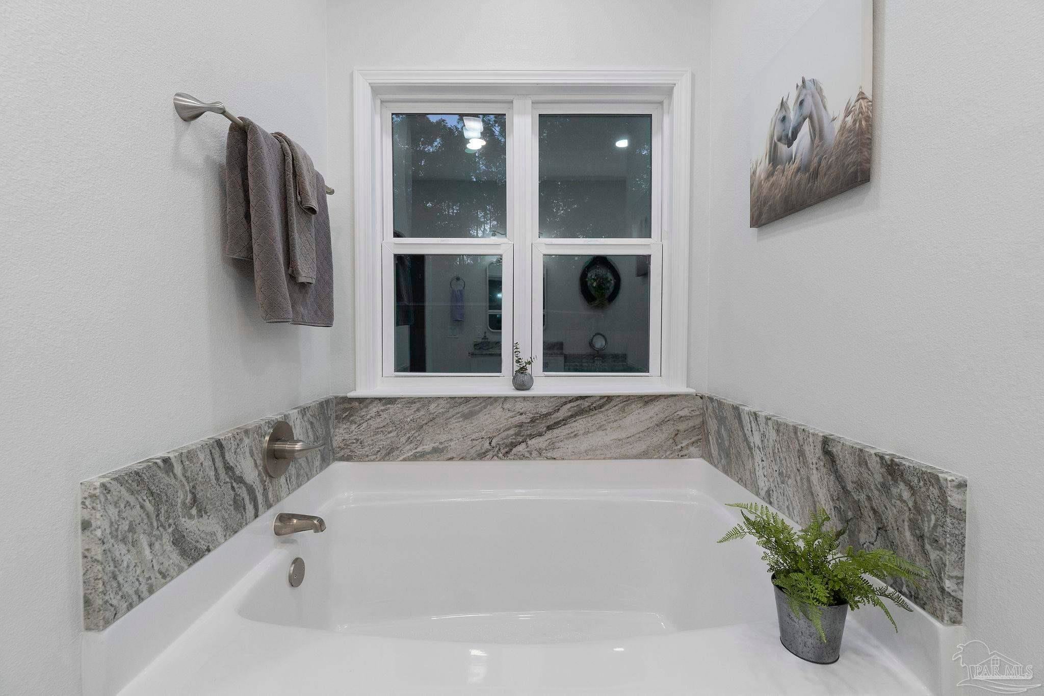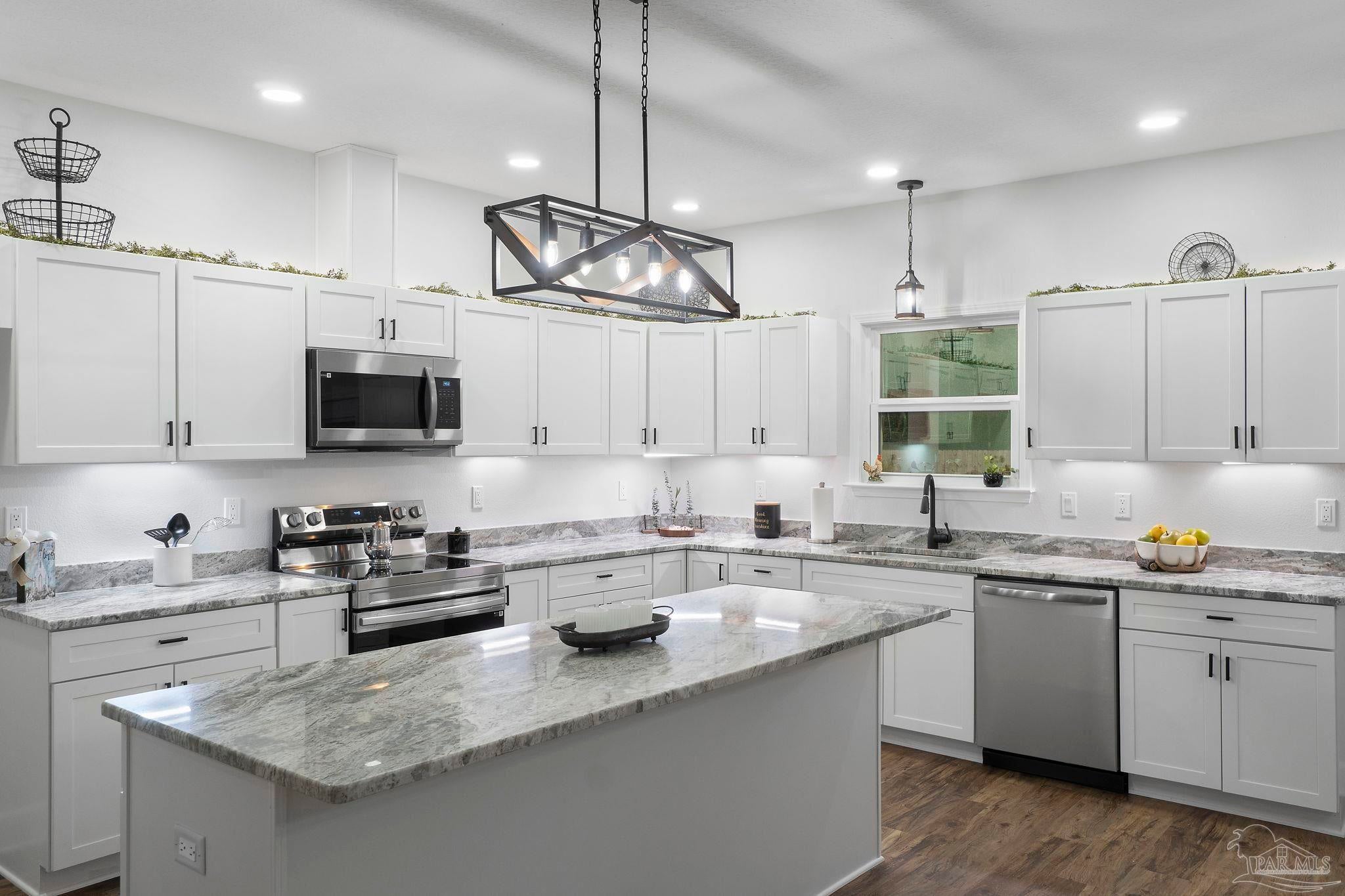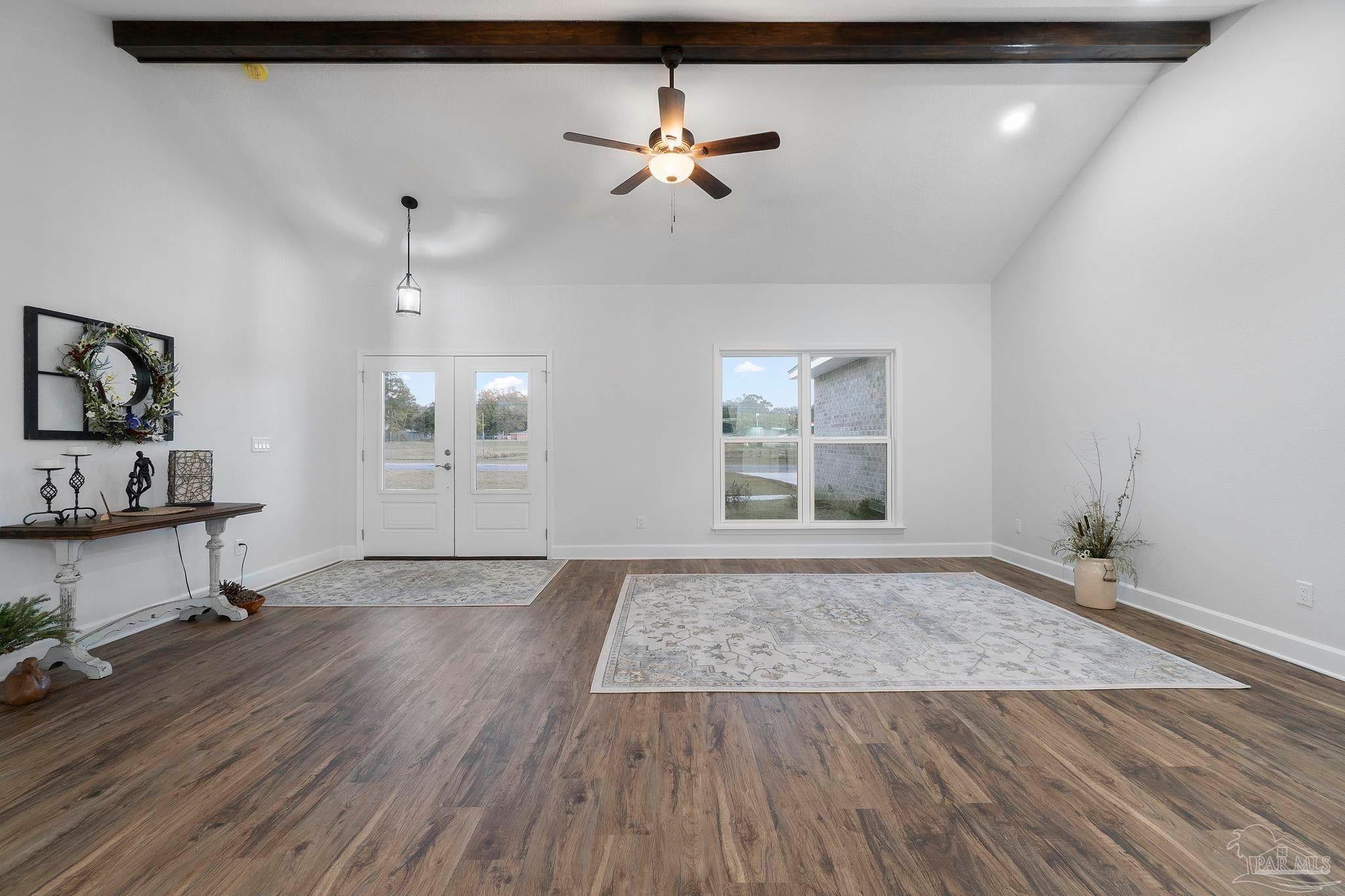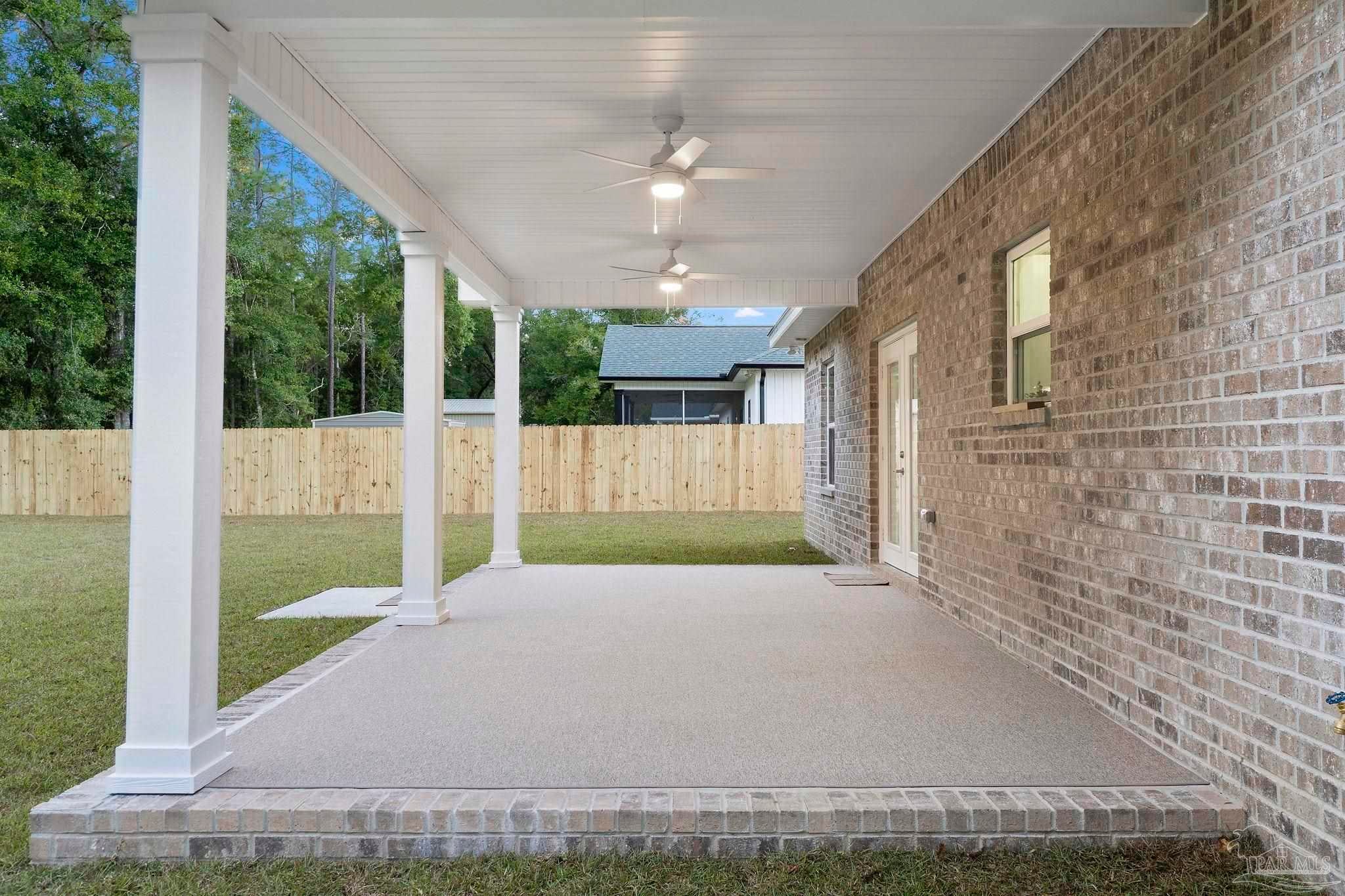 Welcome to this beautifully designed new construction brick home located in the heart of Milton. This 3-bedroom, 2-bathroom residence combines modern aesthetics with practical living spaces, making it a perfect fit for families or individuals seeking comfort in a serene environment. As you approach the property, you will appreciate the stylish brick exterior and inviting curb appeal. The home features an attached two-car garage, which is equipped with pull-down stairs leading to a spacious attic. This attic, complete with a ceiling fan, offers potential for conversion into a bonus room, enhancing the usable space of the home. Upon entering, you will be greeted by a thoughtfully designed split floor plan. The main bedroom suite boasts an ensuite bathroom that is a true retreat. Enjoy the luxury of a double vanity, complemented by elegant granite countertops, a separate shower, and a relaxing garden tub. A walk-in closet and a water closet provide ideal privacy and storage. The living area is accentuated by vaulted ceilings with decorative beams, contributing to a sense of spaciousness. Throughout the home, wood-look LVP flooring adds warmth and durability, seamlessly connecting the various living spaces. The kitchen is a stand-out feature, showcasing ample soft close cabinetry and modern appliances. Its open-concept design flows into a dining area, ideal for gatherings or quiet meals. Large windows illuminate the interior, allowing natural light to enhance the welcoming atmosphere. Stepping outside, the back covered patio features a ceiling fan for comfort during outdoor relaxation, while the generous yard space offers possibilities for landscaping, gardening, or play areas. This property exemplifies quality craftsmanship and modern living, making it a must-see for anyone seeking a new home in an sought-after location.