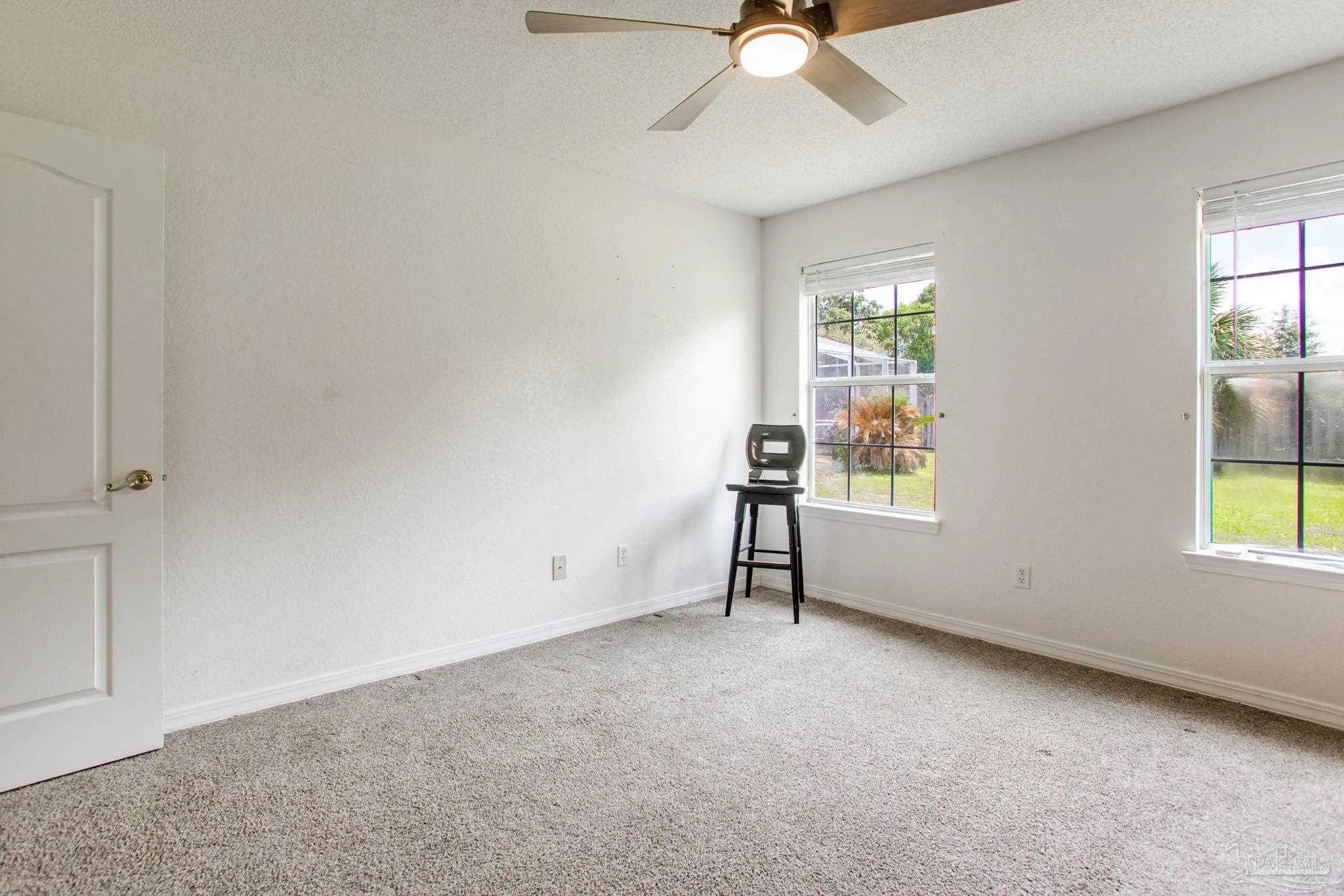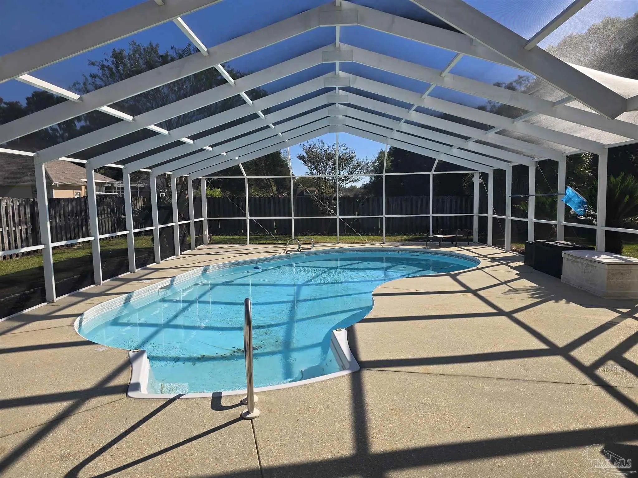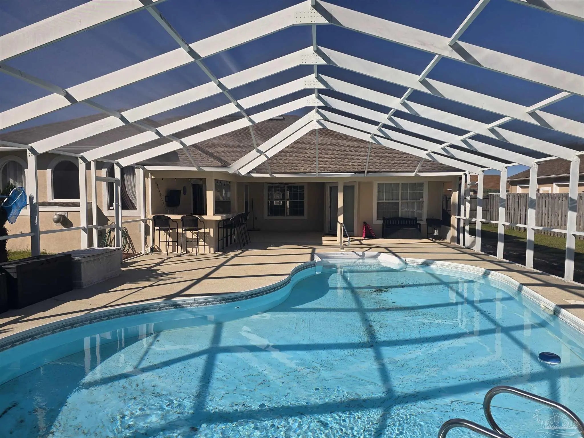 Energy-Efficient Pool Home in the Creekwood subdivision! Welcome to 8042 Mossy Creek, a beautifully maintained 3-bedroom, 2-bath home with an office tucked away in the desirable Creekwood subdivision in Northwest Pensacola. At the front of the home sits the office which can be used as a 4th bedroom if needed. This home blends modern finishes, luxurious outdoor living, and year-round energy efficiency thanks to fully paid for solar panels, keeping your power bill at or near zero. Interior Features include wood-look plank tile flooring throughout main living areas—durable, stylish, and low-maintenance. The kitchen features stainless steel appliances, gas stove, sleek granite counters, large breakfast bar and pantry. The master suite has a spacious en-suite bath with double vanities and a walk-in closet. Elegant tray ceiling. And private access to the pool area which bring in plenty of natural light. The open concept layout with high ceilings, gas fireplace, and large windows for natural light make this property feel like a home. If the inside isn't impressive enough, check out the outside! In-ground saltwater pool with screened enclosure, perfect for year-round enjoyment. Covered lanai with outdoor bar and lounging space. Fully fenced backyard with room to entertain or let pets roam freely. 3-car garage with RV parking pad, generator transfer switch, and attic storage. No need to worry about $400 to $600 power bills with this efficient home. Schedule your showing today to see it for yourself!