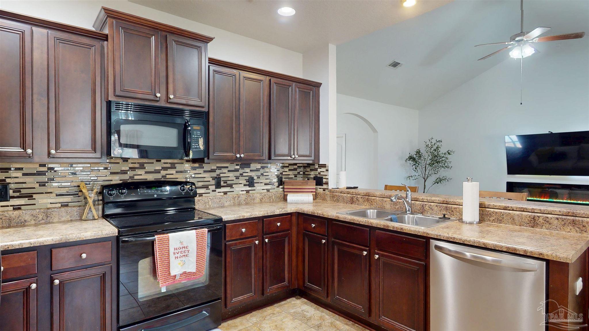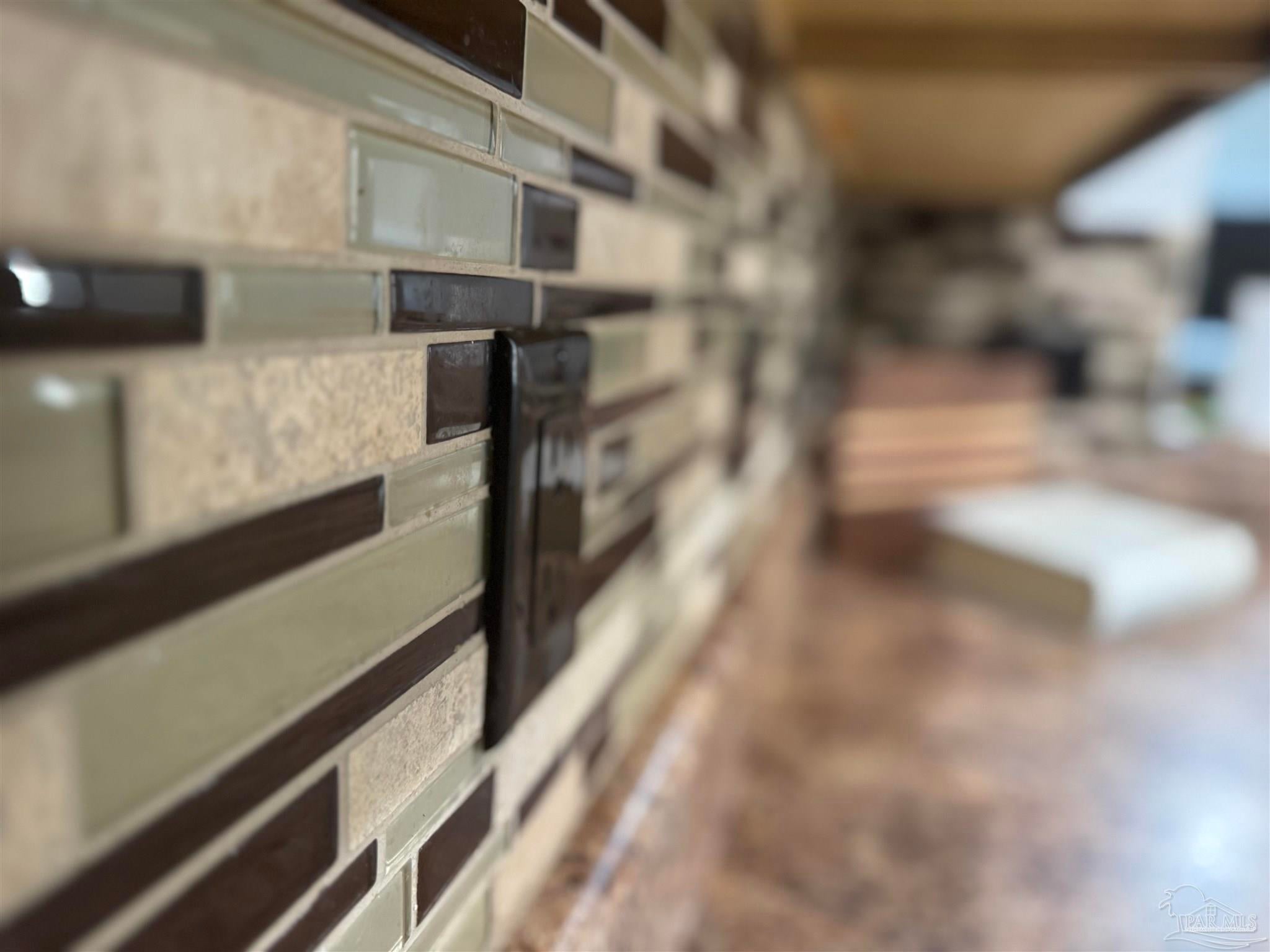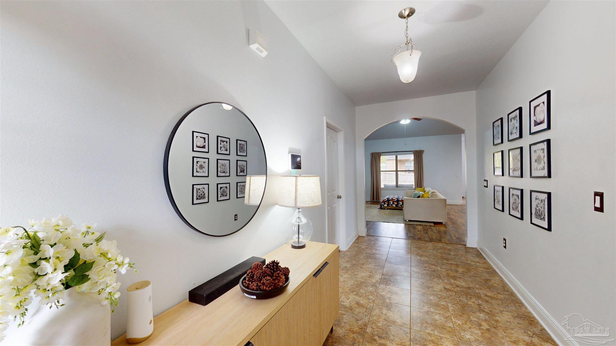 Welcome Home to this gorgeous all brick home in Rustic Ridge! This spacious split plan has ceiling heights from 9' - 13' giving a wonderful open feel! The living room features a vaulted ceiling and newly installed custom electric fireplace for those cozy nights. It is open to the kitchen, complete with hop up bar and dining area. Step into the kitchen & notice the staggered Espresso cabinets with crown molding, brushed nickle pulls and a modern glass tile backsplash! It is a chef's dream with the deep stainless steel double sink with retractable faucet & disposal, large pantry, and lots of recessed lighting. The dining area is spacious and will accommodate a large table & buffet. Step into the spacious main suite at the back of the home & enjoy a large walk-in closet and sitting area. Double windows provide lots of natural light to this space! The master bathroom features a comfort height double vanity, separate shower, garden tub, linen closet and tile flooring. The 2 additional bedrooms are at the front of the home, with the second bath also on this side of the home. Additional features include a 10 X 15 covered lanai, 6' privacy fence, and gutters. Rustic Ridge is just minutes to Whiting Field, medical facilities & major shopping. Short drive to beaches.