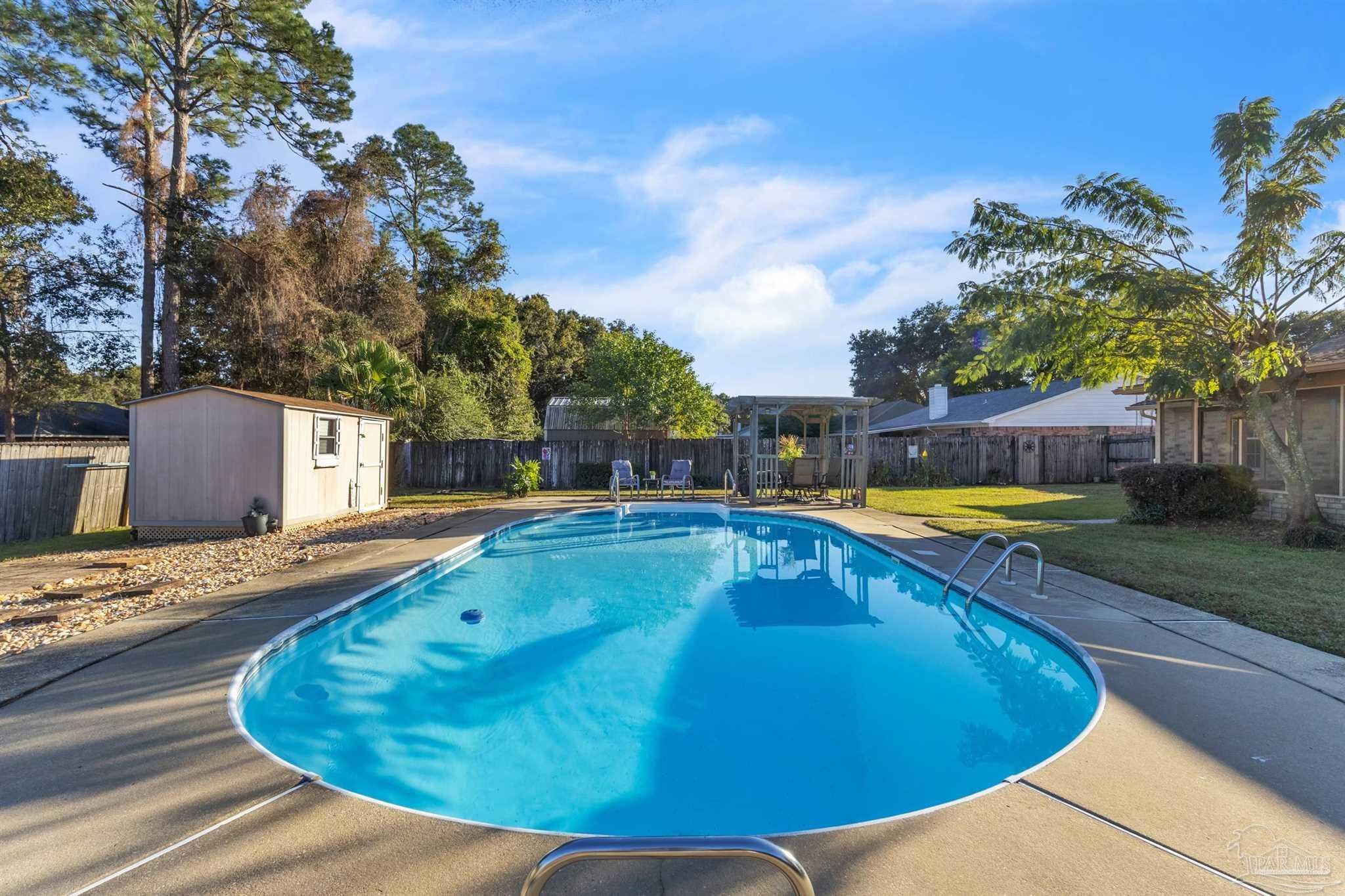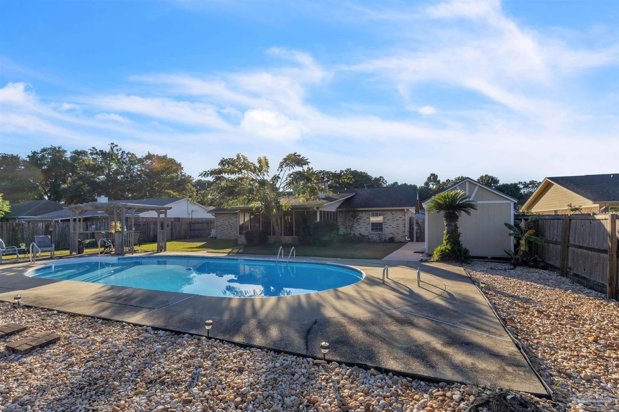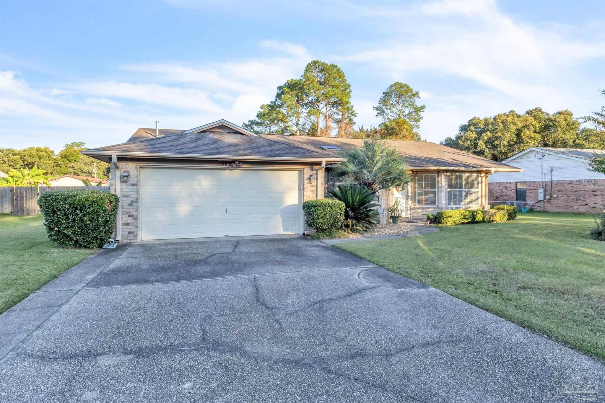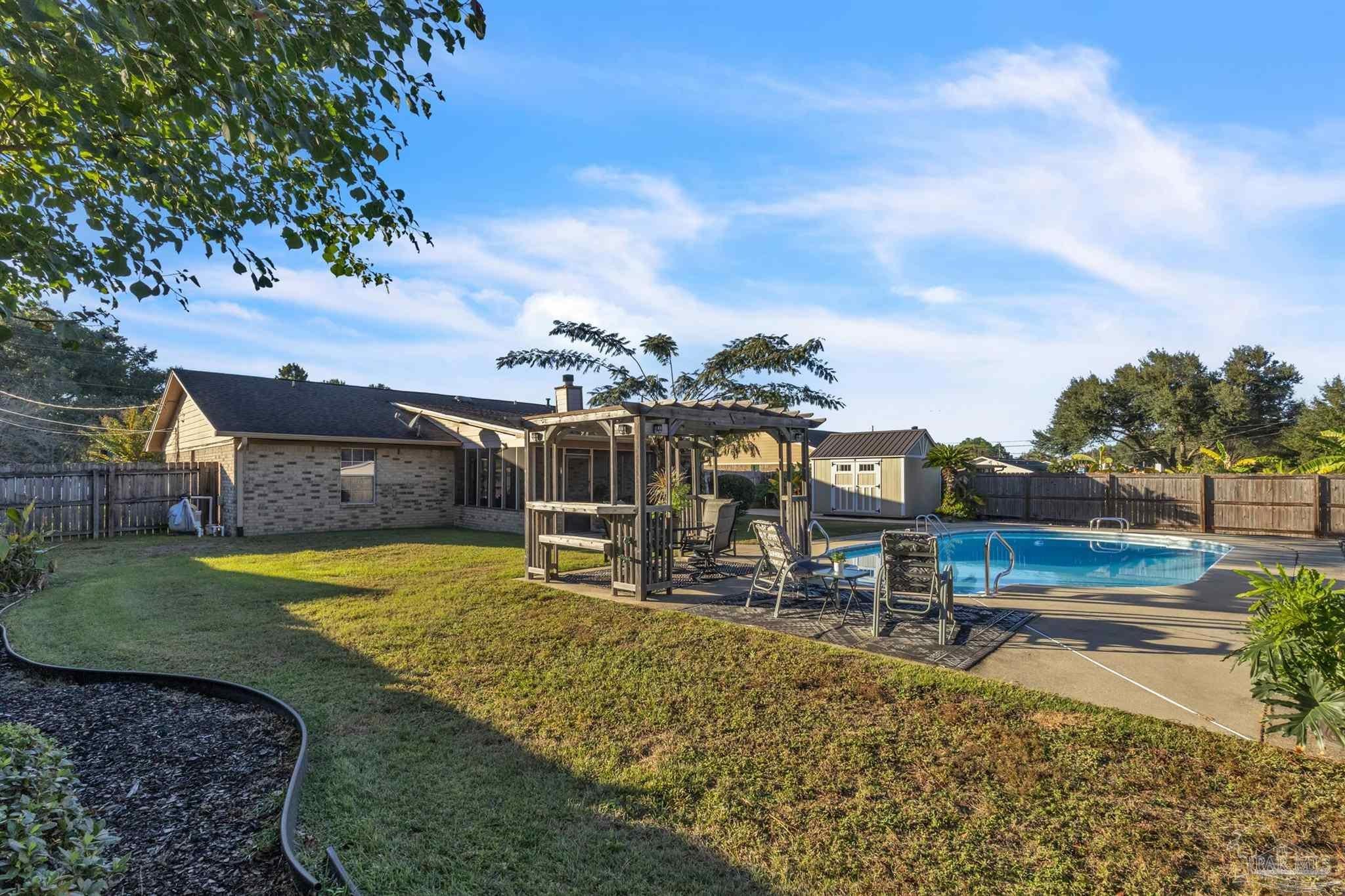 Pensacola Pool Home! This lovingly maintained and thoughtfully updated 3 BD / 2 BA w/ Flex Room sits on a 1/3 acre lot and offers 1,912 sq ft of comfortable living. The split floor plan features a spacious living room with fireplace and a formal dining area currently used as a cozy family room and will easily adapt as an office or playroom. The large primary bedroom with en-suite bath features 2 walk-in closets, a garden tub/shower, and dual vanity. The kitchen is a standout with its center island, abundant cabinetry, pantry, skylight, and eat-in area. Beautiful wood flooring runs through the main living spaces, LVP in guest rooms, and ceramic tile in all wet areas. The updated hall bath impresses with a fully tiled stand-up glass shower and quartz countertop. Step outside to enjoy your private backyard retreat complete with an in-ground pool, screened patio, pergola, pool shed, gutters, and extended RV/boat pad. Added peace of mind with Rebuild NW Florida hurricane upgrades (2014), Roof 2017, Water Heater 2018, energy efficient professionally spray-foamed attic, and termite bond through April 2026. Sold as-is and priced to sell, this one won’t last long! Move right in, make it your own, and start enjoying the Florida lifestyle today. Get it before someone else does! Agent is related to Seller.