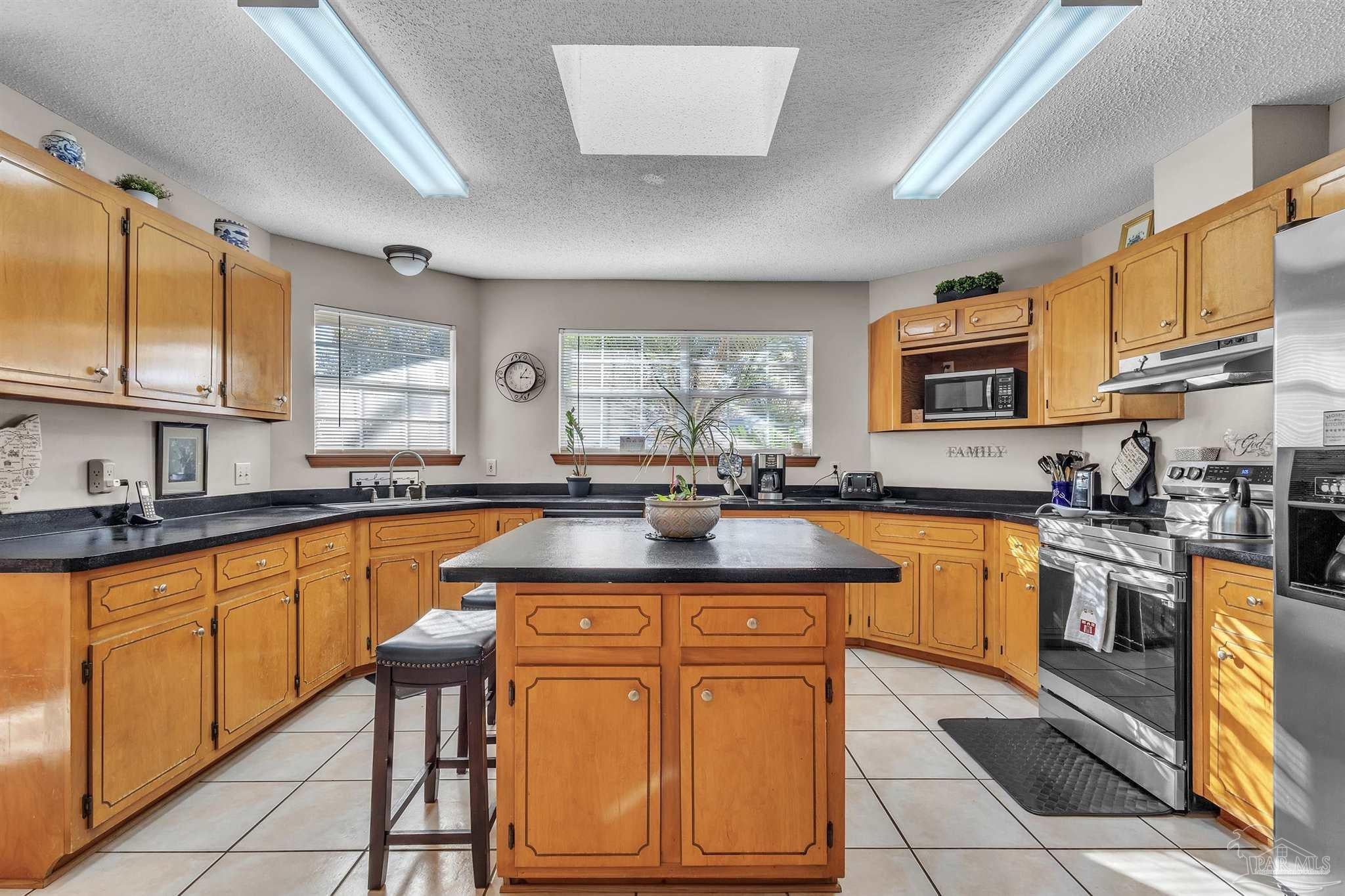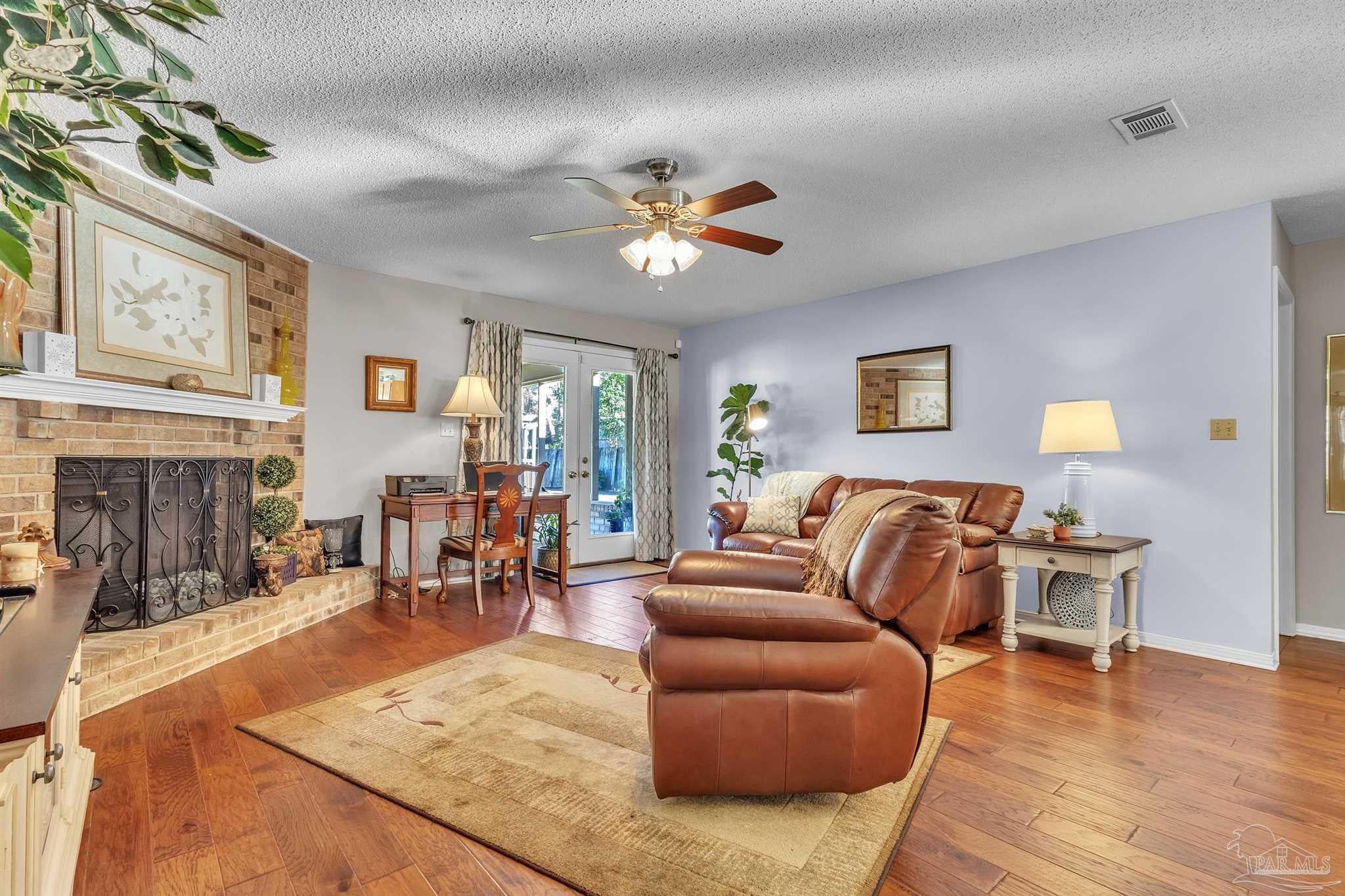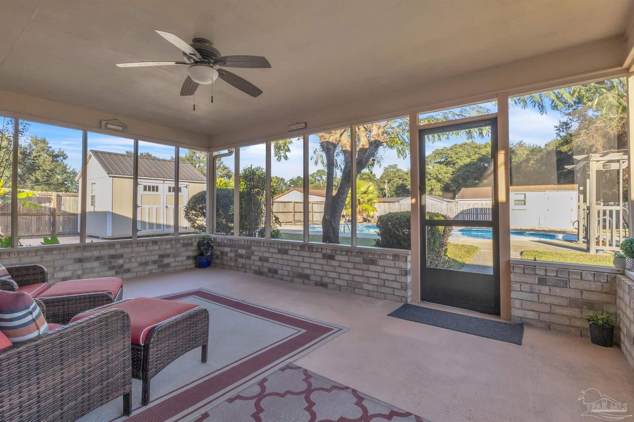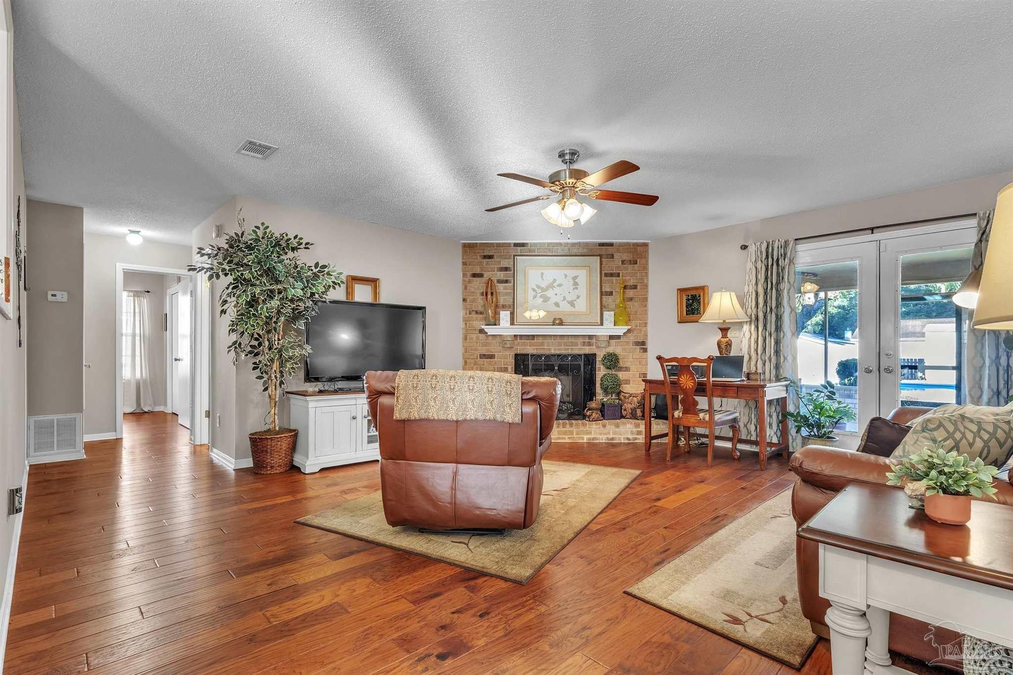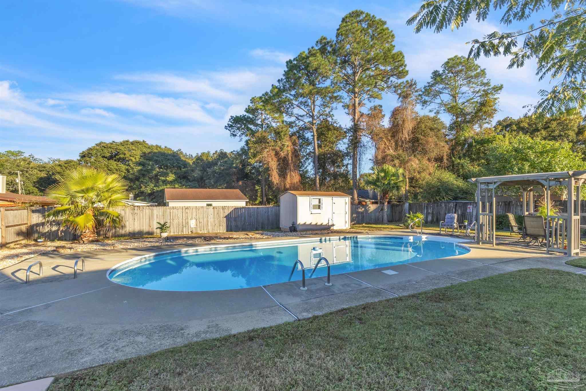 Pensacola Pool Home! This lovingly maintained and thoughtfully updated 3 BD / 2 BA w/ Flex Room sits on a 1/3 acre lot and offers 1,912 sq ft of comfortable living. The split floor plan features a spacious living room with fireplace and a formal dining area currently used as a cozy family room and will easily adapt as an office or playroom. The large primary bedroom with en-suite bath features 2 walk-in closets, a garden tub/shower, and dual vanity. The kitchen is a standout with its center island, abundant cabinetry, pantry, skylight, and eat-in area. Beautiful wood flooring runs through the main living spaces, LVP in guest rooms, and ceramic tile in all wet areas. The updated hall bath impresses with a fully tiled stand-up glass shower and quartz countertop. Step outside to enjoy your private backyard retreat complete with an in-ground pool, screened patio, pergola, pool shed, gutters, and extended RV/boat pad. Added peace of mind with Rebuild NW Florida hurricane upgrades (2014), Roof 2017, Water Heater 2018, energy efficient professionally spray-foamed attic, and termite bond through April 2026. Sold as-is and priced to sell, this one won’t last long! Move right in, make it your own, and start enjoying the Florida lifestyle today. Get it before someone else does! Agent is related to Seller.