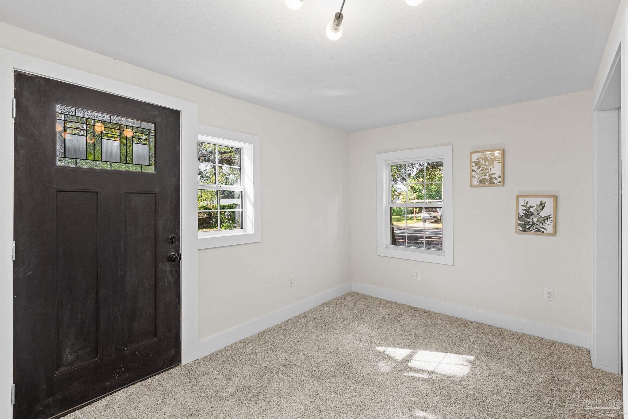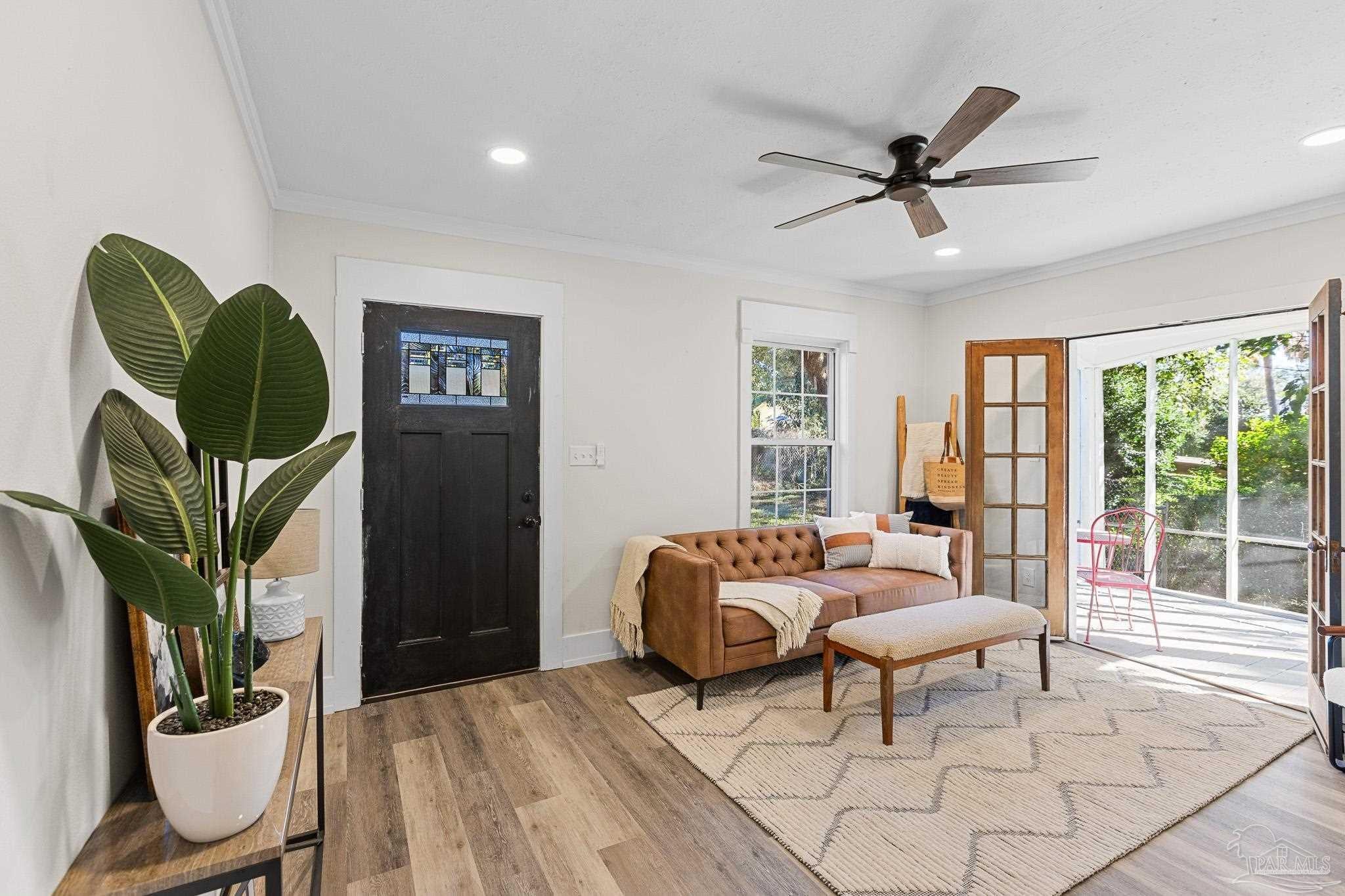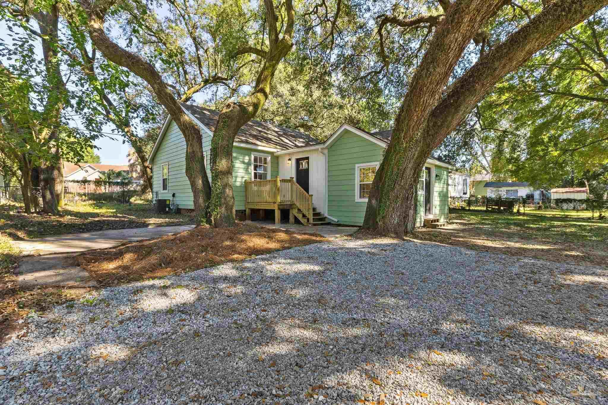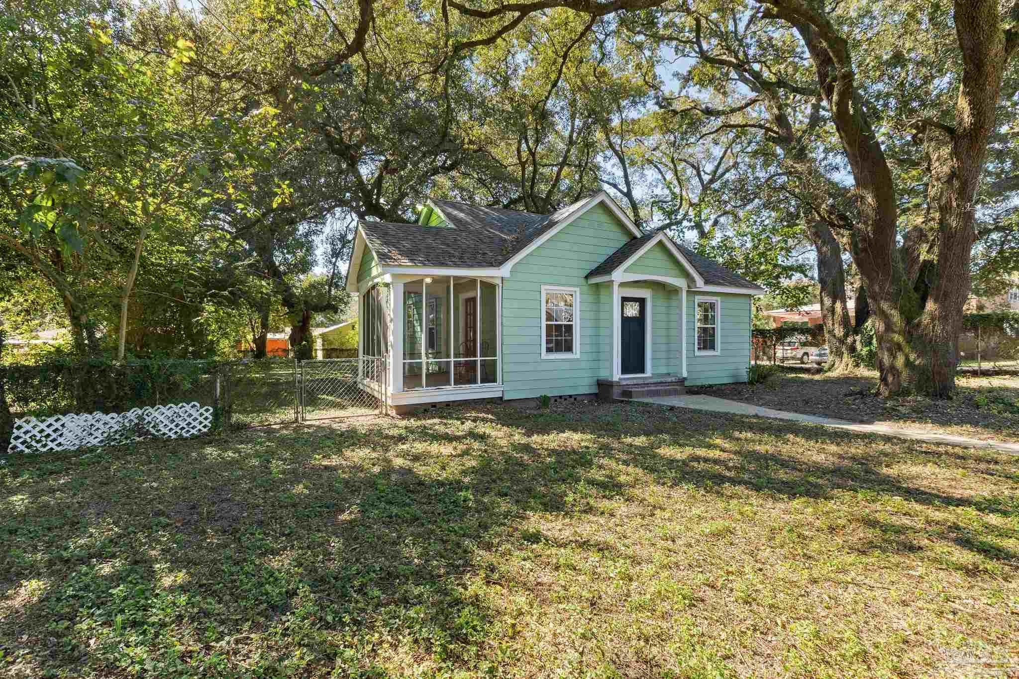 This beautiful, remodeled 3-bedroom, 2-bathroom cottage with office and laundry space, offers a truly magical setting, nestled among mature live oaks that lend a peaceful, enchanting atmosphere. The home skillfully preserves its original charm while being completely updated for today's standard of convenience, low maintenance, and high functionality. Enjoy maximum peace of mind with a new roof and hot water heater, plus a home warranty included! You'll love the screened-in porch located right off the main living room making it the perfect spot to enjoy your morning coffee or let a refreshing breeze flow through the house. The desirable split floor plan features a separate primary suite that features its own exterior entry and ensuite bathroom, giving the home fantastic rental unit potential for an Airbnb short term rental or Mother-in-Law suite. Situated on a quarter-acre lot, this unique cottage is ideally located just 3 miles from downtown, making it a quick bike ride or less than a ten-minute drive, and offers easy access to the nearby base. This is a brilliant chance to make a great investment on the outskirt of the quickly expanding downtown.