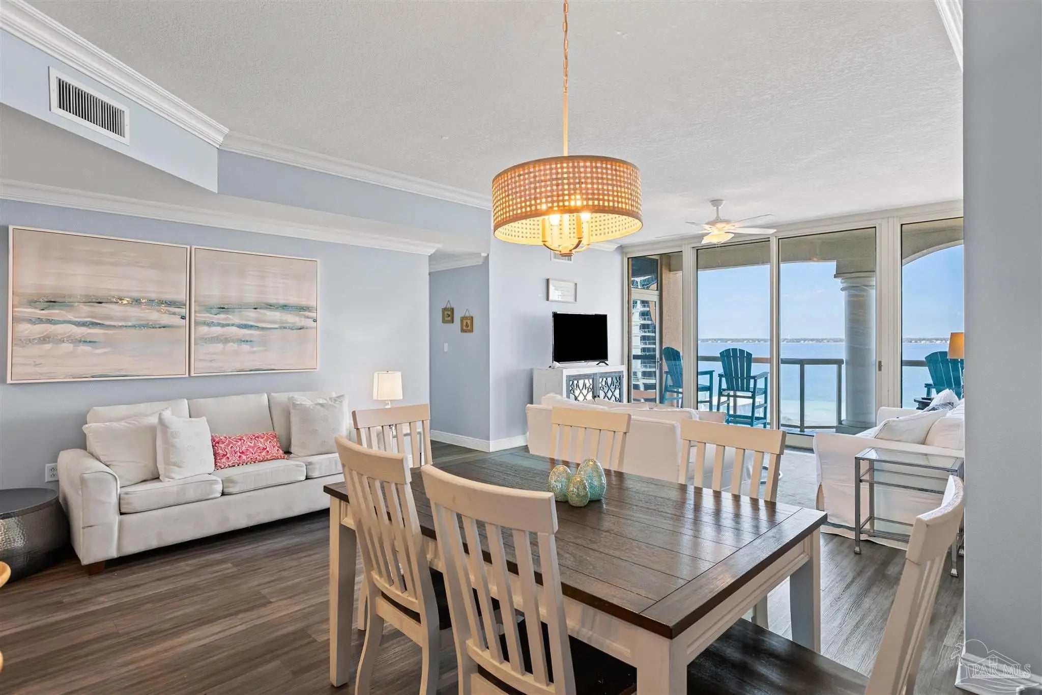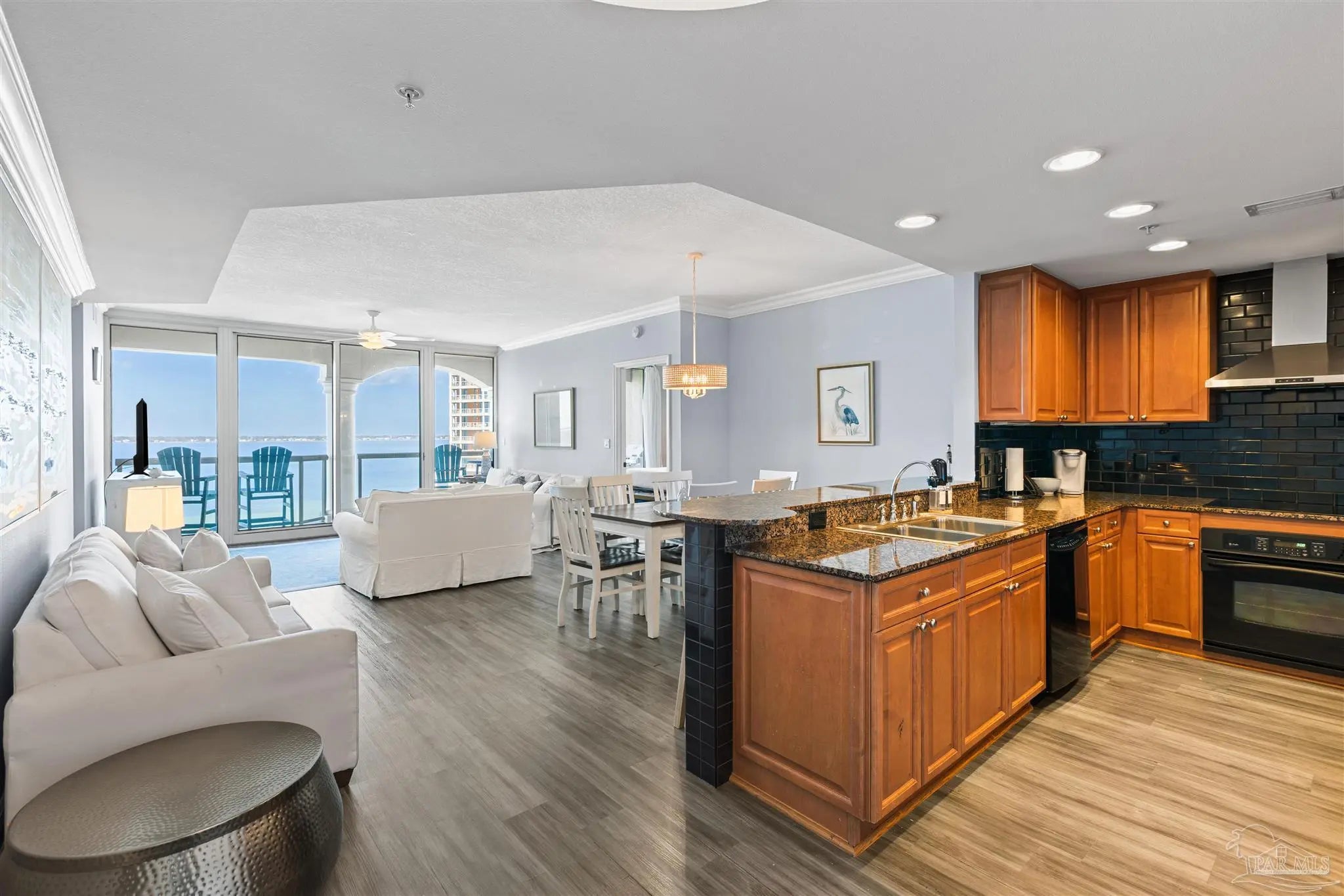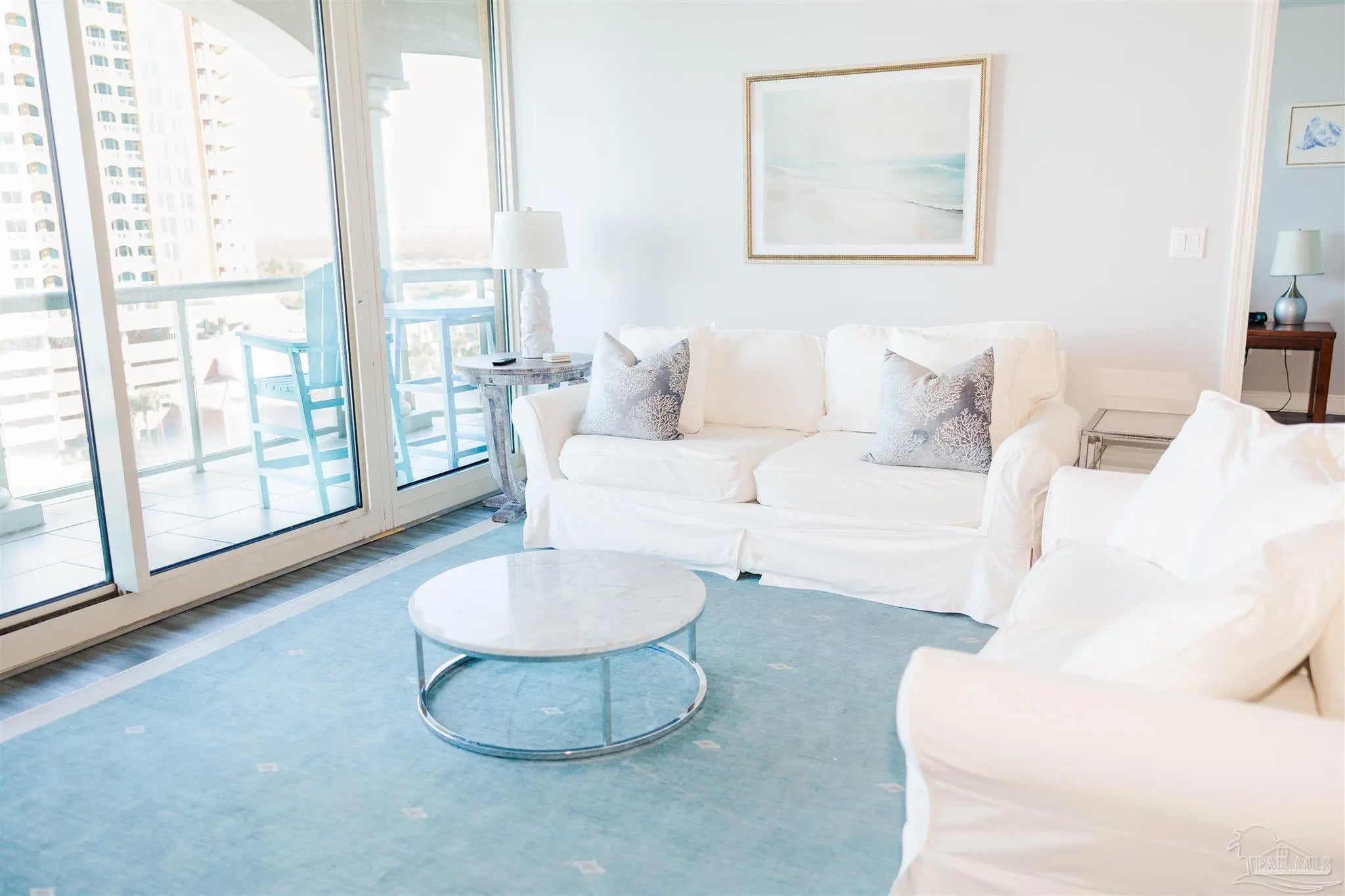 Experience elegant coastal living in this exceptional Portofino Island Resort sky home with sweeping beach-to-bay views, five-star resort amenities, and the unmatched serenity of life above the water. This is a turnkey, high-performing rental, with current bookings to convey if the buyer elects to honor them. This is a rare opportunity for investors to earn substantial rental income and also enjoy the beach lifestyle themselves. In this 8th-floor residence, the open-concept living/dining area is framed by floor-to-ceiling windows showcasing endless views of the Gulf and Santa Rosa Sound. The building’s unique triangular design ensures breathtaking water views from every room. Designed for both convenience and entertaining, the chef-inspired kitchen features granite countertops, rich wood cabinetry, s sleek tile backsplash, and a spacious breakfast bar. Newly remodeled, wood-style tile flows throughout, adding to the ambiance of this coastal retreat. The primary suite offers private balcony access and a spa-like bath with dual vanities, soaking tub, and walk-in shower. The guest suite also enjoys water views and balcony access. Nestled on 28 acres of pristine beach property, Portofino Island Resort delivers an unparalleled resort experience. The 40,000-square-foot Lifestyle Center features a state-of-the-art fitness facility, full-service spa with steam and sauna rooms, an indoor 35-meter lap pool, and two lagoon-style infinity pools overlooking the Intracoastal Waterway. Outdoor recreation includes five lighted Rubico tennis courts, beach and bay water sports, and a catamaran for dolphin and sunset cruises. Enjoy coastal dining at the newly redesigned Coastal Restaurant or casual poolside fare at Al Fresco Bar & Grill. With unmatched amenities, resort-style indulgence, and strong rental performance, this home embodies the ultimate Portofino lifestyle - luxurious, effortless, and captivating. Includes two private covered parking spaces and one storage unit.