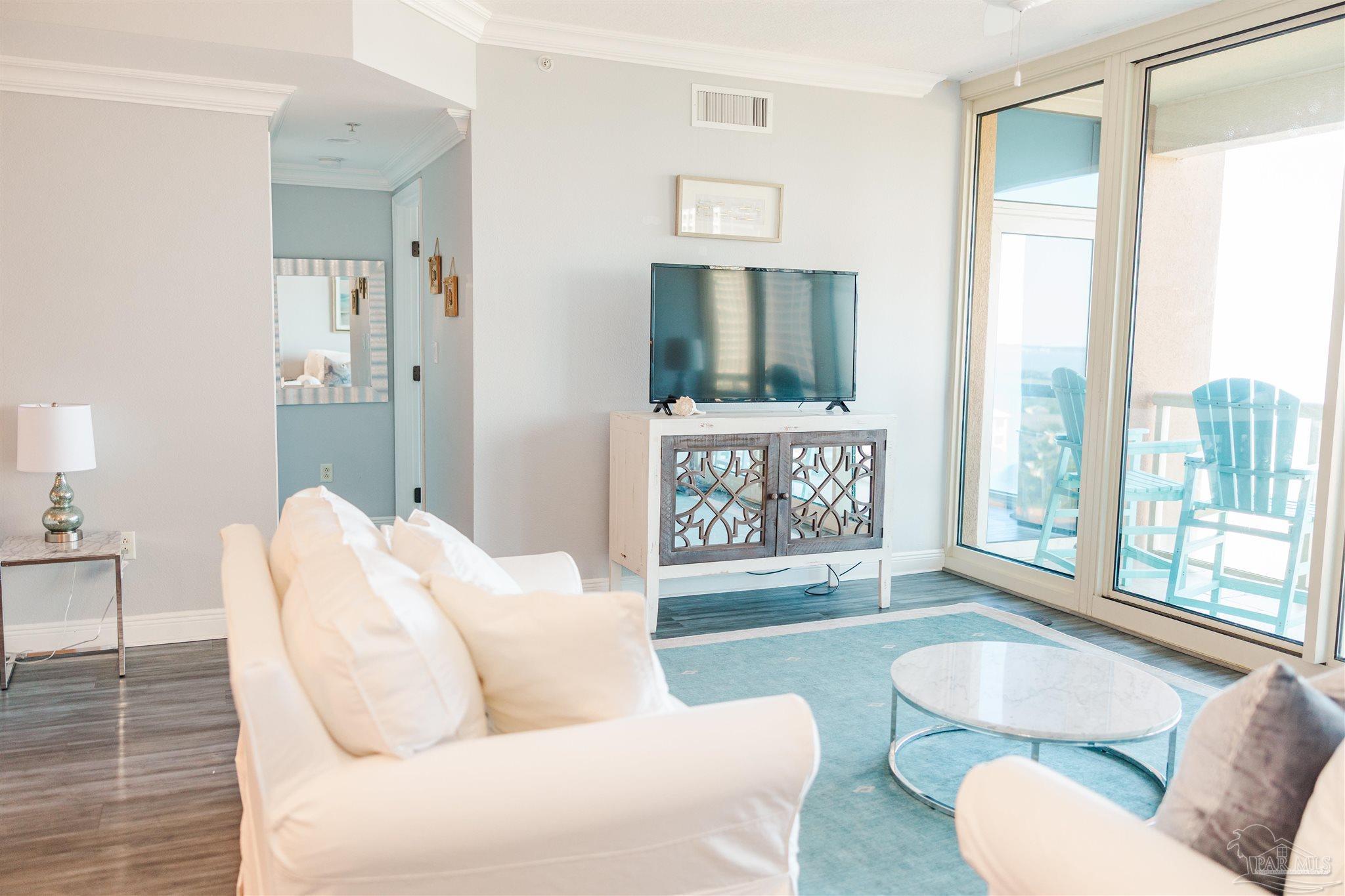 Experience elegant coastal living in this exceptional Portofino Island Resort sky home with sweeping beach-to-bay views, five-star resort amenities, and the unmatched serenity of life above the water. This is a turnkey, high-performing rental, with current bookings to convey if the buyer elects to honor them. This is a rare opportunity for investors to earn substantial rental income and also enjoy the beach lifestyle themselves. In this 8th-floor residence, the open-concept living/dining area is framed by floor-to-ceiling windows showcasing endless views of the Gulf and Santa Rosa Sound. The building’s unique triangular design ensures breathtaking water views from every room. Designed for both convenience and entertaining, the chef-inspired kitchen features granite countertops, rich wood cabinetry, s sleek tile backsplash, and a spacious breakfast bar. Newly remodeled, wood-style tile flows throughout, adding to the ambiance of this coastal retreat. The primary suite offers private balcony access and a spa-like bath with dual vanities, soaking tub, and walk-in shower. The guest suite also enjoys water views and balcony access. Nestled on 28 acres of pristine beach property, Portofino Island Resort delivers an unparalleled resort experience. The 40,000-square-foot Lifestyle Center features a state-of-the-art fitness facility, full-service spa with steam and sauna rooms, an indoor 35-meter lap pool, and two lagoon-style infinity pools overlooking the Intracoastal Waterway. Outdoor recreation includes five lighted Rubico tennis courts, beach and bay water sports, and a catamaran for dolphin and sunset cruises. Enjoy coastal dining at the newly redesigned Coastal Restaurant or casual poolside fare at Al Fresco Bar & Grill. With unmatched amenities, resort-style indulgence, and strong rental performance, this home embodies the ultimate Portofino lifestyle - luxurious, effortless, and captivating. Includes two private covered parking spaces and one storage unit.