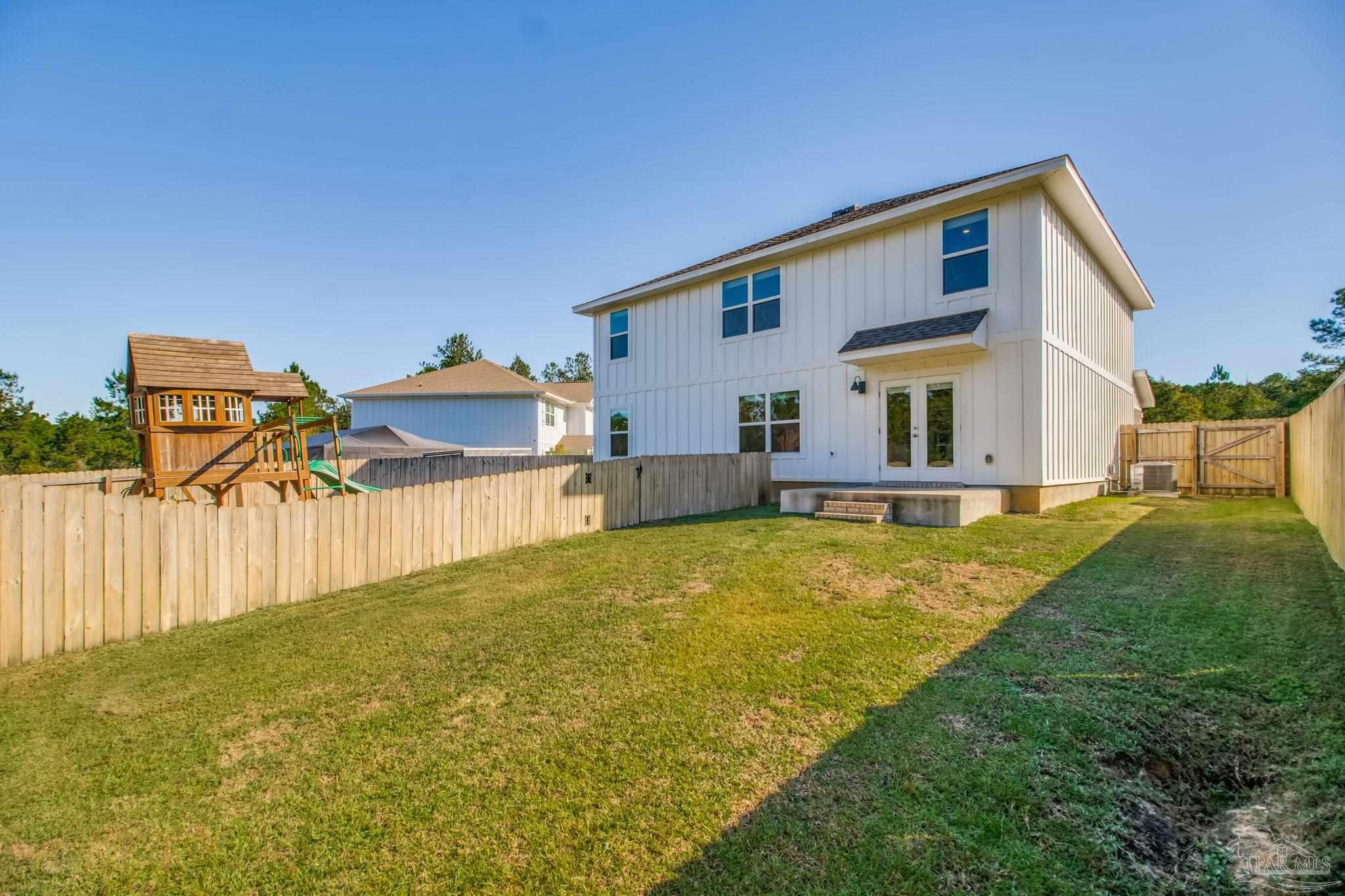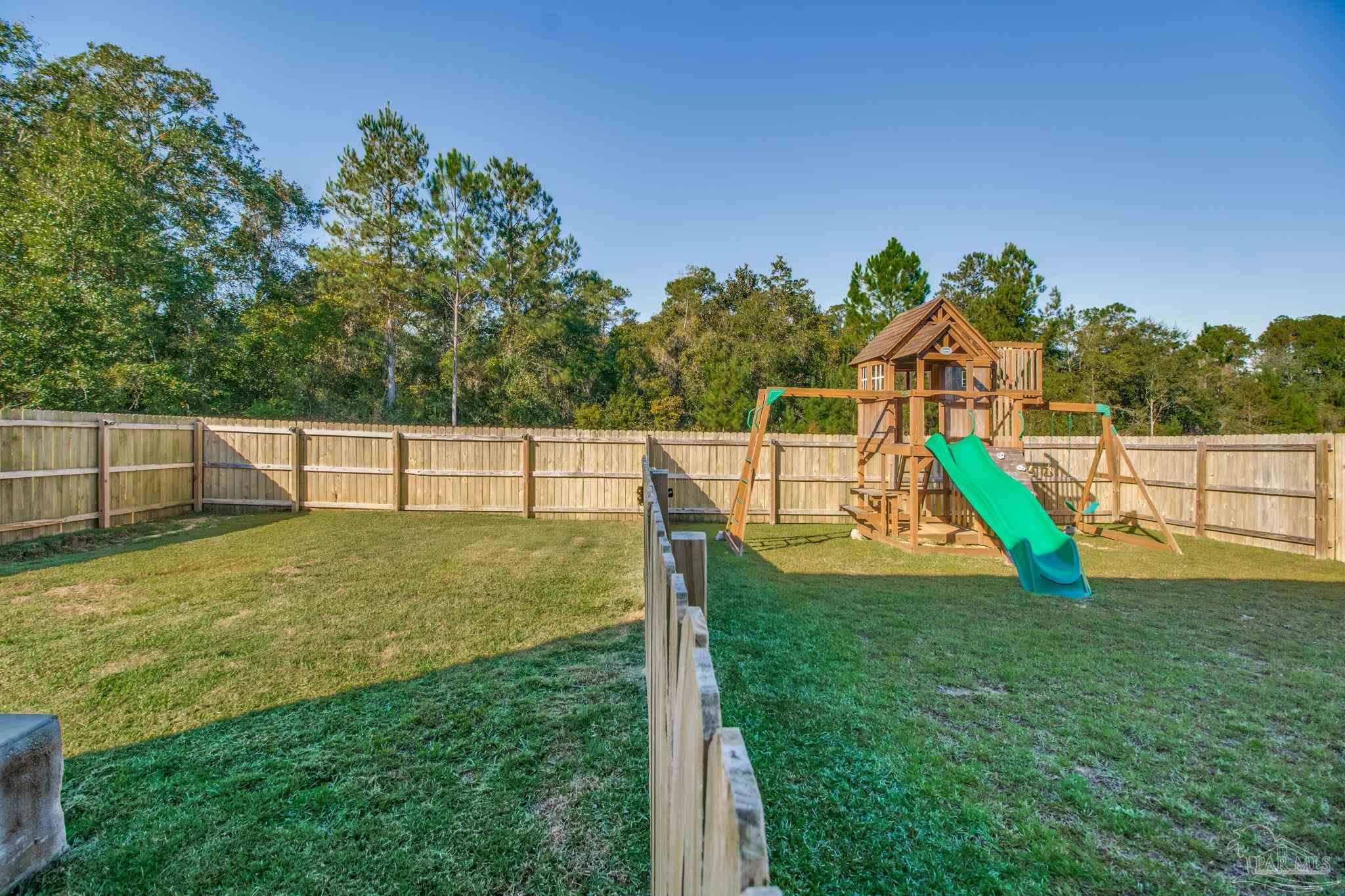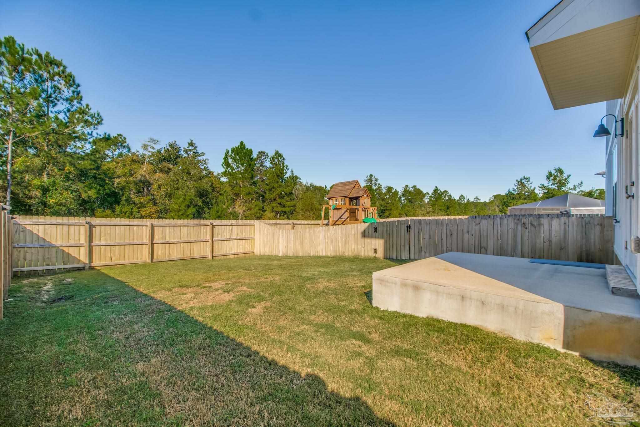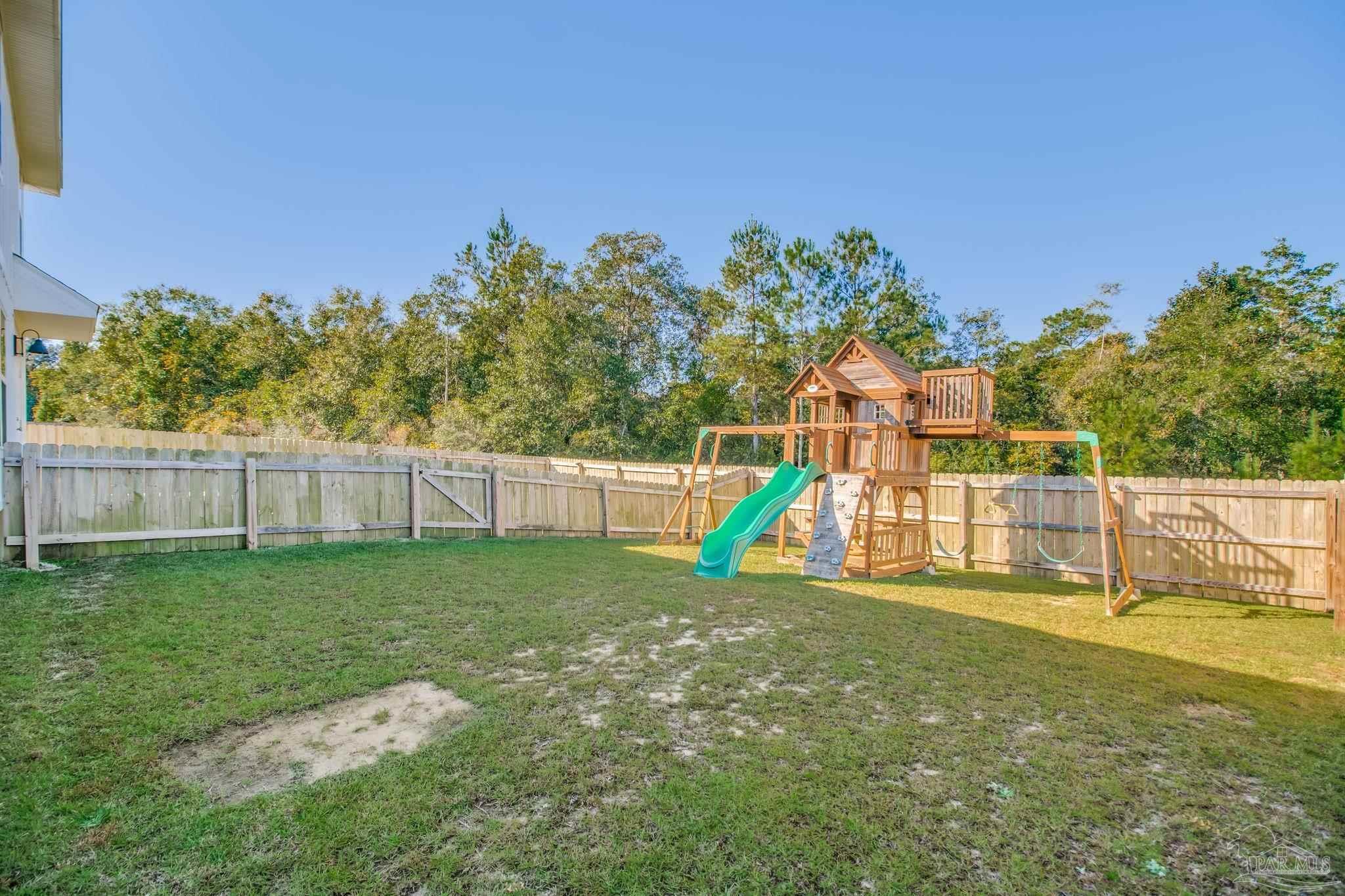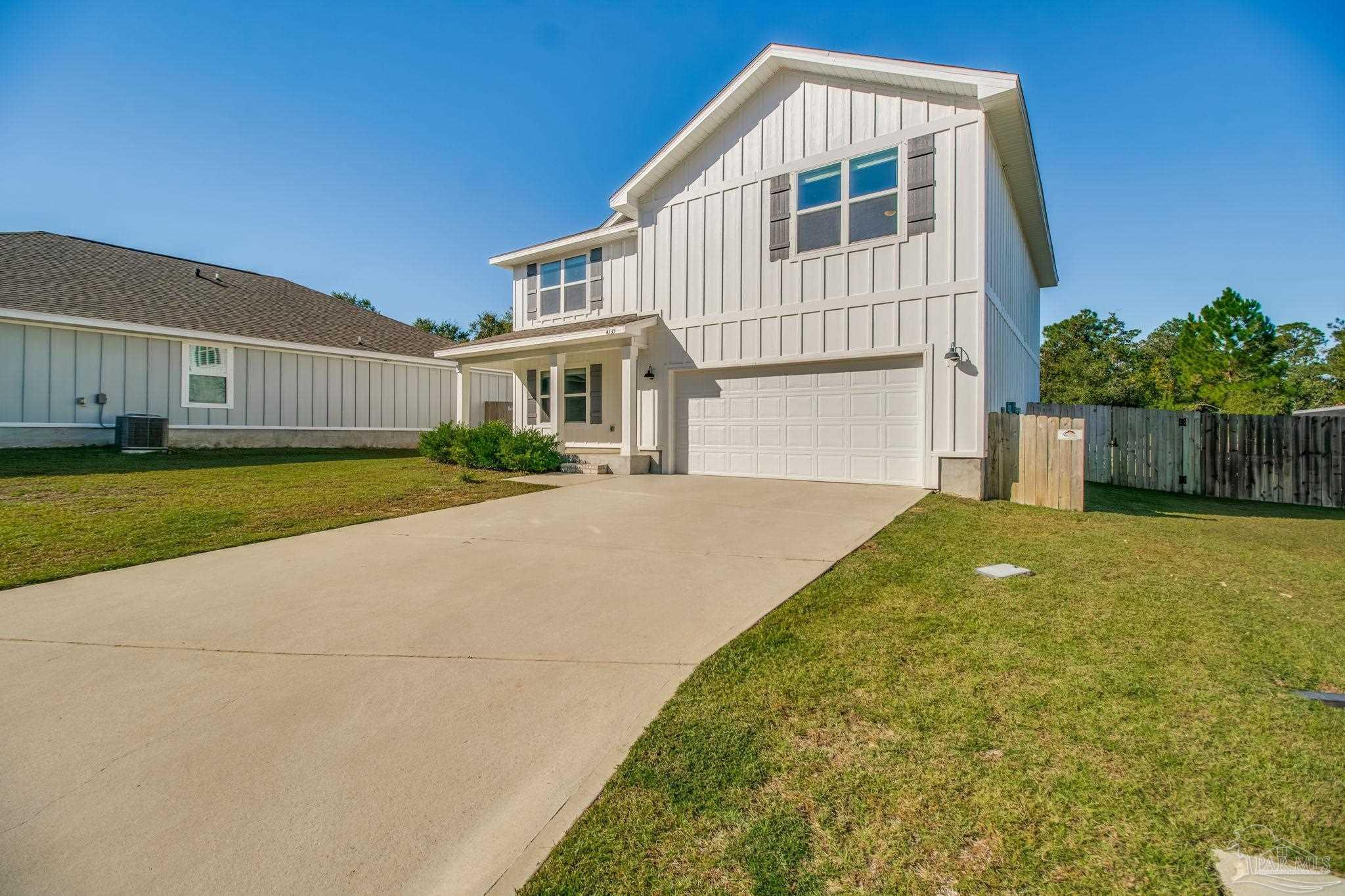 Located on a quiet cul-de-sac near the back entrance of Deer Run, this beautiful 5-bedroom, 3-bath home offers over 2,500 square feet of modern living space with convenience and style. Built in 2022, it features an open floor plan perfect for gatherings, with bright natural light and designer finishes throughout. The stunning kitchen showcases granite countertops, a massive center island with bar seating, stainless steel appliances, and abundant cabinet space, ideal for cooking and entertaining alike. The adjoining living and dining areas flow seamlessly to a raised back patio overlooking the fully fenced backyard and wooded preserve, offering both privacy and charm. Upstairs, the spacious primary suite includes an elegant en-suite bath with dual granite vanities, separate shower, and walk-in closet. Three additional bedrooms, a full bath, laundry room, and bonus living area complete the upper level. A fifth bedroom and third full bath on the main floor provide an ideal setup for guests or multigenerational living. Enjoy access to Deer Run’s community amenities including a sparkling pool, outdoor grills, and cabana area. With easy access to shopping, I-10, and Navy Federal Credit Union, this home combines luxury, space, and location, all in one beautiful package. Call today to schedule your private tour!