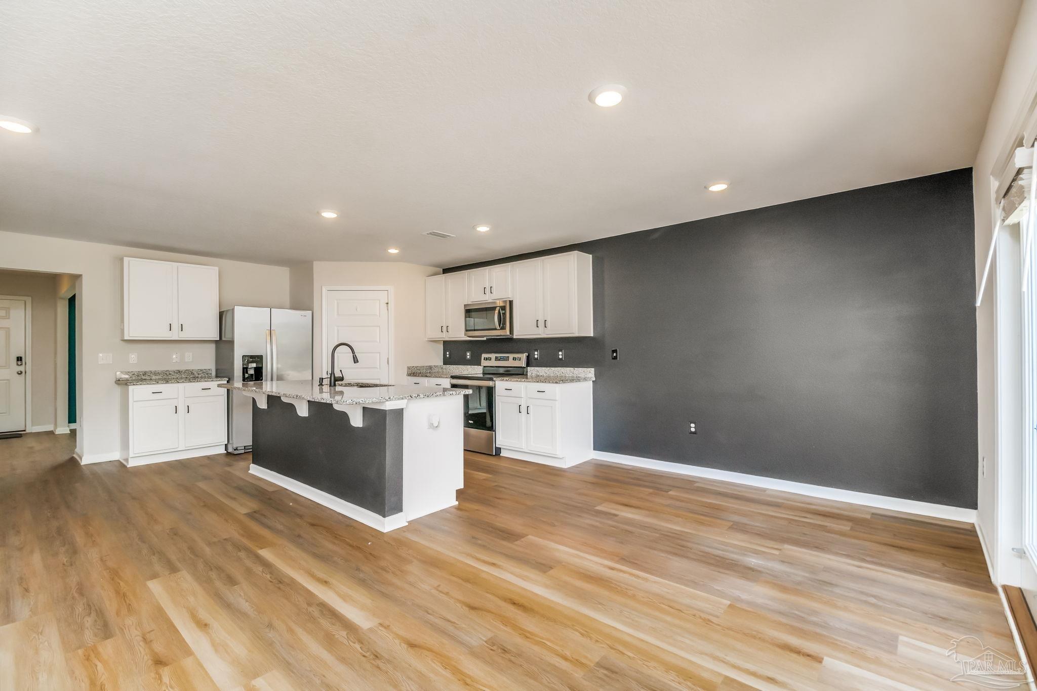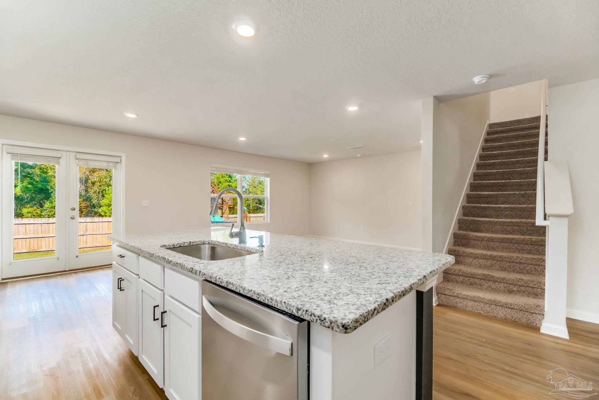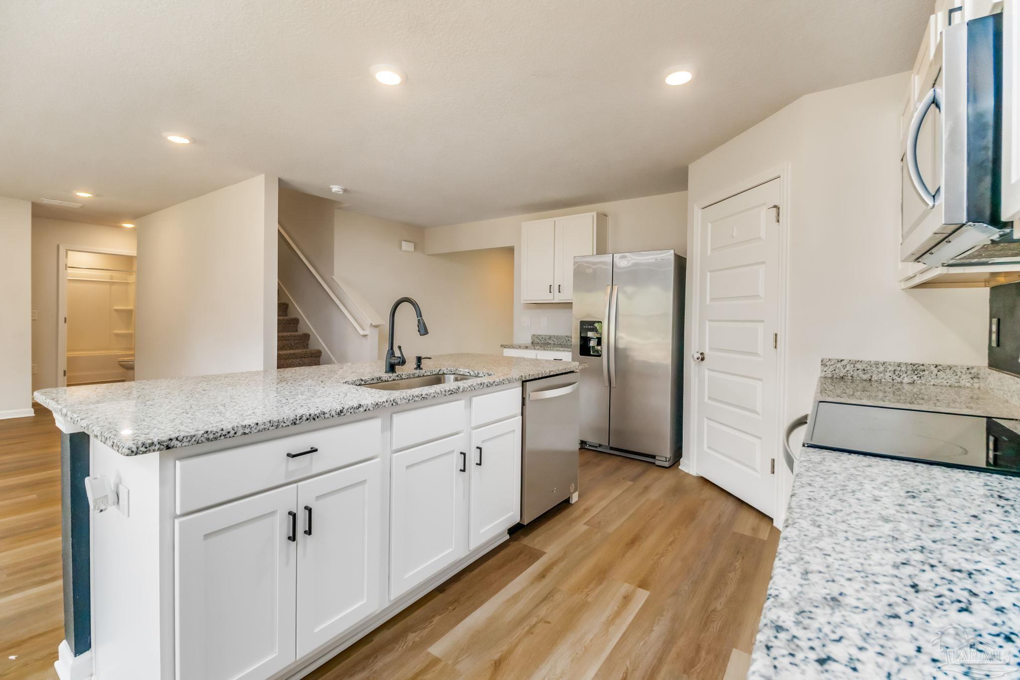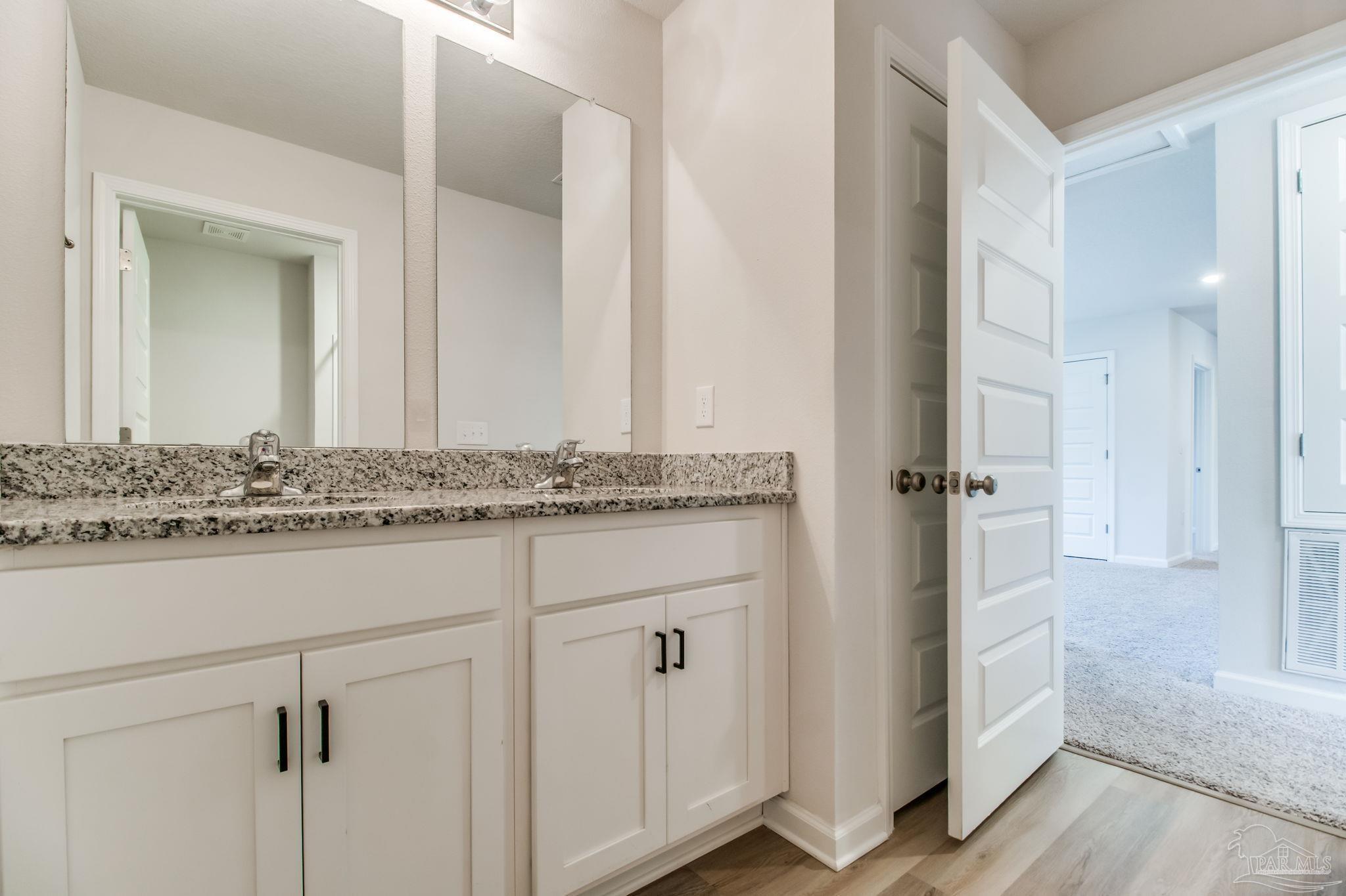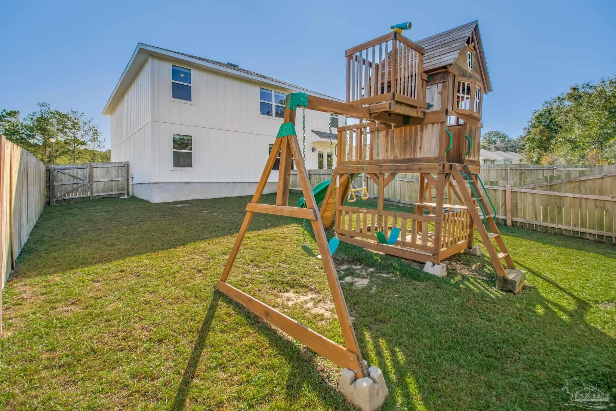 Located on a quiet cul-de-sac near the back entrance of Deer Run, this beautiful 5-bedroom, 3-bath home offers over 2,500 square feet of modern living space with convenience and style. Built in 2022, it features an open floor plan perfect for gatherings, with bright natural light and designer finishes throughout. The stunning kitchen showcases granite countertops, a massive center island with bar seating, stainless steel appliances, and abundant cabinet space, ideal for cooking and entertaining alike. The adjoining living and dining areas flow seamlessly to a raised back patio overlooking the fully fenced backyard and wooded preserve, offering both privacy and charm. Upstairs, the spacious primary suite includes an elegant en-suite bath with dual granite vanities, separate shower, and walk-in closet. Three additional bedrooms, a full bath, laundry room, and bonus living area complete the upper level. A fifth bedroom and third full bath on the main floor provide an ideal setup for guests or multigenerational living. Enjoy access to Deer Run’s community amenities including a sparkling pool, outdoor grills, and cabana area. With easy access to shopping, I-10, and Navy Federal Credit Union, this home combines luxury, space, and location, all in one beautiful package. Call today to schedule your private tour!