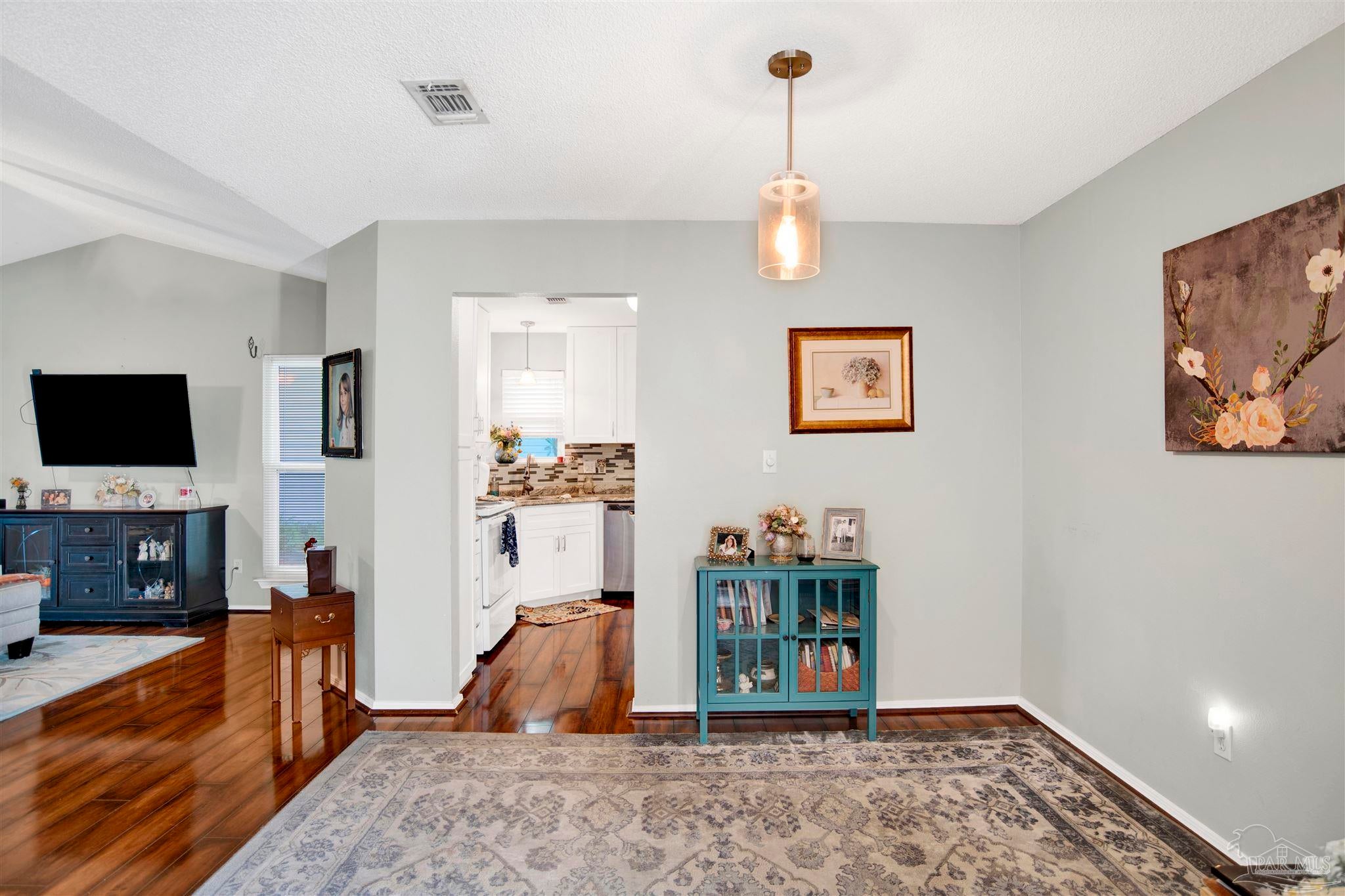 Located in the Mirabelle subdivision, this 3-bedroom, 2-bath home offers comfort, style, and convenience. Situated on a corner lot and just minutes from schools, shopping, and medical facilities, this home has so much to offer! From the inviting foyer, you’re welcomed into a spacious living room featuring cathedral ceilings, plant ledges, and rich wood laminate flooring. The adjacent dining area is ideal for family meals or hosting dinner parties. The well-equipped kitchen boasts white shaker-style cabinetry, a stunning tile backsplash, and a charming corner window that fills the space with natural light. Just off the kitchen, a handy mudroom leads to the double car garage. The split bedroom floor plan ensures privacy for the primary suite, complete with luxury vinyl plank flooring, a walk-in closet, and an updated ensuite bath featuring a large single vanity and a walk-in shower. Two additional bedrooms provide plenty of space for family or guests and share a full bath with tile flooring, a single vanity, and a tub/shower combination. Enjoy outdoor living on the lovely screened patio overlooking the privacy-fenced backyard—perfect for morning coffee or relaxing evenings. This home combines thoughtful design, modern updates, and an unbeatable location—schedule your showing today and see all it has to offer!