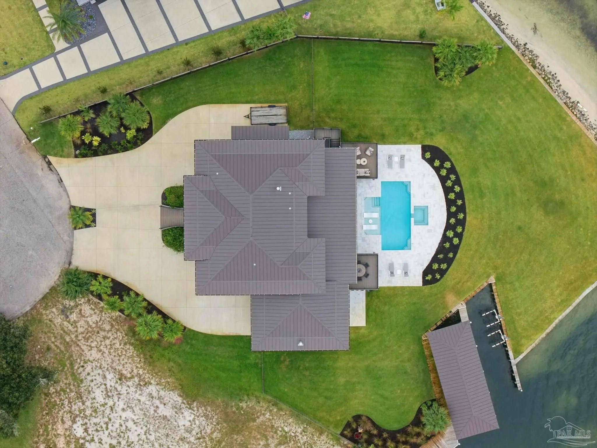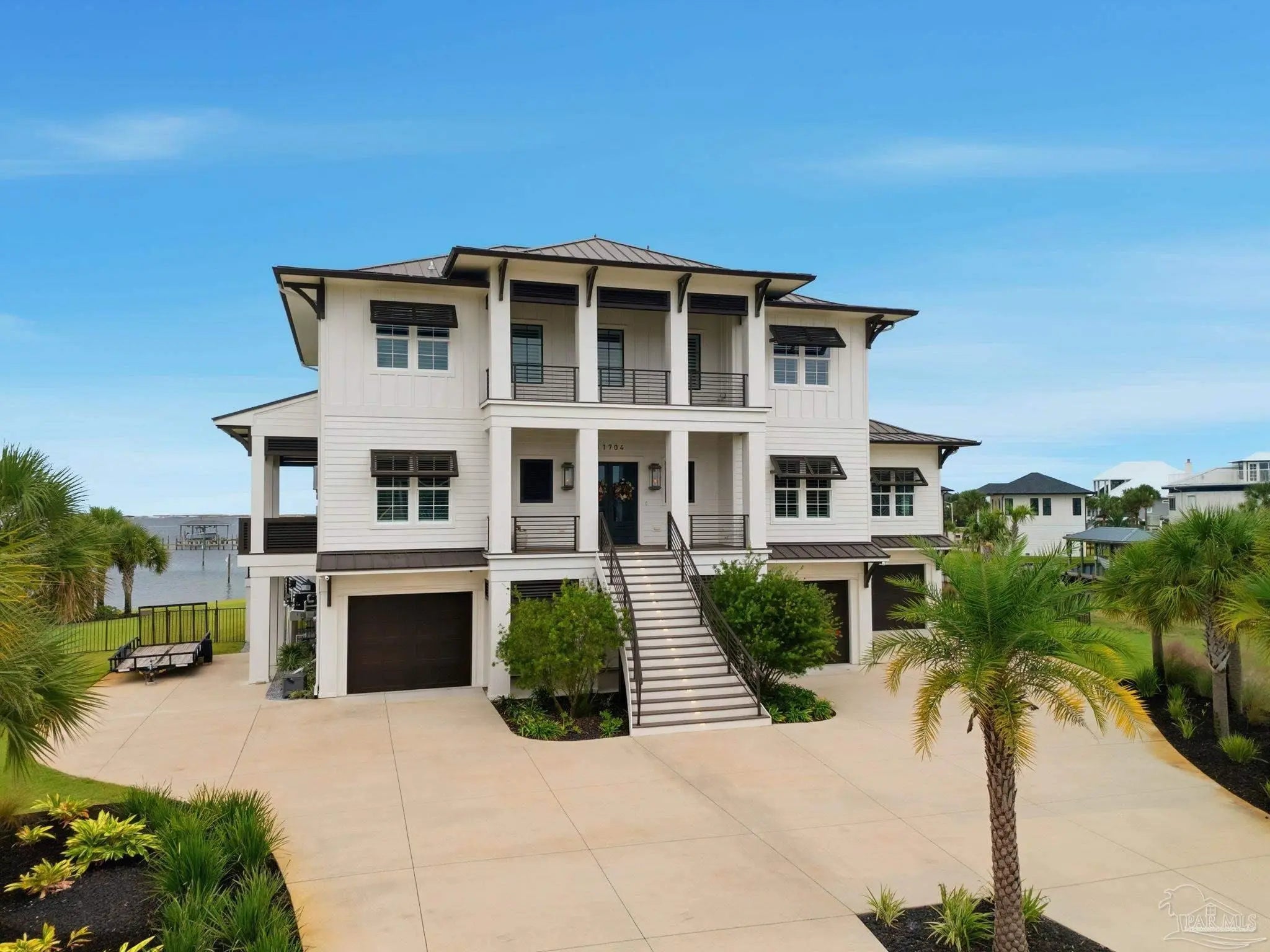 Experience luxury coastal living at its finest in this breathtaking 5-bedroom, 4-bath estate perfectly positioned on a ½-acre cul-de-sac lot with 217 feet of pristine waterfront on the Intracoastal Waterway and a private boat basin. Enjoy panoramic views of the Intracoastal and the Gulf, where gorgeous sunrises and stunning sunsets fill the sky each day—and watch the Blue Angels fly from the comfort of your own backyard. A boater’s paradise, this property offers direct access to the Intracoastal Waterway and is in close proximity to the Pass, providing effortless access to the Gulf of America or fishing, cruising, and coastal adventures. Inside, the home showcases white oak hardwood floors throughout, beautiful moldings, luxury marble and tile bathrooms, and a gourmet kitchen adorned with quartz countertops and backsplash, black stainless designer appliances, a Wolf built-in coffee system, and a butler’s pantry featuring custom cabinetry and walnut counters. The Bar & Game Room exudes a stylish speakeasy vibe, featuring a gas fireplace, walnut bar, beverage refrigerator, Scotsman ice maker, and beverage dispenser—a perfect gathering place for friends and family. Step outdoors to your private resort-style retreat with a gunite heated pool and spa, surrounded by marble decking, and an outdoor kitchen equipped with a Blaze gas grill, Large Green Egg, beverage fridge, prep sink, and a full outdoor bathroom for added convenience. Additional highlights include a whole-house gas generator, an elevator servicing all three floors, and en-suite bedrooms finished with quartz, marble, and designer tile. Celebrated for its exceptional design and craftsmanship, this home has been featured in multiple luxury coastal magazines—a true testament to its architectural distinction and timeless beauty. This extraordinary waterfront residence seamlessly blends modern sophistication, comfort, and the ultimate coastal lifestyle.
