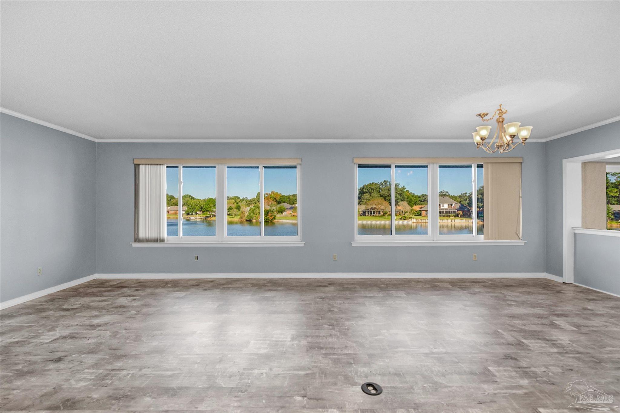 Panoramic view of the lake on the second floor with windows in every lakeside room. New LVP flooring, fresh paint, wet bar in the living room with doors, a morning room or an office and dining room. There is a playground that has a fee of$180/ yr which is in the association fees. Front porch is a sitting area which is covered. One car garage with shelves. New roof and seawall in2022. Pet limit is 20 pounds with approval. BBQ cooking area. Only electric motors on lake and it is attached to Lake JoAnn. Hurricane windows, electric bill of approx $85.00 a month, bedroom carpet is one year old, and a new electrical panel. Move in ready. The view the home has is a MUST SEE.