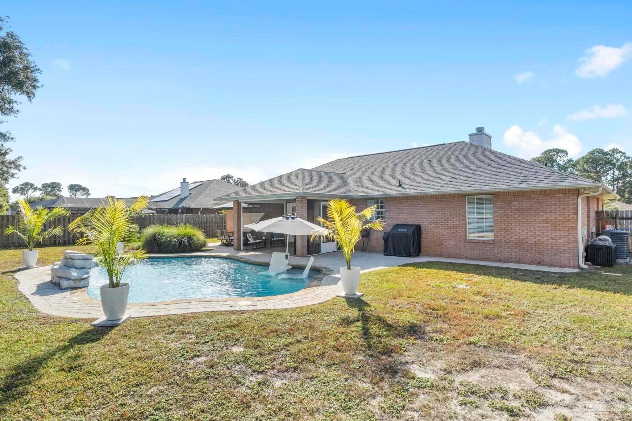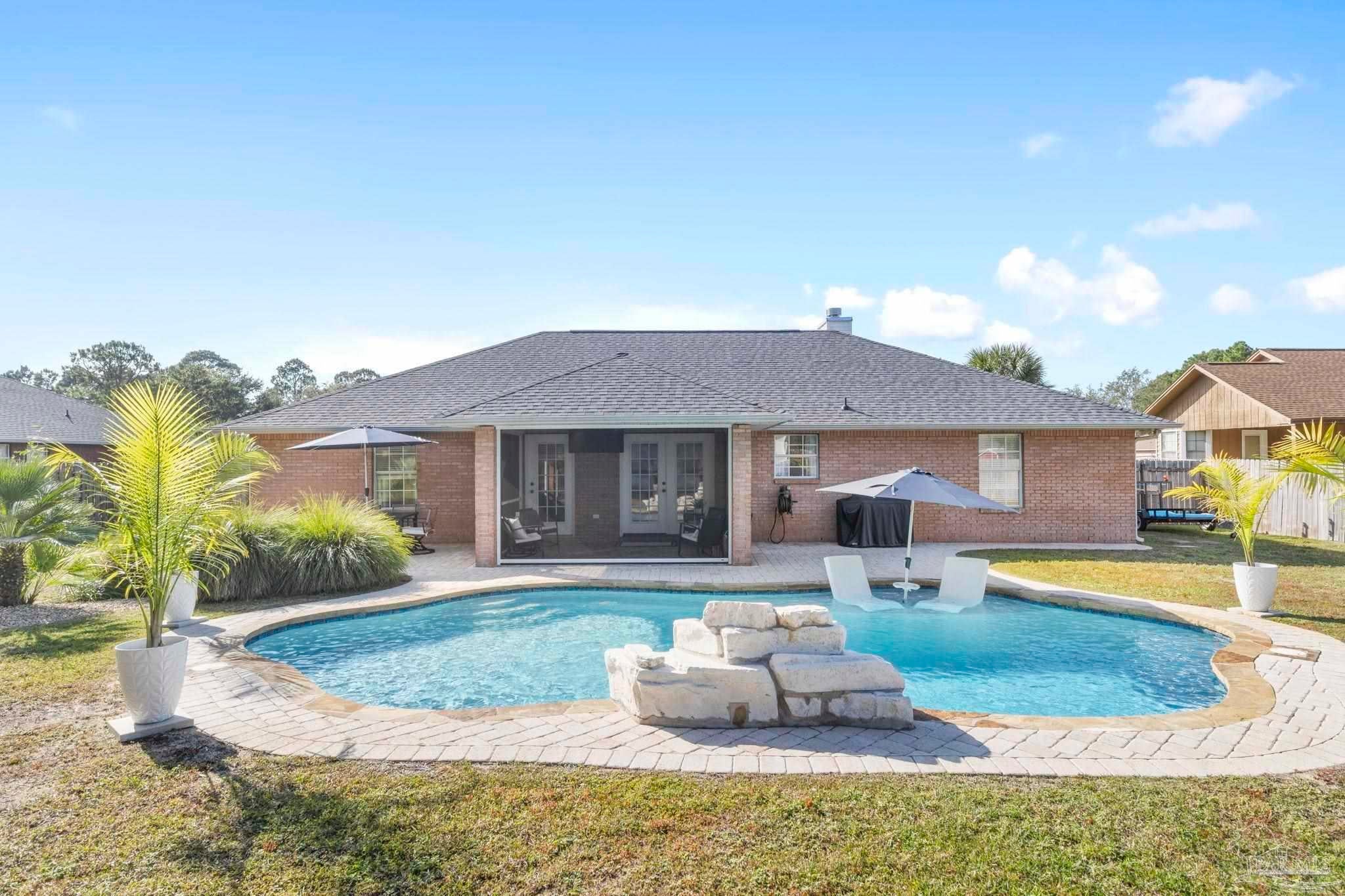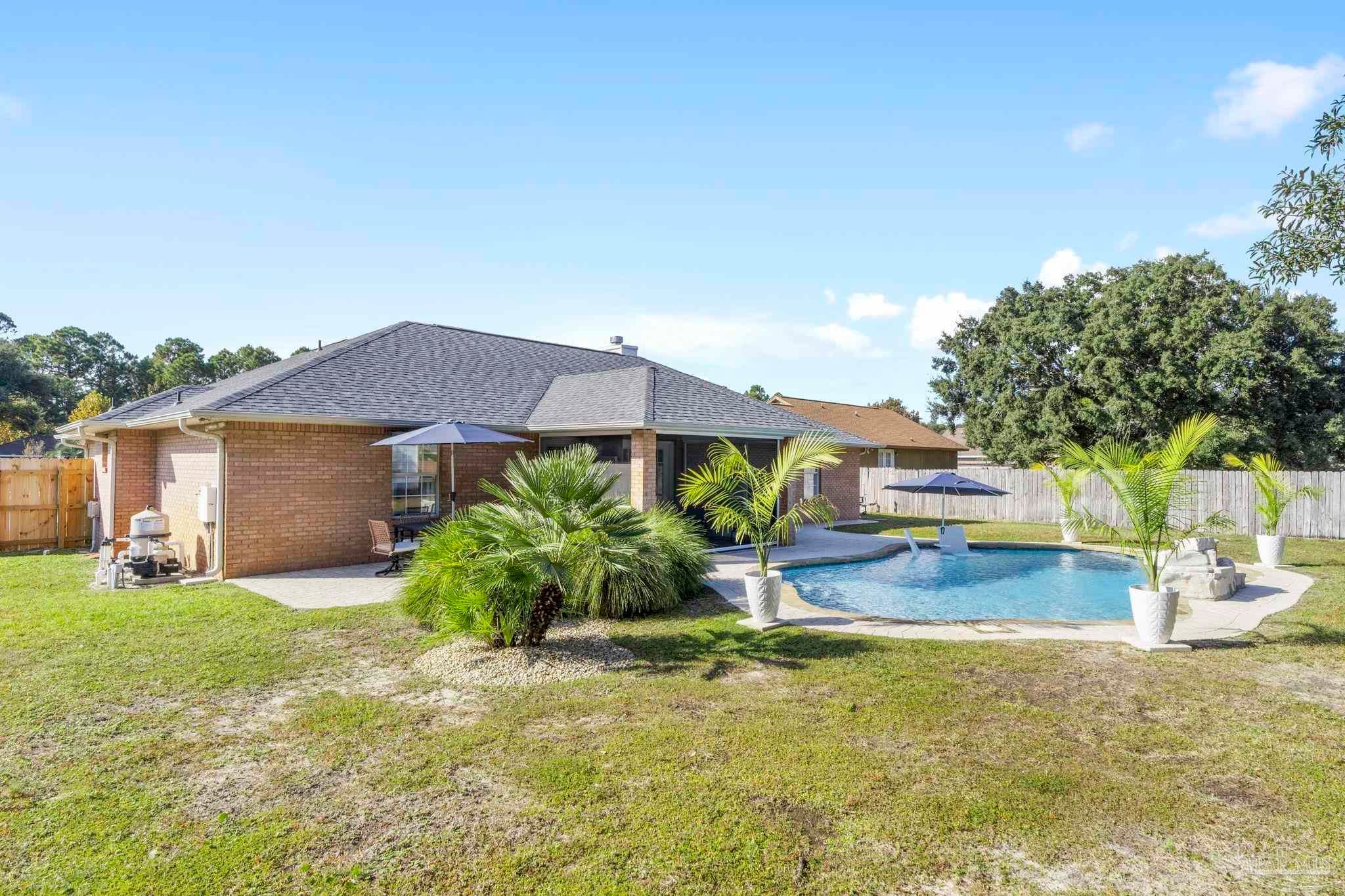 Pool home located just minutes to the beautiful emerald coast of Florida! Tall ceilings with skylights brings natural light in throughout. The kitchen offers granite counter tops and stainless steel appliances. There are double doors leading you to your screened in porch that offers a motorized screen that you can leave up for the view or down. Step out to your stylish gunite pool with a waterfall fountain, a built in ledge, and seating great for entertaining! Prestige Landscapes designed and installed a stylish landscape design with 3 boulders and lights highlighting the palm trees and landscape made to come on from dusk to dawn! Not to mention the front and back yard have timed irrigation. Also included in this beauty is a 24x14 shed with extra storage shelves above and a window ac unit that includes heat. There’s plenty of parking with a side parking pad and a double gate large enough to park your boat! If you’re looking for a home with a pool, look no further! Just imagine opening your double doors leading you to a covered screened in porch while listening to the waterfall from your pool throughout the inside of your house! It is so tranquil… Located in Holley by the Sea offering fitness center, boat launch, pier to sound and more! (Sellers are license FL real estate agents.)